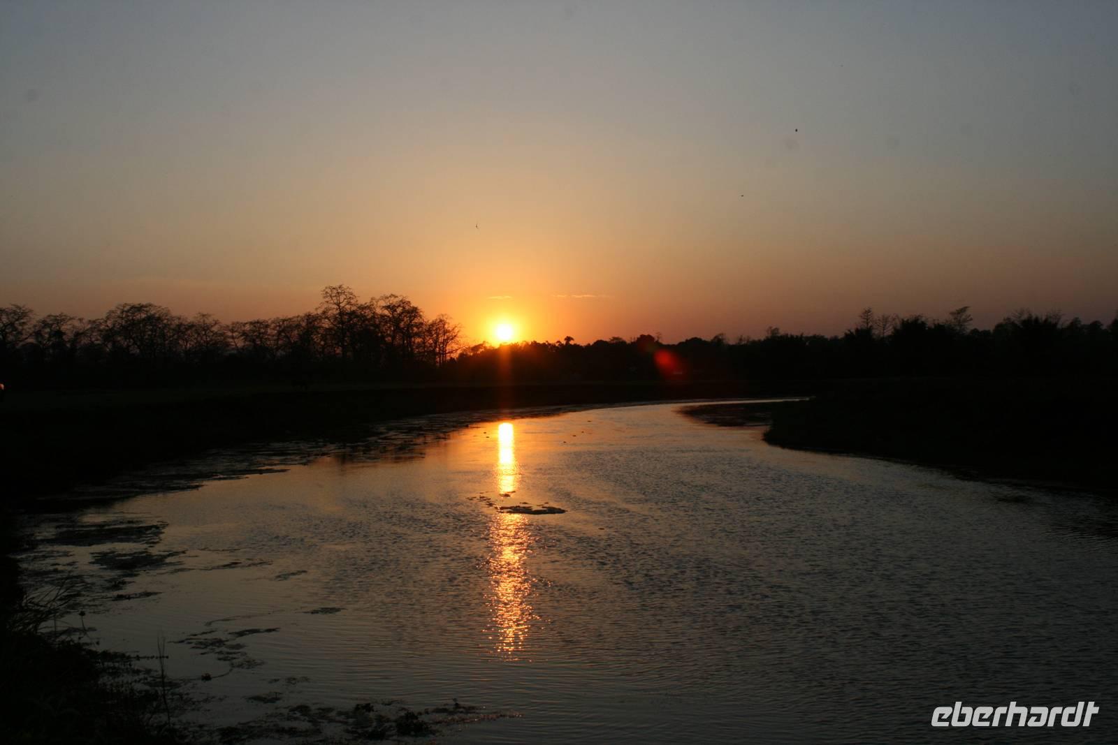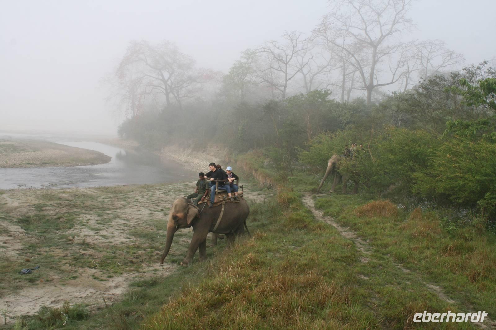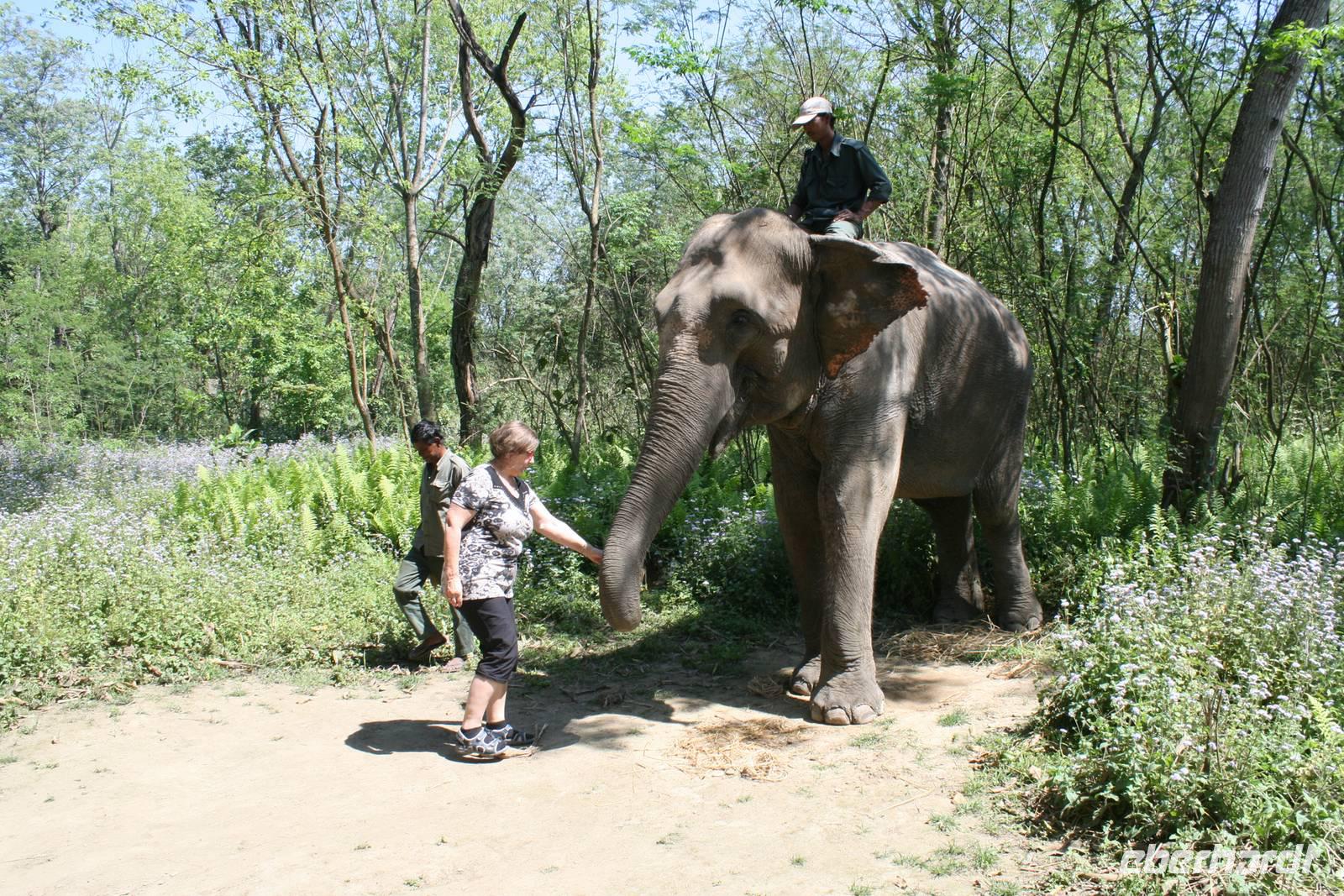 Ja Sie leben noch, Sie leben noch, Sie leben noch,...heute müssen wir schon zeitig aufstehen, denn es erwartet uns bereits am Morgen unser abenteuerlicher Elefantenritt im nepalesischem Dschungel des Parks. So fahren wir eine kurze Weile, bevor wir unseren Punkt für den Elefantenritt erreichen. Ein jeder Elefant trägt drei Personen und so erkunden wir den Dschungel. Die Safari dauert etwa zwei Stunden und unterwegs sehen wir einige Vögel sowie zwei Nashörner. Wir haben einen tollen Blick von dem Rücken des Dickhäuters. Wieder an unserer Lodge angekommen, genießen wir ein Frühstück und erfahren anschließend viel über den asiatischen Elefanten von unserem Reiseleiter Abi. Ein jeder darf den Elefanten auch selbst füttern und streicheln. Sogar Vicky traut sich. Danach fahren wir zu einer Wasserstelle und können den Elefanten bei seinem wohltuenden Bad beobachten. Leider wollte keiner der Gruppe mit einem Elefanten baden, aber auch das Bad an sich ist ein Foto wert. Danach kehren wir zu unserer Lodge zurück und genießen noch ein Mittagessen, bevor wir eine kleine Pause einlegen. Dazu muss man sagen, dass im Chitwan-Nationalpark bereits jetzt Temperaturen von etwa 30 Grad vorherrschend sind und wir so mittags gar nicht unterwegs sein können. Außerdem gehört ein bisschen Pause im Urlaub ja auch dazu. Am Nachmittag, wenn die Sonne nicht mehr so hoch steht, treffen wir uns wieder zu unserer Jeep-Safari, Bootsfahrt und einer kleinen Wanderung. Die Jeeps sind nicht mehr die Neuesten aber das stört uns nicht. Schließlich sind wir ja in Nepal. So erkunden wir den Dschungel und sehen unterwegs einige Vögel wie einen Marabu und einige Adler. Später nehmen wir eine Kurve und sehen direkt vor uns zwei Nashörner. Eine Mutter und ein Baby. Diese sind so nah, dass wir gut fotografieren können. Wie exra für uns hingestellt sehen sie aus. Anschließend fahren wir bis zum Narayani Fluss, wo wir unsere kleine Bootsfahrt unternehmen. Mit Schwimmwesten angezogen, machen wir uns auf den Weg und sehen während unserer Bootsfahrt ein Krokodil sowie einige Eisvögel in blauer und schwarz-weißer Ausführung. Außerdem noch ein paar sibirische Enten und Gänse. Auch ein Nashorn können wir von Weitem erkennen. Danach unternehmen wir noch eine kleine Wanderung durch den Dschungel und genießen am Ende einen tollen Sonnenuntergang im Chitwan-Nationalpark. Ein gelungener Ausklang für zwei wunderschöne Tage. In unserer Lodge angekommen, machen wir uns kurz frisch und sehen dann eine tolle Folklore Tanzshow des Tharu Volkes, welches sich im Chitwan-Nationalpark niedergelassen hat. Einige von uns tanzen am Ende sogar selbst mit und könnten glatt dazugehören. Danach lassen wir den Abend bei einem tollen Barbecue ausklingen.
