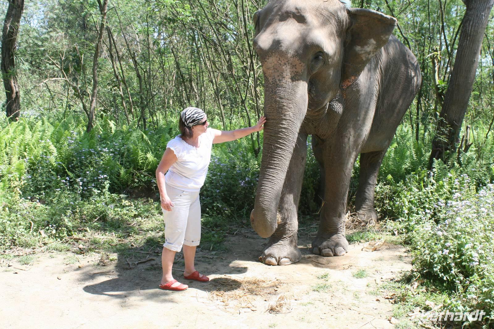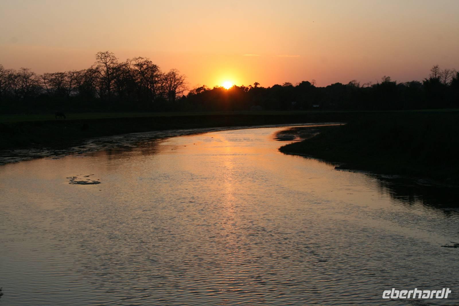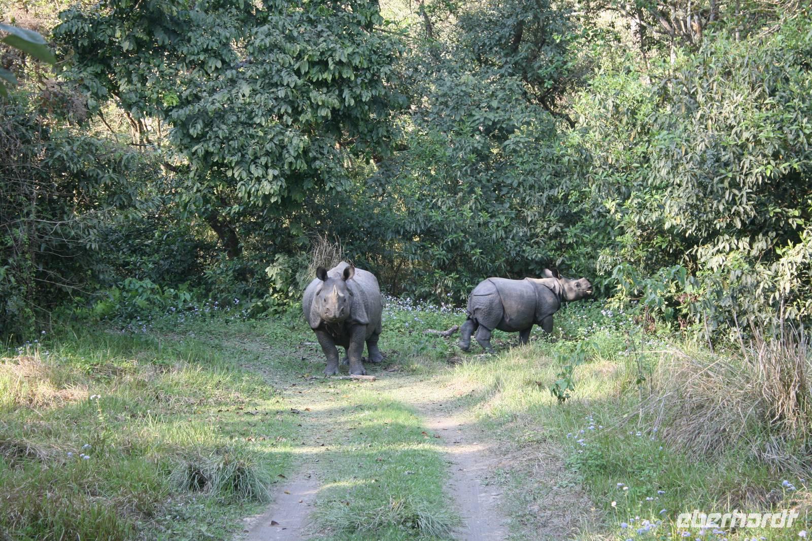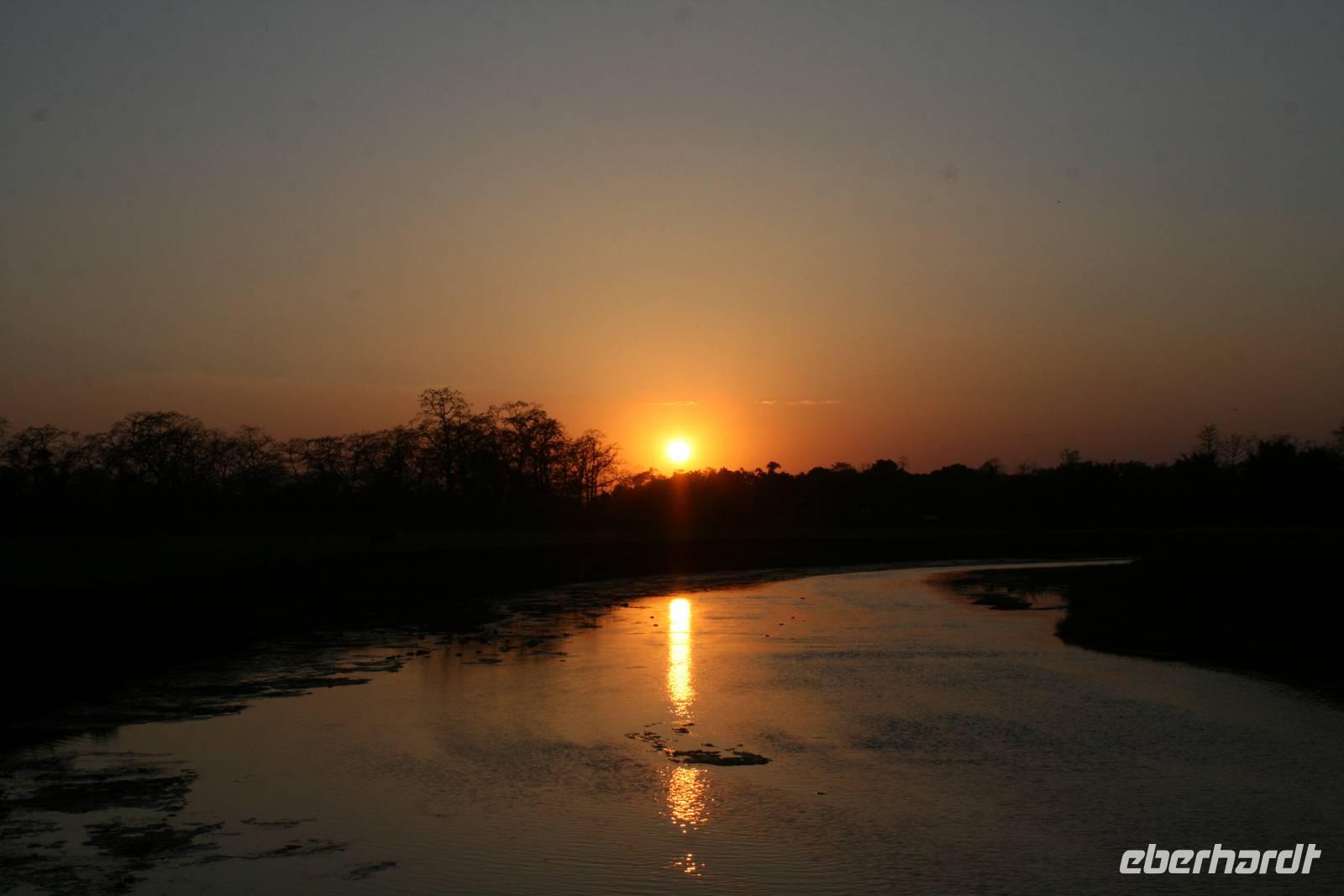 Ja Sie leben noch, Sie leben noch, Sie leben noch,...heute müssen wir schon zeitig aufstehen, denn es erwartet uns bereits am Morgen unser abenteuerlicher Elefantenritt im nepalesischem Dschungel des Parks. So fahren wir eine kurze Weile, bevor wir unseren Punkt für den Elefantenritt erreichen. Ein jeder Elefant trägt drei Personen und so erkunden wir den Dschungel. Die Safari dauert etwa zwei Stunden und unterwegs sehen wir einige Vögel sowie zwei Nashörner. Wir haben einen tollen Blick von dem Rücken des Dickhäuters. Wieder an unserer Lodge angekommen, genießen wir ein Frühstück und erfahren anschließend viel über den asiatischen Elefanten von unserem Reiseleiter Abi. Ein jeder darf den Elefanten auch selbst füttern und streicheln. Sogar Vicky traut sich. Danach fahren wir zu einer Wasserstelle und können den Elefanten bei seinem wohltuenden Bad beobachten. Leider wollte keiner der Gruppe mit einem Elefanten baden, aber auch das Bad an sich ist ein Foto wert. Danach kehren wir zu unserer Lodge zurück und genießen noch ein Mittagessen, bevor wir eine kleine Pause einlegen. Dazu muss man sagen, dass im Chitwan-Nationalpark bereits jetzt Temperaturen von etwa 30 Grad vorherrschend sind und wir so mittags gar nicht unterwegs sein können. Außerdem gehört ein bisschen Pause im Urlaub ja auch dazu. Am Nachmittag, wenn die Sonne nicht mehr so hoch steht, treffen wir uns wieder zu unserer Jeep-Safari, Bootsfahrt und einer kleinen Wanderung. Die Jeeps sind nicht mehr die Neuesten aber das stört uns nicht. Schließlich sind wir ja in Nepal. So erkunden wir den Dschungel und sehen unterwegs einige Vögel wie einen Marabu und einige Adler. Später nehmen wir eine Kurve und sehen direkt vor uns zwei Nashörner. Eine Mutter und ein Baby. Diese sind so nah, dass wir gut fotografieren können. Wie exra für uns hingestellt sehen sie aus. Anschließend fahren wir bis zum Narayani Fluss, wo wir unsere kleine Bootsfahrt unternehmen. Mit Schwimmwesten angezogen, machen wir uns auf den Weg und sehen während unserer Bootsfahrt ein Krokodil sowie einige Eisvögel in blauer und schwarz-weißer Ausführung. Außerdem noch ein paar sibirische Enten und Gänse. Auch ein Nashorn können wir von Weitem erkennen. Danach unternehmen wir noch eine kleine Wanderung durch den Dschungel und genießen am Ende einen tollen Sonnenuntergang im Chitwan-Nationalpark. Ein gelungener Ausklang für zwei wunderschöne Tage. In unserer Lodge angekommen, machen wir uns kurz frisch und sehen dann eine tolle Folklore Tanzshow des Tharu Volkes, welches sich im Chitwan-Nationalpark niedergelassen hat. Einige von uns tanzen am Ende sogar selbst mit und könnten glatt dazugehören. Danach lassen wir den Abend bei einem tollen Barbecue ausklingen.