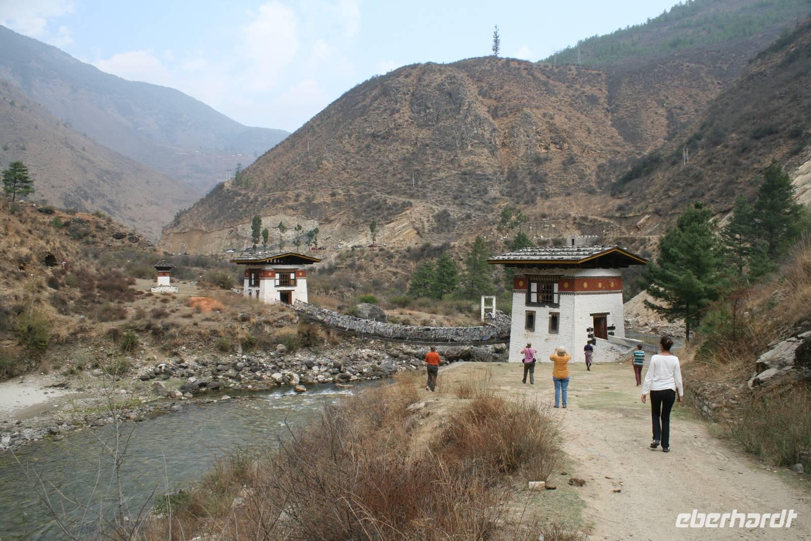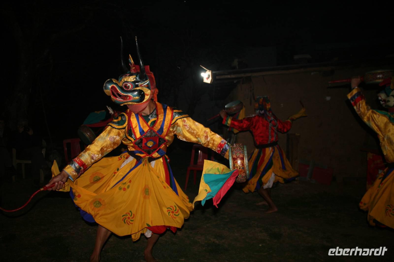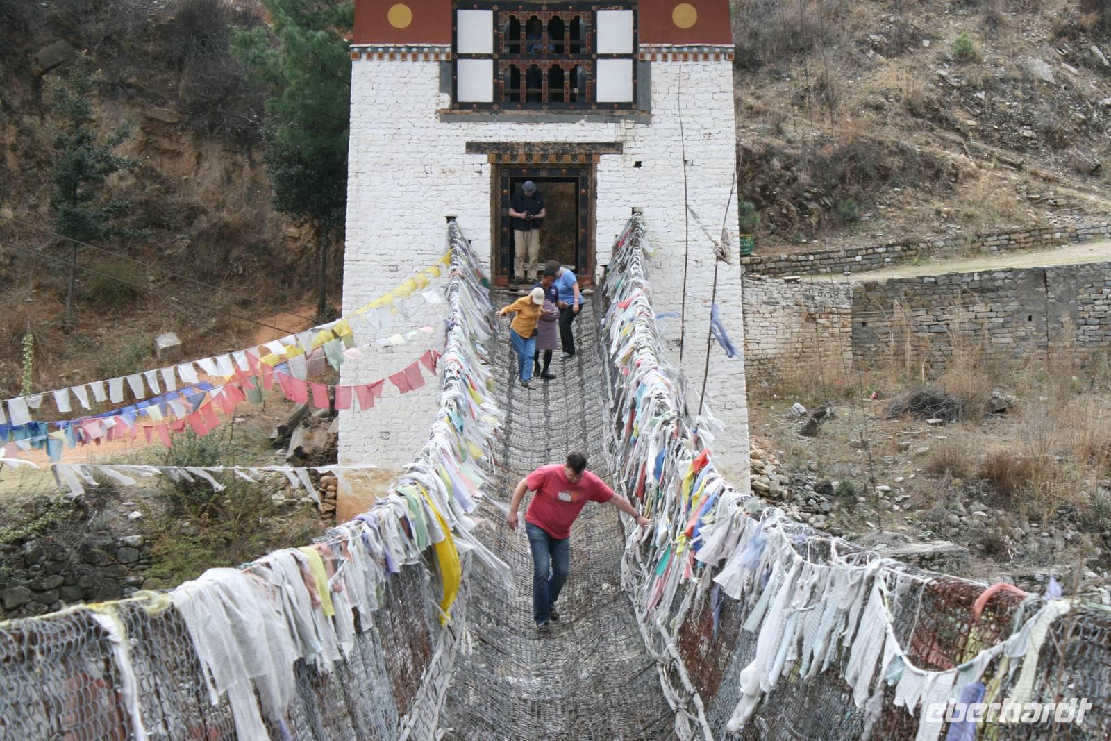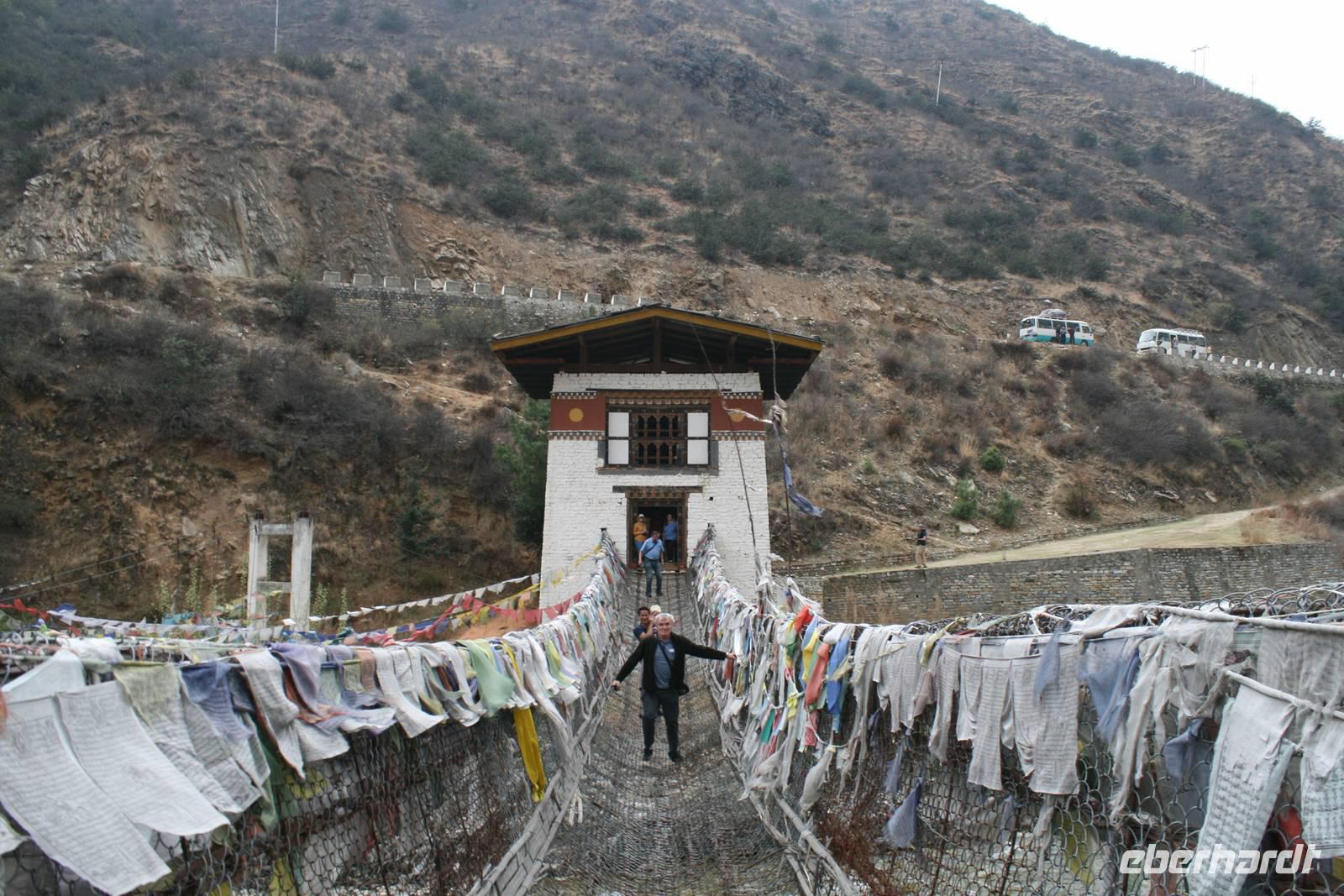 Heute verlassen wir Punakha und haben noch einmal die Möglichkeit, den Dochula-Pass zu überqueren. Wenn Engel reisen, spielt auch das Wetter mit und so haben wir beste Sicht auf die Bergkette, die uns noch gestern verwehrt blieb. So können wir hier die Himalaya-Berge im Nordosten erblicken. Wir sehen ein halbes Dutzend Siebentausender wie Masang Gang (7.158 Meter), Tsendagang (6.960 Meter), Terigang (7.060 Meter), Jejegangphugang (7.158 Meter), Kang 0phugang (7.170 Meter). Der Tafelberg Zongphugang (7.060 Meter) beherrscht die entlegene Region von Lunana. Bevor wir heute nach Paro fahren, besuchen wir noch den ältesten Dzong Bhutans, den Zhabdrung Ngawang Namgyal 1629 als ersten Dzong in Nepal erbauen ließ. Hier war der wehrhafte Charakter eines Festungsbaus um ein Kloster herum besonders deutlich nachzuvollziehen. Auch das Tachogang Kloster liegt noch auf unserem Weg und besticht vor allem durch seine unglaubliche Hängebrücke, die wir auch überqueren. Danach fahren wir zurück nach Paro und besuchen das Kloster Kyichu Lhakhang, welches das letzte Kloster auf unserer Reise nach Bhutan sein sollte. Kyichu Lhakhang ist ein buddhistischer Tempel in Pagodenbauweise. Die vermutlich im 7. Jahrhundert von Songtsen Gampo gegründete Anlage ist eines der ältesten buddhistischen Klöster in Bhutan, das dafür bestimmt war die Riesige Dämonin zu zähmen. Nach diesem Besuch fahren wir heute zu unserem traditionnellen Hotel "Olathang" in Paro. Am Abend haben wir noch eine Überraschung für unsere Gäste geplant, da es unser letzter Abend in Bhutan gemeinsam ist. Natürlich wurde vorher nichts verraten. So fahren wir mit unserem Bus erstmal in eine Art Niemansland bis sich später dann doch herausstellt, dass wir zu einem Farmhaus einer bhutanischen Familie fahren. Doch damit nicht genug, hier findet auch der traditionnell bhutanische Maskentanz statt, den wir bewundern dürfen. Anschließend zeigt uns die Familie Ihr Haus und wir essen hier auch zu Abend. Nur für uns hat die Familie gekocht und so lassen wir es uns bei Reis, Kartoffelsalat und anderen Leckereien gut schmecken. Selbst das Bier und der Whisky wurden gesponsert. Zum Abschluss zeigt uns Jimmee noch, wie man sich in Bhutan kleidet und auch die Tochter der Familie zeigt uns Ihr traditionnelles Gewand. So haben wir uns hier in jedem Fall pudelwohl gefühlt und wären auch gern noch länger geblieben, wenn der frühe Abflug am nächsten Tag nicht wäre. So bedanken wir uns in jedem Fall ganz, ganz herzlich bei Jimmee, unserem Busfahrer und auch bei der Familie. Solch eine Herzlichkeit und Gastfreundschaft haben wir selten irgendwo erlebt. Mit vielen Eindrücken fahren wir anschließend zurück zum Hotel und sind auch ein wenig wehmütig, dass die Tage in Bhutan schon wieder vorbei sind.