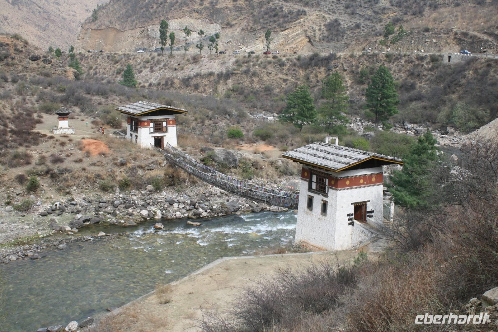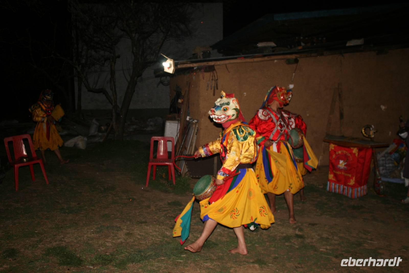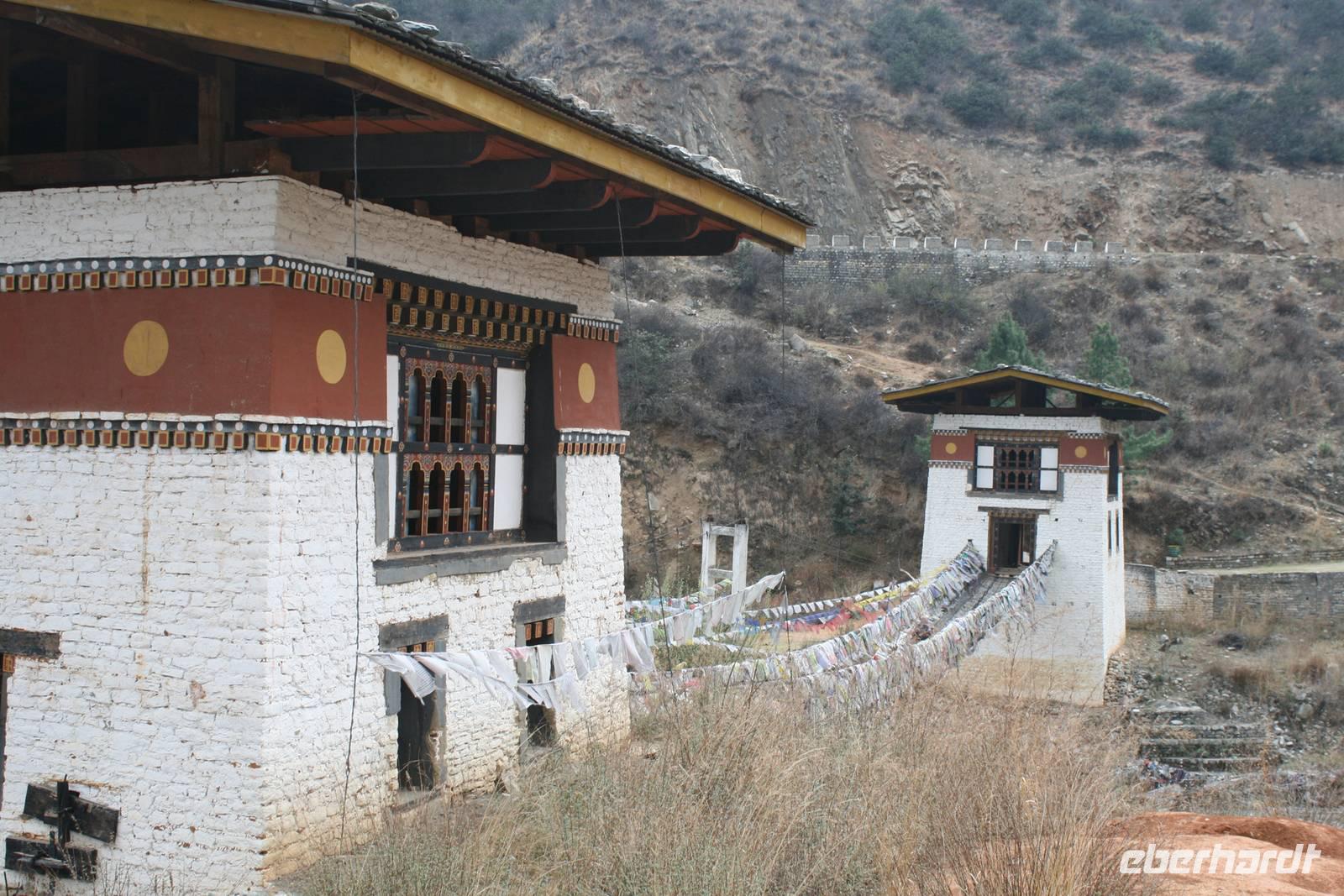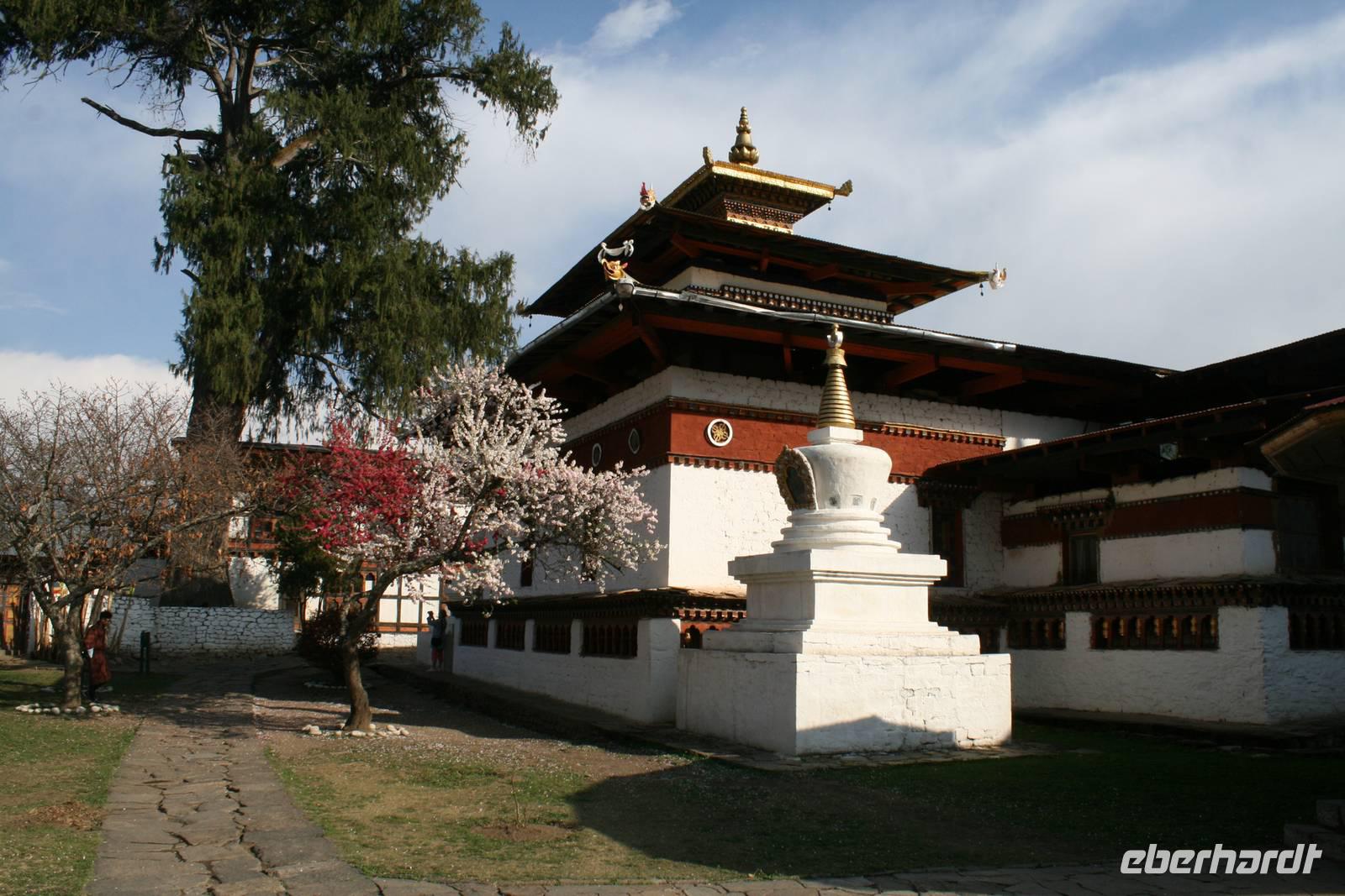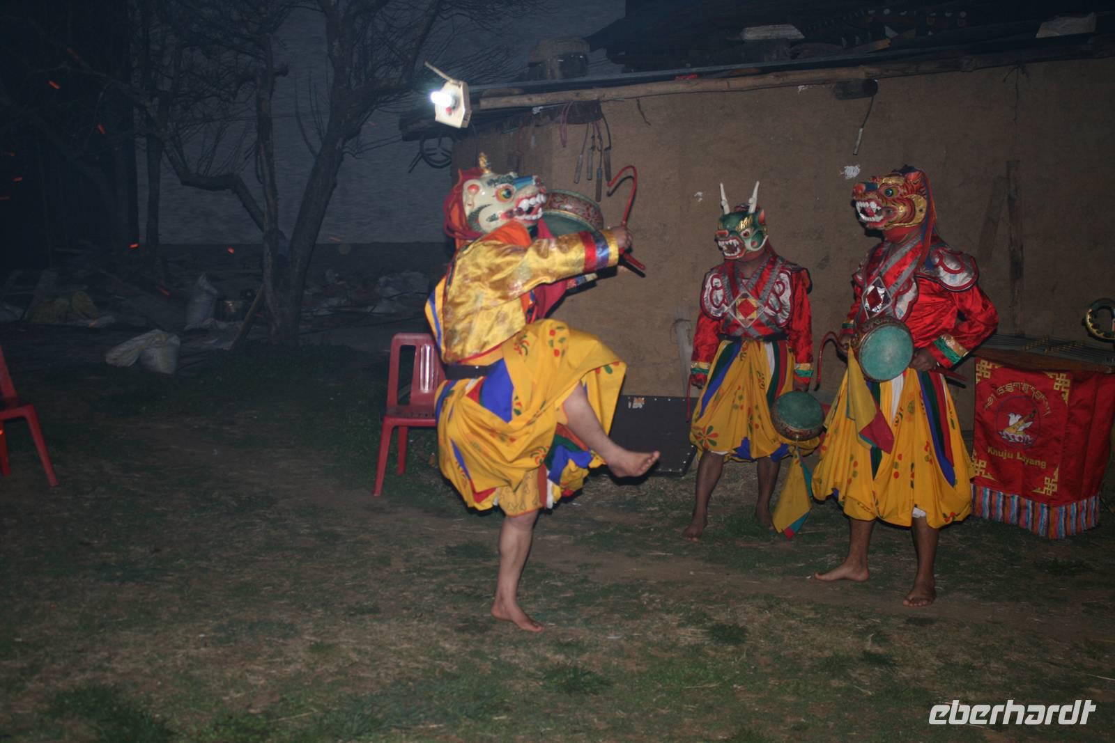 Heute verlassen wir Punakha und haben noch einmal die Möglichkeit, den Dochula-Pass zu überqueren. Wenn Engel reisen, spielt auch das Wetter mit und so haben wir beste Sicht auf die Bergkette, die uns noch gestern verwehrt blieb. So können wir hier die Himalaya-Berge im Nordosten erblicken. Wir sehen ein halbes Dutzend Siebentausender wie Masang Gang (7.158 Meter), Tsendagang (6.960 Meter), Terigang (7.060 Meter), Jejegangphugang (7.158 Meter), Kang 0phugang (7.170 Meter). Der Tafelberg Zongphugang (7.060 Meter) beherrscht die entlegene Region von Lunana. Bevor wir heute nach Paro fahren, besuchen wir noch den ältesten Dzong Bhutans, den Zhabdrung Ngawang Namgyal 1629 als ersten Dzong in Nepal erbauen ließ. Hier war der wehrhafte Charakter eines Festungsbaus um ein Kloster herum besonders deutlich nachzuvollziehen. Auch das Tachogang Kloster liegt noch auf unserem Weg und besticht vor allem durch seine unglaubliche Hängebrücke, die wir auch überqueren. Danach fahren wir zurück nach Paro und besuchen das Kloster Kyichu Lhakhang, welches das letzte Kloster auf unserer Reise nach Bhutan sein sollte. Kyichu Lhakhang ist ein buddhistischer Tempel in Pagodenbauweise. Die vermutlich im 7. Jahrhundert von Songtsen Gampo gegründete Anlage ist eines der ältesten buddhistischen Klöster in Bhutan, das dafür bestimmt war die Riesige Dämonin zu zähmen. Nach diesem Besuch fahren wir heute zu unserem traditionnellen Hotel "Olathang" in Paro. Am Abend haben wir noch eine Überraschung für unsere Gäste geplant, da es unser letzter Abend in Bhutan gemeinsam ist. Natürlich wurde vorher nichts verraten. So fahren wir mit unserem Bus erstmal in eine Art Niemansland bis sich später dann doch herausstellt, dass wir zu einem Farmhaus einer bhutanischen Familie fahren. Doch damit nicht genug, hier findet auch der traditionnell bhutanische Maskentanz statt, den wir bewundern dürfen. Anschließend zeigt uns die Familie Ihr Haus und wir essen hier auch zu Abend. Nur für uns hat die Familie gekocht und so lassen wir es uns bei Reis, Kartoffelsalat und anderen Leckereien gut schmecken. Selbst das Bier und der Whisky wurden gesponsert. Zum Abschluss zeigt uns Jimmee noch, wie man sich in Bhutan kleidet und auch die Tochter der Familie zeigt uns Ihr traditionnelles Gewand. So haben wir uns hier in jedem Fall pudelwohl gefühlt und wären auch gern noch länger geblieben, wenn der frühe Abflug am nächsten Tag nicht wäre. So bedanken wir uns in jedem Fall ganz, ganz herzlich bei Jimmee, unserem Busfahrer und auch bei der Familie. Solch eine Herzlichkeit und Gastfreundschaft haben wir selten irgendwo erlebt. Mit vielen Eindrücken fahren wir anschließend zurück zum Hotel und sind auch ein wenig wehmütig, dass die Tage in Bhutan schon wieder vorbei sind.
