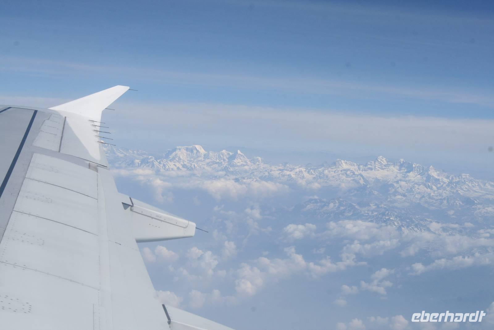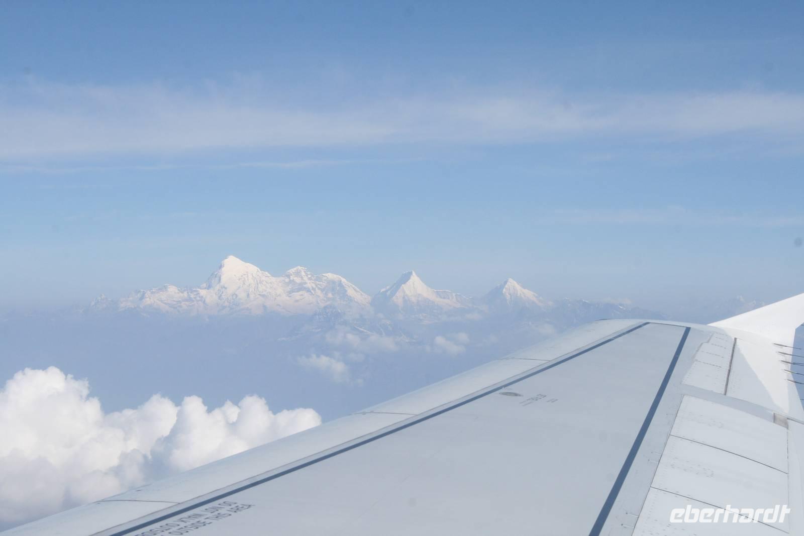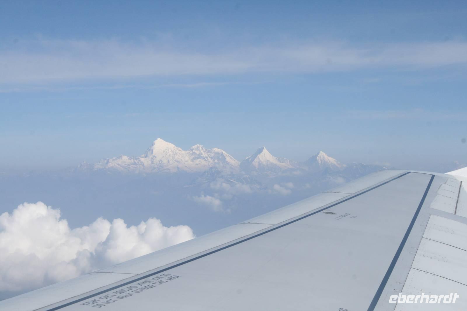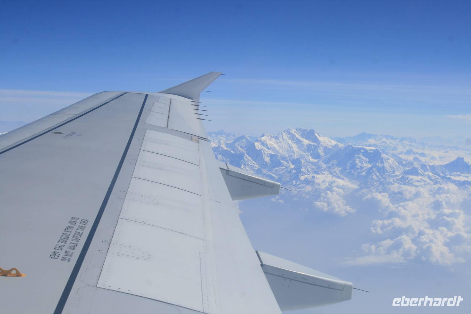 Am Morgen trafen sich die ersten Reisefreudigen meiner 15-köpfigen Nepal und Bhutangruppe am Flughafen in Dresden. Bereits beim Informationsabend und bei den Telefonaten an den Vortagen konnten letzte Fragen geklärt werden und so freuten wir uns sehr auf unsere gemeinsame Reise und auf unser Abenteuer Nepal und Bhutan. Nach einem weiteren Halt mit unserem Reisebus an der Raststätte Klettwitz, fuhren wir direkt weiter nach Berlin-Tegel, wo wir pünktlich und sicher ankamen und auch herzlich unsere Mitreisenden in Empfang nahmen. Die Reisepässe mit den zugehörigen Visa und die Vordrucke für die Einreiseformulare waren schnell verteilt und so checkten wir gemeinsam voller Vorfreude am Schalter der Turkish Airlines ein, in der Hoffnung, dass all unser Gepäck auch Kathmandu erreichen würde. Nach einem leckeren Baguette und einem Kaffee im Bistro Leysieffer am Flughafen Berlin-Tegel, begaben wir uns zu unserem Abfluggate und flogen pünktlich zu unserer ersten Station nach Istanbul. Hier angekommen, stellten wir unsere Uhren bereits eine Stunde vor und fanden auch schnell unser Weiterfluggate nach Kathmandu. Mit etwas Verpätung flogen wir mit einer Flugzeit von ca. 7 Stunden und einer Zeitverschiebung von weiteren 3:45 Stunden weiter nach Kathmandu. Einige hatten schon etwas Bammel vor der Landung, nach der Schlagzeile der Turkish Airlines Maschine vor einigen Tagen, aber wir landeteten sicher und konnten unterwegs sogar den ersten Blick auf die Annapurna-Gebirgskette werfen.