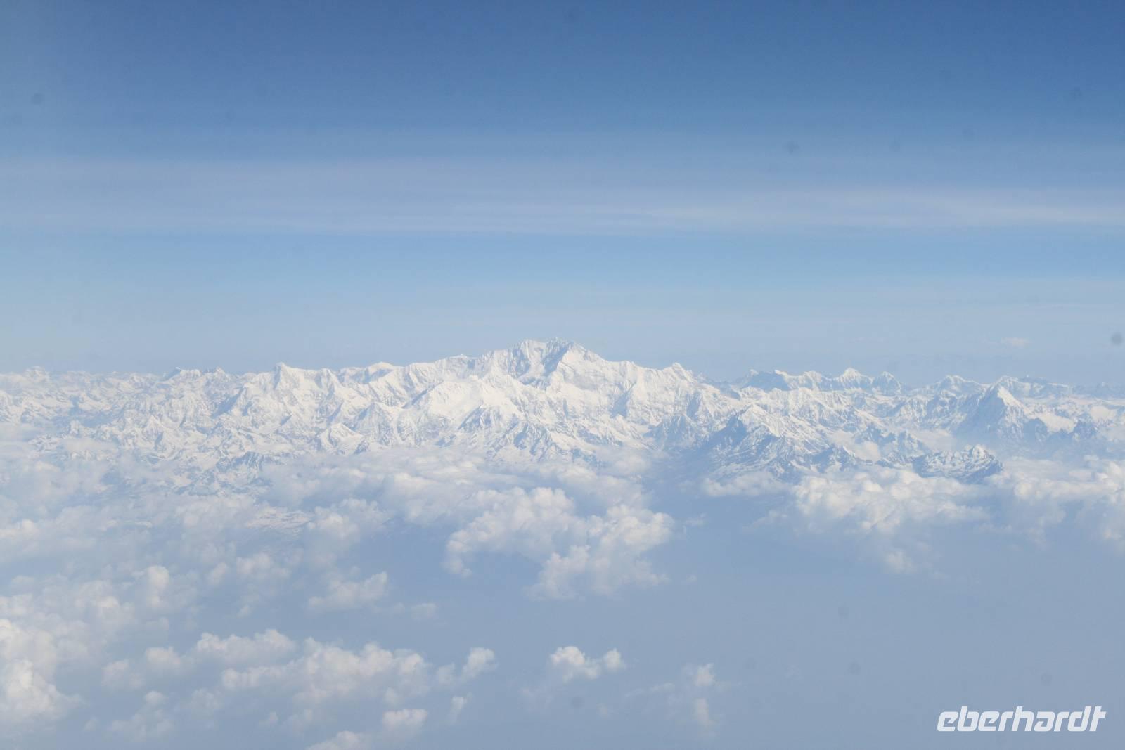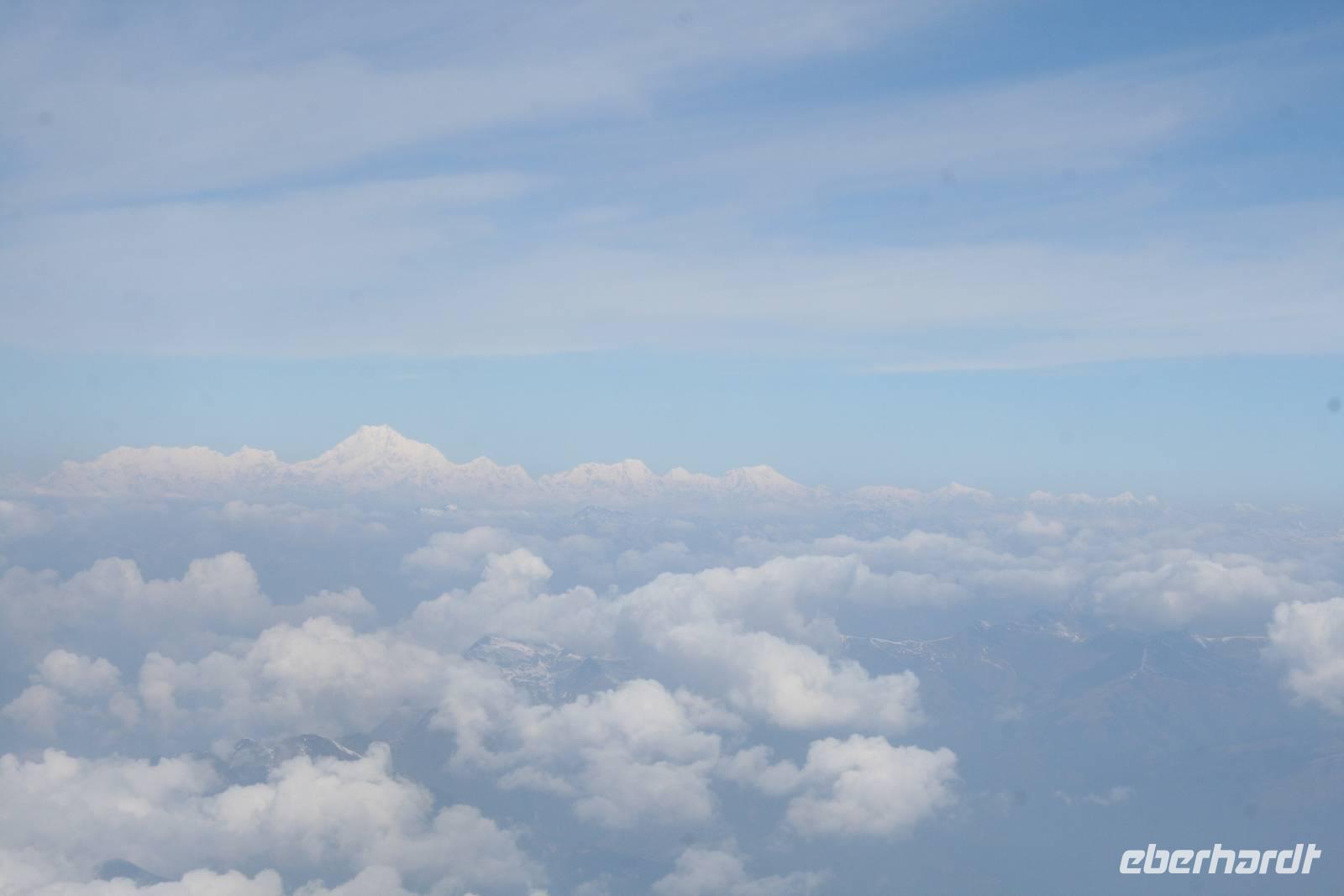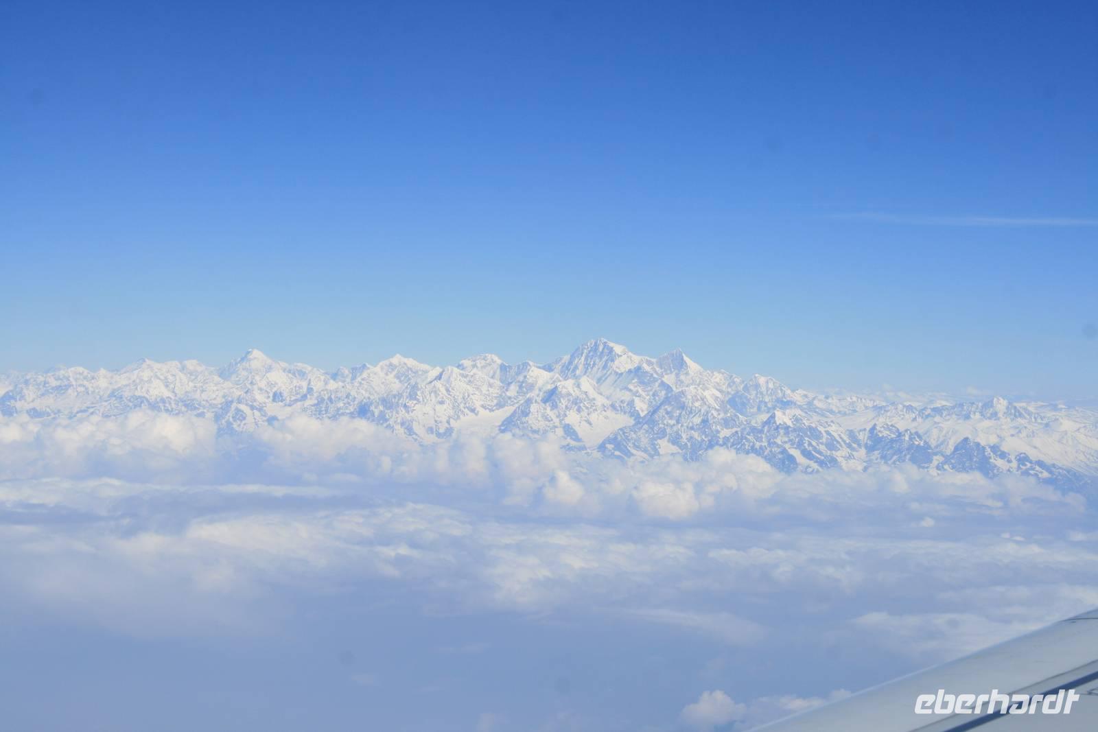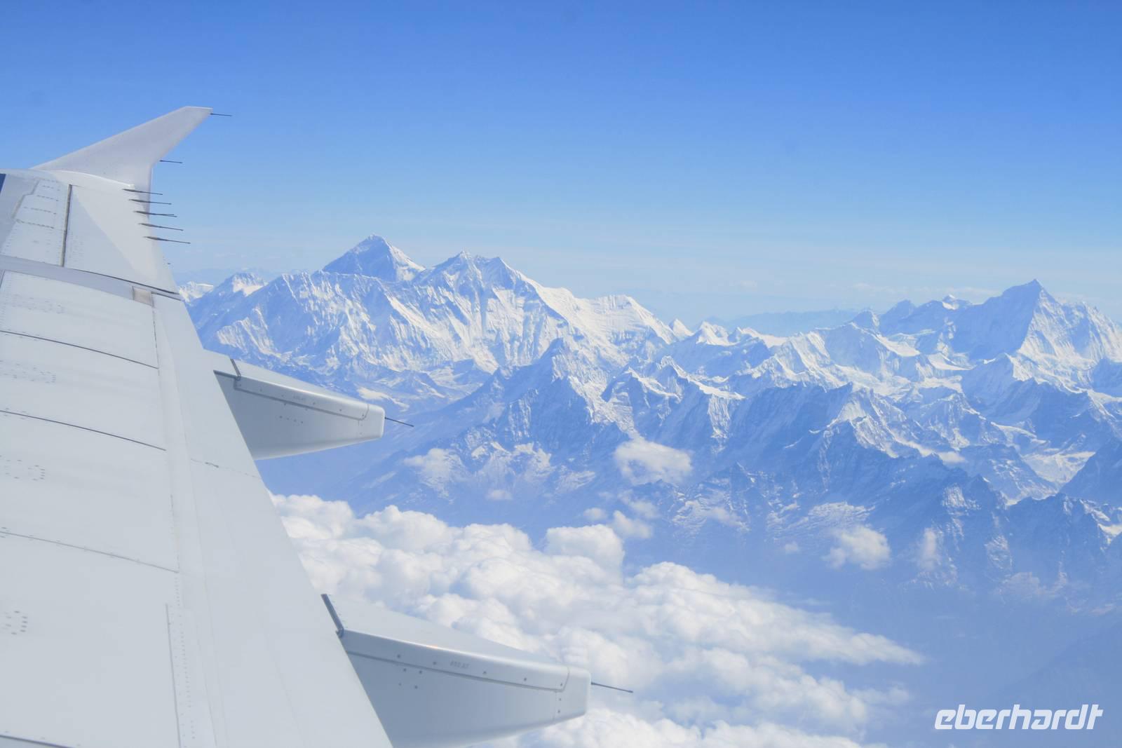 Am Morgen trafen sich die ersten Reisefreudigen meiner 15-köpfigen Nepal und Bhutangruppe am Flughafen in Dresden. Bereits beim Informationsabend und bei den Telefonaten an den Vortagen konnten letzte Fragen geklärt werden und so freuten wir uns sehr auf unsere gemeinsame Reise und auf unser Abenteuer Nepal und Bhutan. Nach einem weiteren Halt mit unserem Reisebus an der Raststätte Klettwitz, fuhren wir direkt weiter nach Berlin-Tegel, wo wir pünktlich und sicher ankamen und auch herzlich unsere Mitreisenden in Empfang nahmen. Die Reisepässe mit den zugehörigen Visa und die Vordrucke für die Einreiseformulare waren schnell verteilt und so checkten wir gemeinsam voller Vorfreude am Schalter der Turkish Airlines ein, in der Hoffnung, dass all unser Gepäck auch Kathmandu erreichen würde. Nach einem leckeren Baguette und einem Kaffee im Bistro Leysieffer am Flughafen Berlin-Tegel, begaben wir uns zu unserem Abfluggate und flogen pünktlich zu unserer ersten Station nach Istanbul. Hier angekommen, stellten wir unsere Uhren bereits eine Stunde vor und fanden auch schnell unser Weiterfluggate nach Kathmandu. Mit etwas Verpätung flogen wir mit einer Flugzeit von ca. 7 Stunden und einer Zeitverschiebung von weiteren 3:45 Stunden weiter nach Kathmandu. Einige hatten schon etwas Bammel vor der Landung, nach der Schlagzeile der Turkish Airlines Maschine vor einigen Tagen, aber wir landeteten sicher und konnten unterwegs sogar den ersten Blick auf die Annapurna-Gebirgskette werfen.