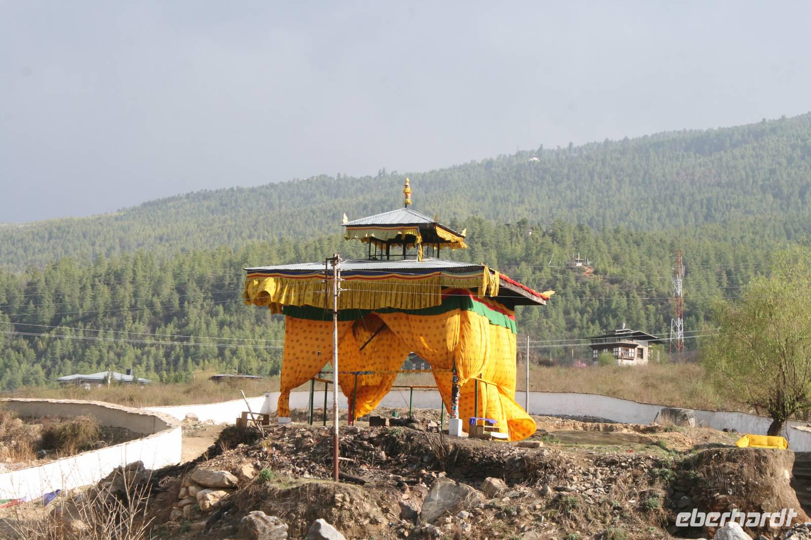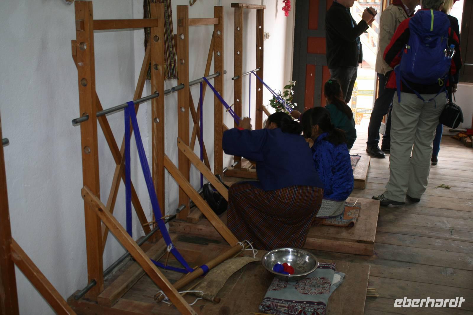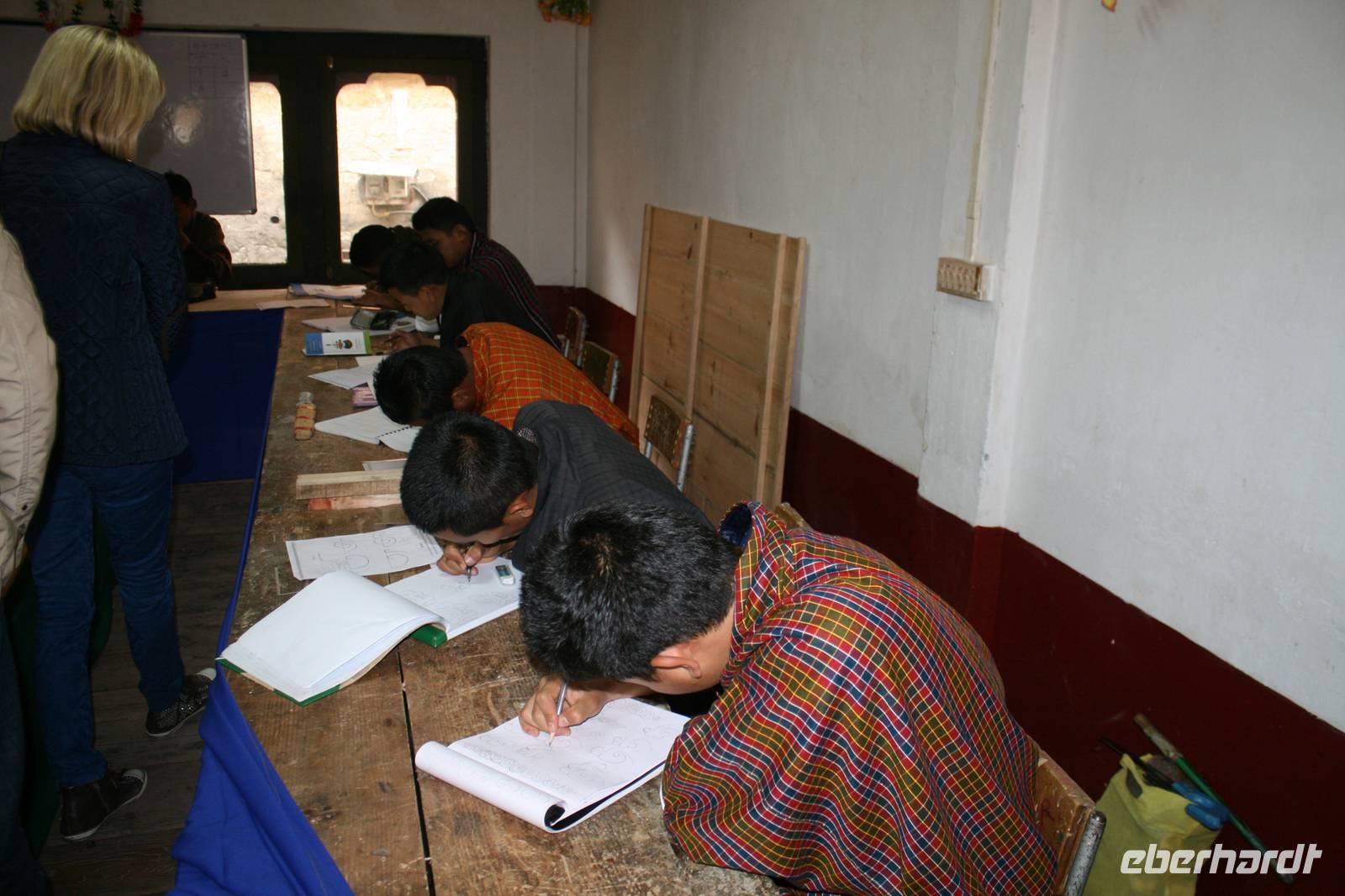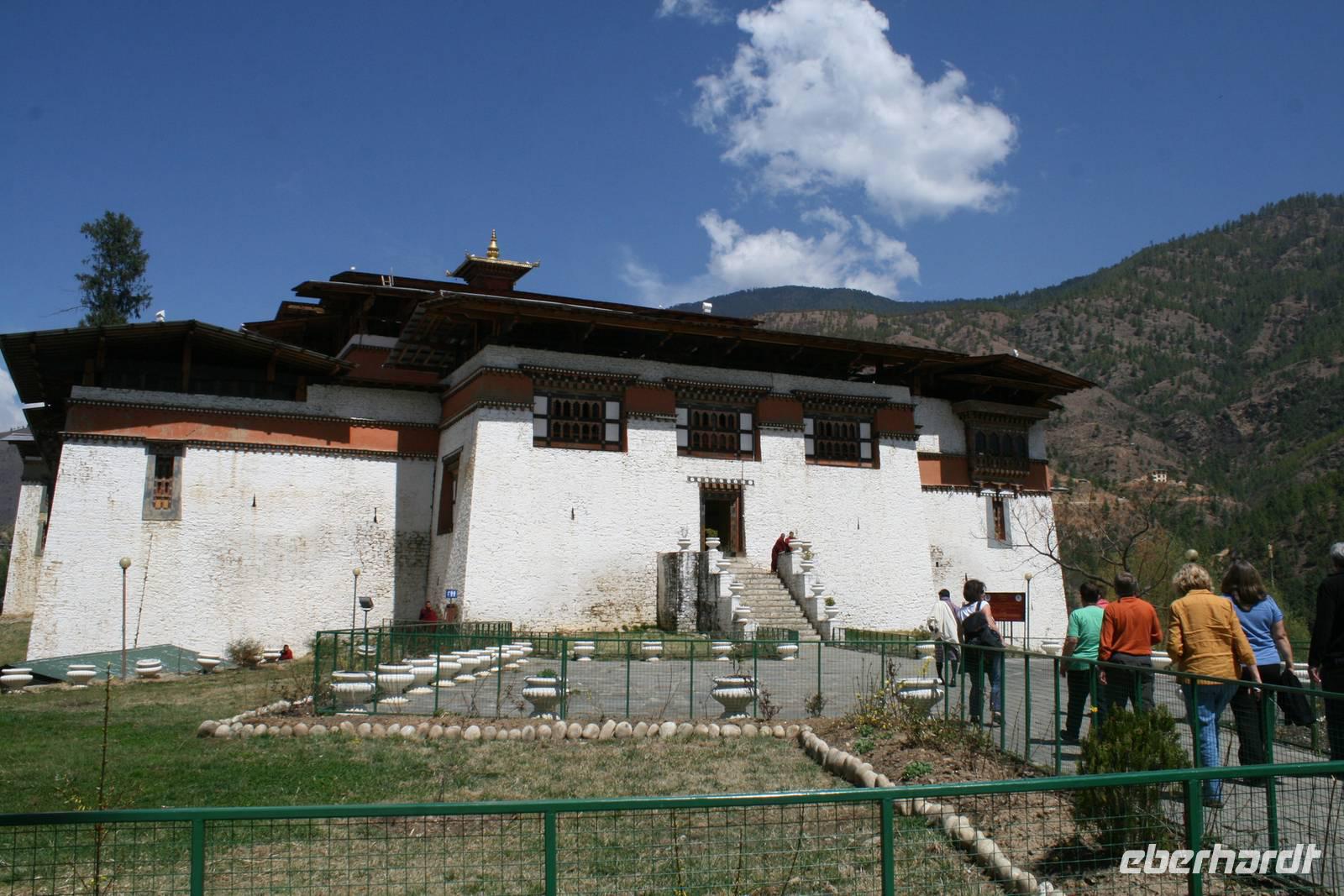 Heute erwachen wir in Bhutans Hauptstadt und genießen unser erstes Frühstück hier. Jimmee holt uns am Hotel ab und wir gehen zunächst zu Fuß zu einer Ampelkreuzung, wo die Ampel noch ein Polizist ist. Gern wollen wir das Treiben beobachten, aber leider ziert sich der Kleine noch ein bisschen. Irgendwann lässt er sich dann aber doch bitten und ist für uns ein tolles Fotomotiv. Danach fahren wir mit unserem Reisebus zum Erinnerungschörten. Der Chörten ist als eindrucksvolles Denkmal zum Gedenken an den dritten König Wangchuck errichtet worden. Wir sehen hier viele Gläubige, die nacheinander den Chörten umrunden und damit Ihren Glauben ausdrücken. Anschließend fahren wir zur hoch über der Stadt thronenden Bhudda-Statue. Diese neu gebaute Statue gehört zu den größten Buddha-Statuen der Welt. Sie ist 51,5 Meter hoch. Die Statue enthält 125.000 kleinere vergoldete Buddha-Statuen. Der Thron, auf dem Buddha Dordenma sitzt, ist eine große Meditationshalle. Wir nutzen die Kulisse natürlich für ein Gruppenbild. Danach führt uns unsere Reise weiter zur Malereischule von Thimphu. Hier können wir den Schülern bei der Arbeit zusehen und auch erkennen, dass Sie jetzt schon wahre Künstler sind. Danach zeigt uns Jimmee das Nationalmuseum von Thimphu und erklärt uns, wie die Menschen noch heute in Ihren Farmhäusern leben und wie diese aufgebaut sind. Ein Höhepunkt folgt dem nächsten und so fahren wir danach zur Nationalbibliothek. Hier wird uns auch wieder das Ausmaß der Lehren des Bhuddismus bewusst und wie schwierig es ist, diese zu verstehen. Wir erfahren auch viel über die Königsfamilie und lernen diese näher kennen. Danach geht es weiter zum Bogen schießen. Es kommt uns vor, als wäre dies der Nationalsport der Einheimischen. Auch wir versuchen unser Glück und die, die am meisten danach geschriehen haben, es zu versuchen, können es dann doch am schlechtesten nicht wahr Simone? Aber es hat in jedem Fall Spaß gemacht und wer kann schon sagen, er hätte in Bhutan das Bogen schießen probiert? Wir sind beeindruckt von der Leistung der Männer und von Ihrem Können.