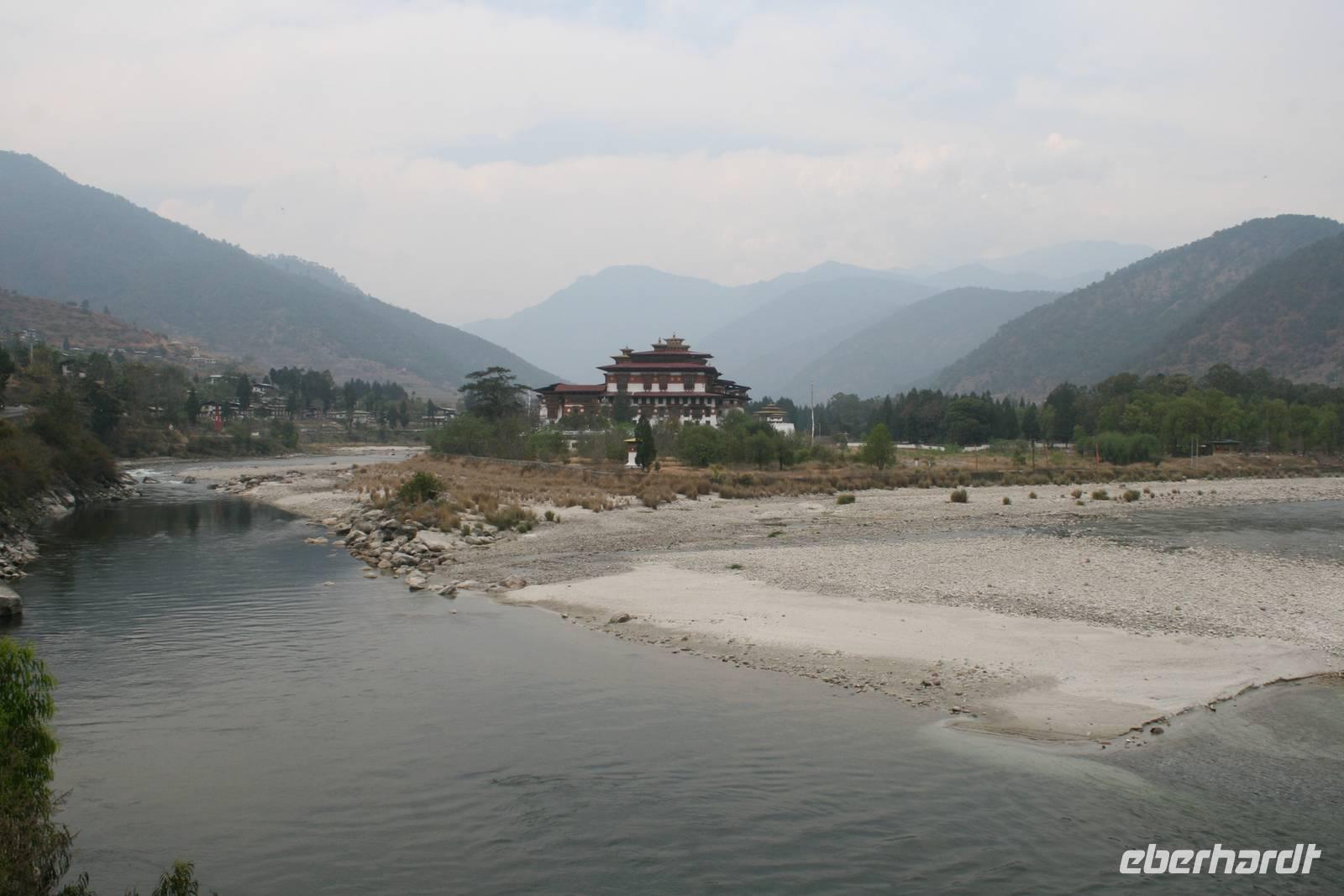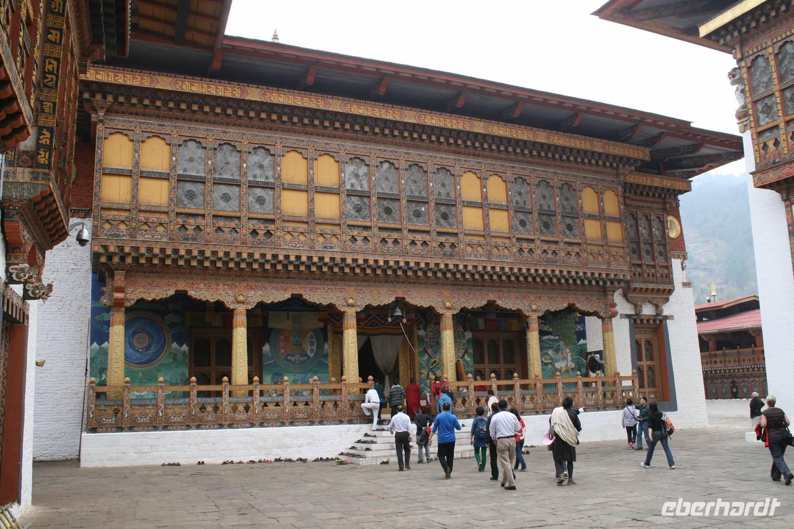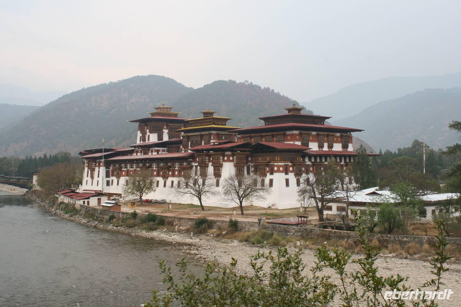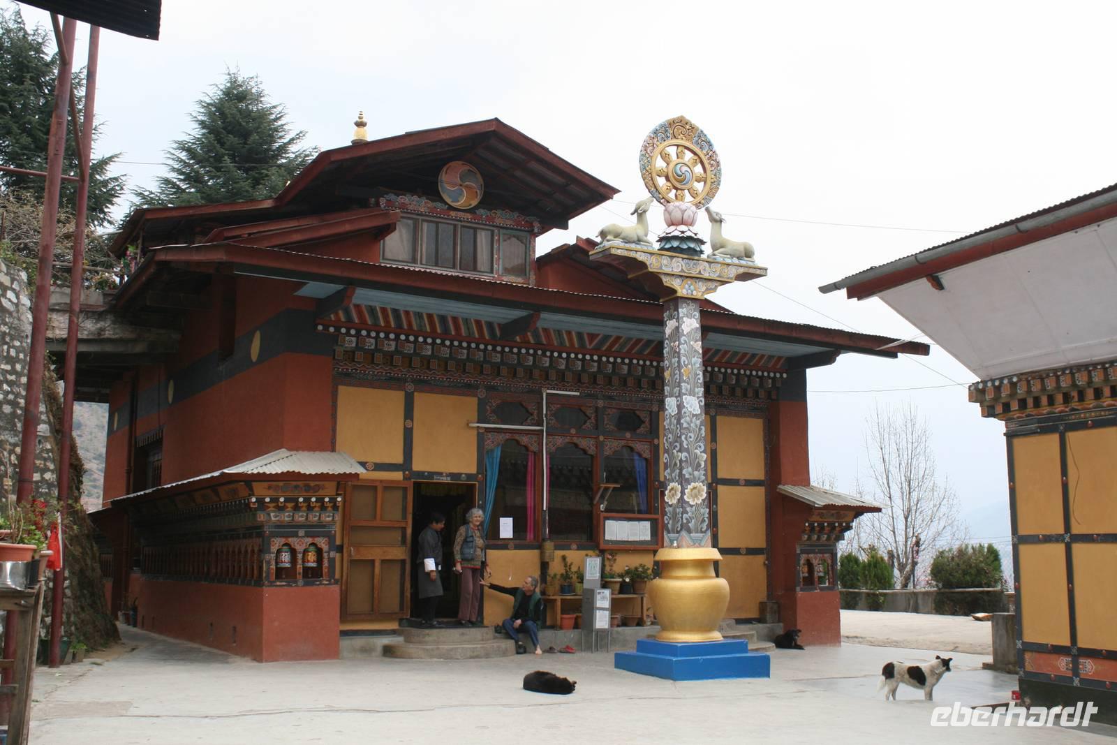 Heute heißt es Abschied nehmen von Nepal und mal wieder zeitg aufstehen, denn unser Flug nach Paro ist bereits für 07:30 Uhr gebucht. Abi und unsere Busfahrer bringen uns natürlich wie gewohnt professionell und pünktlich zum Flughafen. Auf dem Weg verabschieden wir uns herzlich und hoffen natürlich, alle gesund und munter nach der Rückkehr aus Bhutan noch einmal wiederzusehen. Natürlich sollen Sie während unserer Abwesenheit auch entsprechende Aufgaben erfüllen: Briefmarken kaufen und Postkarten der Gäste versenden sowie schon einmal einen Rumvorrat für die Rückkehr sichern. Am Flughafen angekommen, gehen wir gemeinsam zum Schalter der Druk Air, die staatliche Fluggesellschaft des Königreiches Bhutan. Sunil, der Chef der nepalesischen Agentur, erledigt wieder alle Formalitäten für uns, so dass wir uns um nichts kümmern müssen. So müssen wir an der Passkontrolle wieder die obligatorischen Ausreiseformulare für Nepal abgeben, die alle schon von Vicky bekommen haben. Wir bekommen einen Ausreisestempel und passieren anschließend die Sicherheitskontrolle: Frauen und Männer natürlich getrennt so wie es sich gehört. Nach einer längeren Wartezeit ging es dann doch endlich los und wir flogen von Kathmandu nach Paro. Generell war der Flug aber doch etwas hektisch, da wir noch diverse Einreiseformulare ausfüllen und zudem noch unseren Snack essen mussten. Außerdem muss man bei einer Flugzeit von knapp einer Stunde nebenbei auch noch die Himalaya-Gebirgskette und den Mount Everest bewundern. Gott sei Dank konnten wir aber bei unserem Rückflug später doch noch in aller Ruhe das Panorama genießen. Einfach hat man es als Tourist nun wirklich nicht. In jedem Fall war der Anflug nach Paro spektakulär und nervernaufreibend zu gleich. Durch ein enges Tal gelang es dem Flieger dann aber doch sicher zu landen. Schon von Weitem begeisterte uns die Landschaft und die Schönheit der Gebäude, die uns in den nächsten Tagen noch erwarten werden. Am Flughafen angekommen, nutzen wir gleich die Gelgenheit um unsere Euros in Bhutanische Ngultrum, oder auch Grumgrum, wie Vicky zu sagen pflegte, zu tauschen und schon dort spürten wir die unheimliche Freundlichkeit der Einwohner. Die Regierung Bhutans verfolgt eine sehr spezielle Visapolitik. Die Einreise ist grundsätzlich nur als Tourist oder als Gast der Regierung möglich. Die Passkontrolle schnell überwunden, haben auch unsere Koffer wieder ihren Weg gefunden. Am Ausgang wurden wir herzlich von unserem Reiseleiter Jimmee und dem Chef der Agentur in ihren traditionnellen Gewändern und immer mit einem Lächeln auf den Lippen freundlich in Empang genommen. In Bhutan ist alles ein bisschen kleiner als in Nepal, so auch unser Reisebus, aber das tat der immer postiven Stimmung der Abstiegsgruppe keinen Abbruch. Da es schon etwas spät ist und unsere Mägen schon knurren, beschließen wir zunächst zum Mittagessen zu fahren. Hier wird auch die neue Biersorte Druk Lager eingeweiht und als gut und köstlich befunden. Das Essen schmeckt auch hier wunderbar und wir gewöhnen uns schon langsam an die bhutanische Lebensweise, die uns in den nächsten Tagen noch viel Freude bereiten wird. Anschließend fahren wir zunächst zum Paro Dzong und erfahren, was ein Dzong überhaupt ist. Dzong ist die Bezeichnung für buddhistische Klosterburgen in Bhutan und Tibet sowie, in kleinerem Umfang, auch in anderen tibetisch geprägten Gebieten im Himalaya. Der Paro Dzong ist eine Burg im Westen des Landes, dessen Wahrzeichen unter anderem eine massive und überdachte Holzbrücke ist. Unter anderem ist heute dort das Nationalmuseum und der Sitz der lokalen Verwaltung von Paro untergebracht. Erbaut wurde das Gebäude um 1646, allerdings wurde es im Laufe der Geschichte mehrmals zerstört und wieder aufgebaut. An der Zerstörung waren meist Brände oder Erdbeben schuld. Paro Dzong wird von vielen Bhutanesen als die ideale Form einer Burg angesehen, deswegen wurde die Architektur oft kopiert. Jimmee erklärt uns auch auch, wie man sich in einem Dzong richtig verhält und was erlaubt ist und was nicht. Immer wenn man zum Beispiel die Schuhe ausziehen muss, darf man auch nicht fotografieren. Tolle Eselsbrücken, die uns weiterhelfen. Außerdem hat er auch immer kleine Zettel für uns parat, die uns helfen, die Gebäude und damit verbundene Geschichte besser zu verstehen. Wir sind alle sehr begeistert. Generell fällt uns auch schnell auf, dass hier noch alles viel traditionneller ist, als in Nepal und vor allem ruhiger. In jedem Fall kann es nicht daran liegen, dass in Bhutan generell viel mehr Männer als Frauen leben. Von Paro führt uns unser Weg weiter nach Thimphu. Die Stadt, mit einer Bevölkerung von 79.115 Einwohnern, ist die Hauptstadt des Himalaya-Königreichs. Die Stadt liegt im Westen des Landes am Fluss Wang Chu in einer Höhe von 2320 Metern. Da wir am nächsten Tag ein ziemlich straffes Programm vor uns haben, entscheiden wir uns bereits heute schon den Thimphu-Dzong zu besuchen. Er gilt als Klosterfestung und Regierungssitz der Stadt. Wir haben großes Glück, denn wir können einer Zeremonie beiwohnen und diese aus nächster Nähe betrachten. Bevor wir heute zu unserem ersten Hotel in Bhutan fahren, muss natürlich noch entsprechende Desinefktion besorgt werden. So holen Jimmee und Vicky bhutanischen Whisky und lassen Ihre Gäste gern probieren. Am späten Nachmittag erreichen wir unser hübsches "Jumolhari" Hotel in Thimphu und sind wirklich begeistert über den Fortschritt und die Sauberkeit hier. Doch eines gibt es sowohl in Nepal, als auch in Bhutan: kleffende Hunde, die tagsüber schlafen und nachts hellwach sind. Auch Sie haben uns in dieser Nacht wieder begleitet.