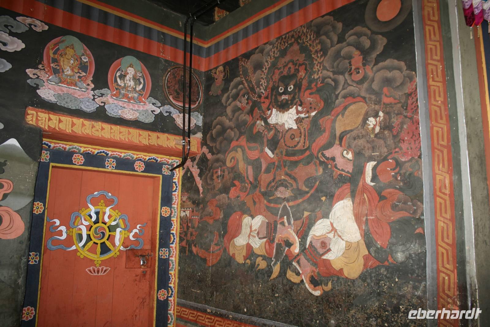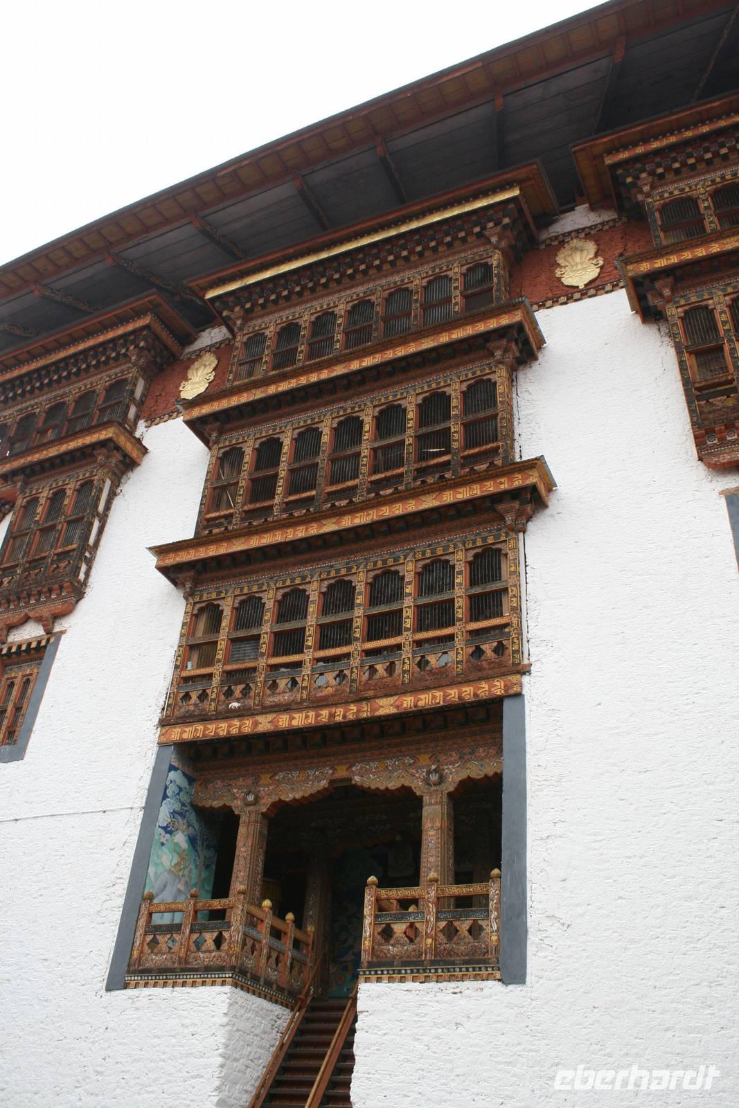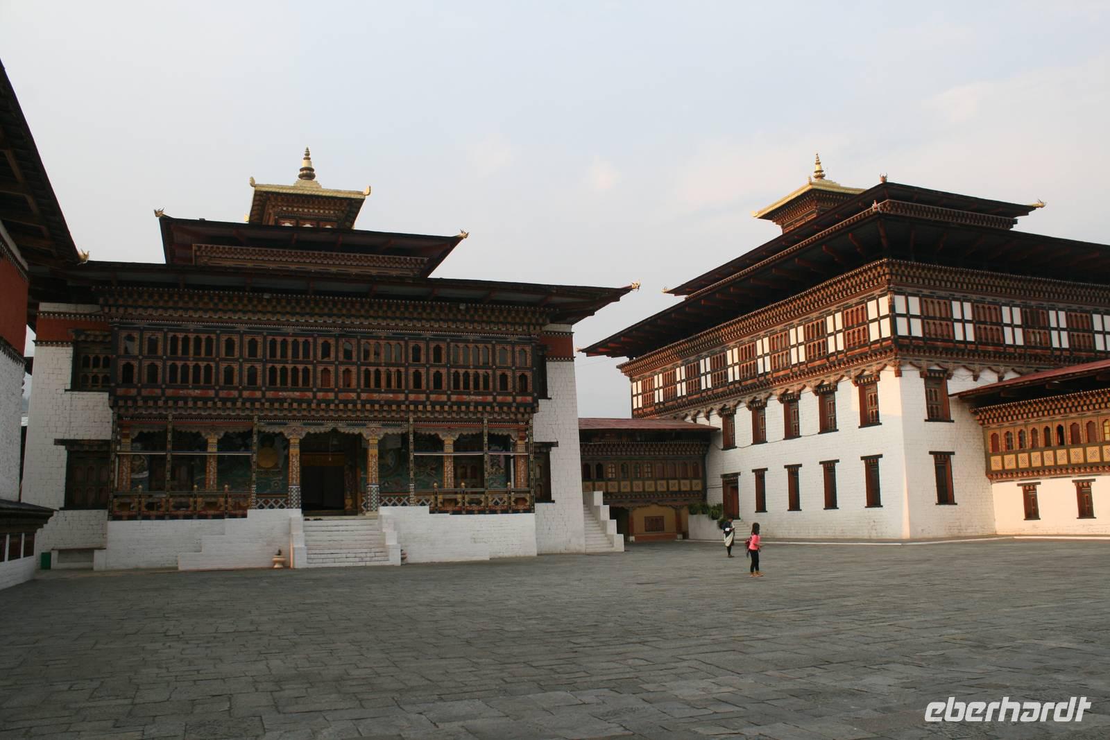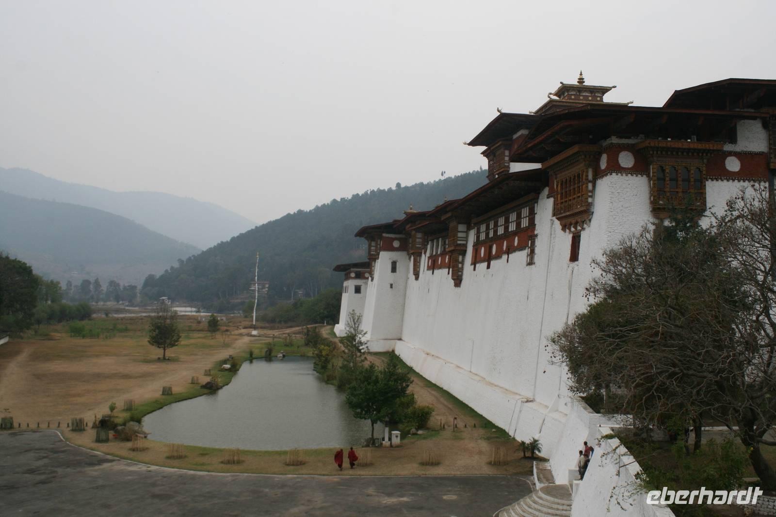 Heute heißt es Abschied nehmen von Nepal und mal wieder zeitg aufstehen, denn unser Flug nach Paro ist bereits für 07:30 Uhr gebucht. Abi und unsere Busfahrer bringen uns natürlich wie gewohnt professionell und pünktlich zum Flughafen. Auf dem Weg verabschieden wir uns herzlich und hoffen natürlich, alle gesund und munter nach der Rückkehr aus Bhutan noch einmal wiederzusehen. Natürlich sollen Sie während unserer Abwesenheit auch entsprechende Aufgaben erfüllen: Briefmarken kaufen und Postkarten der Gäste versenden sowie schon einmal einen Rumvorrat für die Rückkehr sichern. Am Flughafen angekommen, gehen wir gemeinsam zum Schalter der Druk Air, die staatliche Fluggesellschaft des Königreiches Bhutan. Sunil, der Chef der nepalesischen Agentur, erledigt wieder alle Formalitäten für uns, so dass wir uns um nichts kümmern müssen. So müssen wir an der Passkontrolle wieder die obligatorischen Ausreiseformulare für Nepal abgeben, die alle schon von Vicky bekommen haben. Wir bekommen einen Ausreisestempel und passieren anschließend die Sicherheitskontrolle: Frauen und Männer natürlich getrennt so wie es sich gehört. Nach einer längeren Wartezeit ging es dann doch endlich los und wir flogen von Kathmandu nach Paro. Generell war der Flug aber doch etwas hektisch, da wir noch diverse Einreiseformulare ausfüllen und zudem noch unseren Snack essen mussten. Außerdem muss man bei einer Flugzeit von knapp einer Stunde nebenbei auch noch die Himalaya-Gebirgskette und den Mount Everest bewundern. Gott sei Dank konnten wir aber bei unserem Rückflug später doch noch in aller Ruhe das Panorama genießen. Einfach hat man es als Tourist nun wirklich nicht. In jedem Fall war der Anflug nach Paro spektakulär und nervernaufreibend zu gleich. Durch ein enges Tal gelang es dem Flieger dann aber doch sicher zu landen. Schon von Weitem begeisterte uns die Landschaft und die Schönheit der Gebäude, die uns in den nächsten Tagen noch erwarten werden. Am Flughafen angekommen, nutzen wir gleich die Gelgenheit um unsere Euros in Bhutanische Ngultrum, oder auch Grumgrum, wie Vicky zu sagen pflegte, zu tauschen und schon dort spürten wir die unheimliche Freundlichkeit der Einwohner. Die Regierung Bhutans verfolgt eine sehr spezielle Visapolitik. Die Einreise ist grundsätzlich nur als Tourist oder als Gast der Regierung möglich. Die Passkontrolle schnell überwunden, haben auch unsere Koffer wieder ihren Weg gefunden. Am Ausgang wurden wir herzlich von unserem Reiseleiter Jimmee und dem Chef der Agentur in ihren traditionnellen Gewändern und immer mit einem Lächeln auf den Lippen freundlich in Empang genommen. In Bhutan ist alles ein bisschen kleiner als in Nepal, so auch unser Reisebus, aber das tat der immer postiven Stimmung der Abstiegsgruppe keinen Abbruch. Da es schon etwas spät ist und unsere Mägen schon knurren, beschließen wir zunächst zum Mittagessen zu fahren. Hier wird auch die neue Biersorte Druk Lager eingeweiht und als gut und köstlich befunden. Das Essen schmeckt auch hier wunderbar und wir gewöhnen uns schon langsam an die bhutanische Lebensweise, die uns in den nächsten Tagen noch viel Freude bereiten wird. Anschließend fahren wir zunächst zum Paro Dzong und erfahren, was ein Dzong überhaupt ist. Dzong ist die Bezeichnung für buddhistische Klosterburgen in Bhutan und Tibet sowie, in kleinerem Umfang, auch in anderen tibetisch geprägten Gebieten im Himalaya. Der Paro Dzong ist eine Burg im Westen des Landes, dessen Wahrzeichen unter anderem eine massive und überdachte Holzbrücke ist. Unter anderem ist heute dort das Nationalmuseum und der Sitz der lokalen Verwaltung von Paro untergebracht. Erbaut wurde das Gebäude um 1646, allerdings wurde es im Laufe der Geschichte mehrmals zerstört und wieder aufgebaut. An der Zerstörung waren meist Brände oder Erdbeben schuld. Paro Dzong wird von vielen Bhutanesen als die ideale Form einer Burg angesehen, deswegen wurde die Architektur oft kopiert. Jimmee erklärt uns auch auch, wie man sich in einem Dzong richtig verhält und was erlaubt ist und was nicht. Immer wenn man zum Beispiel die Schuhe ausziehen muss, darf man auch nicht fotografieren. Tolle Eselsbrücken, die uns weiterhelfen. Außerdem hat er auch immer kleine Zettel für uns parat, die uns helfen, die Gebäude und damit verbundene Geschichte besser zu verstehen. Wir sind alle sehr begeistert. Generell fällt uns auch schnell auf, dass hier noch alles viel traditionneller ist, als in Nepal und vor allem ruhiger. In jedem Fall kann es nicht daran liegen, dass in Bhutan generell viel mehr Männer als Frauen leben. Von Paro führt uns unser Weg weiter nach Thimphu. Die Stadt, mit einer Bevölkerung von 79.115 Einwohnern, ist die Hauptstadt des Himalaya-Königreichs. Die Stadt liegt im Westen des Landes am Fluss Wang Chu in einer Höhe von 2320 Metern. Da wir am nächsten Tag ein ziemlich straffes Programm vor uns haben, entscheiden wir uns bereits heute schon den Thimphu-Dzong zu besuchen. Er gilt als Klosterfestung und Regierungssitz der Stadt. Wir haben großes Glück, denn wir können einer Zeremonie beiwohnen und diese aus nächster Nähe betrachten. Bevor wir heute zu unserem ersten Hotel in Bhutan fahren, muss natürlich noch entsprechende Desinefktion besorgt werden. So holen Jimmee und Vicky bhutanischen Whisky und lassen Ihre Gäste gern probieren. Am späten Nachmittag erreichen wir unser hübsches "Jumolhari" Hotel in Thimphu und sind wirklich begeistert über den Fortschritt und die Sauberkeit hier. Doch eines gibt es sowohl in Nepal, als auch in Bhutan: kleffende Hunde, die tagsüber schlafen und nachts hellwach sind. Auch Sie haben uns in dieser Nacht wieder begleitet.