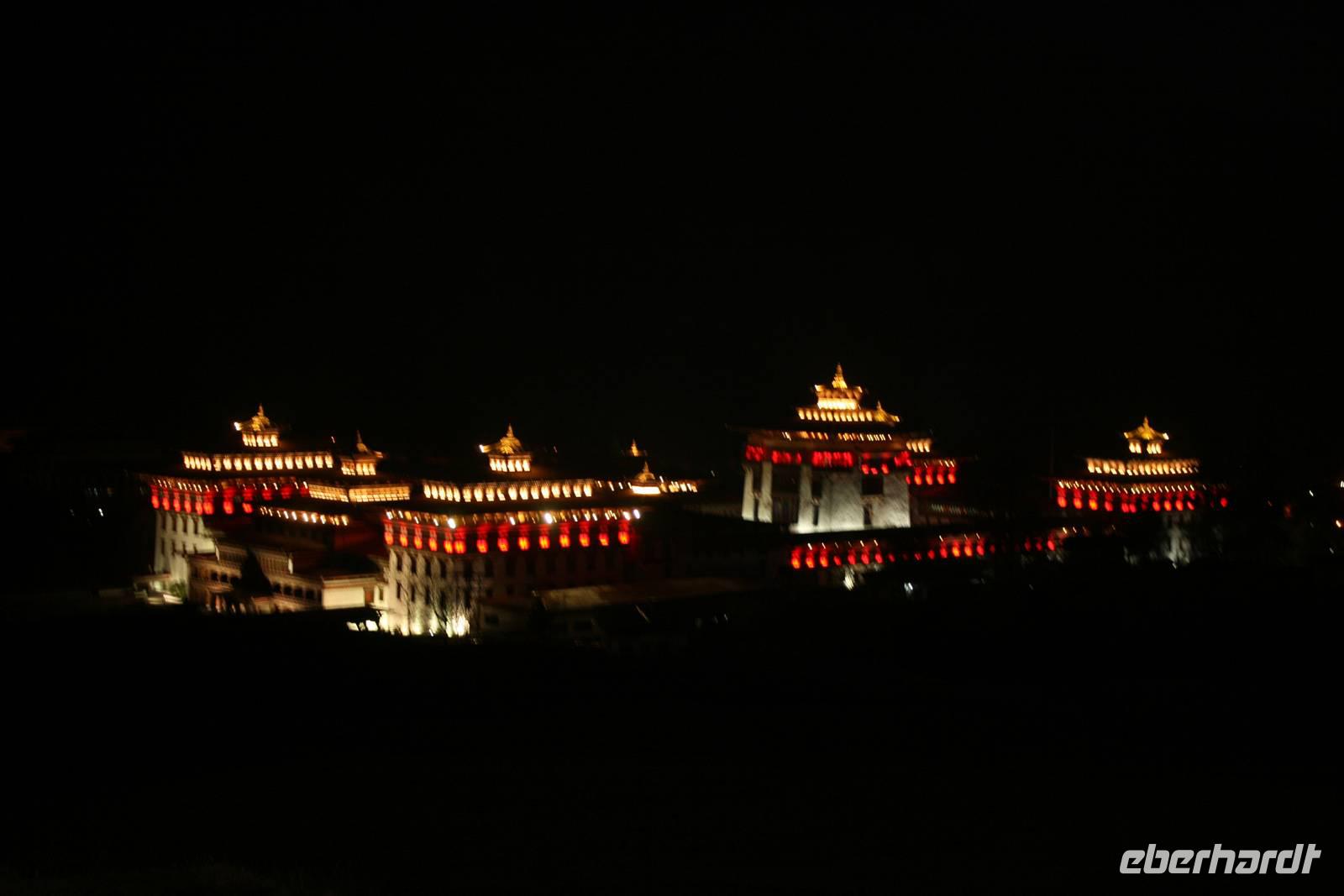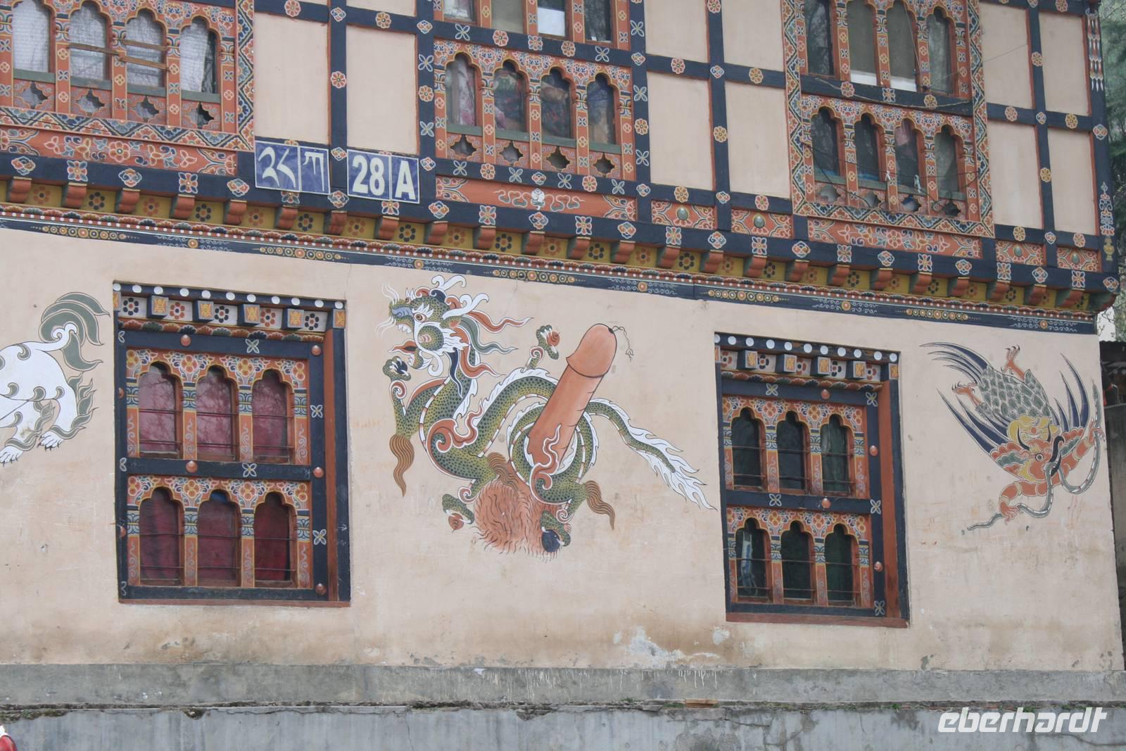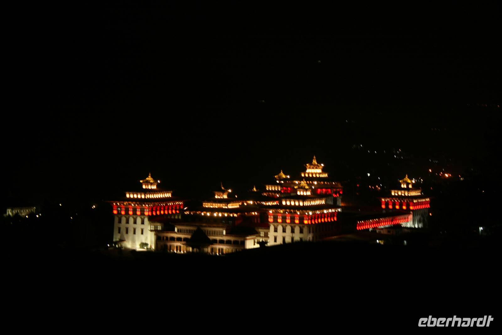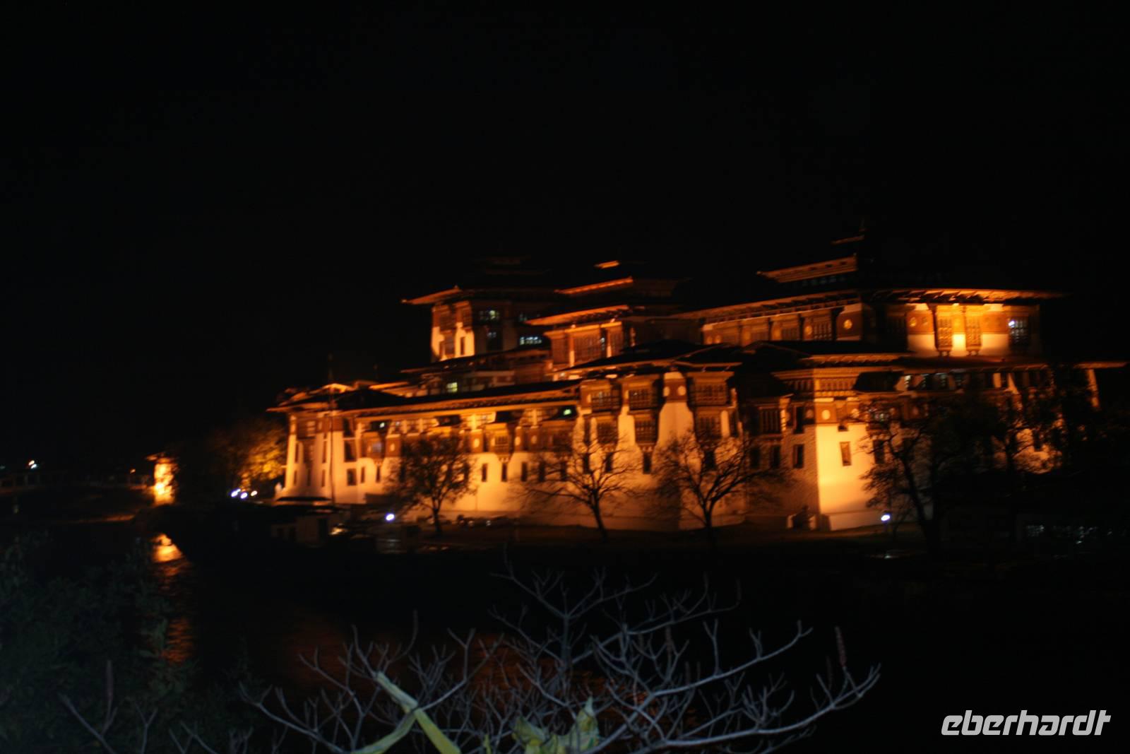 Unser Weg heute führt uns weiter zu einer Papierherstellungsfabrik und wir sehen, wie mühsam es ist, bis dort auch nur ein einziges Blatt Papier entsteht. Einige nutzen auch die Möglichkeit um das ein oder andere Souvenir für zu Hause zu kaufen. Auch der Besuch des Nonnenklosters darf am Nachmittag natürlich nicht fehlen. Später kommen wir zu einem Gehege von ganz besonderen Tieren: den Takins. Sie gelten als Nationaltier Bhutans und sind eine Säugetierart der Zieganartigen. Etwas plump wirken Sie schon aber wir alle haben so etwas wahrscheinlich noch nie gesehen. Das der Phallus in Bhutan eine bedeutende Rolle spielt, haben wir von Jimmee während unserer Reise schon erfahren. Er gilt als Zeichen der Fruchtbarkeit und ist aus diesem Grund auch an Häuserfassaden oft zu sehen. Auch der Drache als Nationalsymbol spielt eine bedeutende Rolle. So paart sich auch mal ein Drache mit einem Phallus Über Phalluse in Bhutan werden wir auch in den nächsten Tagen noch viel lernen. Nach einem langen Tag mit vielen Eindrücken fahren wir heute zurück zu unserem Hotel. Aber das sollte noch nicht das Ende sein, denn Jimmee möchte seinen Gästen gern alles von seinem Land zeigen. So treffen wir uns nach einer kurzen Pause wieder, um den Thimphu Dzong bei Dunkelheit zu bewundern. Alle die mitgekommen sind, haben es sicher nicht bereut. In verschiedenen Rot - und Gelbtönen erstrahlt er in seiner ganzen Schönheit. Mit vielen Motiven im Gepäck, genießen wir heute noch unser Abendessen im Hotel und suchen danach alle die Nachtruhe.
