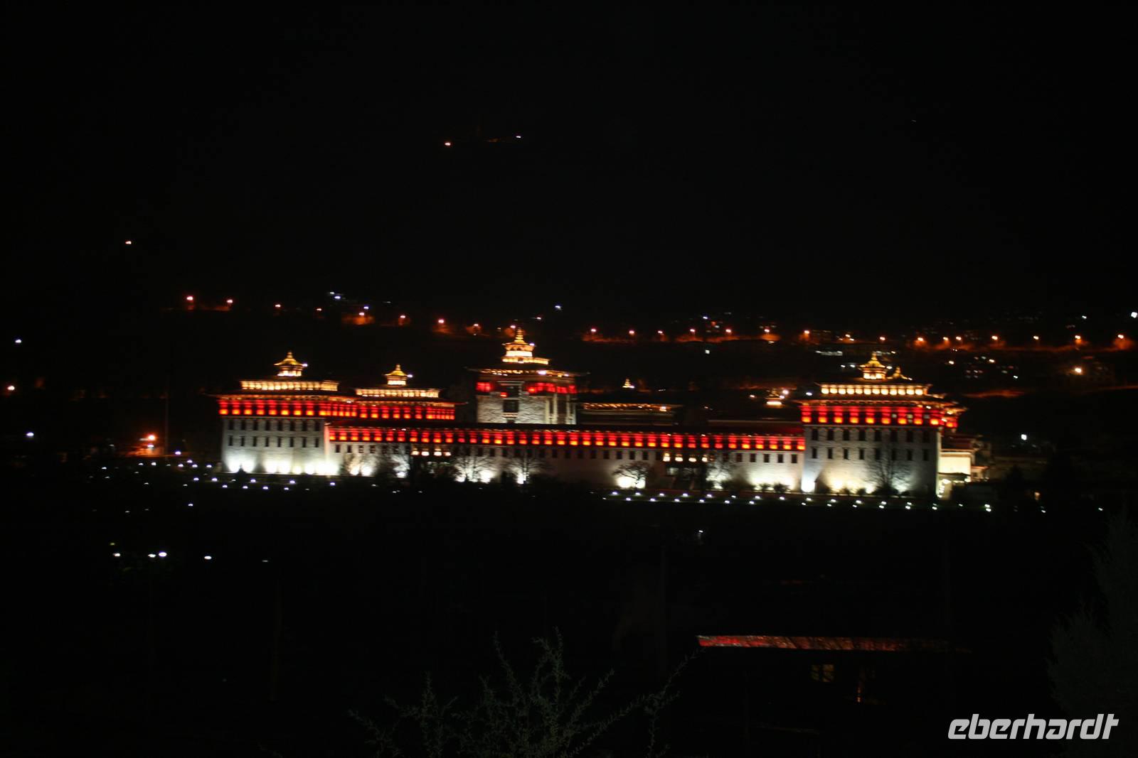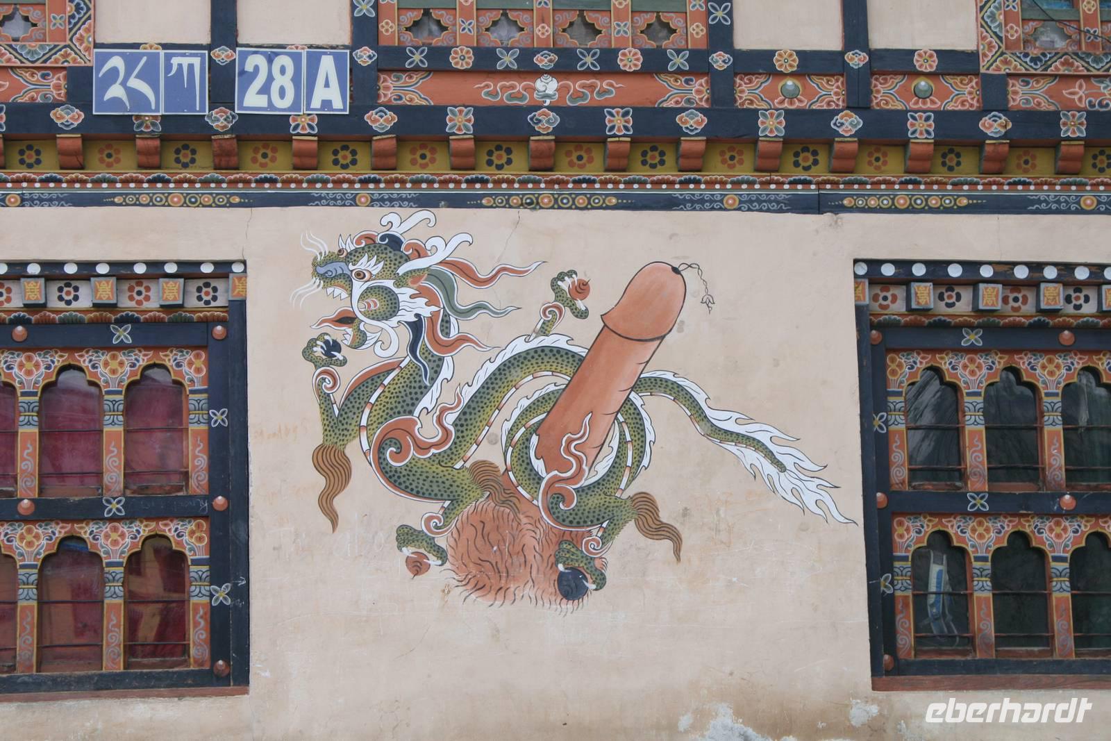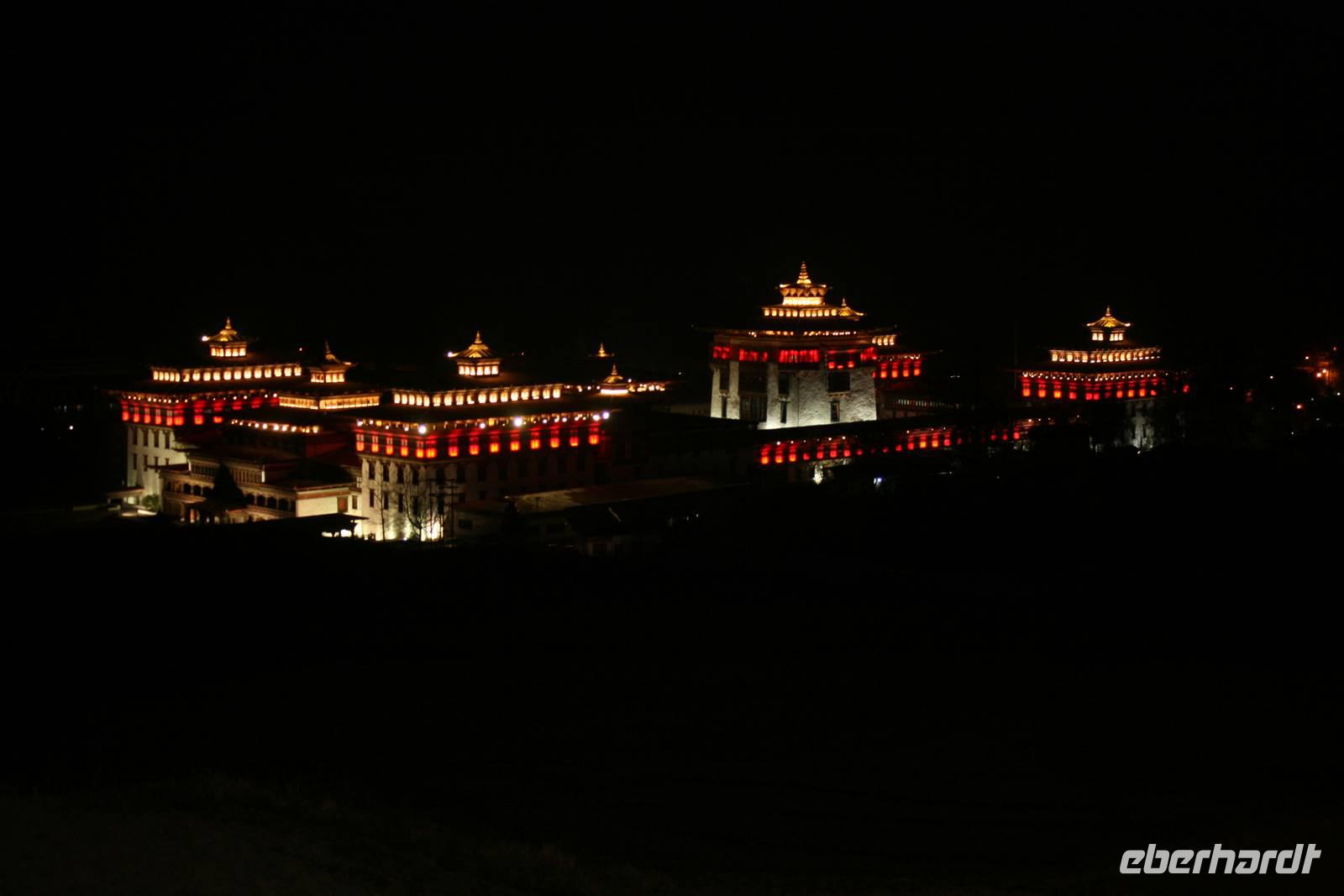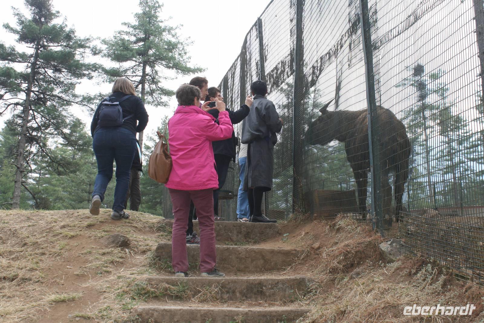 Unser Weg heute führt uns weiter zu einer Papierherstellungsfabrik und wir sehen, wie mühsam es ist, bis dort auch nur ein einziges Blatt Papier entsteht. Einige nutzen auch die Möglichkeit um das ein oder andere Souvenir für zu Hause zu kaufen. Auch der Besuch des Nonnenklosters darf am Nachmittag natürlich nicht fehlen. Später kommen wir zu einem Gehege von ganz besonderen Tieren: den Takins. Sie gelten als Nationaltier Bhutans und sind eine Säugetierart der Zieganartigen. Etwas plump wirken Sie schon aber wir alle haben so etwas wahrscheinlich noch nie gesehen. Das der Phallus in Bhutan eine bedeutende Rolle spielt, haben wir von Jimmee während unserer Reise schon erfahren. Er gilt als Zeichen der Fruchtbarkeit und ist aus diesem Grund auch an Häuserfassaden oft zu sehen. Auch der Drache als Nationalsymbol spielt eine bedeutende Rolle. So paart sich auch mal ein Drache mit einem Phallus Über Phalluse in Bhutan werden wir auch in den nächsten Tagen noch viel lernen. Nach einem langen Tag mit vielen Eindrücken fahren wir heute zurück zu unserem Hotel. Aber das sollte noch nicht das Ende sein, denn Jimmee möchte seinen Gästen gern alles von seinem Land zeigen. So treffen wir uns nach einer kurzen Pause wieder, um den Thimphu Dzong bei Dunkelheit zu bewundern. Alle die mitgekommen sind, haben es sicher nicht bereut. In verschiedenen Rot - und Gelbtönen erstrahlt er in seiner ganzen Schönheit. Mit vielen Motiven im Gepäck, genießen wir heute noch unser Abendessen im Hotel und suchen danach alle die Nachtruhe.