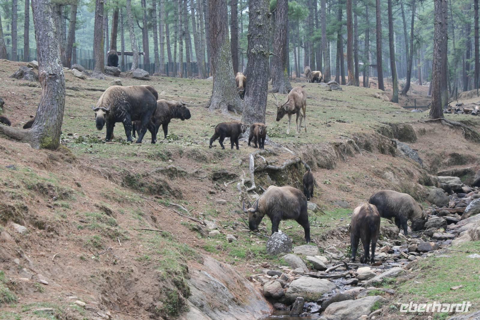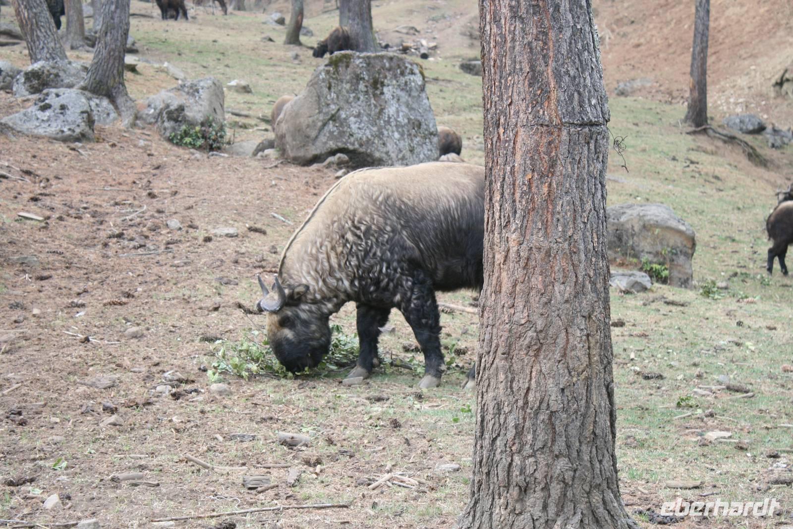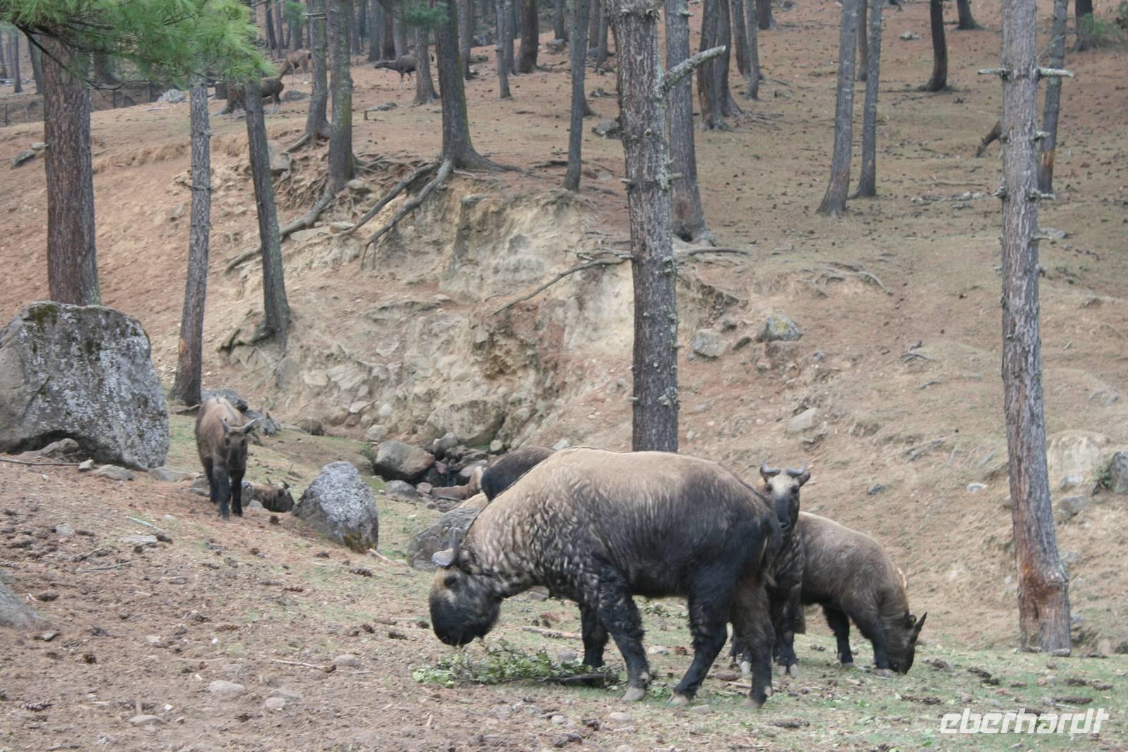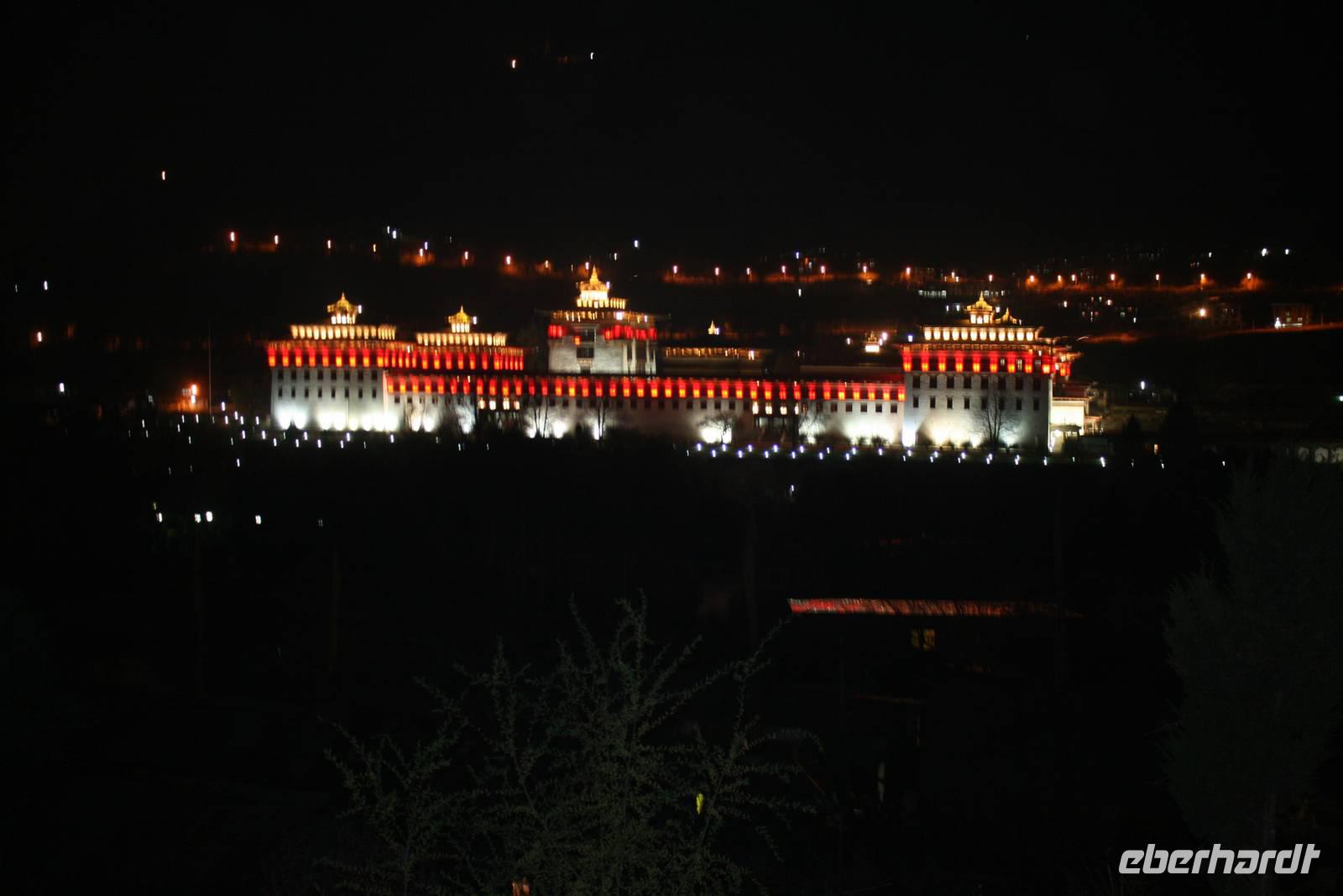 Unser Weg heute führt uns weiter zu einer Papierherstellungsfabrik und wir sehen, wie mühsam es ist, bis dort auch nur ein einziges Blatt Papier entsteht. Einige nutzen auch die Möglichkeit um das ein oder andere Souvenir für zu Hause zu kaufen. Auch der Besuch des Nonnenklosters darf am Nachmittag natürlich nicht fehlen. Später kommen wir zu einem Gehege von ganz besonderen Tieren: den Takins. Sie gelten als Nationaltier Bhutans und sind eine Säugetierart der Zieganartigen. Etwas plump wirken Sie schon aber wir alle haben so etwas wahrscheinlich noch nie gesehen. Das der Phallus in Bhutan eine bedeutende Rolle spielt, haben wir von Jimmee während unserer Reise schon erfahren. Er gilt als Zeichen der Fruchtbarkeit und ist aus diesem Grund auch an Häuserfassaden oft zu sehen. Auch der Drache als Nationalsymbol spielt eine bedeutende Rolle. So paart sich auch mal ein Drache mit einem Phallus Über Phalluse in Bhutan werden wir auch in den nächsten Tagen noch viel lernen. Nach einem langen Tag mit vielen Eindrücken fahren wir heute zurück zu unserem Hotel. Aber das sollte noch nicht das Ende sein, denn Jimmee möchte seinen Gästen gern alles von seinem Land zeigen. So treffen wir uns nach einer kurzen Pause wieder, um den Thimphu Dzong bei Dunkelheit zu bewundern. Alle die mitgekommen sind, haben es sicher nicht bereut. In verschiedenen Rot - und Gelbtönen erstrahlt er in seiner ganzen Schönheit. Mit vielen Motiven im Gepäck, genießen wir heute noch unser Abendessen im Hotel und suchen danach alle die Nachtruhe.