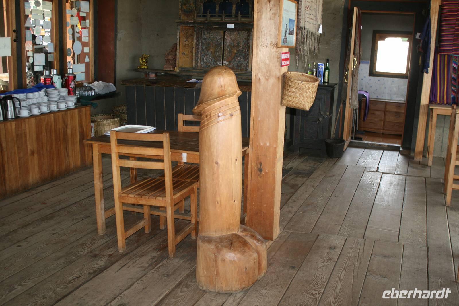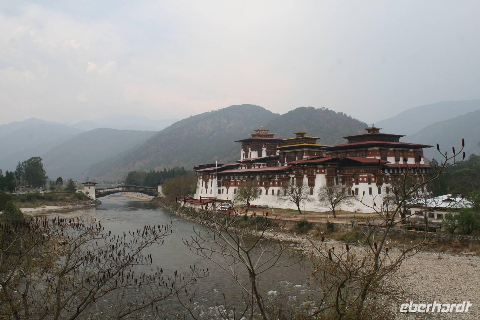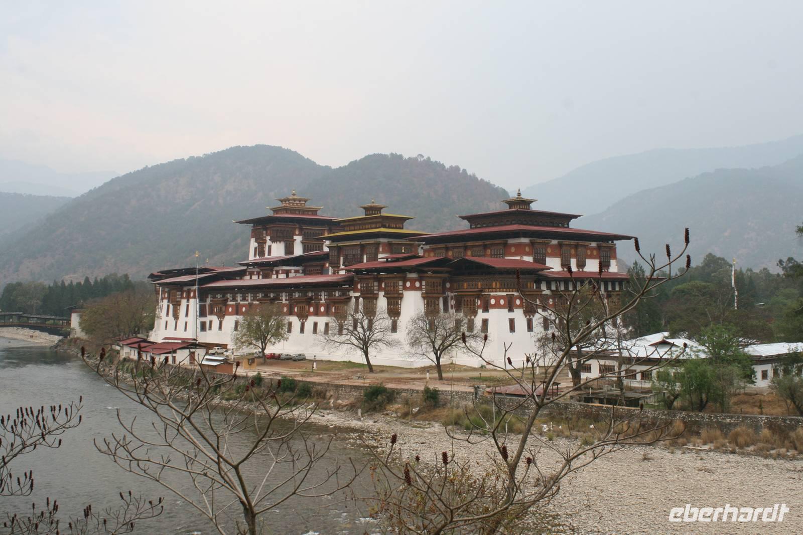 Auch heute müssen wir wieder zeitig aufstehen, den Jimmee hat viel vor mit uns und man merkt wirklich seine Liebe zu seinem Land. Immer mit einem Lachen auf den Lippen begrüßt er uns jeden Tag aufs Neue. So ist es auch nicht verwunderlich, dass Bhutan zu Recht als Land des Lächelns bezeichnet wird. So machen wir uns heute auf den Weg zum Dochula-Pass. Leider ist die Sicht heute nicht so gut, aber wie Ihr wisst, wurden wir später dann doch noch mit Sonnenschein belohnt. Auf 3.116 Metern Höhe stehen am Dochula-Pass die 108 Chorten, die zur Erinnerung an den militärischen Erfolg über Eindringlinge aus Assam im Jahre 2003 errichtet wurde. Wir verweilen hier nur kurz, denn leider spielt das Wetter nicht wirklich mit. Jimmee wäre nicht Jimmee, wenn er nicht wieder eine Überraschung geplant hätte. So nehmen wir nicht den Bus, sondern wandern auf dem wunderschönen Dochula Nature Trail durch den Wald und sehen dabei riesige Rhododendren und schier wunderbare Natur. Der Weg ist etwas rutschig, aber das ist für uns kein Hindernis. Zwei Stunden wandern wir durch den Wald und die Bewegung tut uns nach dem langen Sitzen in den letzten Tagen auch wirklich gut. Wieder am Bus angekommen, fahren wir weiter zu unserem Restaurant in der Nähe des Klosters des Verrückten Lama. Hier fällt uns erneut auf, dass der Phallus als Fruchtbarkeitssymbol überall anzutreffen ist, in jeglicher Ausführung, so auch in unserem Restaurant. Da schmeckt das Essen doch gleich doppelt so gut Nach einer Stärkung führt uns unser Weg weiter zum Kloster des Verrückten Lama, der Jimmee auch gern wäre. Es ist schon verrückt, was es in Bhutan alles für Rituale gibt. So wird man hier mit einem Phallus gesegnet und es wird einem prophezeit, welches Geschlecht sein Kind einmal haben wird und welchen Namen es trägt. Natürlich lässt es sich Vicky nicht nehmen gesegnet zu werden und so erfährt Sie, dass Sie eine Tochter bekommen wird mit dem Namen Jimmeejammo. Naja, über den Namen kann man sich noch streiten, aber ein Mädchen wäre schon schön. Ich gebe Euch in jedem Fall Bescheid, wenn es geklappt hat. Im Kloster erfahren wir auch viel über den Verrückten Lama. Allerdings sind die Ausführungen weniger jugendfrei, so dass diese hier lieber ausgespart werden. Also müssen Sie sich es selbst vor Ort anschauen. Auch viele Mönche haben wir hier getroffen und Jimmee erzählt uns, wie diese hier leben und wie man zum Mönch werden kann. Nachdem Klosterbesuch und einer tollen Tanzdarbietung einiger Kinder aus dem Dorf, bleibt noch etwas Zeit um das ein oder andere Souvenir für zu Hause zu erstehen. Natürlich steht der Phallus dabei ganz oben auf der Wunschliste, er ist ja auch typisch für Bhutan und passt besonders schön in einen Setzkasten Nach soviel Erotik fahren wir weiter nach Punakha, denn der gleichnamige Dzong steht heute noch auf unserem Programm. Punakha ist eine Kleinstadt im Westen von Bhutan mit ca. 7.000 Einwohnern auf einer Höhe von 1.400 Metern. Der Punakha-Dzong wurde 1637 durch Ngawang Namgyal als Festung gegen die einfallenden Tibeter erbaut. Er brannte 1987 teilweise ab, wurde jedoch schnell wieder komplett aufgebaut und gilt als herausragendes Beispiel der Klosterarchitektur Bhutans. Anders als die anderen Dzongs im Land, liegt der Punakha-Dzong nicht auf einer Hügelkuppe oder Anhöhe, sondern in einem Tal, am Zusammenfluss der beiden Flüsse Mochu und Pochu. Schon von Weitem können wir ihn erkennen. Besonders beeindruckend ist für viele der tiefe Einblick in das Leben der Mönche, was der Dzong bietet. Sofort strahlt dieser eine religiöse Atmosphäre aus, die sich auch schnell auf uns überträgt - wirklich beeindruckend. Bevor wir heute zu unserem Hotel fahren, nehmen wir noch einen bhutanischen Whisky am Strand vor dem Dzong ein, denn das passt einfach wunderbar zur Stimmung. Am Hotel angekommen beziehen wir unsere Zimmer und einige nutzen die Gelegenheit um auch am Abend noch einmal zum beleuchteten Punakha-Dzong zu fahren und schöne Fotos zu schießen. Leider erreicht uns heute auch die Nachricht des Flugzeugabsturzes über den Französischen Alpen einer germanwings Maschine. In Gedanken sind auch wir an diesem Tag bei den Betroffenen. Nach einem schmackhaften Abendessen, sitzen wir noch lange draußen und genießen den ein oder anderen Whisky. Das gehört schließlich auch dazu.