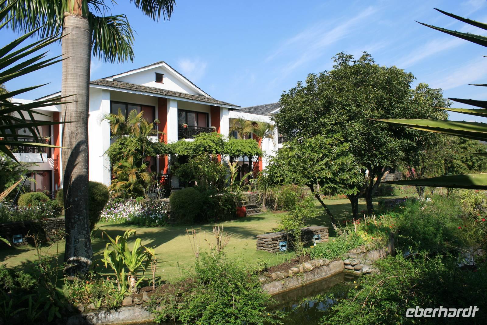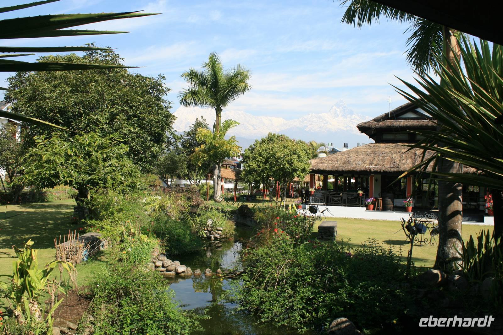 Heute führt uns eine lange Strecke von etwa zehn Stunden Fahrt weiter nach Pokhara. Es war die längste Fahrt unserer Reise. Unsere Freude wird ein wenig getrübt als wir über die doch sehr holprigen Straßen fahren. Das bekamen vor allem Dingen die Gäste, die hinten im Bus saßen am eigenen Leib zu spüren, nicht wahr? Des Weiteren erfuhren wir von unserem Reiseleiter Abi, das hier wohl auch öfter mal ein LKW zum Stehen kommt. Das konnte trotzdem unsere andauernd anhaltende gute Laune nicht trüben und so nahmen wir die Fahrt mit Humor. Unterwegs sehen wir wunderbar grüne, saftige Felder und allerlei verschiedene Pflanzenarten. Die Landschaft ist einfach traumhaft. So verzeiht man auch das ein oder andere holprige Stück. Bei unseren Pausen sehen wir, wie in Nepal gewaschen und gewohnt wird und können einen Einblick in das Leben abseits der Großstädte werfen. Nach einer längeren Fahrtstrecke durch Serpentinen und vorbei an bunten LKW's genießen wir unsere Mittagspause in einem kleinen Bergdorf und finden ein kleines aber feines Restaurant, wo wir endlich die tradtionellen nepalesischen Momos probieren können. Auf Vickys und Abis Empfehlung hin bestellen unsere Gäste diese wahlweise mit Hühnchen oder Büffelfleisch und mehr oder weniger scharf. Allen schmeckt es köstlich und so haben wir während unserer Reise noch öfters die kleinen Teigtaschen gegessen. Auch unsere Freunde der parallelen Single-Gruppe treffen wir hier wieder und sind froh, dass Sie ihre Buspanne überstanden haben. Gestärkt führt uns unsere Reise noch etwa sechs Stunden bis nach Pokhara, wo wir am späten Nachmittag endlich unser wunderschönes 5-Sterne-Hotel "Shangri-La Village" erreichen. Bereits heute können wir von hier einen atemberaubenden Blick auf die Annapurna-Gebirgskette genießen. Dieser entschädigt jede noch so lange Fahrt. Natürlich wird das Ereignis auch entsprechend mit nepalesischem Rum gewürdigt. Alle Gäste beziehen Ihre Zimmer, von denen Sie einen tollen Blick auf die Kette genießen können. Am Abend genießen wir im Restaurant des Hotels ein Buffet der Spitzenklasse und lassen es uns gut geht, wie jeden Tag. Viele treffen sich anschließend in der Hotelbar wieder und lassen mit einem Cocktail oder einem kühlen Bier den Tag noch einmal Revue passieren. Vicky outet sich als Barfrau, so dass auch alle Ihre Getränke bekommen. Ein bisschen verwundert war das Barpersonal schon, dass hier nun eine blonde, europäische Frau arbeiten soll. Aber der Kunde ist eben König.
