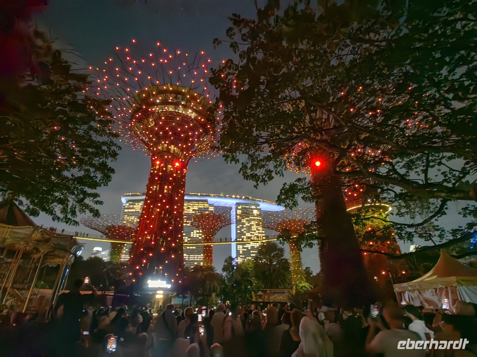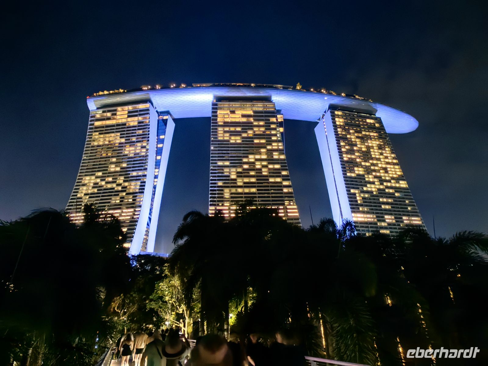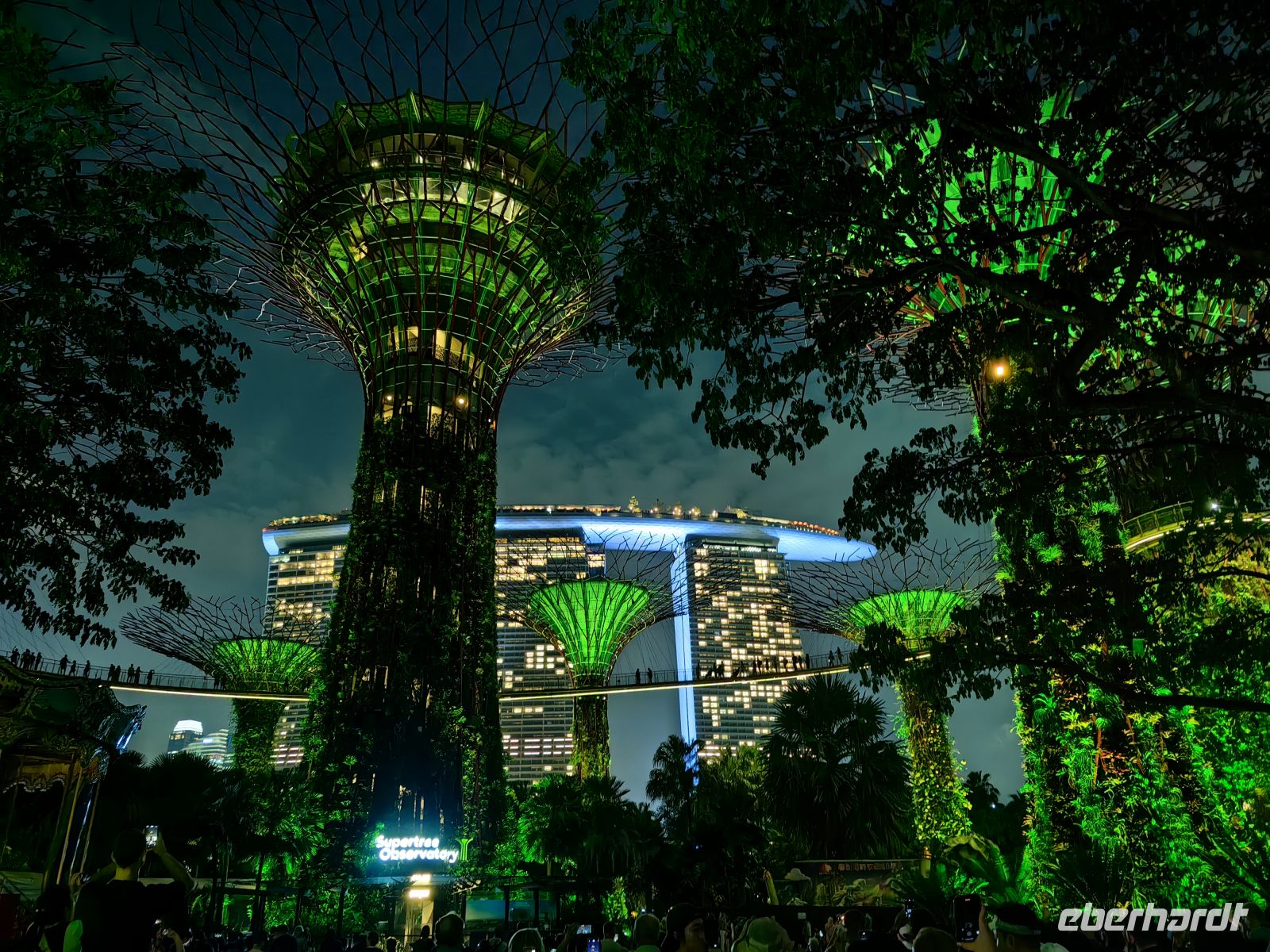 Am Abend entdecken wir die Skyline der Megacity mit ihren knapp sechs Millionen Einwohnern und sind gebannt von der Kulisse, den vielen Lichtern und natürlich der imposanten Show an den Gardens by the Bay, dem größten botanischen Garten der Welt. Wir schauen uns die riesigen stählernen hell beleuchteten "Bäume" an und lauschen chinesischen und indischen Popmelodien. Danach laufen wir durch das berühmte Marina Bay Sands Hotel und sind von der schieren Größe, dem Luxus, den vielen Lichtern, der absoluten Sauberkeit und der Freundlichkeit der Menschen hier begeistert. Die Handykameras laufen heiß und wir genießen das Spektakel.