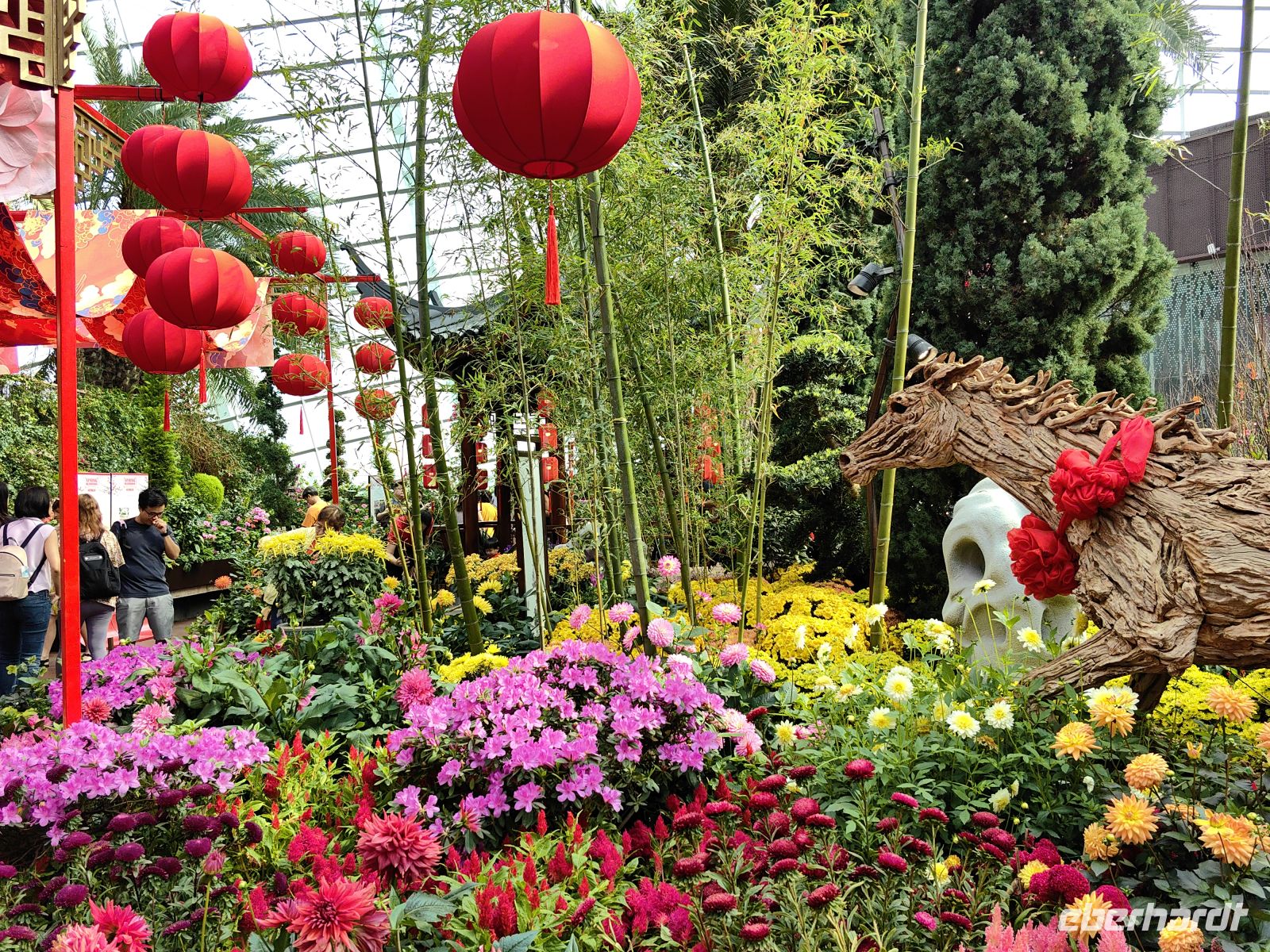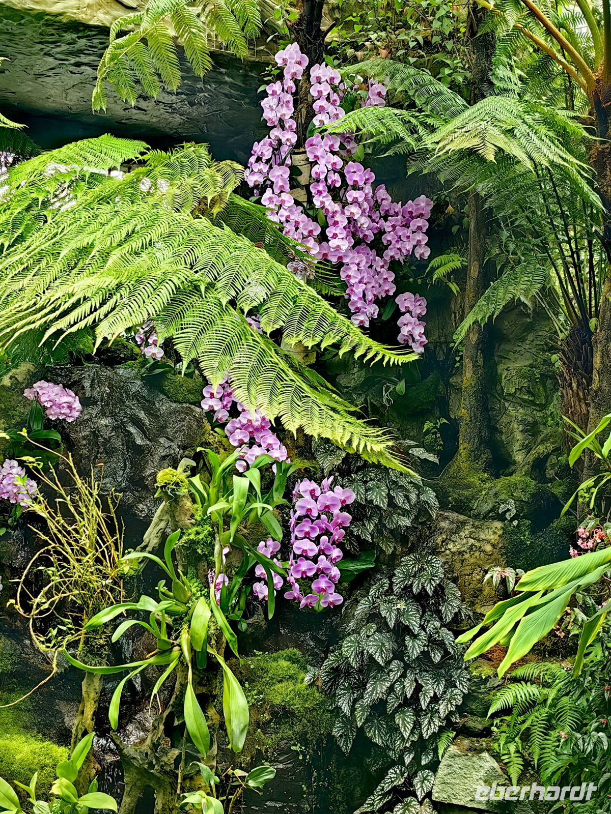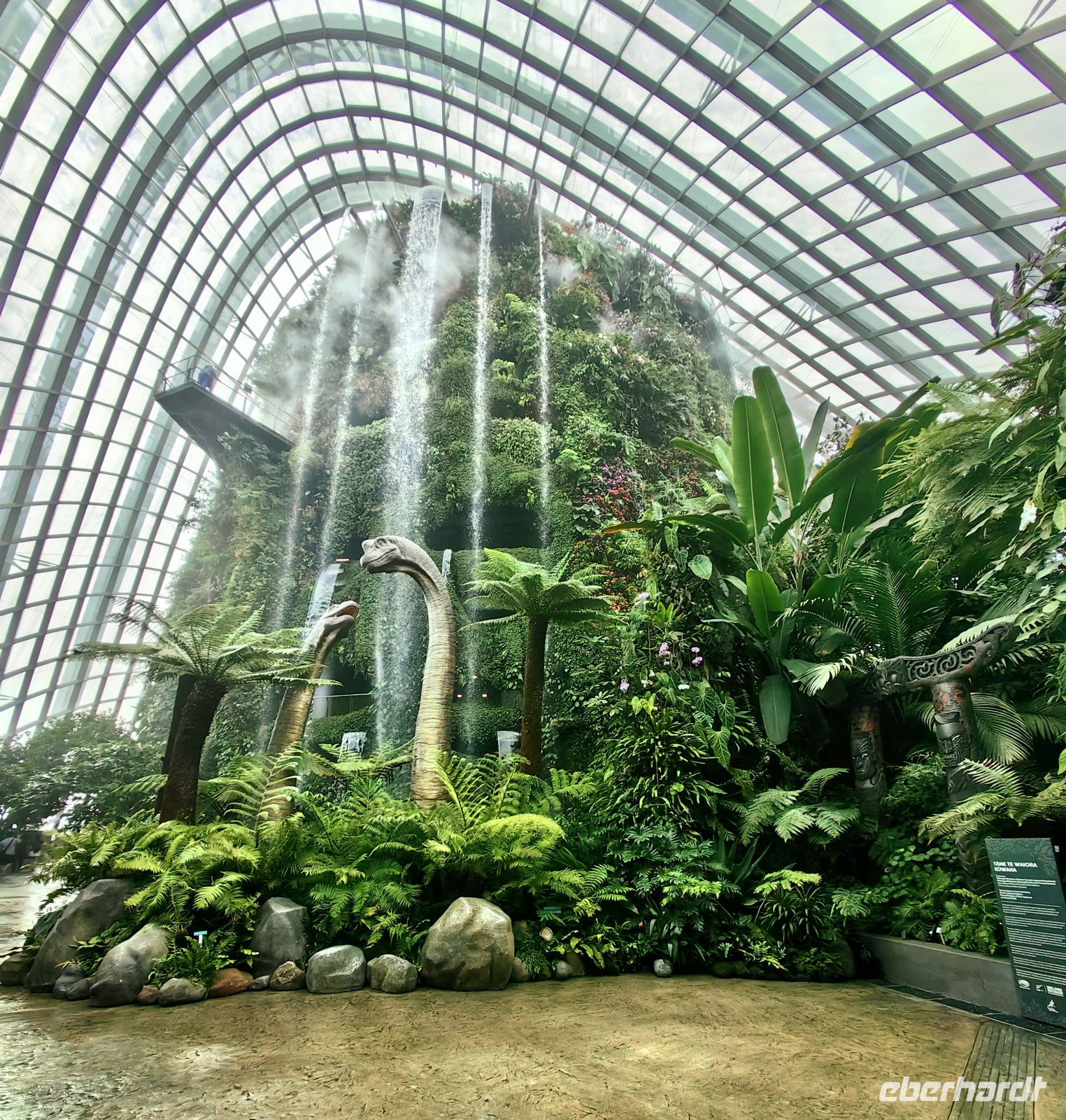 Morgens bewundern wir das reichhaltige und teilweise exotische Frühstücksbuffet im Grand Park Hotel und brechen danach gestärkt zu den Gardens by the Bay auf. Dort schauen wir uns den Nebelwald (Cloud Forest) und den Blumenpavillon (Flower Dome) an. Diese zwei riesigen überdachten Gewächshäuser sind Heimat von vielen uns nur als Balkonpflanzen bekannten Blumen, die wir zu Hause mühevoll versuchen zu züchten und zu hegen. Hier wachsen sie meterhoch und überwuchern alles! Momentan präsentiert man Frühjahrsblüher und wir schwelgen in einem Meer aus Farben und Blütenformen.