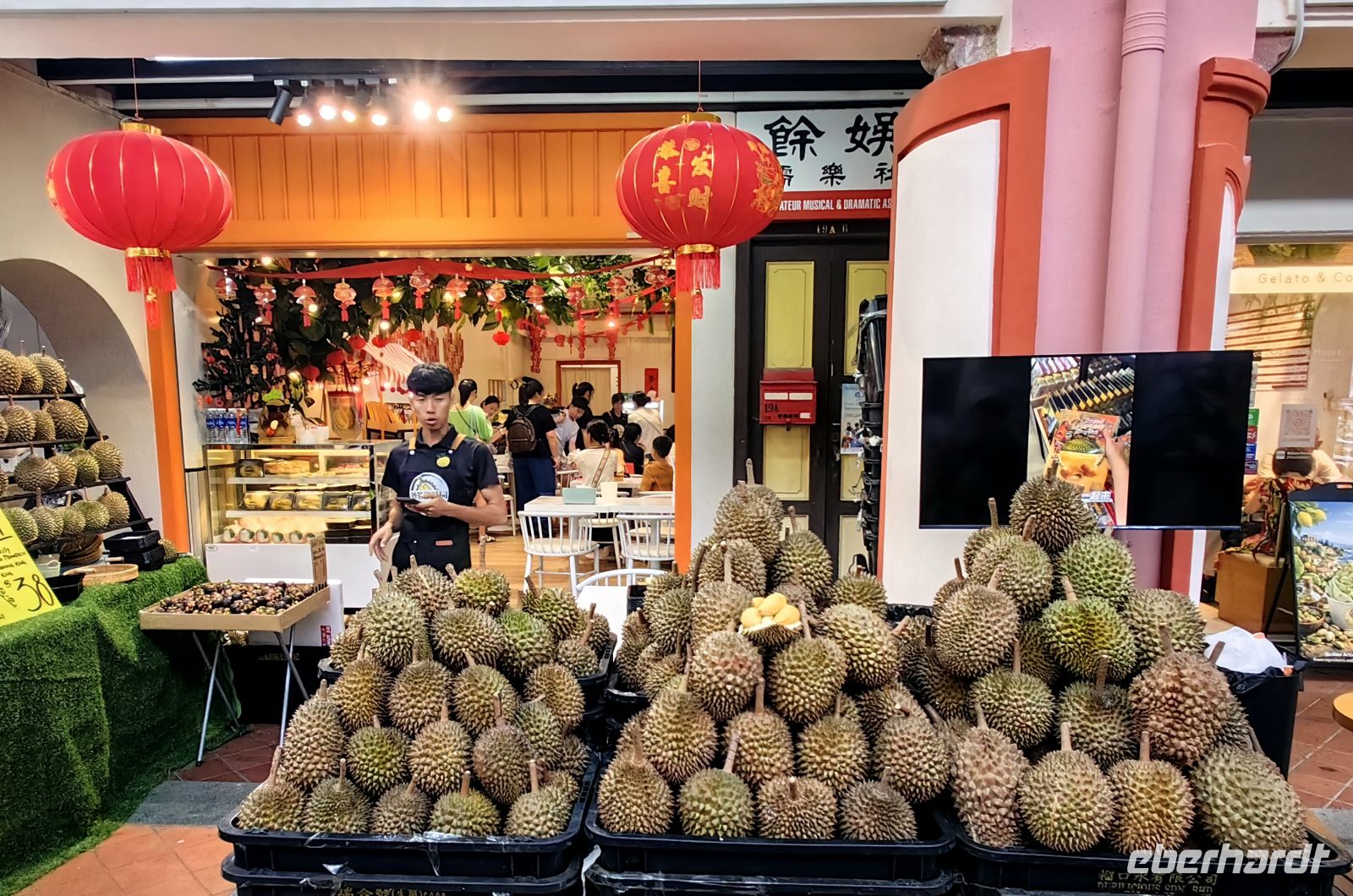Am späten Nachmittag drehen wir noch eine Runde in Chinatown, wo die Vorbereitungen für das bevorstehende chinesische Neujahr in vollem Gange sind. Überall hängen die roten Lampen und rote Dekoration in jeglicher Form wird am Straßenrand verkauft. Einige Gäste sind mutig genug, sich an die Stinkfrucht Durian zu wagen, sie schmeckt cremig, ein wenig wie Avocado und ist sehr gesund, die Schale verbreitet allerdings einen muffigen Geruch, daher hat sie ihren Beinamen.
