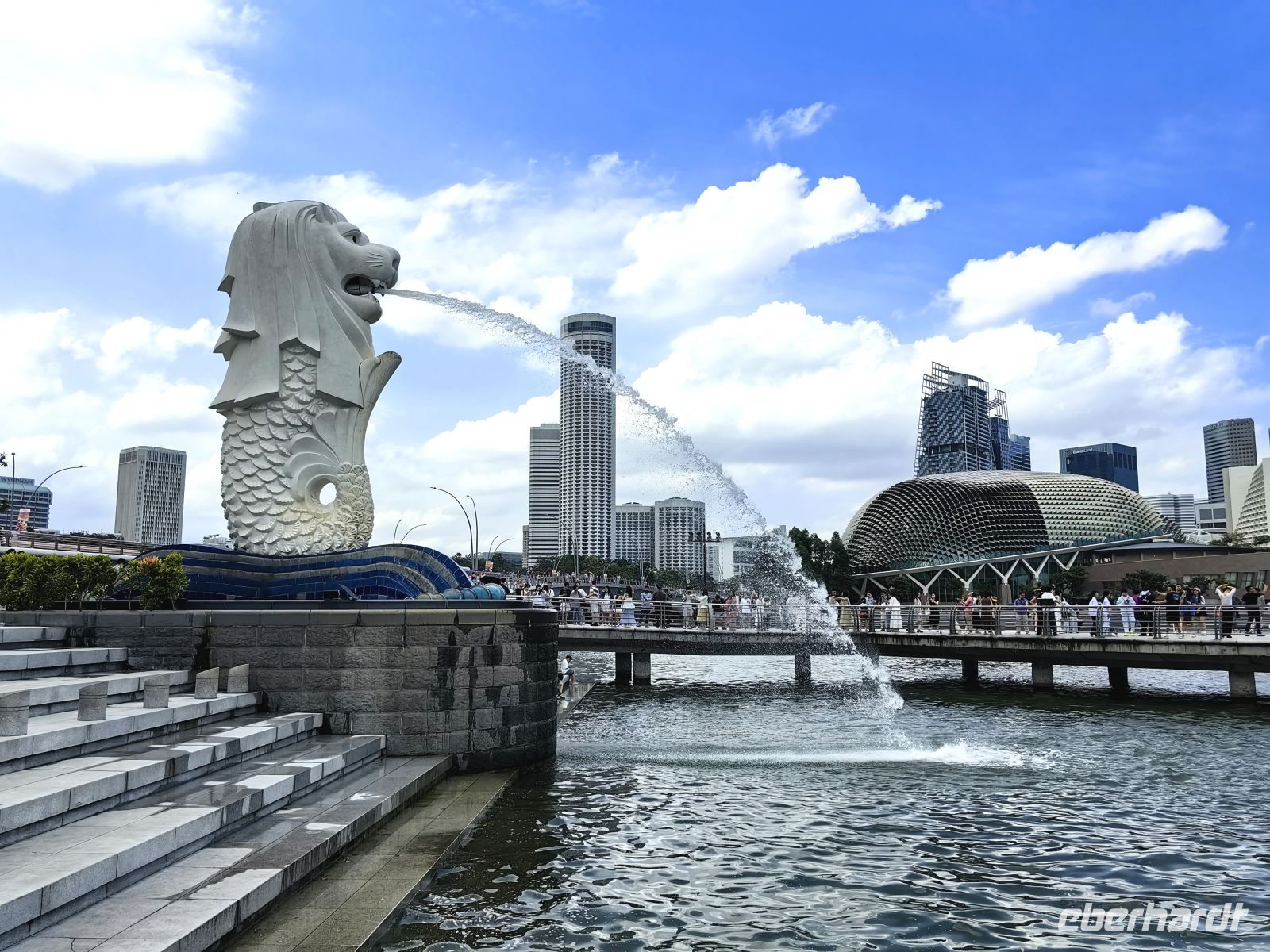 Am Merlin, dem Wahrzeichen von Singapur fotografieren wir die spektakuläre Kulisse. Es handelt sich bei dieser schneeweißen wasserspeienden Figur um ein Mischwesen aus einem Löwen und einem Fisch.