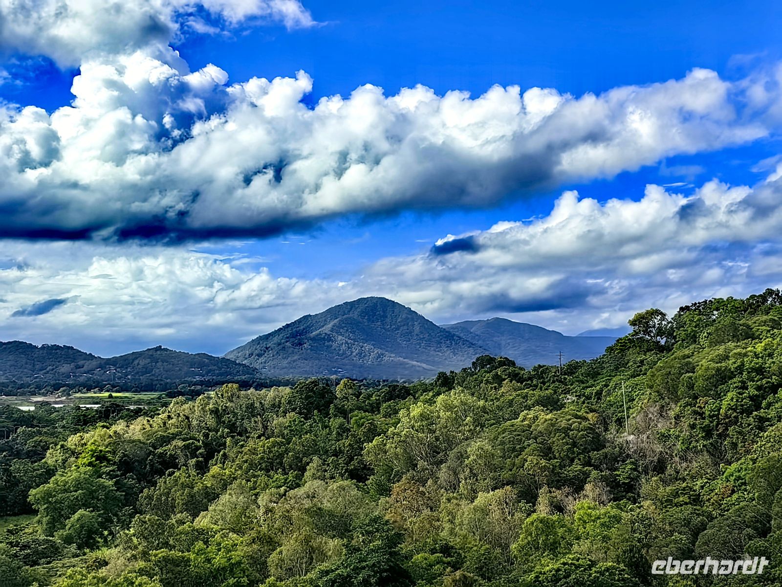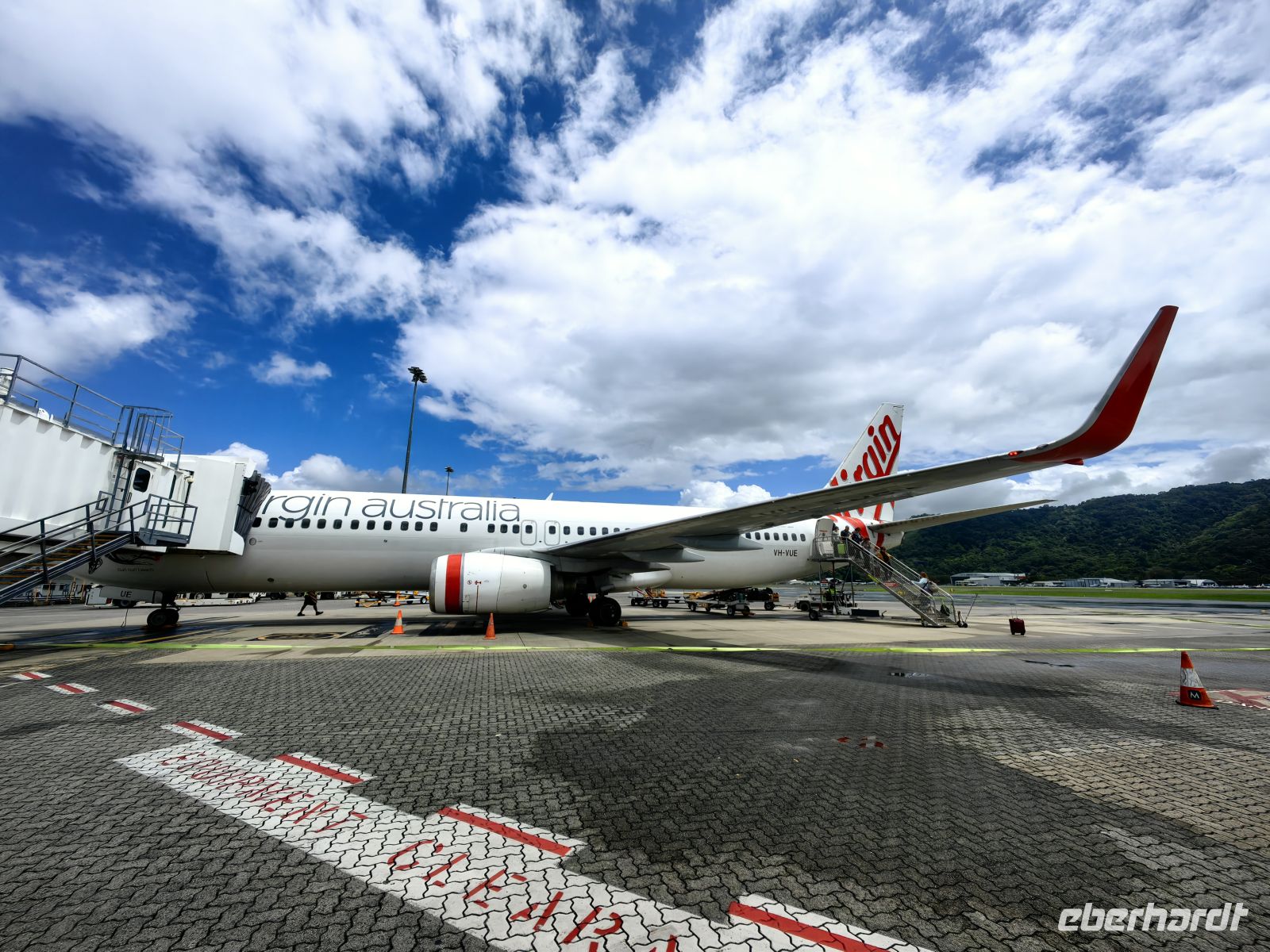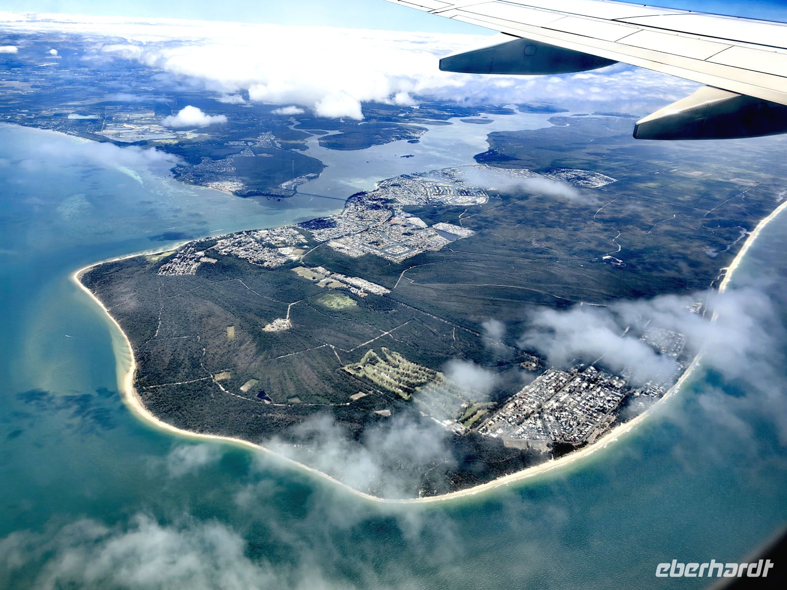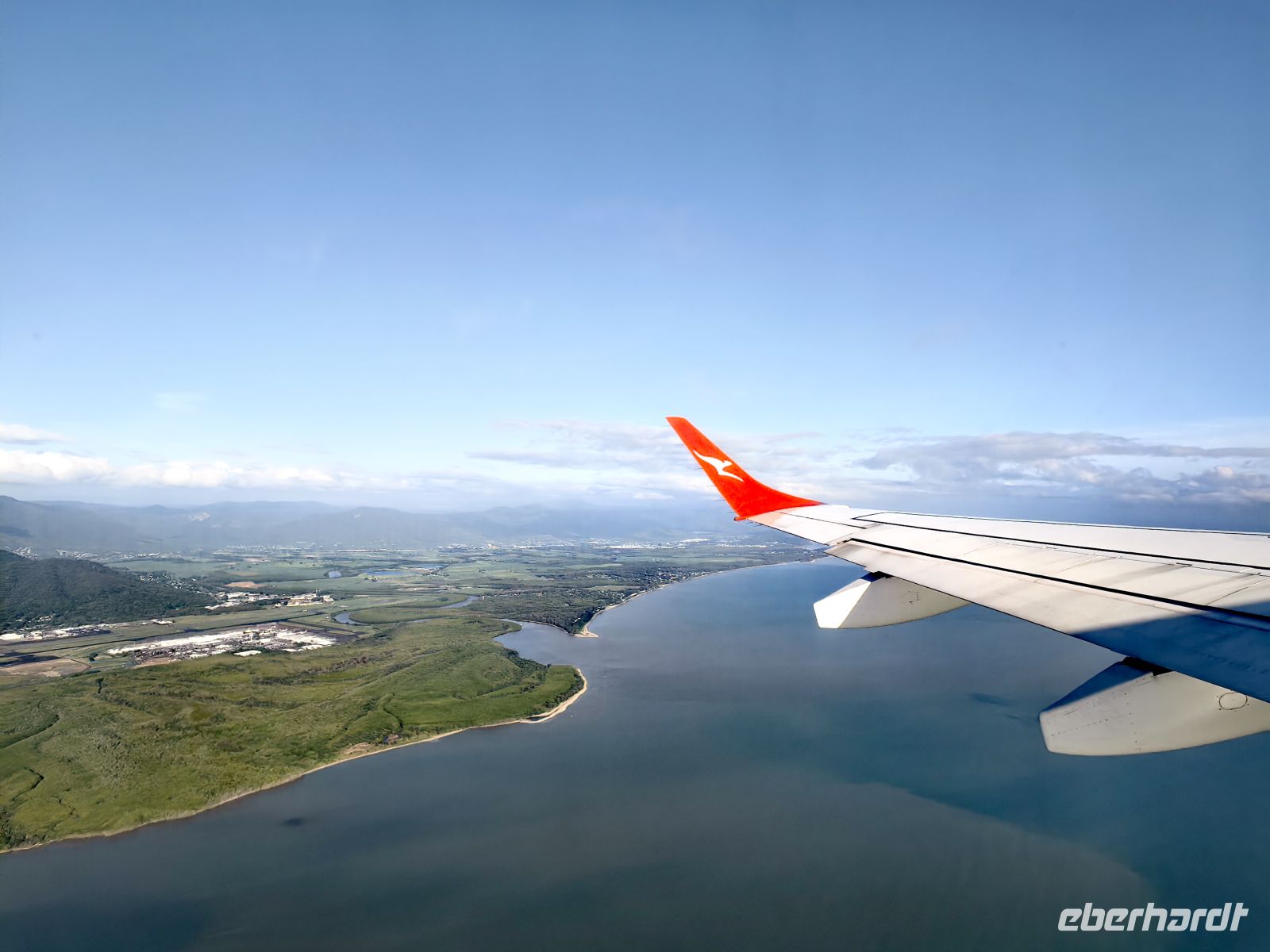 Nach dem Nachtflug erreichen wir zuerst Brisbane in Australien und müssen dort erstmal die Einreiseformalitäten für Australien erledigen, bevor wir mit einem Inlandflug weiter nach Cairns in den tropischen Nordosten Australiens reisen. Alle hatten sich auf eine umfangreiche Kontrolle eingestellt, aber es geht recht schnell, trotz der langen Schlangen und wir werden nur nach den mitgebrachten Medikamenten gefragt, Schuhe interessieren heute nicht und es läßt sich weit und breit kein Spürhund ausmachen.