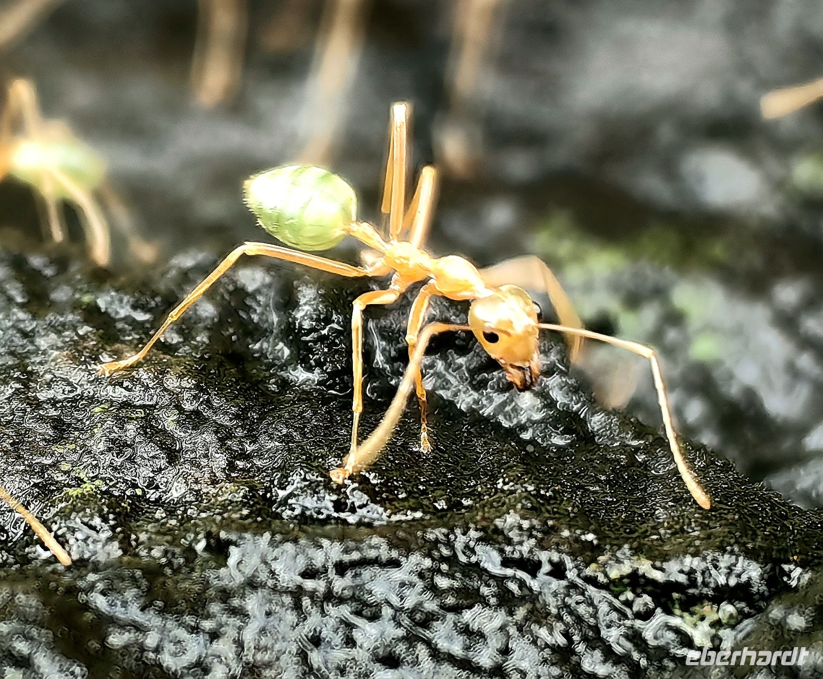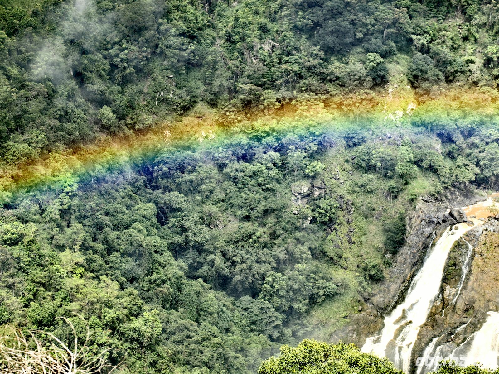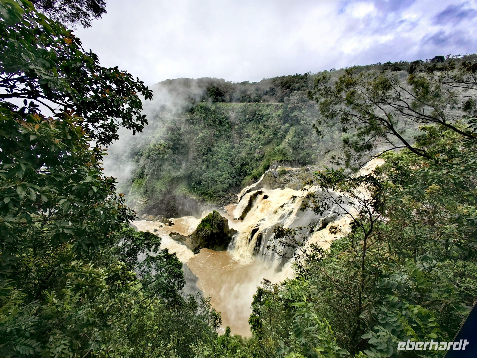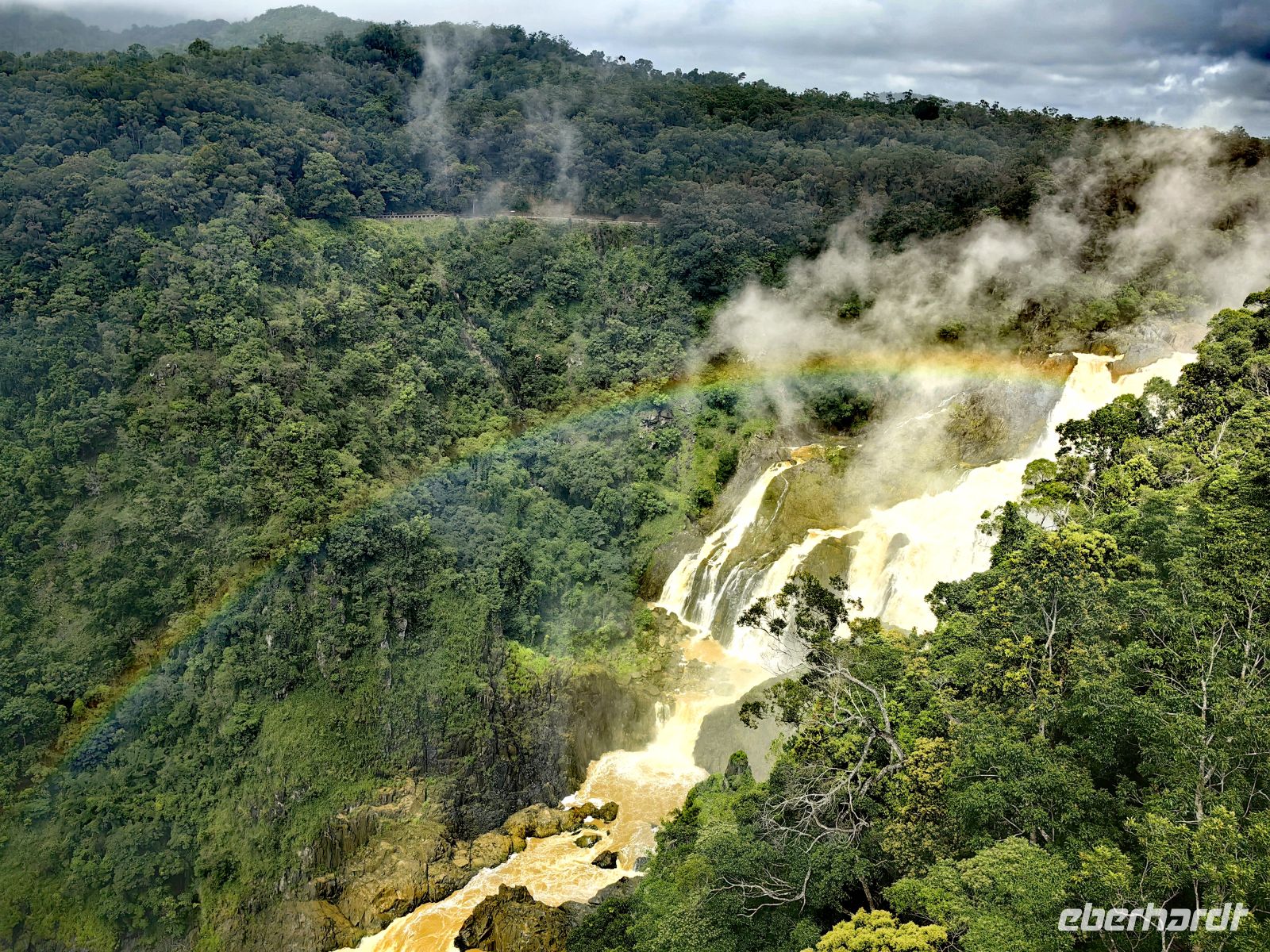 Annette, die Reiseleiterin, holt uns am Morgen im Hotel ab und wenig später schweben wir mit der Skyrail über dichten Regenwald hinweg auf unserem Weg nach Kuranda. Wir machen immer wieder Spaziergänge durch das faszinierende Dschungeldickicht, entdecken dornige und farbintensive Pflanzen, Spinnen, Ameisen, große bunte Schmetterlinge und quietschgrüne Frösche.