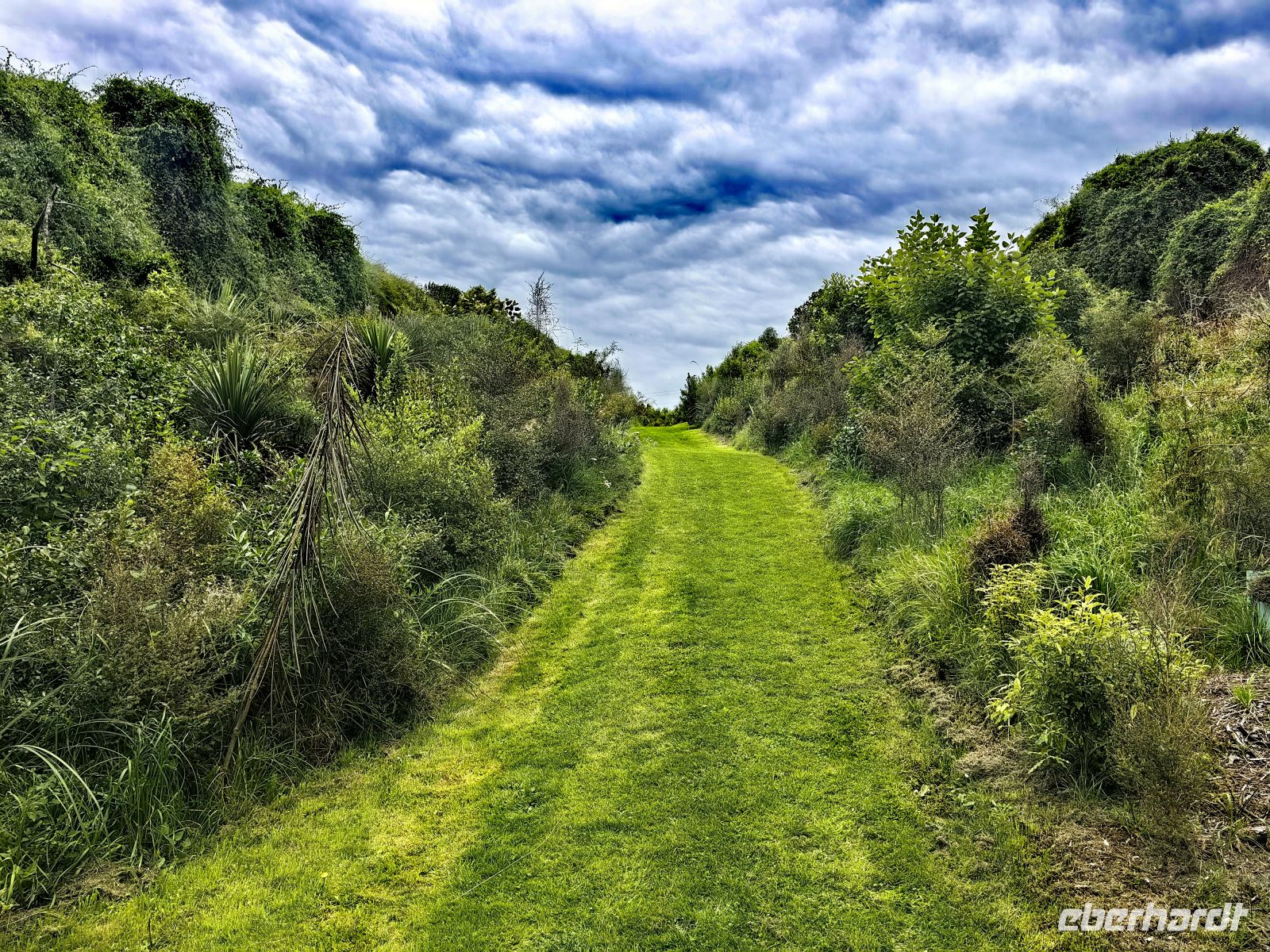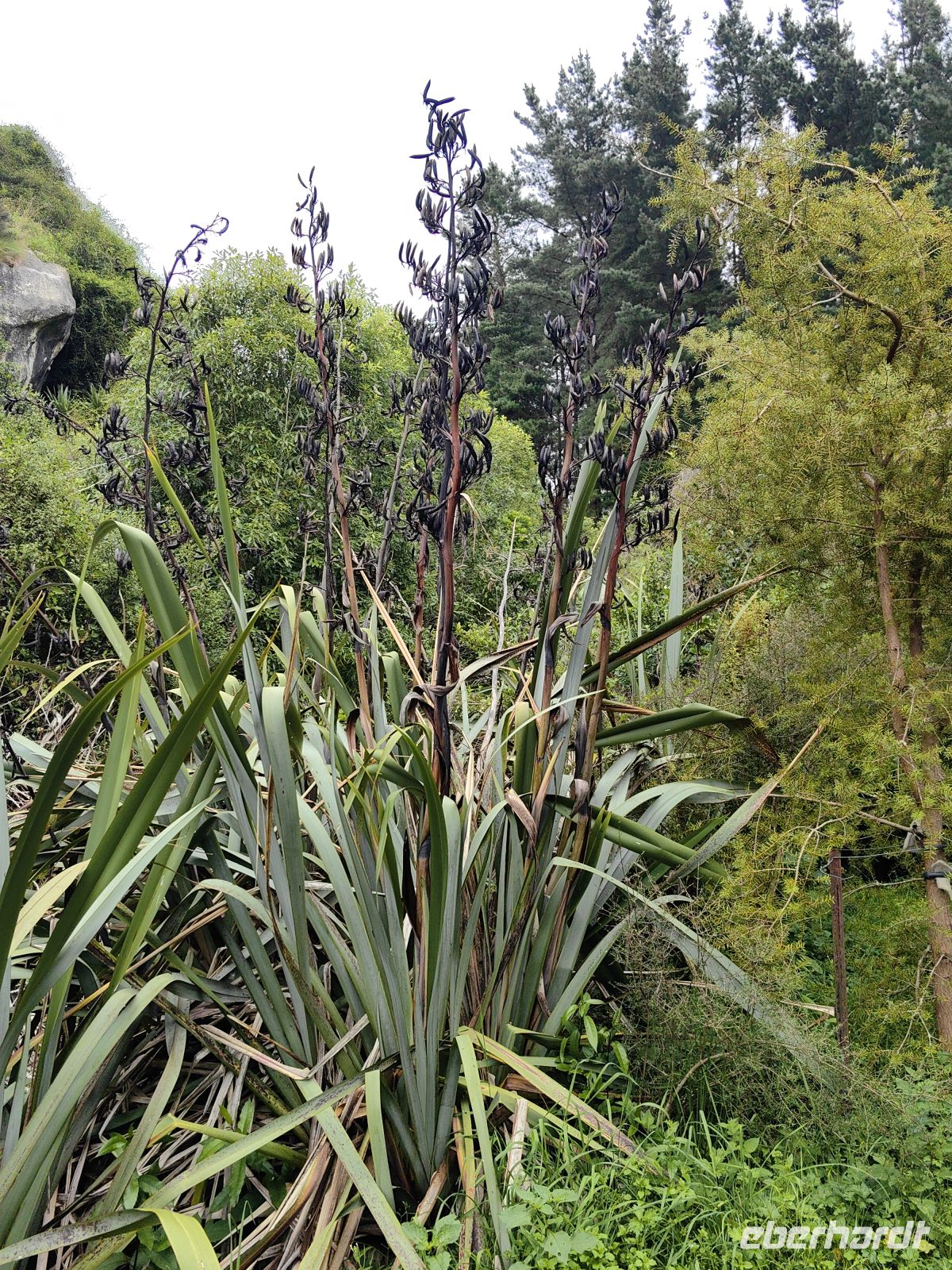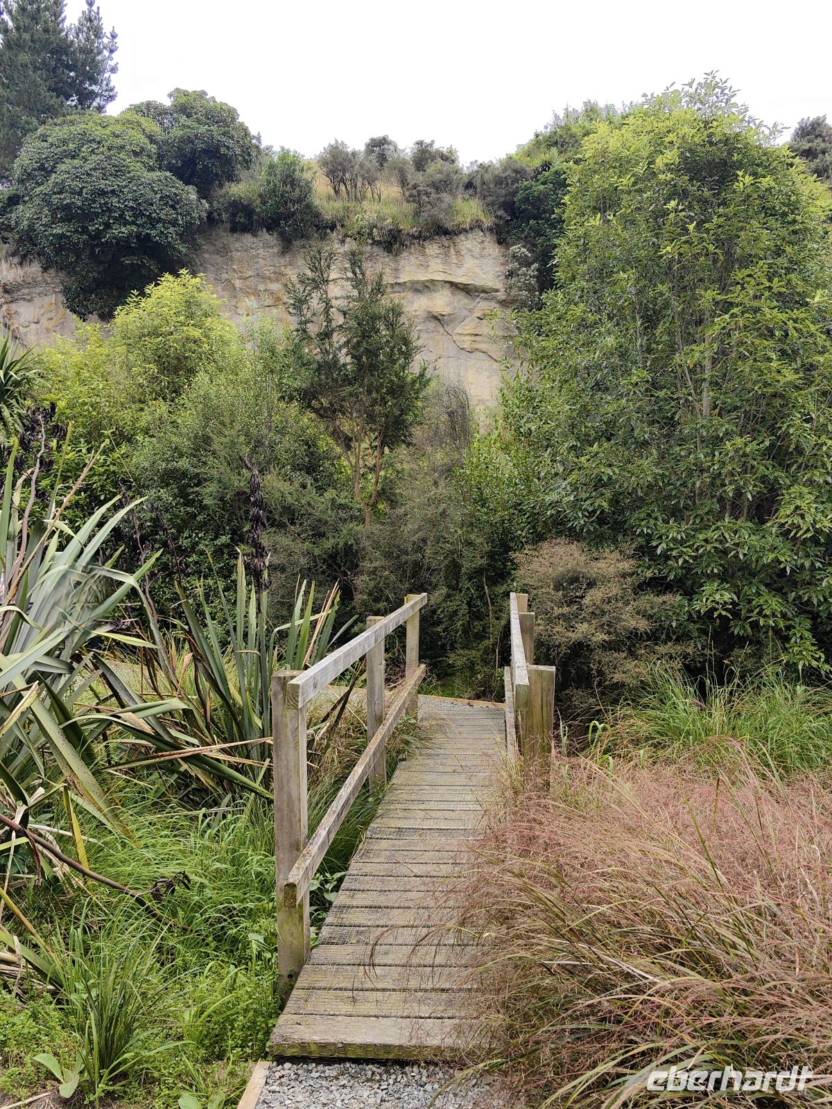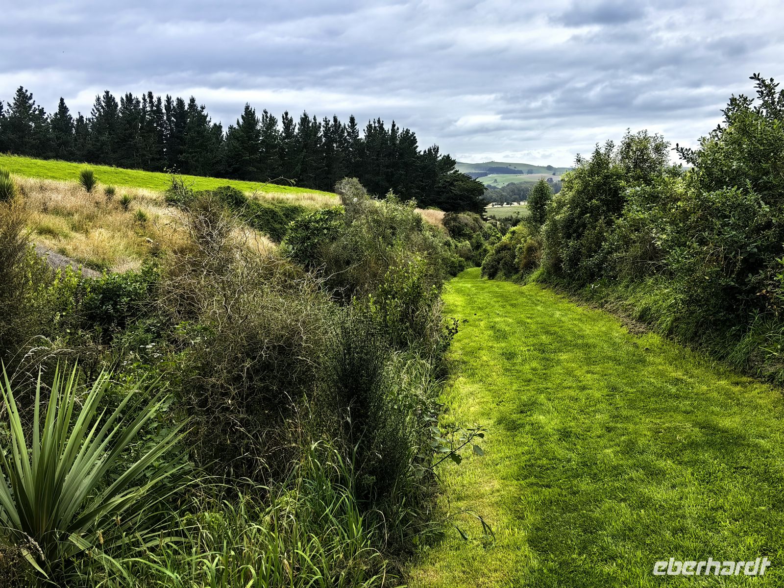 Dazu halten wir mitten auf einer Schafweide und laufen über grüne Weideflächen, vorbei an der üppigen einheimischen Vegetation. Wir entdecken Spinnengeflechte in den Ästen, reiben an Kawakawablättern, sie verströmen einen Zitrusduft und werden von den Maori für Tee verwendet, oder im Salat gegessen. Daneben steht ein hoher Flachsstrauch. Aus seinen Fasern stellen die Maori noch heute allerlei Flechtwerke und Bekleidung her. Nach einigen Minuten entdecken wir die Manukasträucher und die ähnlich aussehende Kanuka. Von ersteren stammt der berühmte Honig, letztere werden wiederum zur Teeherstellung verwendet. Neben diesen einheimischen Pflanzen wachsen riesige Walnußbäume, die voller Nüsse hängen, sie wurden von den europäischen Siedlern gepflanzt. Auf dem Boden sehen wir eßbare Pilze. Seit einigen Jahren versucht man hier, die ursprünglichen Pflanzenarten wie Tarata, Koromiko und Makomako wieder anzupflanzen, waren sie doch durch Rodung und Weidehaltung nahezu verschwunden. Mitten in den Zweigen neben uns zwitschert ein neuseeländischer Fächerschwanz munter vor sich hin. Durch die Wiederanpflanzung von Bäumen ist auch der schöne, einheimische Rotflügler Kahukura wieder hier zu sehen. Weitere heimische Vögel wie Riroriro und Korimako sind ebenfalls in das Tal zurückgekehrt und begleiten uns mit ihrem Gesang, während wir die grünen Pfade hinabsteigen
