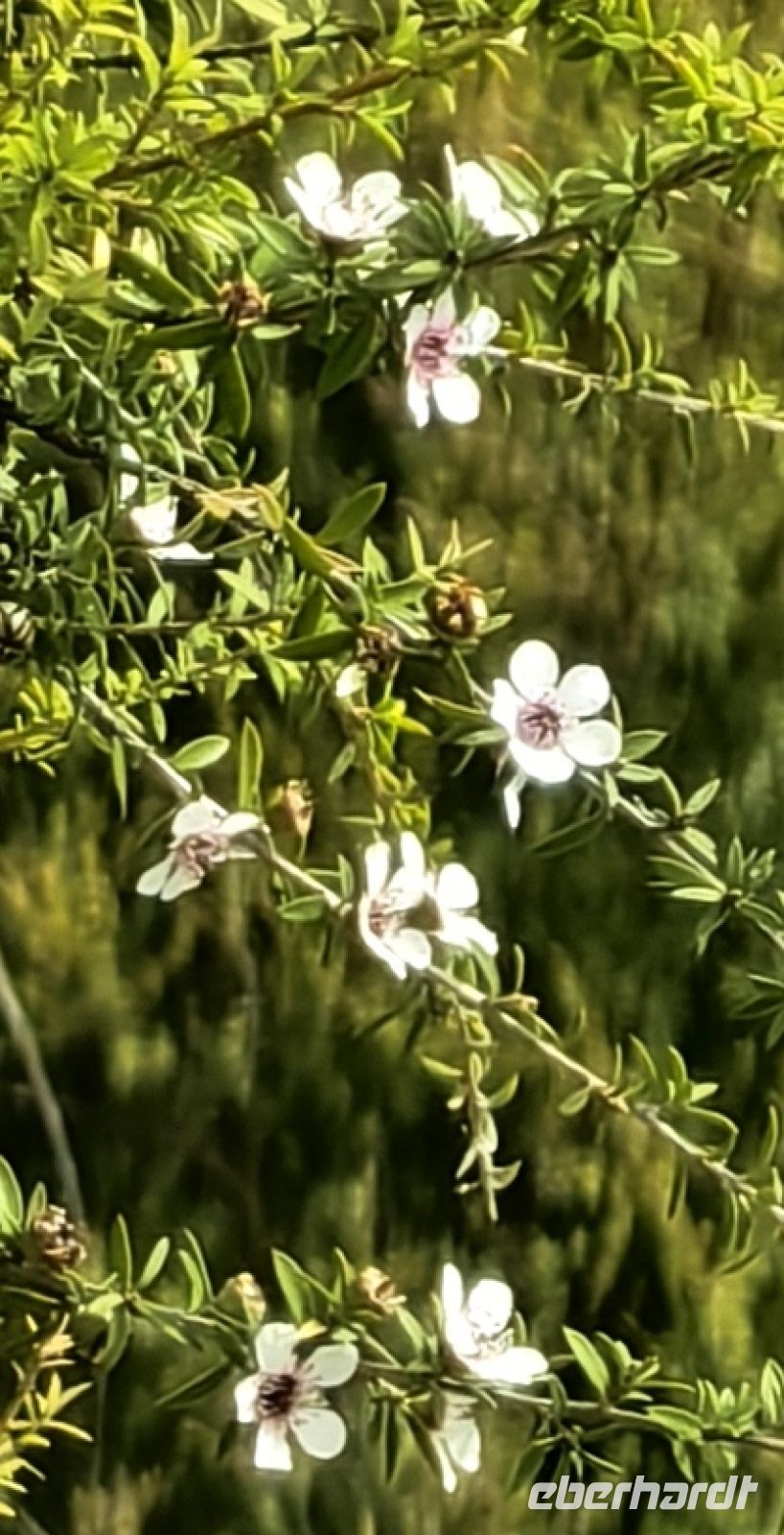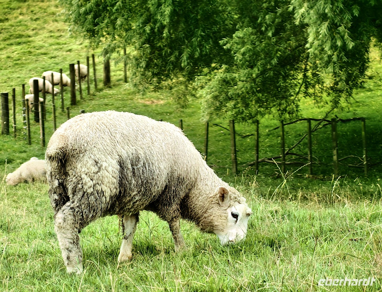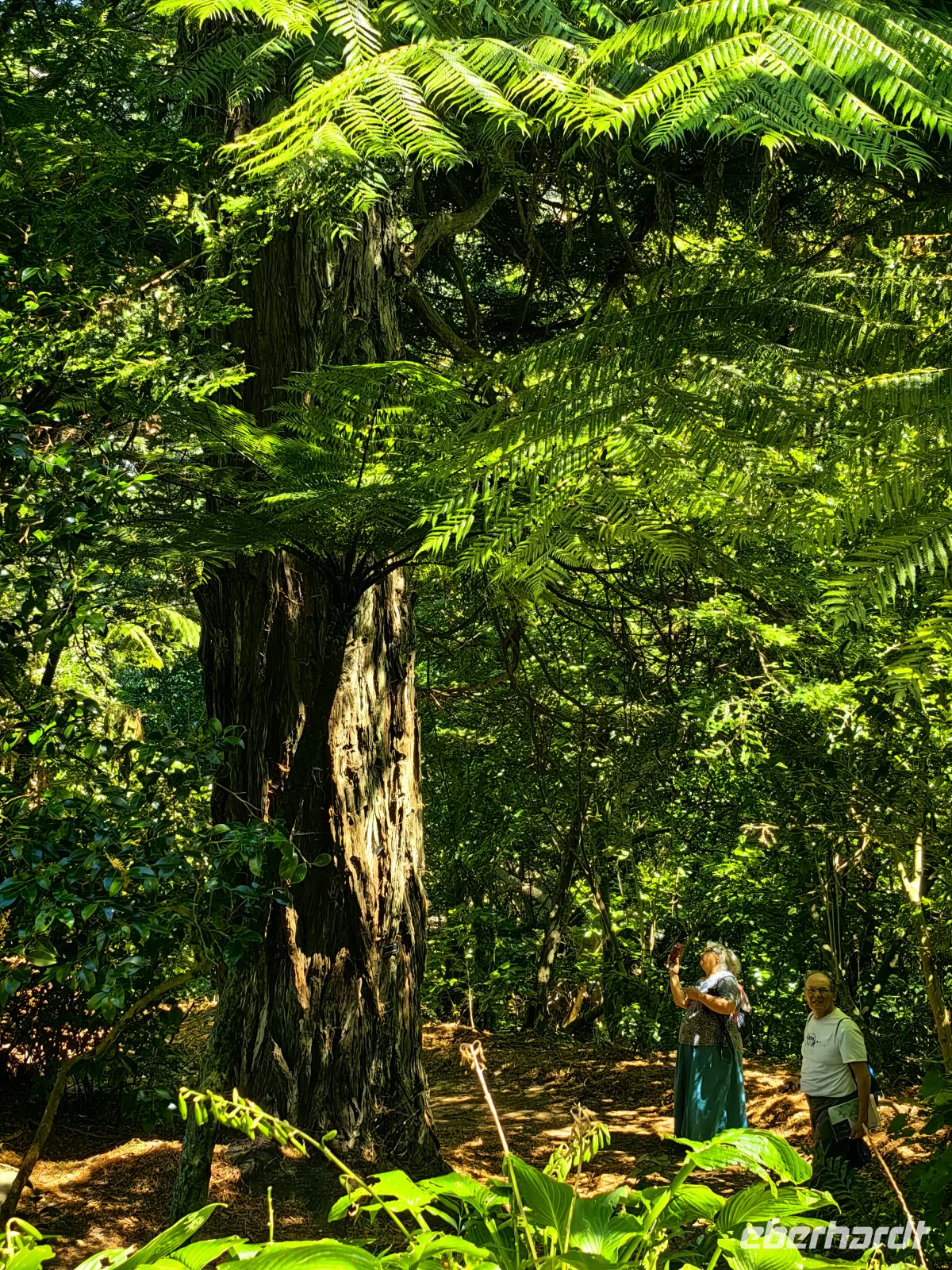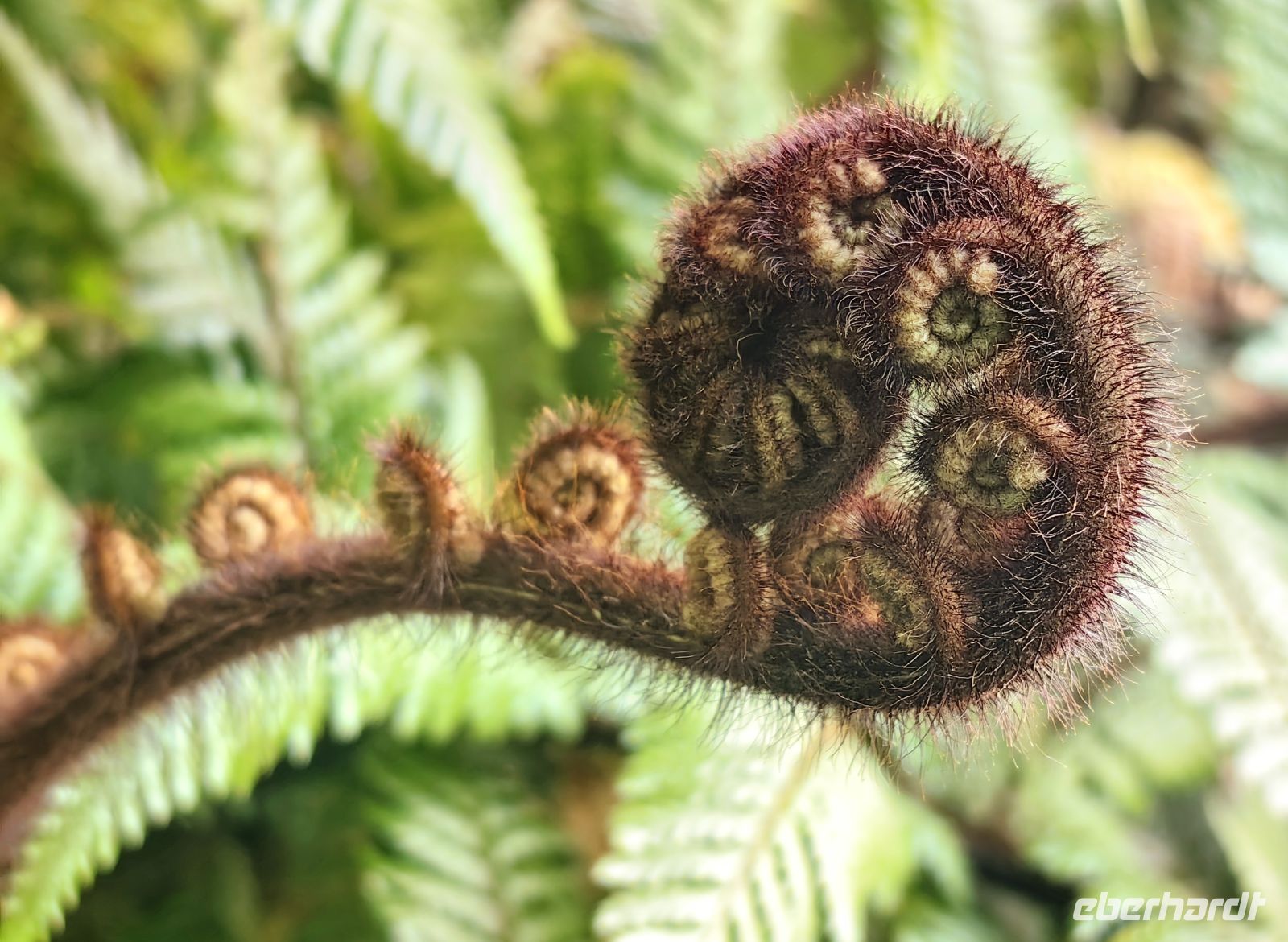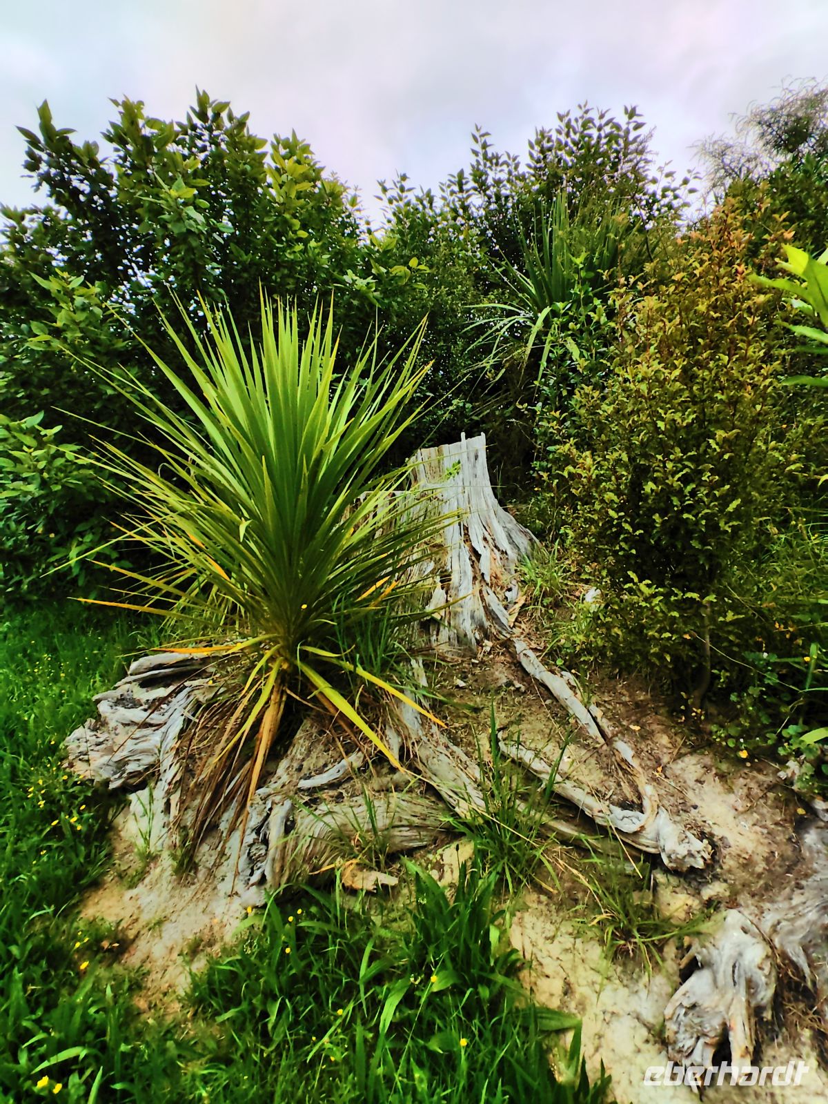 Dazu halten wir mitten auf einer Schafweide und laufen über grüne Weideflächen, vorbei an der üppigen einheimischen Vegetation. Wir entdecken Spinnengeflechte in den Ästen, reiben an Kawakawablättern, sie verströmen einen Zitrusduft und werden von den Maori für Tee verwendet, oder im Salat gegessen. Daneben steht ein hoher Flachsstrauch. Aus seinen Fasern stellen die Maori noch heute allerlei Flechtwerke und Bekleidung her. Nach einigen Minuten entdecken wir die Manukasträucher und die ähnlich aussehende Kanuka. Von ersteren stammt der berühmte Honig, letztere werden wiederum zur Teeherstellung verwendet. Neben diesen einheimischen Pflanzen wachsen riesige Walnußbäume, die voller Nüsse hängen, sie wurden von den europäischen Siedlern gepflanzt. Auf dem Boden sehen wir eßbare Pilze. Seit einigen Jahren versucht man hier, die ursprünglichen Pflanzenarten wie Tarata, Koromiko und Makomako wieder anzupflanzen, waren sie doch durch Rodung und Weidehaltung nahezu verschwunden. Mitten in den Zweigen neben uns zwitschert ein neuseeländischer Fächerschwanz munter vor sich hin. Durch die Wiederanpflanzung von Bäumen ist auch der schöne, einheimische Rotflügler Kahukura wieder hier zu sehen. Weitere heimische Vögel wie Riroriro und Korimako sind ebenfalls in das Tal zurückgekehrt und begleiten uns mit ihrem Gesang, während wir die grünen Pfade hinabsteigen
