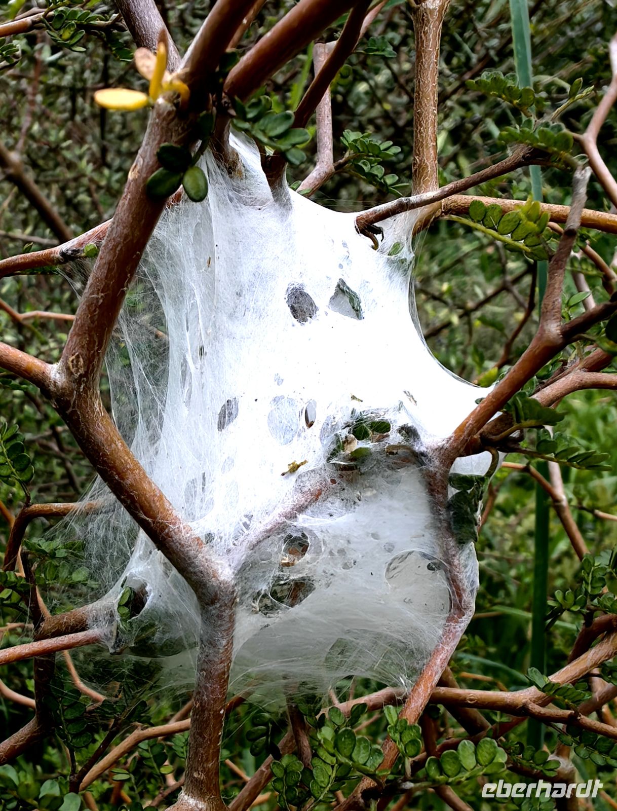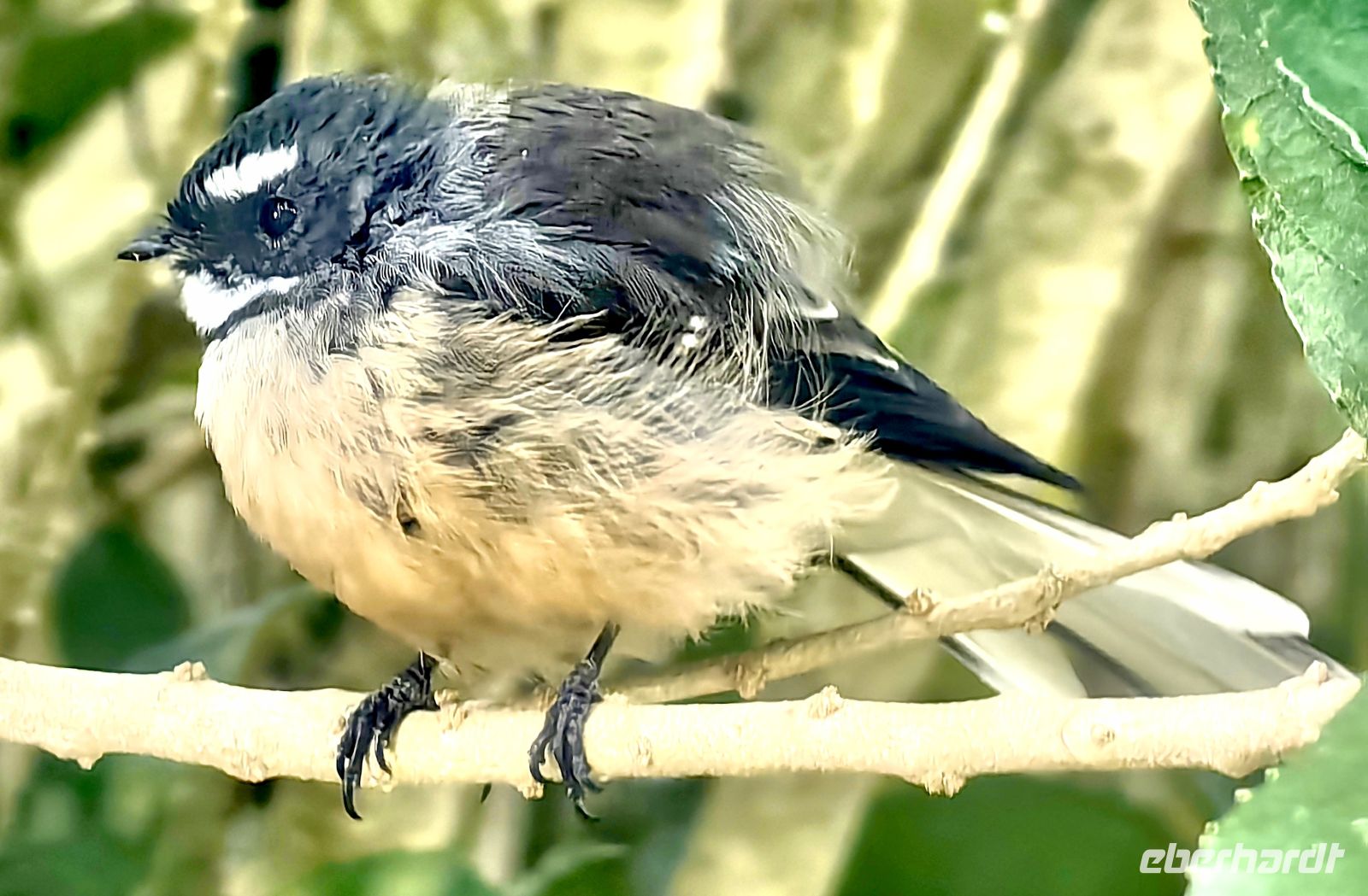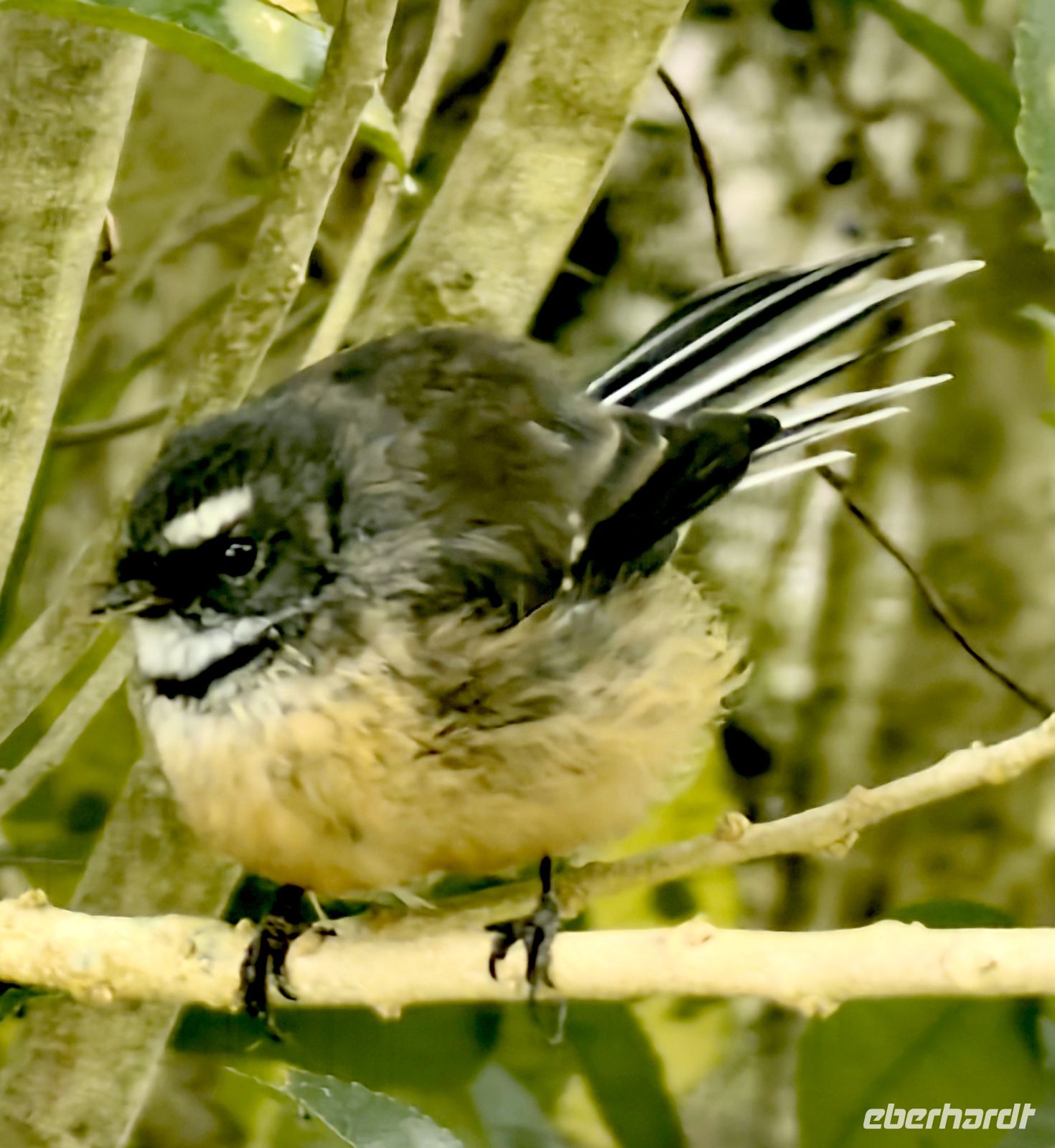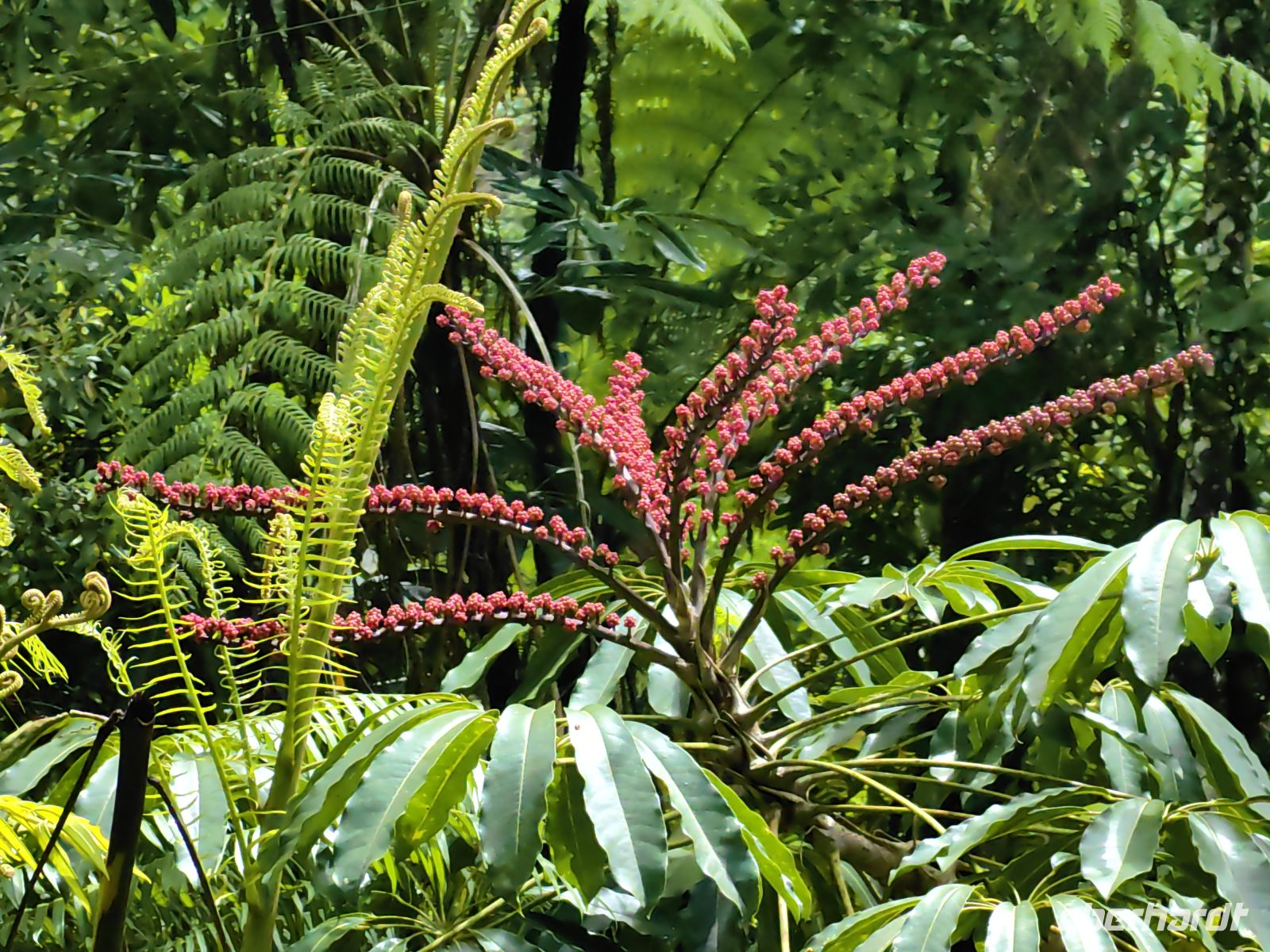 Dazu halten wir mitten auf einer Schafweide und laufen über grüne Weideflächen, vorbei an der üppigen einheimischen Vegetation. Wir entdecken Spinnengeflechte in den Ästen, reiben an Kawakawablättern, sie verströmen einen Zitrusduft und werden von den Maori für Tee verwendet, oder im Salat gegessen. Daneben steht ein hoher Flachsstrauch. Aus seinen Fasern stellen die Maori noch heute allerlei Flechtwerke und Bekleidung her. Nach einigen Minuten entdecken wir die Manukasträucher und die ähnlich aussehende Kanuka. Von ersteren stammt der berühmte Honig, letztere werden wiederum zur Teeherstellung verwendet. Neben diesen einheimischen Pflanzen wachsen riesige Walnußbäume, die voller Nüsse hängen, sie wurden von den europäischen Siedlern gepflanzt. Auf dem Boden sehen wir eßbare Pilze. Seit einigen Jahren versucht man hier, die ursprünglichen Pflanzenarten wie Tarata, Koromiko und Makomako wieder anzupflanzen, waren sie doch durch Rodung und Weidehaltung nahezu verschwunden. Mitten in den Zweigen neben uns zwitschert ein neuseeländischer Fächerschwanz munter vor sich hin. Durch die Wiederanpflanzung von Bäumen ist auch der schöne, einheimische Rotflügler Kahukura wieder hier zu sehen. Weitere heimische Vögel wie Riroriro und Korimako sind ebenfalls in das Tal zurückgekehrt und begleiten uns mit ihrem Gesang, während wir die grünen Pfade hinabsteigen