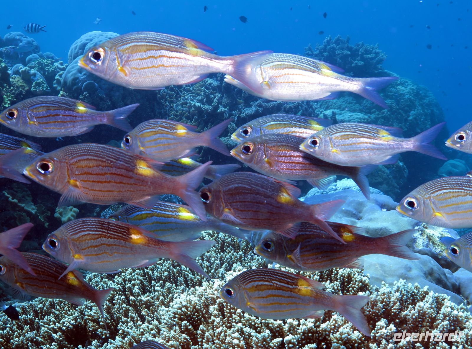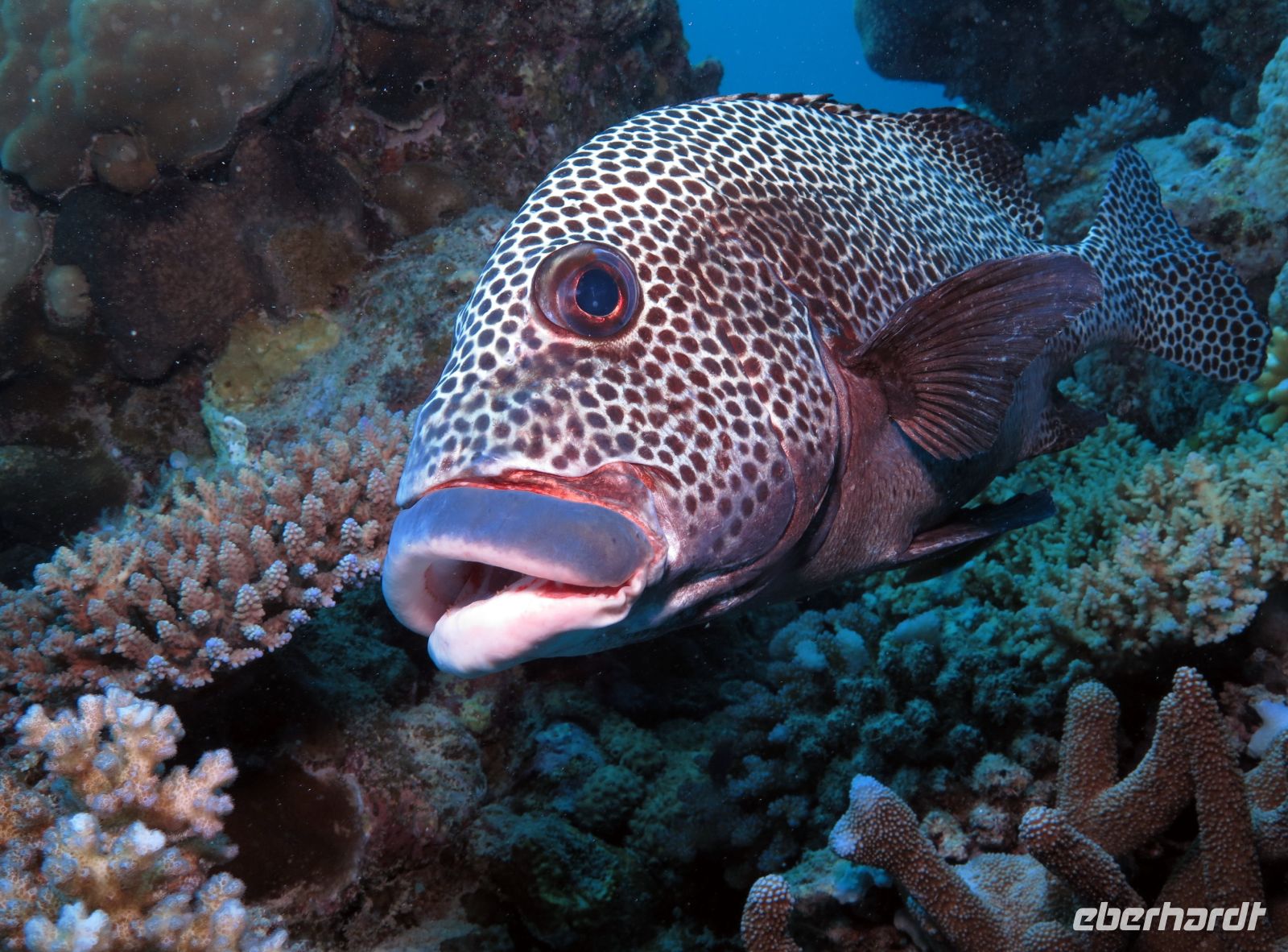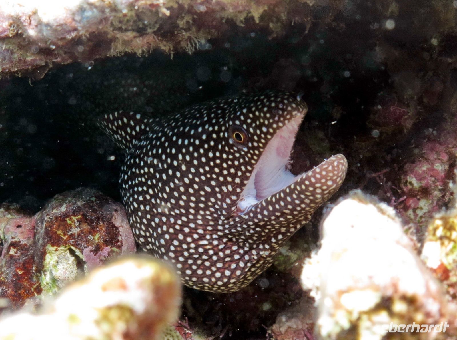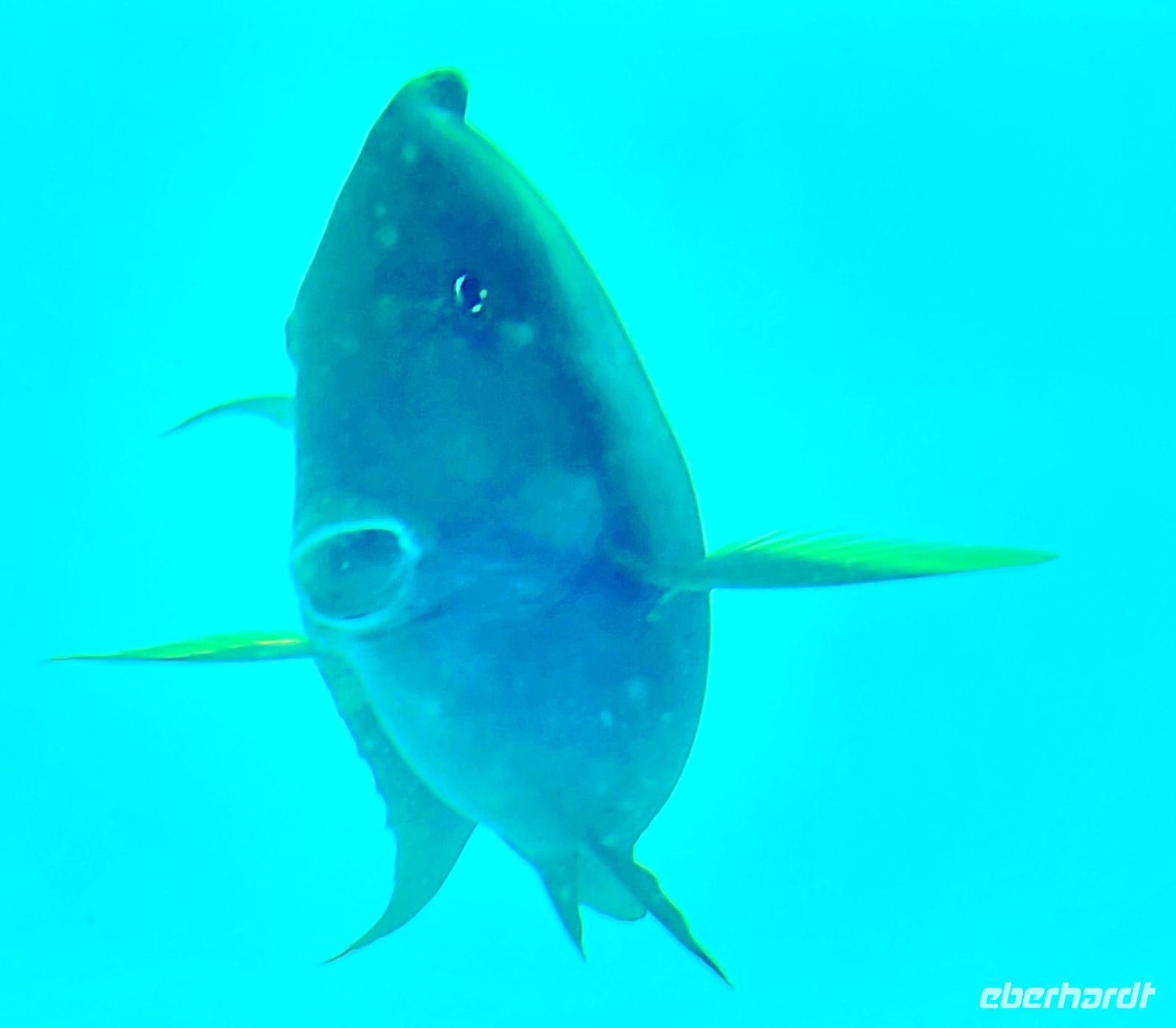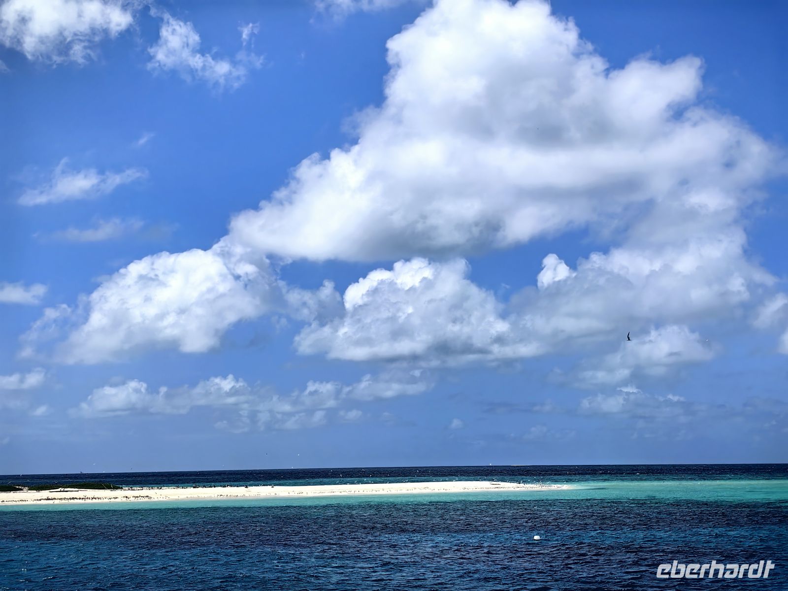 Als wir ankommen, sehen wir eine schneeweiße Sandbank mit Tölpeln aller Altersgruppen, die wir gut beim Füttern ihrer Brut beobachten können. Mit einem Tenderboot setzten wir über, schlüpfen in die Schnorchelanzüge, probieren Masken und Schnorchel, stellen alles für uns passend ein und nachdem wir unsere Füße in die Flossen geschoben haben, paddeln wir los. Am Riff gibt es mehr als hundert Haiarten, angefangen vom kleinsten, dem Wobbegang, bis hin zum größten, wie dem Walhai. Leider läßt sich heute keiner von ihnen blicken. Die berühmten orangefarbenen Clownfische - auch Nemos genannt - sind ebenfalls nicht auszumachen. Dafür treffen wir auf etliche Maori-Lippfische, die mit ihrem eigenartigen Maul und dem intensiven Blau sehr auffällig sind. Am Boden glänzen in Lila- und Blautönen Riesenmuscheln. Das Riff ist die Heimat von sechs der sieben weltweit vorkommenden Meeresschildkröten, allerdings sind auch sie heute nicht zu erblicken.