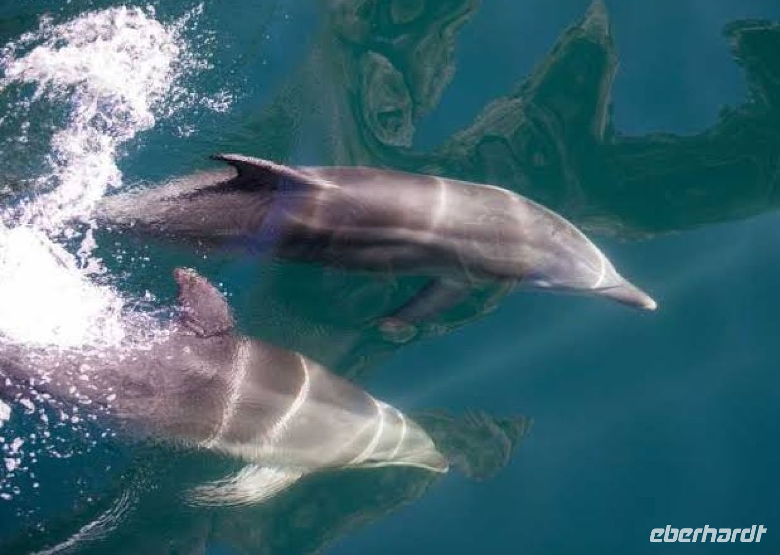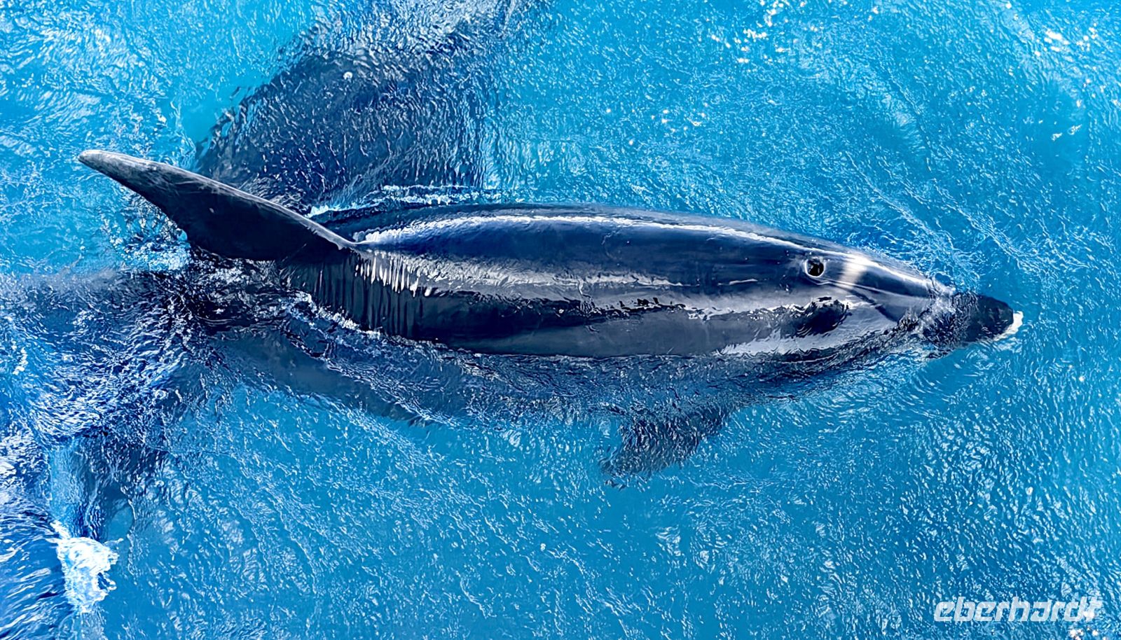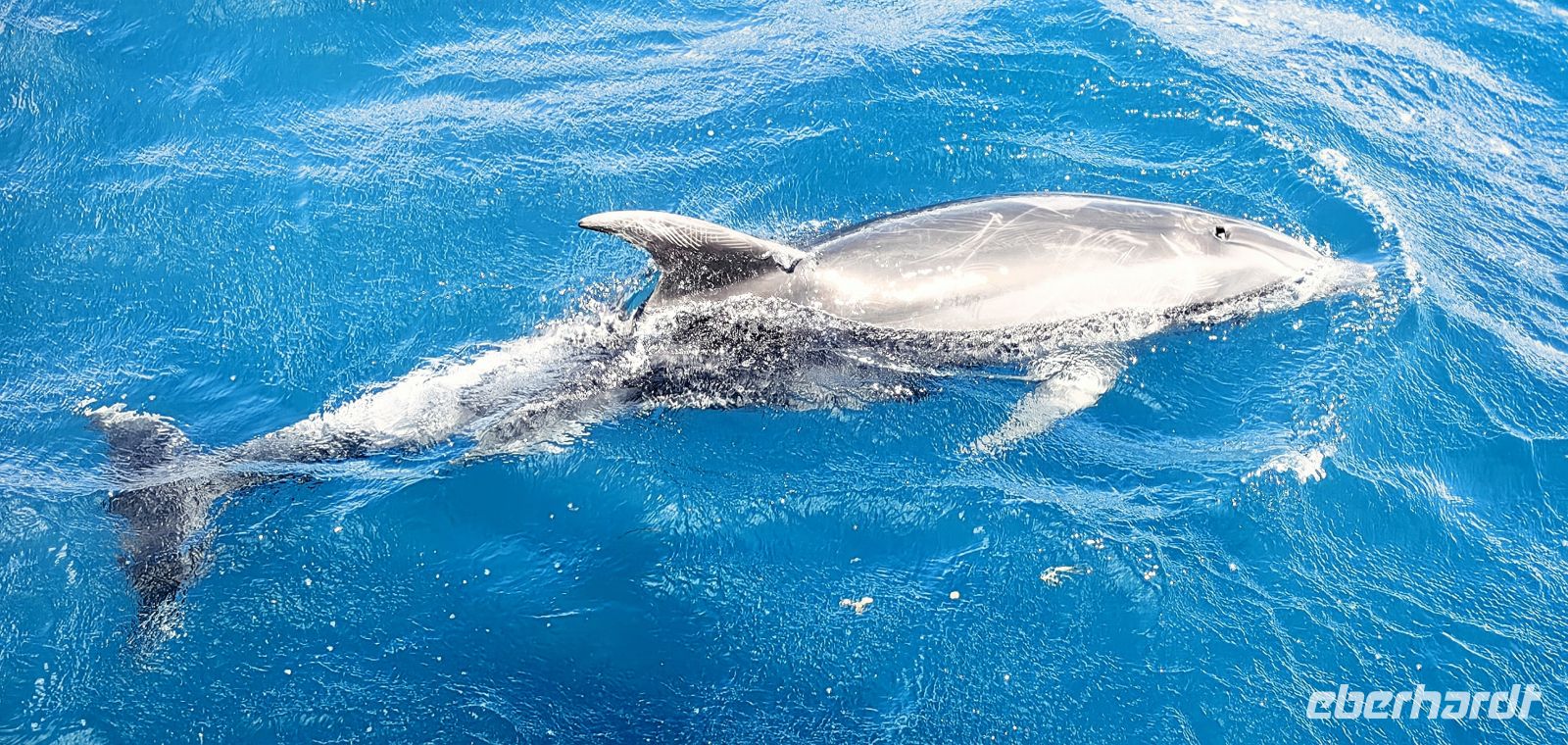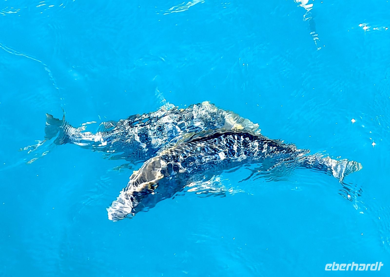 Drei wunderschöne Tiere kommen genau auf uns zu geschwommen, wir halten an und quietschen wie kleine Kinder. Die Delfine fiepen zurück und vollführen förmlich genau vor unseren Füßen Pirouetten, schwimmen nebeneinander, drehen sich um sich selbst, springen aus dem Wasser und scheinen uns regelrecht begrüßen zu wollen. Alle stehen nun im vorderen Teil des Katamarans und die Kameras laufen heiß. Was für ein Erlebnis!!!!
