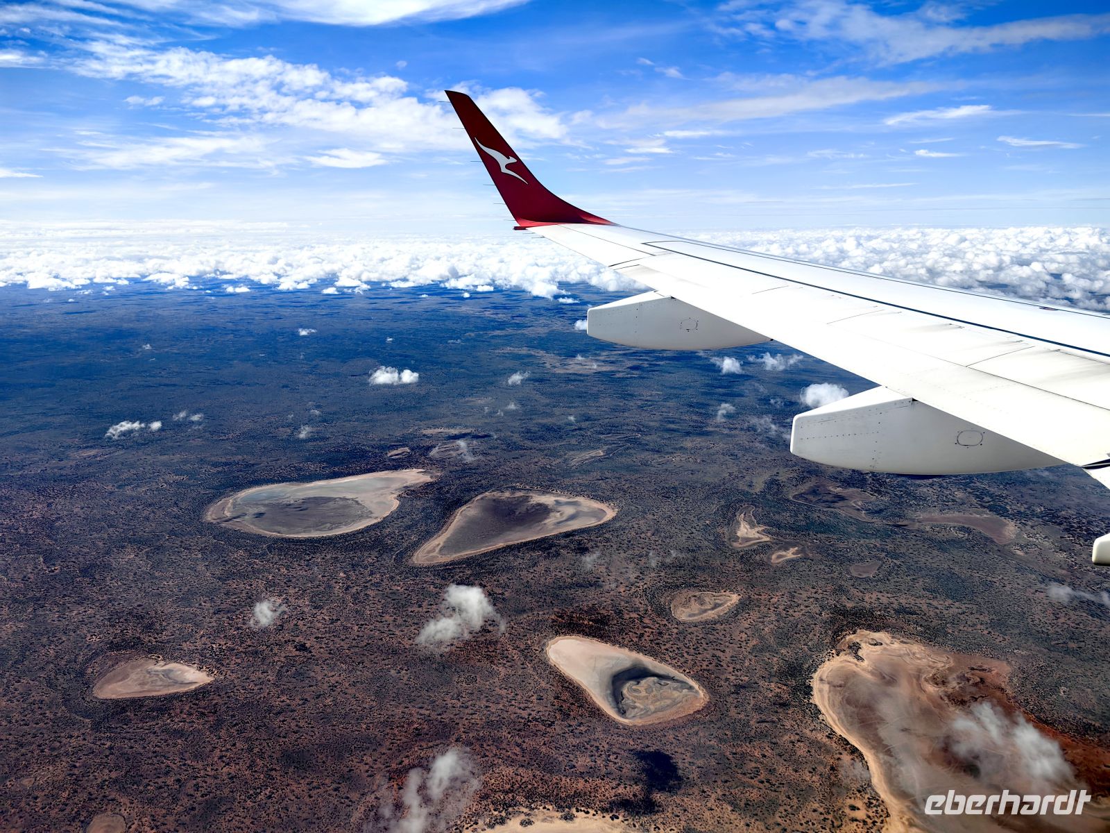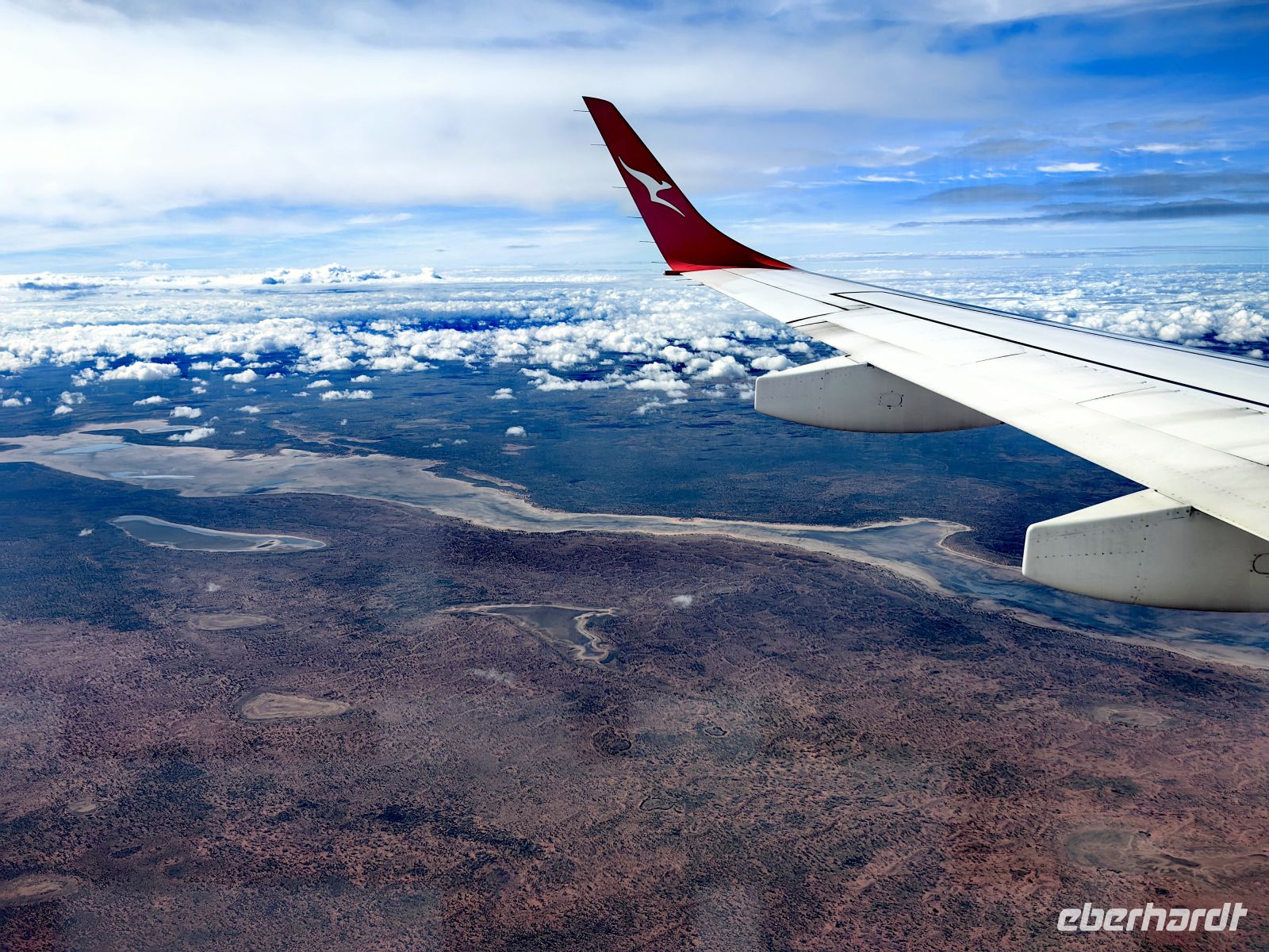 Am ganz frühen Morgen holt uns Annette im Hotel in Cairns ab und wir fahren wieder auf den Flughafen. In Australien fliegt man auch innerhalb des Landes, da die Distanzen sonst viel zu weit wären. Heute haben wir glücklicherweise weder Formulare auszufüllen noch Medikamente zu deklarieren und heben ganz pünktlich ab. Die Landschaft verändert sich, aus dem üppigen Grün des Regenwaldes gleiten wir hinüber in das Rotbraun des Landesinneren. Ganz ungewöhnlich für die Region ist es, daß es seit etwa einer Woche üppige Regengüsse gegeben hat, was nur etwa aller drei Jahre vorkommt. Von oben schauen wir auf Flüsse und Wasserlöcher, die sonst nicht da sind.