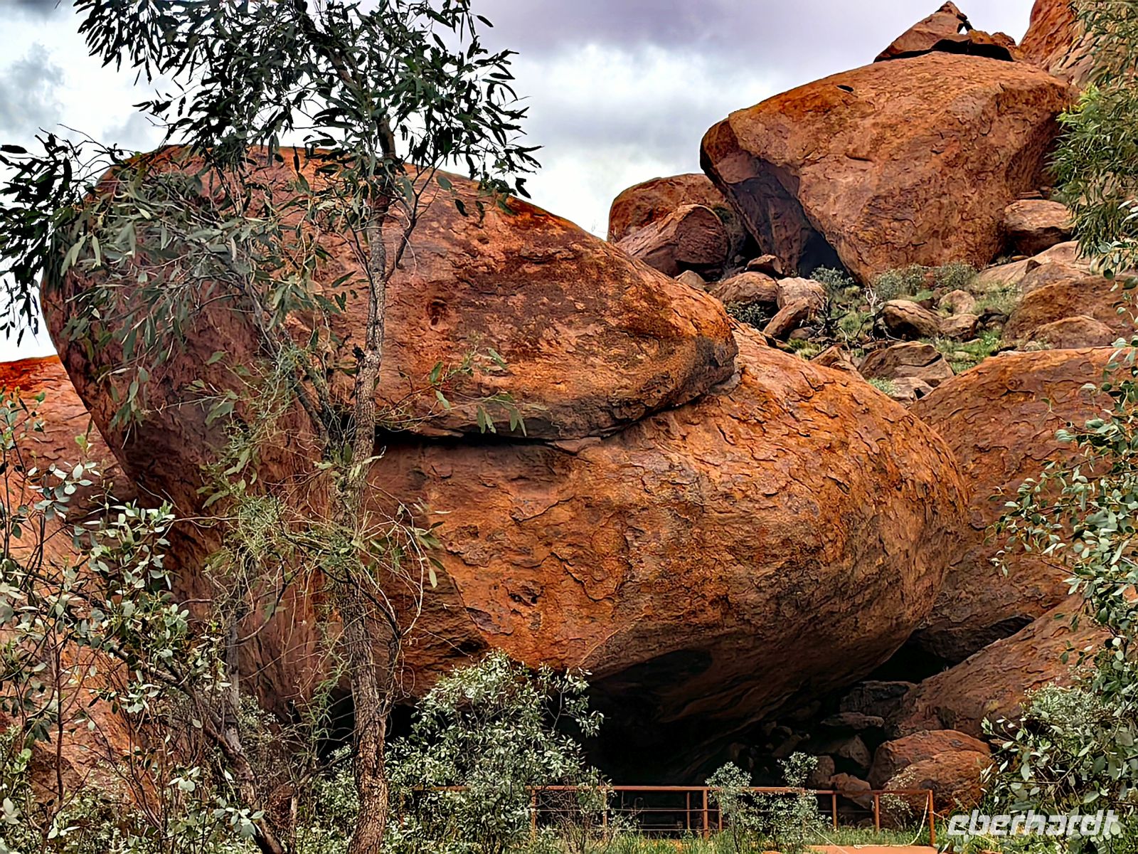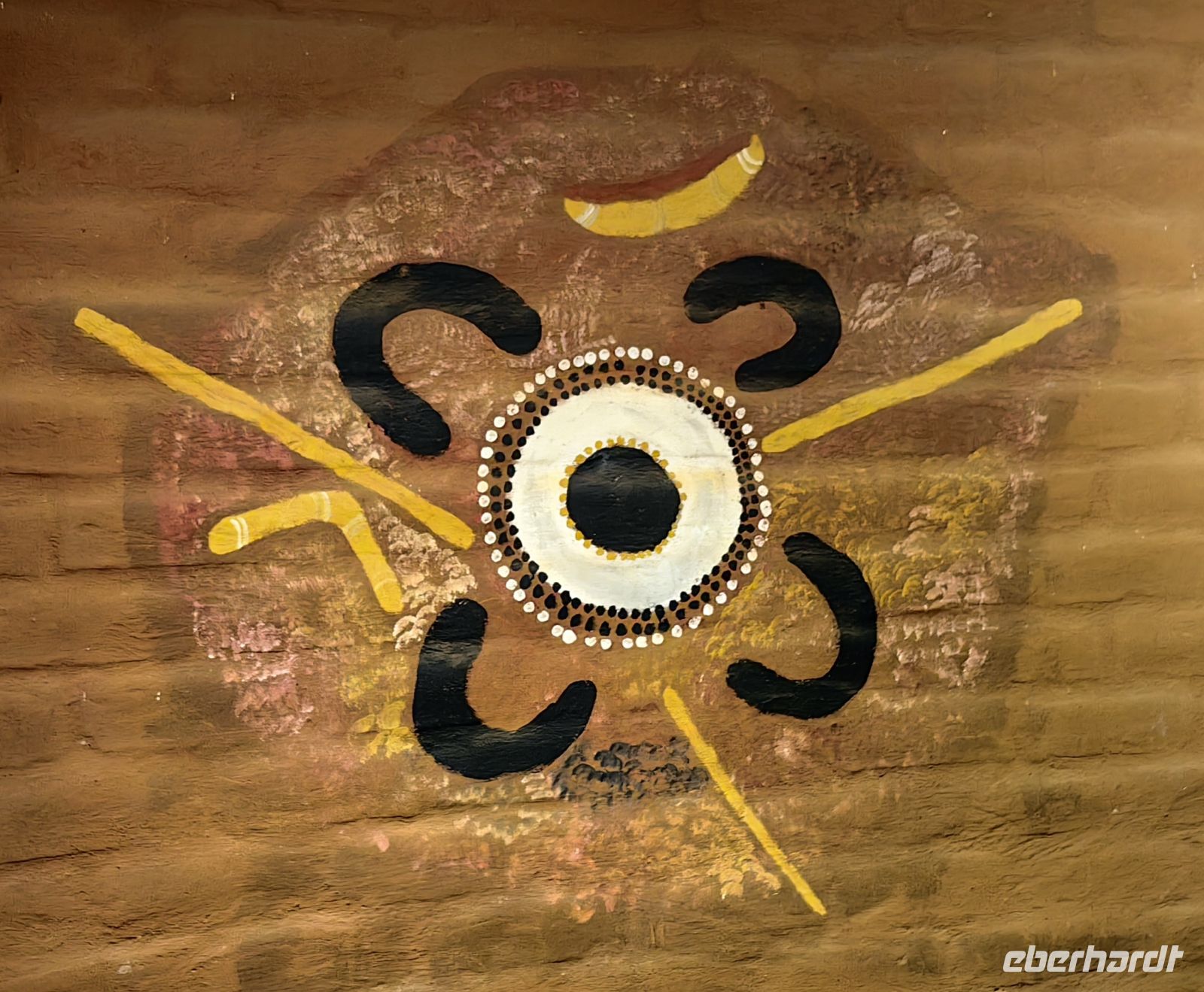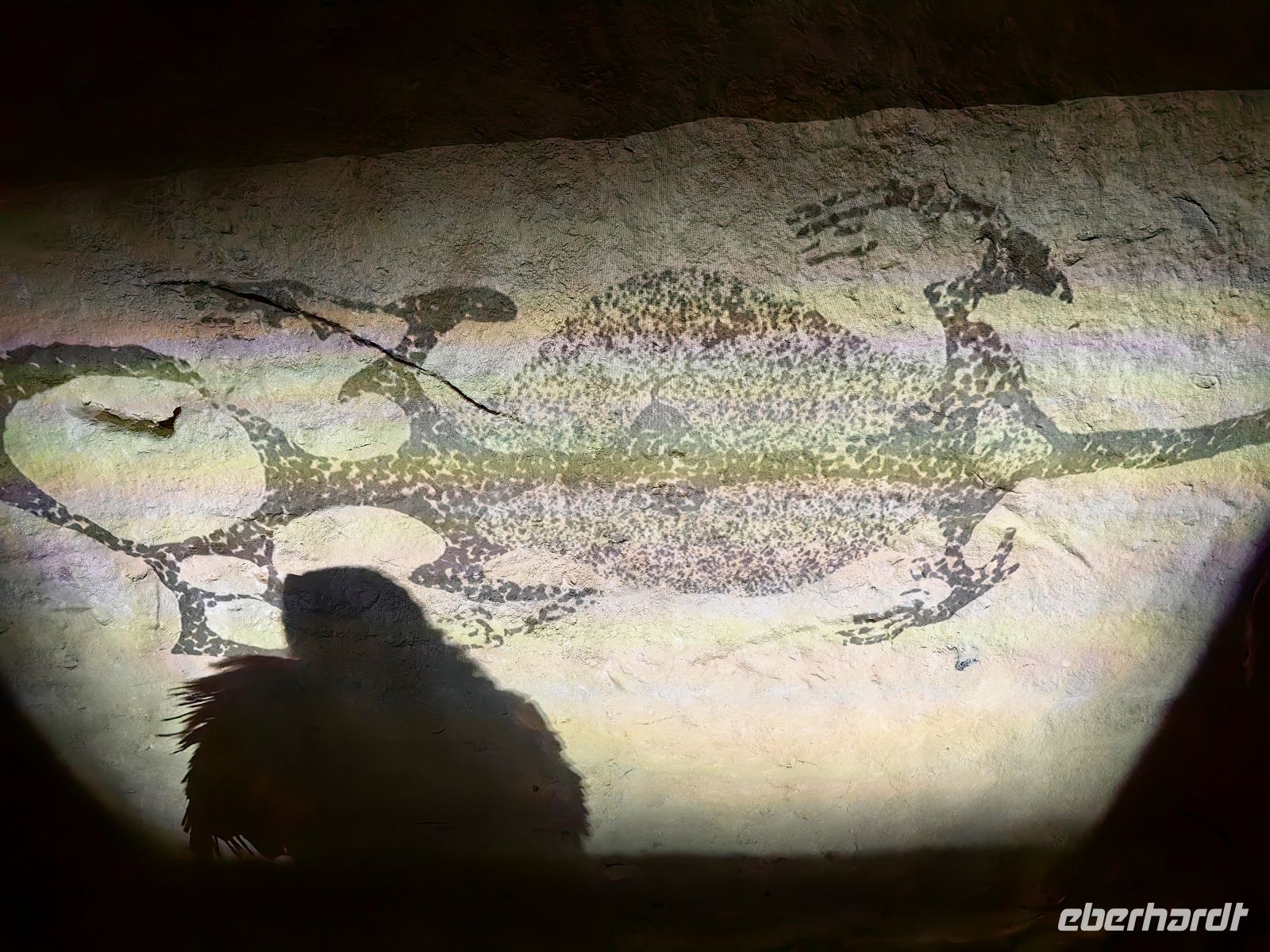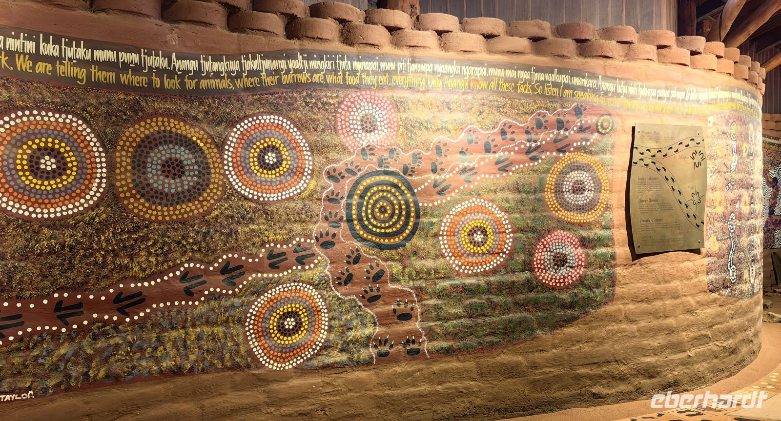 Im Kulturzentrum der Aborigines sehen wir ihre Kunst und lernen einige ihrer Traumzeitmythen kennen. Danach spazieren wir um den Fels herum, sehen ein Wasserloch, eine Höhle und die Spuren der Übermütigen am Fels, die den Riesen bestiegen haben. Seit 2019 ist das glücklicherweise verboten, wer hat es schon gern, wenn die Gäste über die eigenen Heiligtümer trampeln.