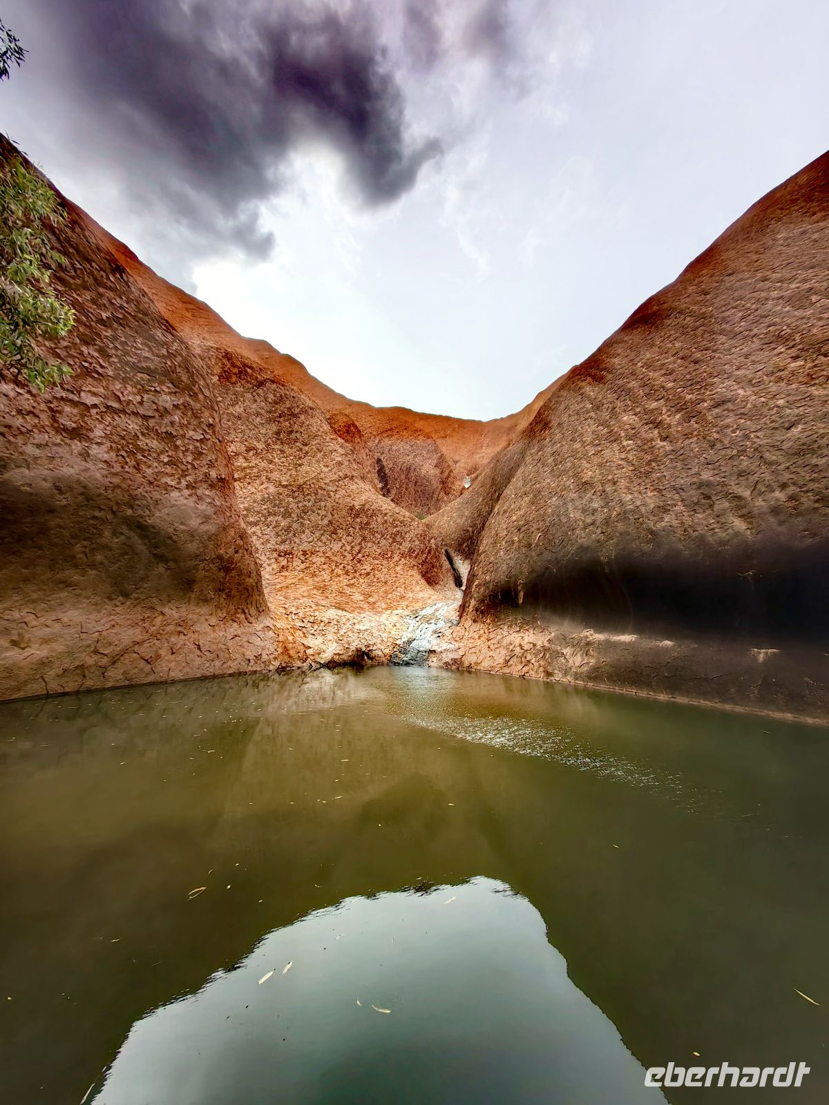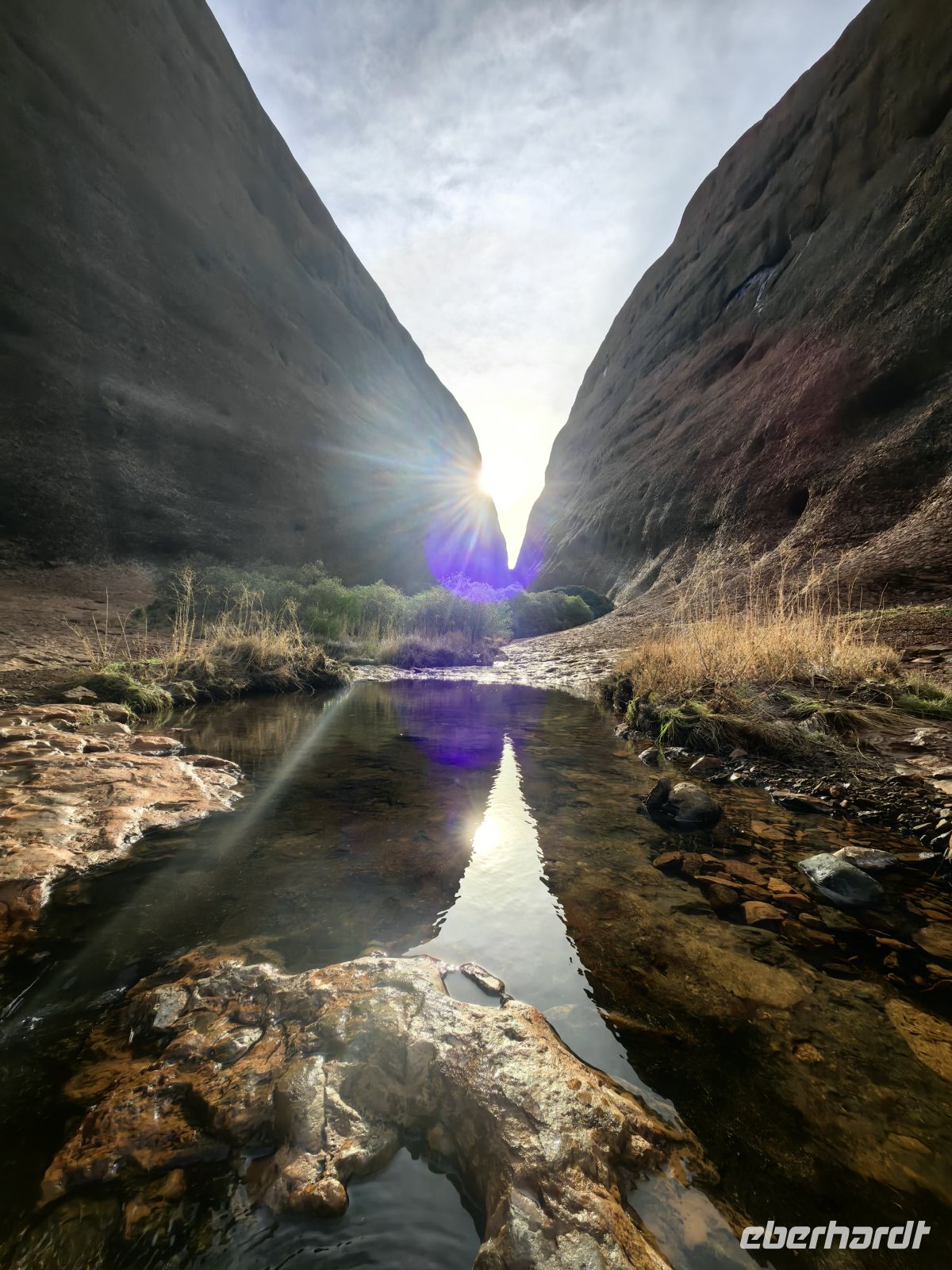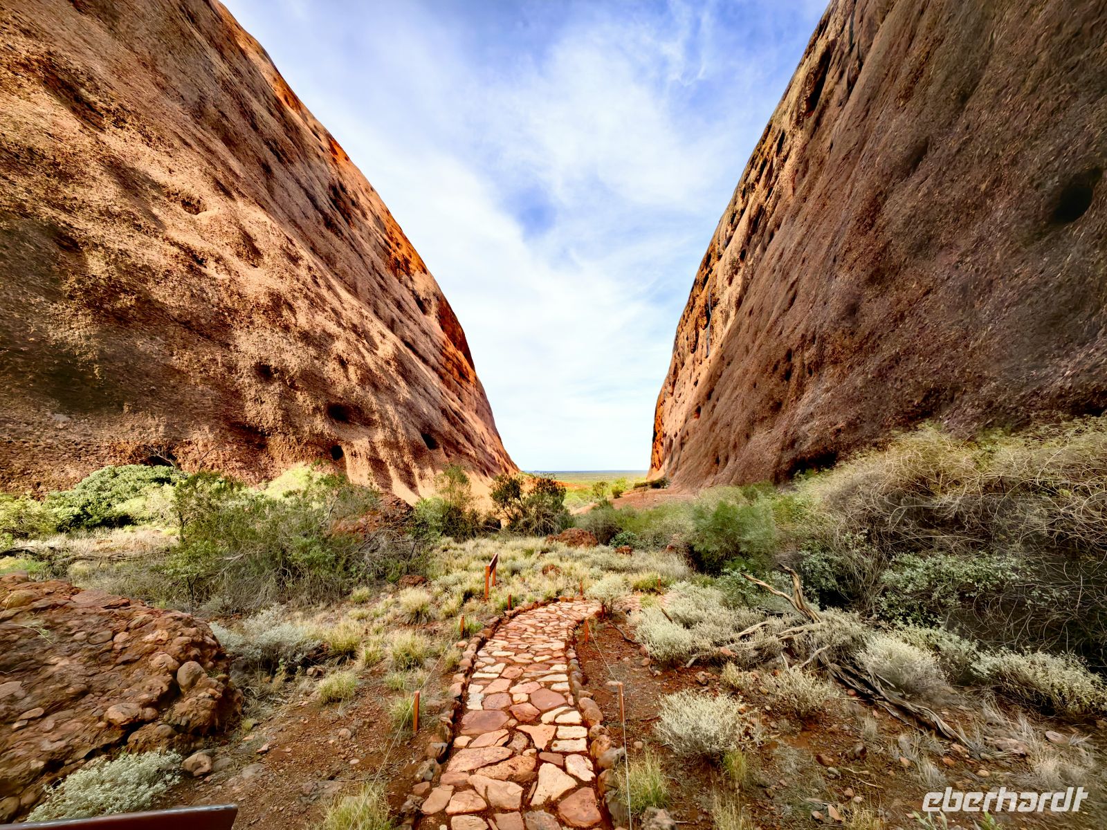 Wir laufen gemeinsam über rote Steine, kraxeln über Brücken und erreichen die Walpaschlucht. Die Landschaft ist faszinierend. Der Boden unter unseren Füßen ist rot wie Tomatensauce und porös. Eukalyptusbäume und Sträucher säumen unseren Pfad und rechts und links ragen die riesigen Felswände der Kata Tjutas empor. Als wir eine Aussichtsplattform erreichen, erstreckt sich die fantastische Landschaft vor unseren Augen. In einem kleinen Wasserlauf entdecken wir Kaulquappen.