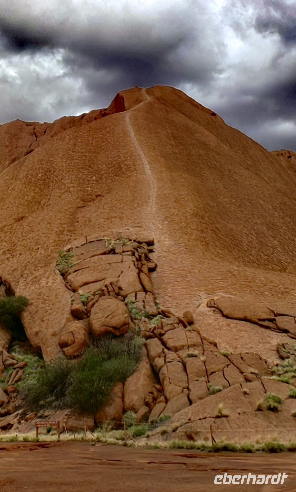 Am Nachmittag treffen wir uns alle wieder, um nun gemeinsam das Terrain zu erkunden. Zuerst fahren wir zu einem Fotostop, von wo aus man den Uluru sehr gut fotografieren kann. Da es seit einer Woche etliche Regenfälle gegeben hat, ist die Landschaft grün, und sogar Pilze entdecken wir am Boden. Unser Busfahrer Dave zeigt uns ein Video vom Vortag in dem Wasserfälle den Ayers Rock hinunter rauschen, hier in der Wüste ein seltenes Ereignis.