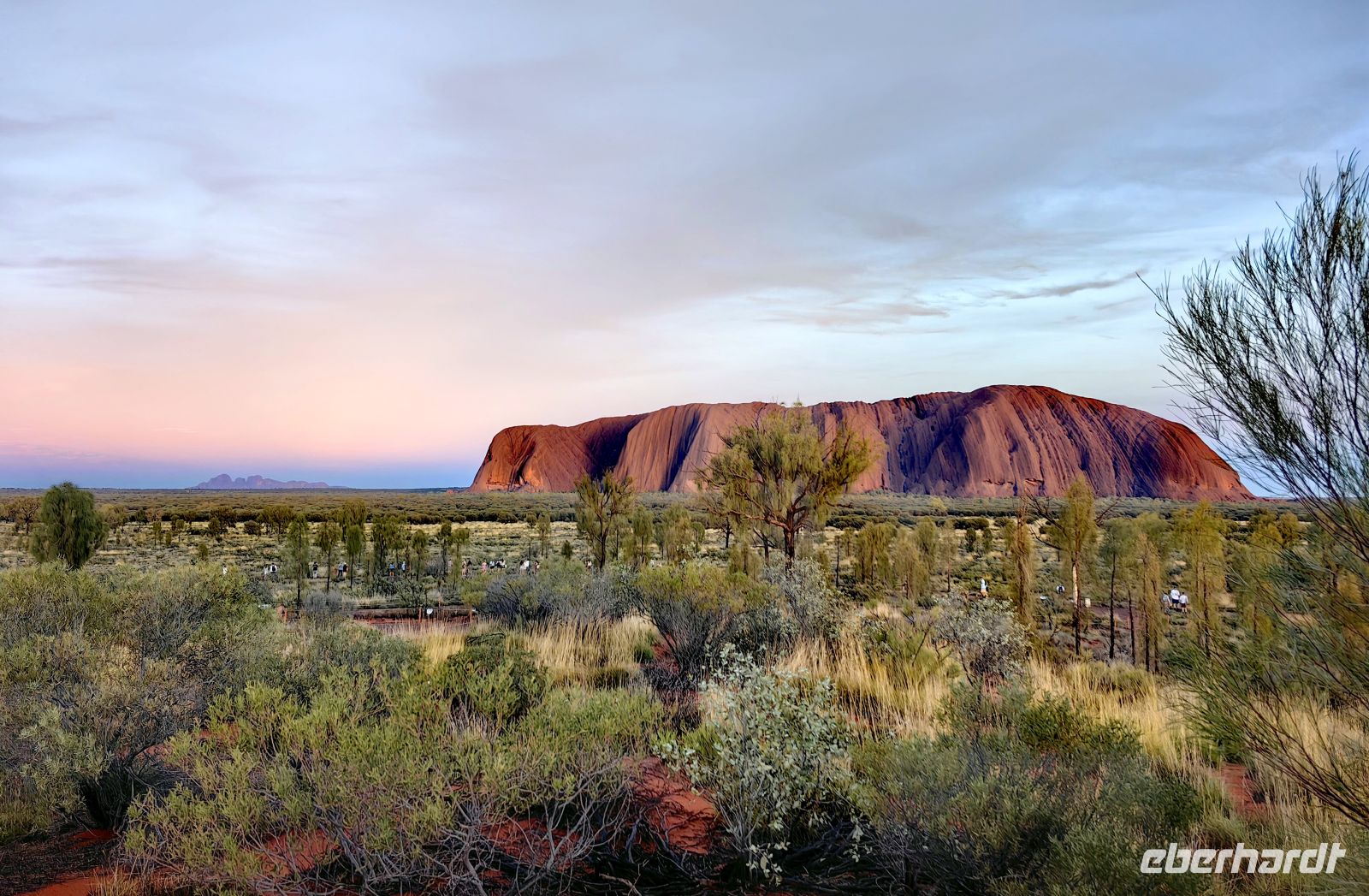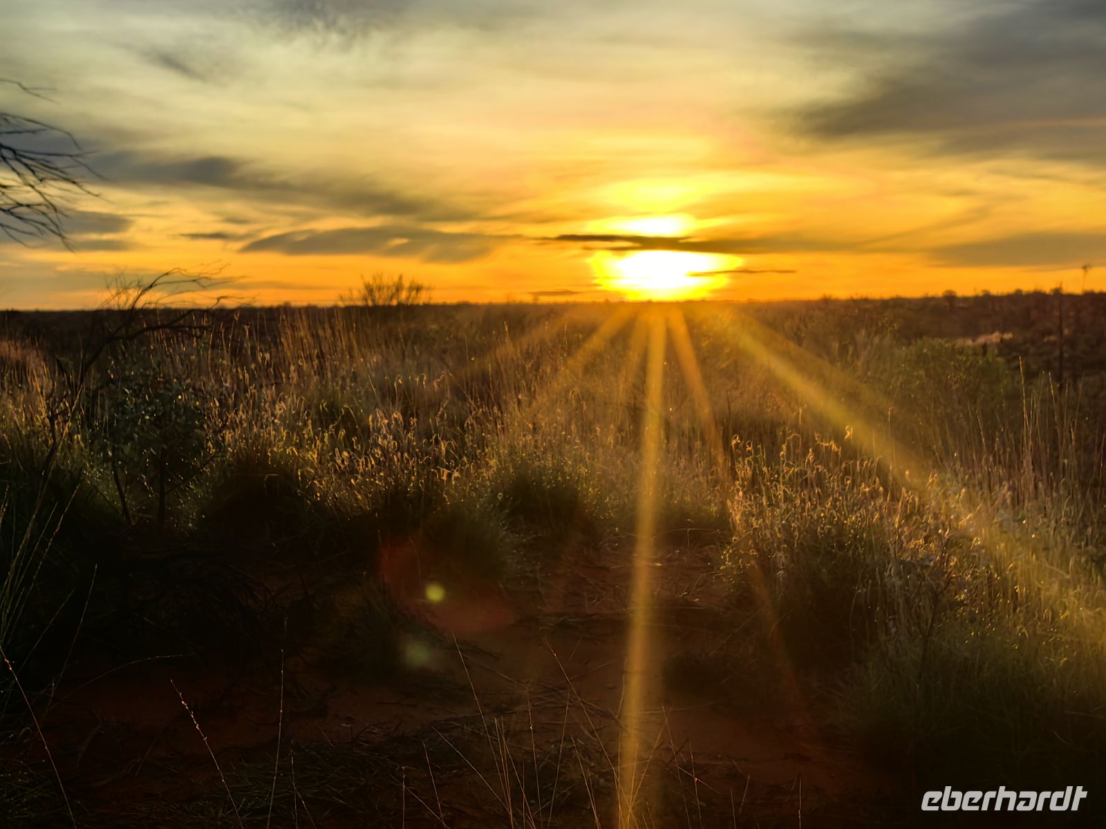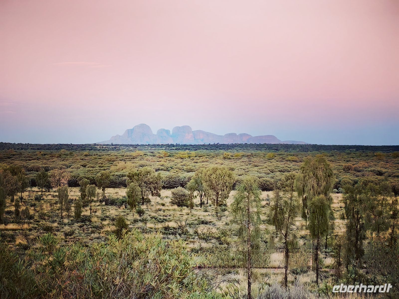 Gaaaanz früh am Morgen begeben wir uns nochmals in die Wildnis zum Uluru, um den Berg und die Landschaft im rosaroten Licht des Sonnenaufgangs zu erleben. Das Glück ist uns hold und ein beeindruckender Sonnenaufgang taucht den riesigen Fels in die schönsten Farben. Von unserer Plattform aus können wir neben dem Uluru bereits die Kata Tjutas, unser nächstes Ziel, erkennen.