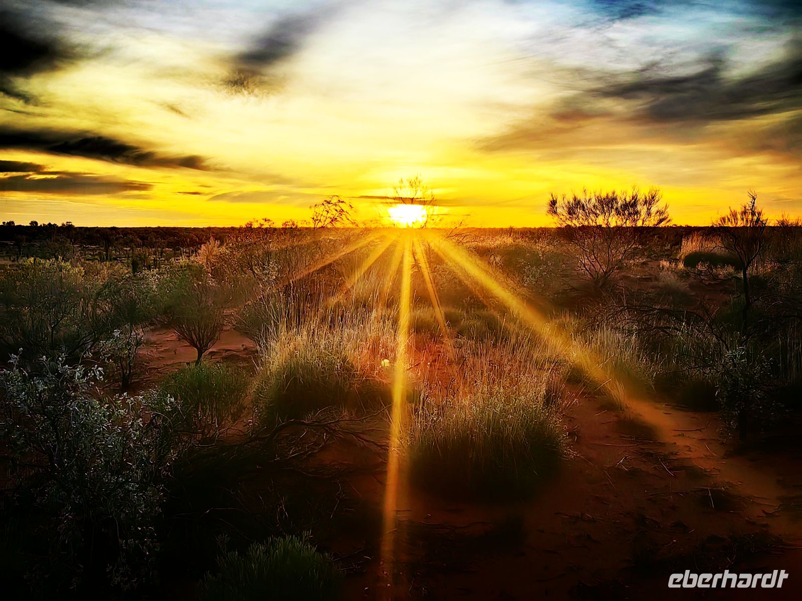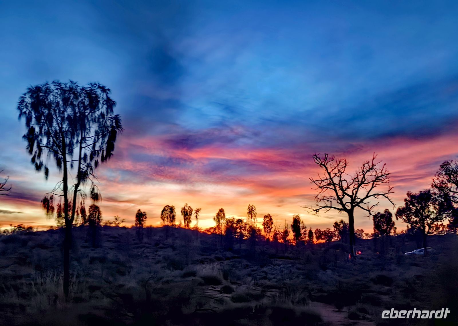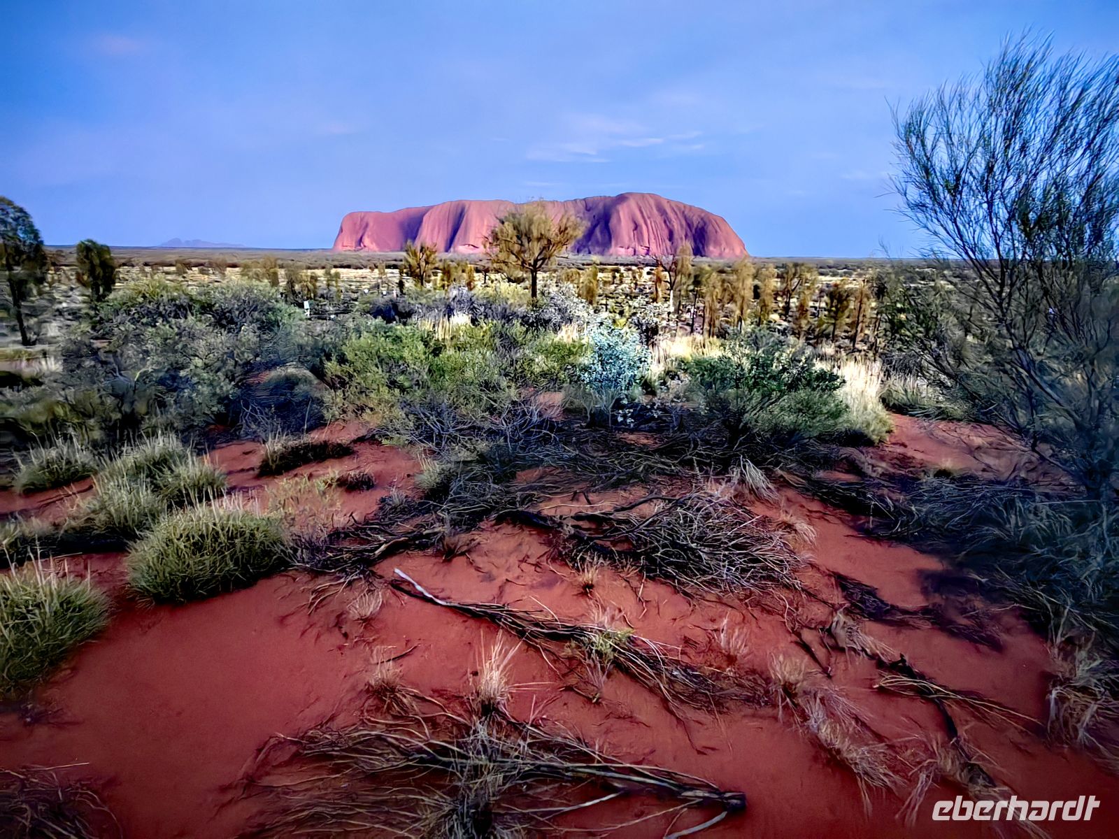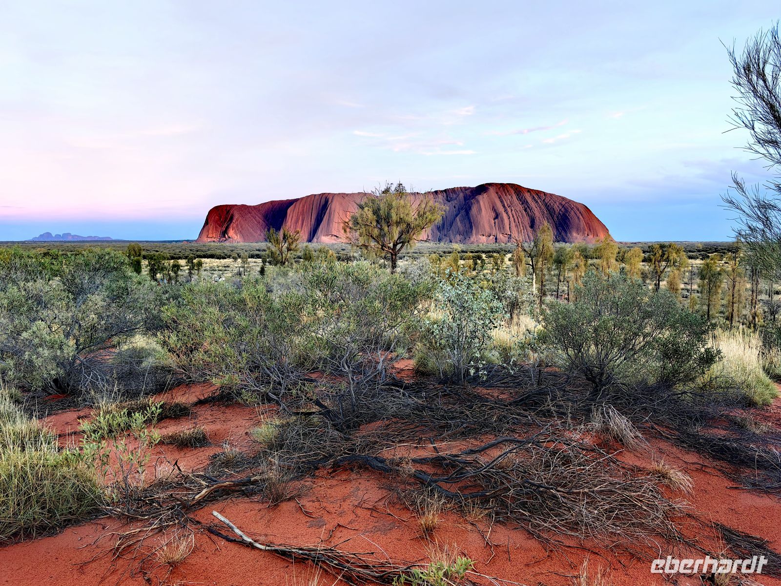 Gaaaanz früh am Morgen begeben wir uns nochmals in die Wildnis zum Uluru, um den Berg und die Landschaft im rosaroten Licht des Sonnenaufgangs zu erleben. Das Glück ist uns hold und ein beeindruckender Sonnenaufgang taucht den riesigen Fels in die schönsten Farben. Von unserer Plattform aus können wir neben dem Uluru bereits die Kata Tjutas, unser nächstes Ziel, erkennen.