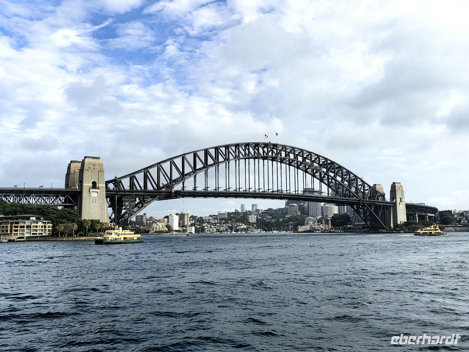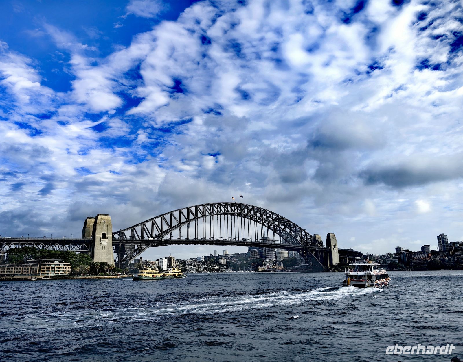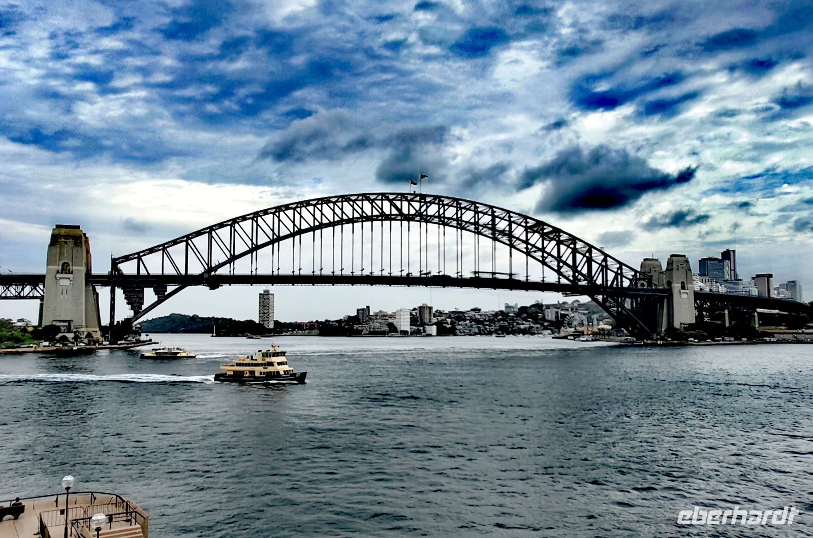 Am Vormittag erreichen wir den Hafen und erklimmen die Treppen, die auf die berühmte Harbour Bridge führen. Von hier oben genießen wir den fantastischen Ausblick auf die Skyline von Sydney und das Opernhaus. Heute sind sogar blaue Abschnitte am Himmel auszumachen und es regnet nicht! Wenig später machen wir eine Pause in The Rocks, dem ältesten Stadtviertel und genießen ein kühles Bier.