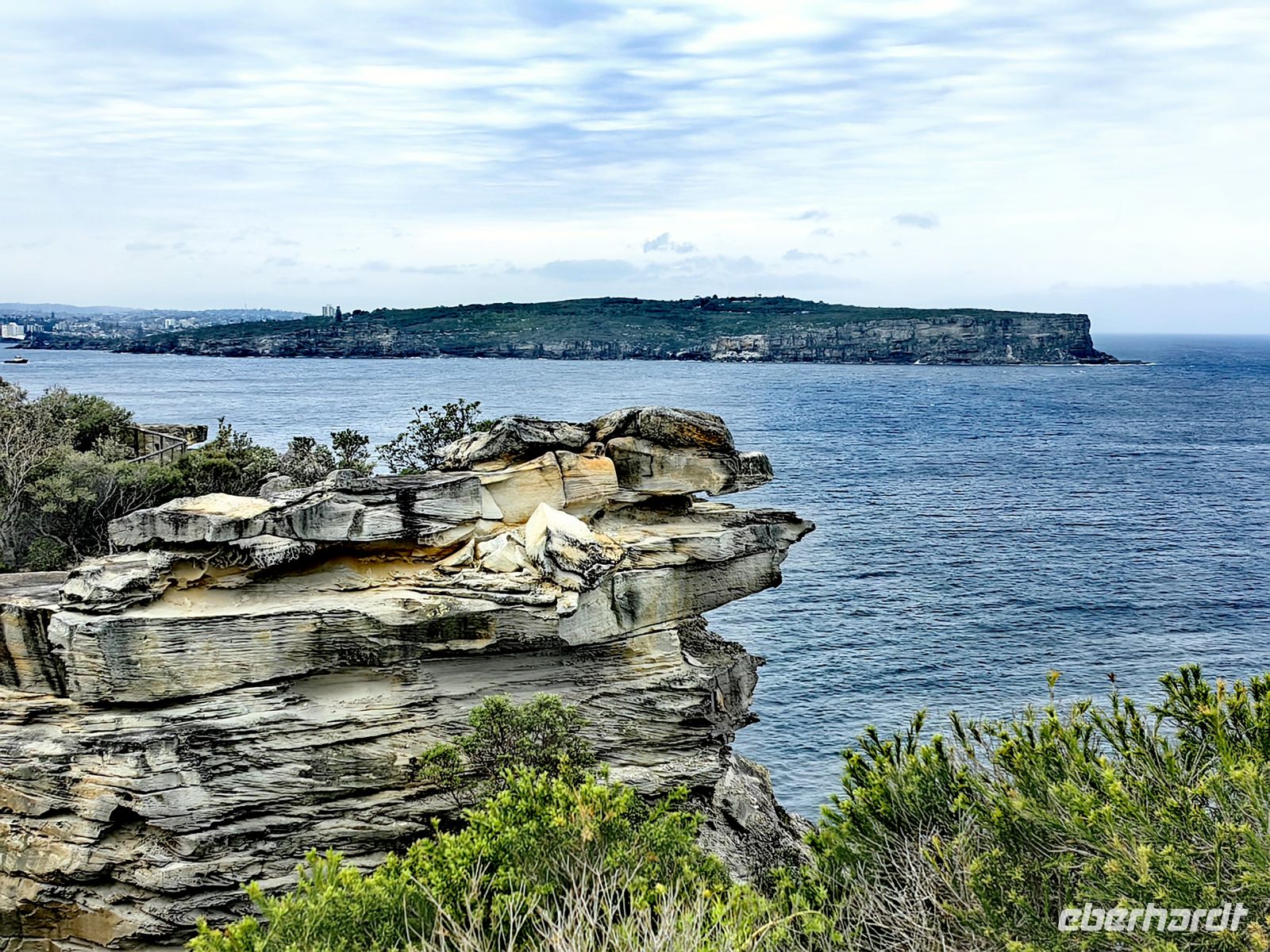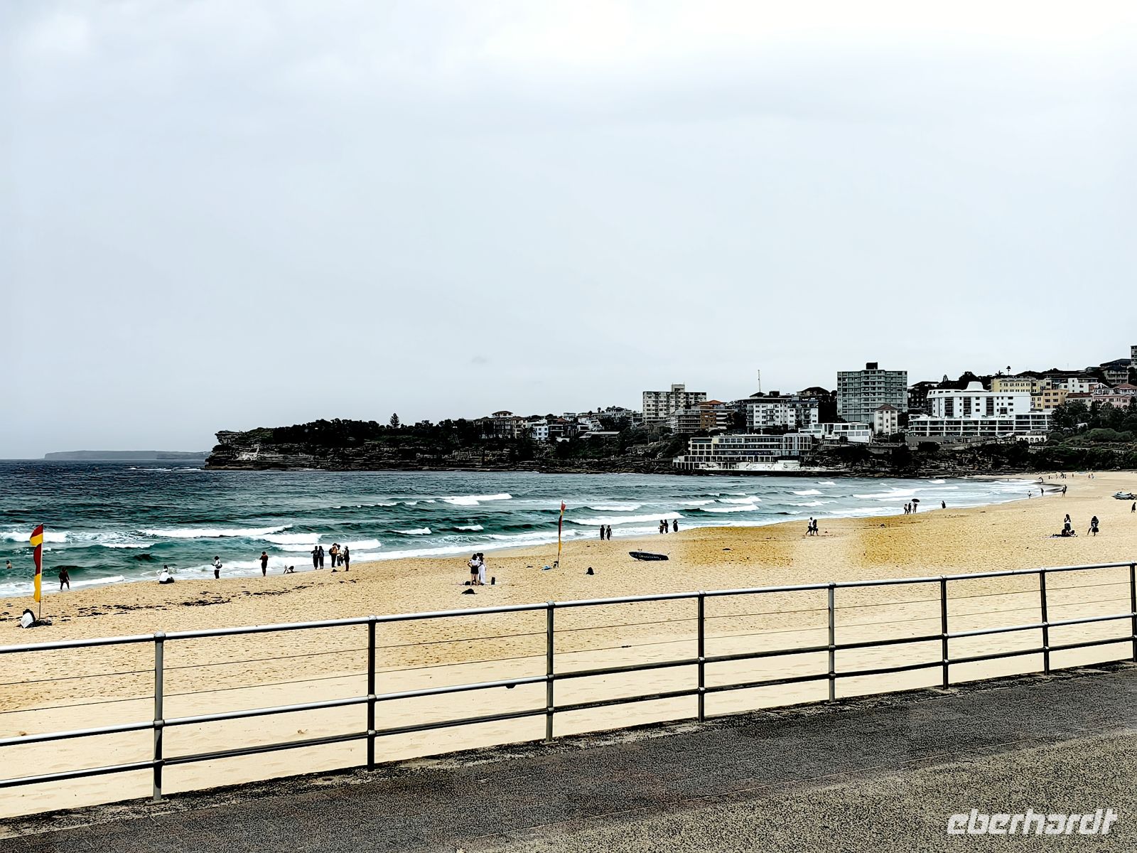 Im Anschluß an die spannende Opernführung fahren wir zum Observatory Hill und genießen die Aussicht auf den Darling Harbour und die berühmte Hafenbrücke. Leider ist uns heute das Wetter nicht hold, es nieselt und alles ist Grau in Grau - schade! Am Circular Quay sehen wir die Fähren nach Manly abfahren, wir streifen den Hyde Park mit seinen mächtigen Feigenbäumen, bewundern den viktorianischen Stil am Queen Victoria Gebäude und laufen durch The Rocks, das älteste Viertel Sydneys. Als wir am berühmten eigentlich goldgelben Bondy Beach ankommen, öffnet der Himmel seine Schleusen und wir entschließen uns, einen Kaffee zu trinken und Eis in Innerein eines Cafés zu essen, an einen Strandspaziergang ist nicht zu denken. Wenig später erreichen wir einen Aussichtspunkt, von dem aus wir auf die Halbinsel Manly blicken, ein Viertel, wo die gutbetuchten Einwohner Sydneys leben.