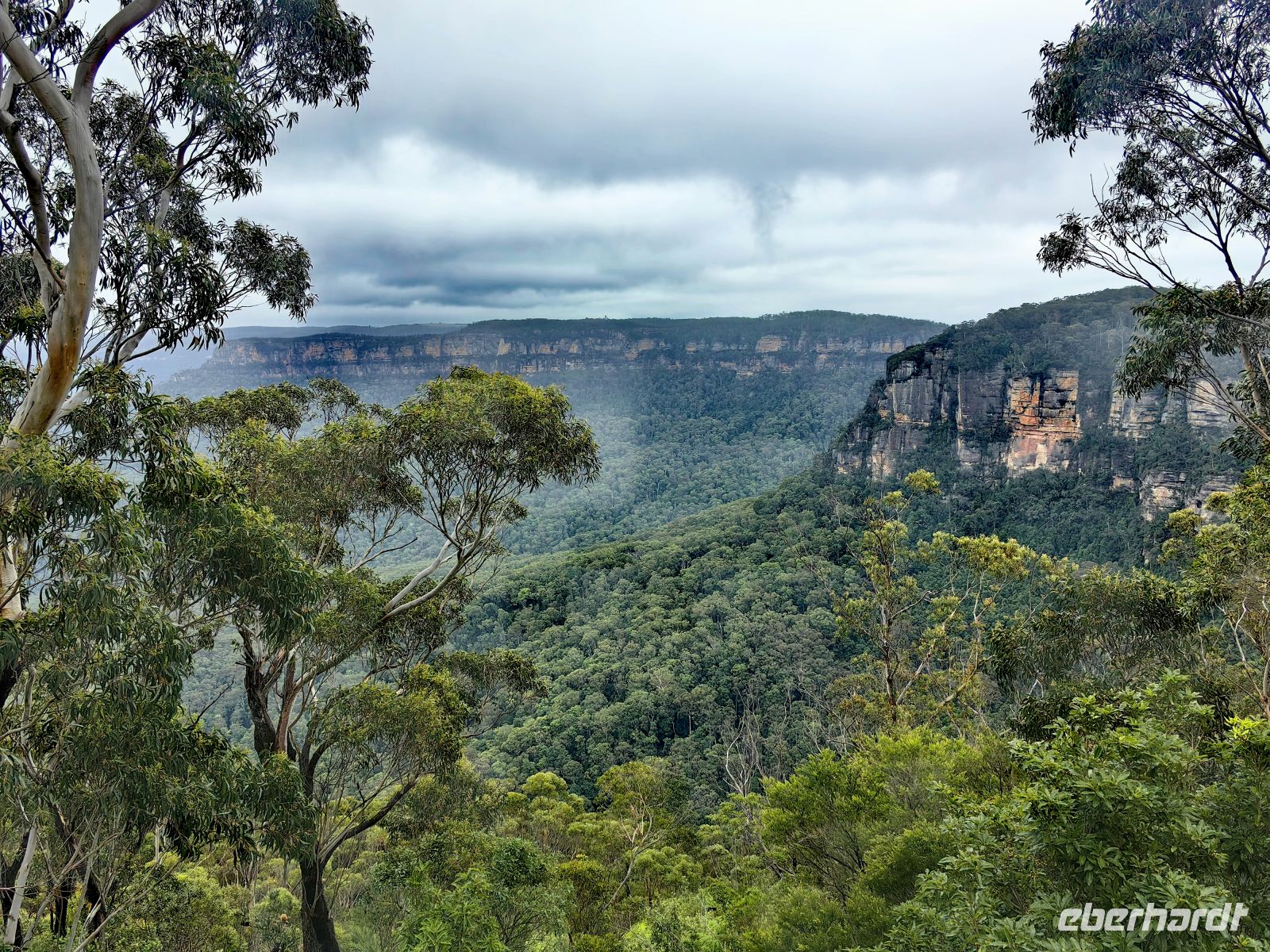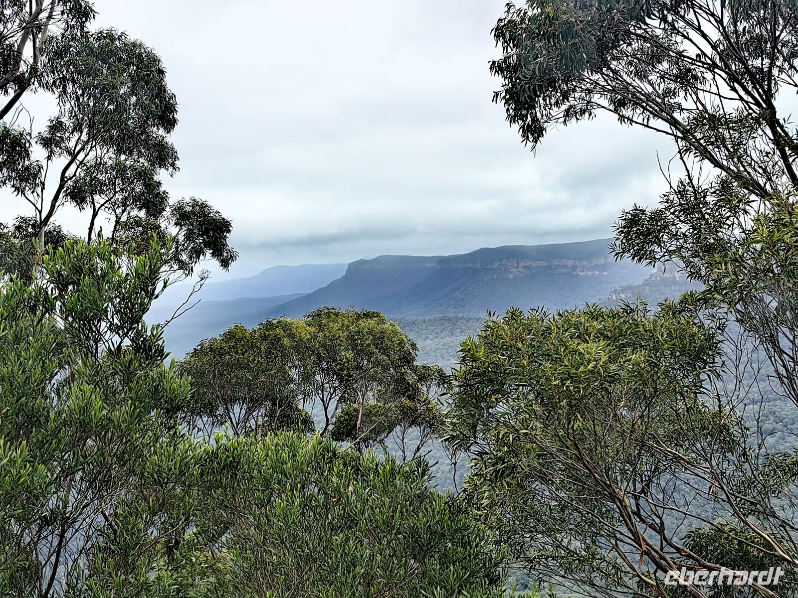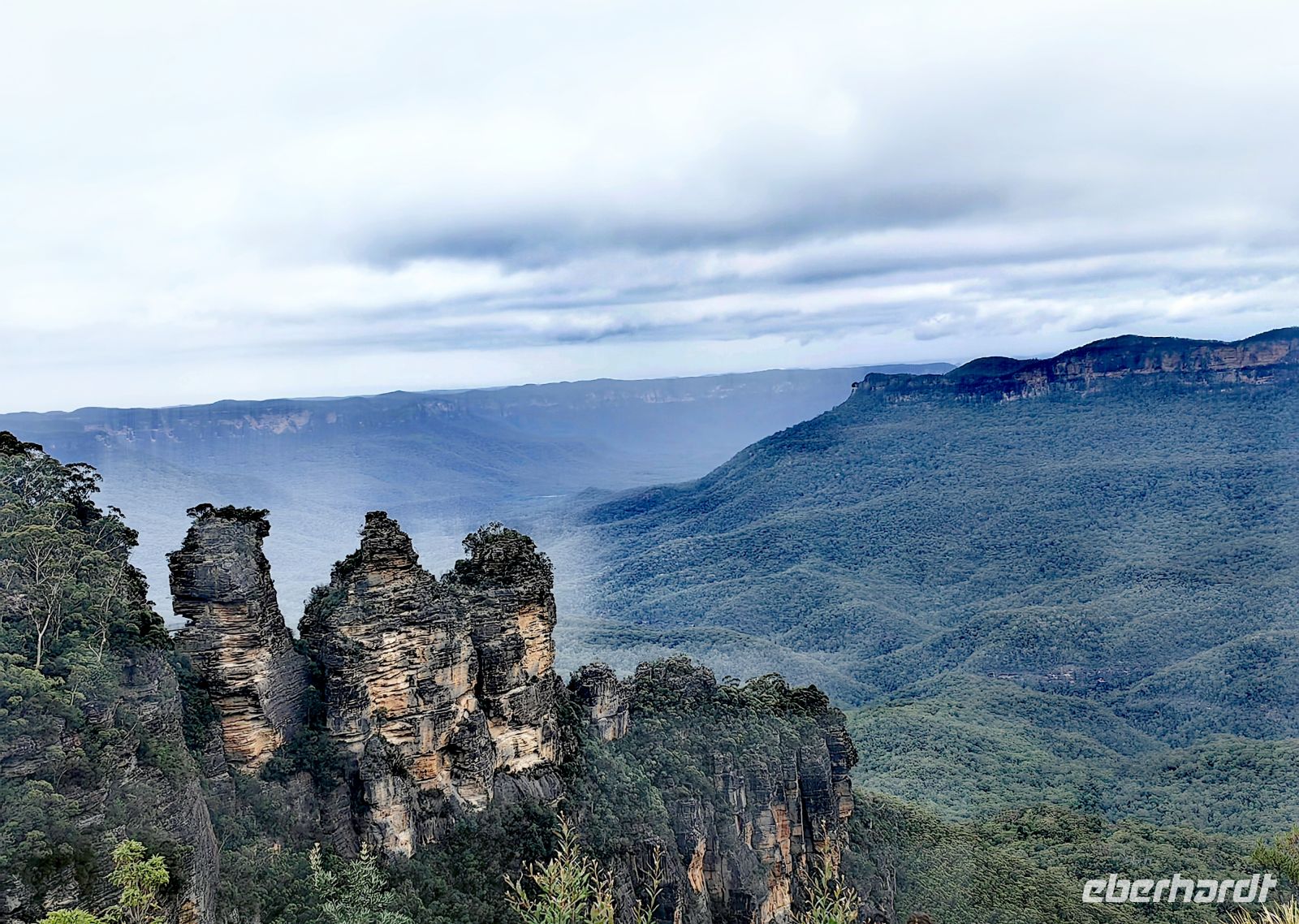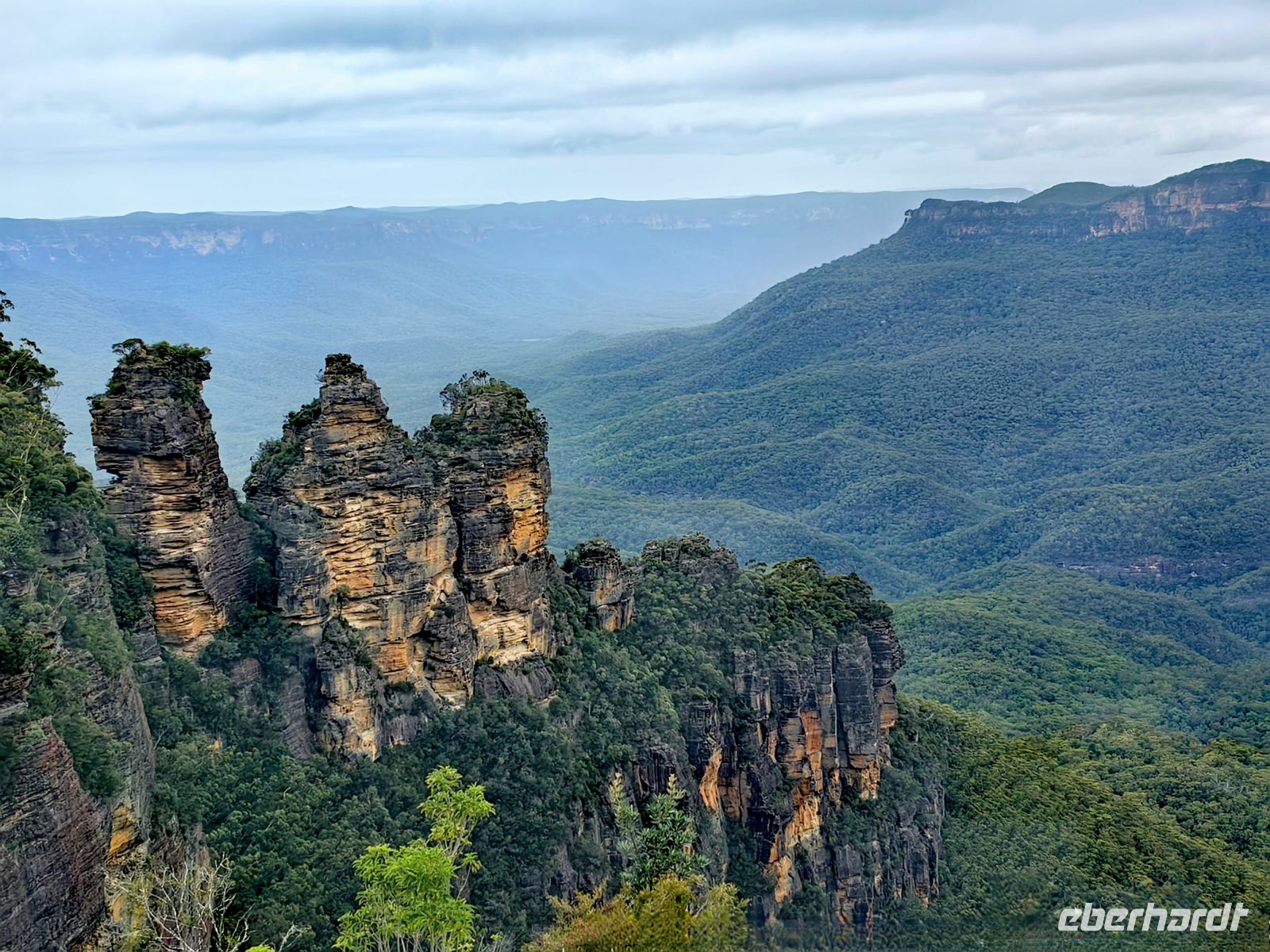 Unverrichteter Dinge fahren wir ins nah gelegene Katoomba, machen eine Kaffee- und Shoppingpause und versuchen unser Glück nach zwei Stunden erneut. Jetzt ist Freitag, der 13. uns hold und die Nebelschwaden sind verschwunden. Die fantastische Sicht auf die interessante Felsformation ist frei. Wir sehen alle drei der Schwestern, deren Namen Meehni, Wimlah und Gunnedoo lauten, die sich von einer Traumzeitlegende der Ureinwohner ableiten.