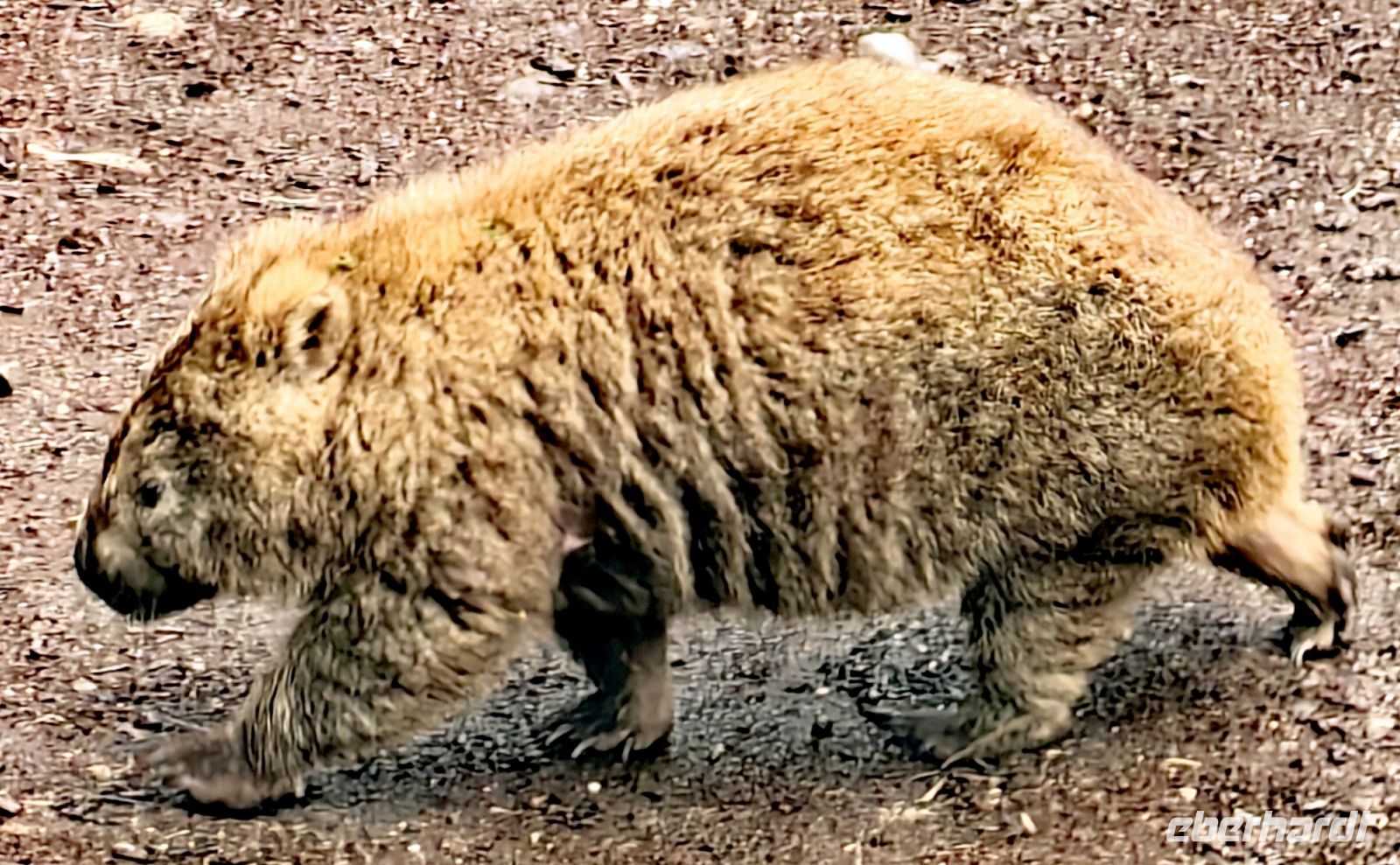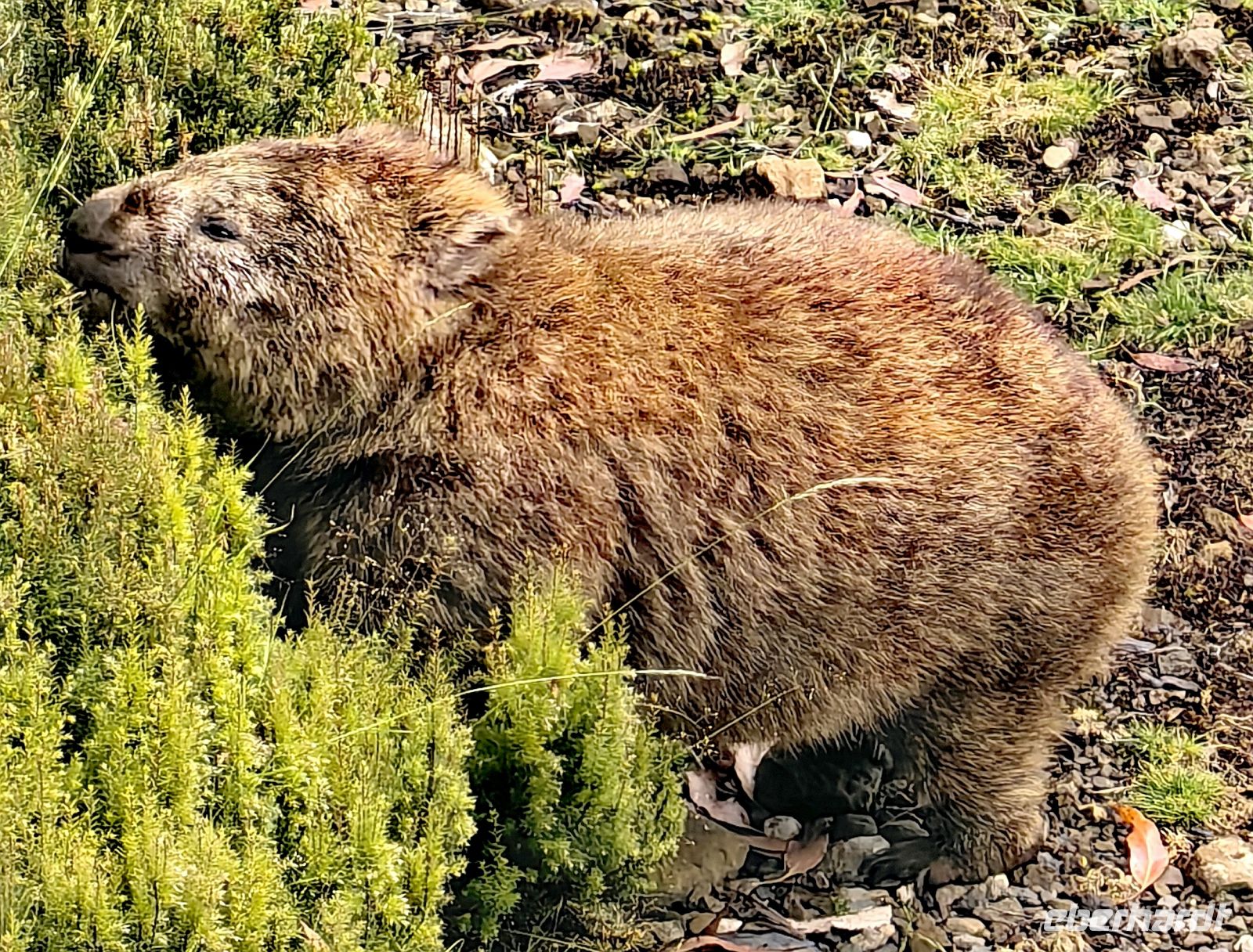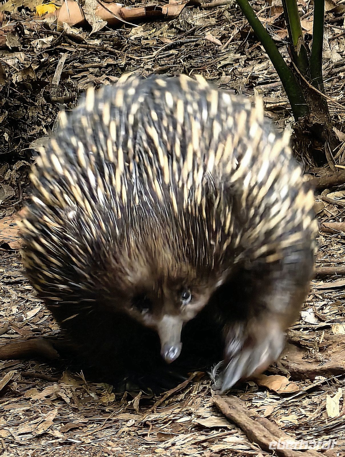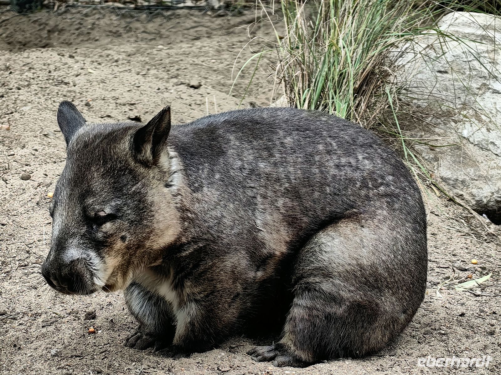 Als wir gerade beim Mittagessen sitzen, kommt ganz gemächlich ein pelziges Wombat angelaufen und läßt es sich ebenfalls an einem Busch schmecken. Wir springen alle ganz aufgeregt an die Restaurantfenster und machen Fotos. Nach dem Essen gehen wir in die Galerie hinüber und direkt vor dem Eingang sucht ein Kurzschnabeligel nach Ameisen und läßt sich durch uns überhaupt nicht stören. Dieser putzige Gesell ist nur in Australien und Tasmanien beheimatet.