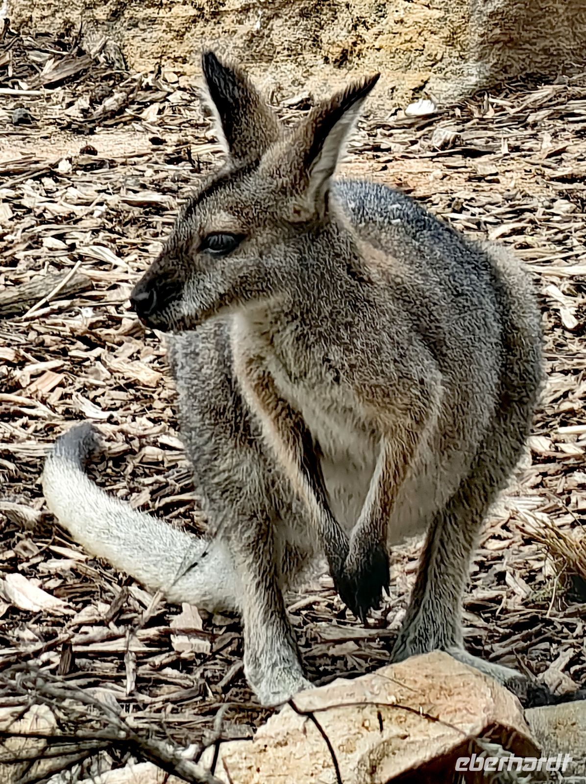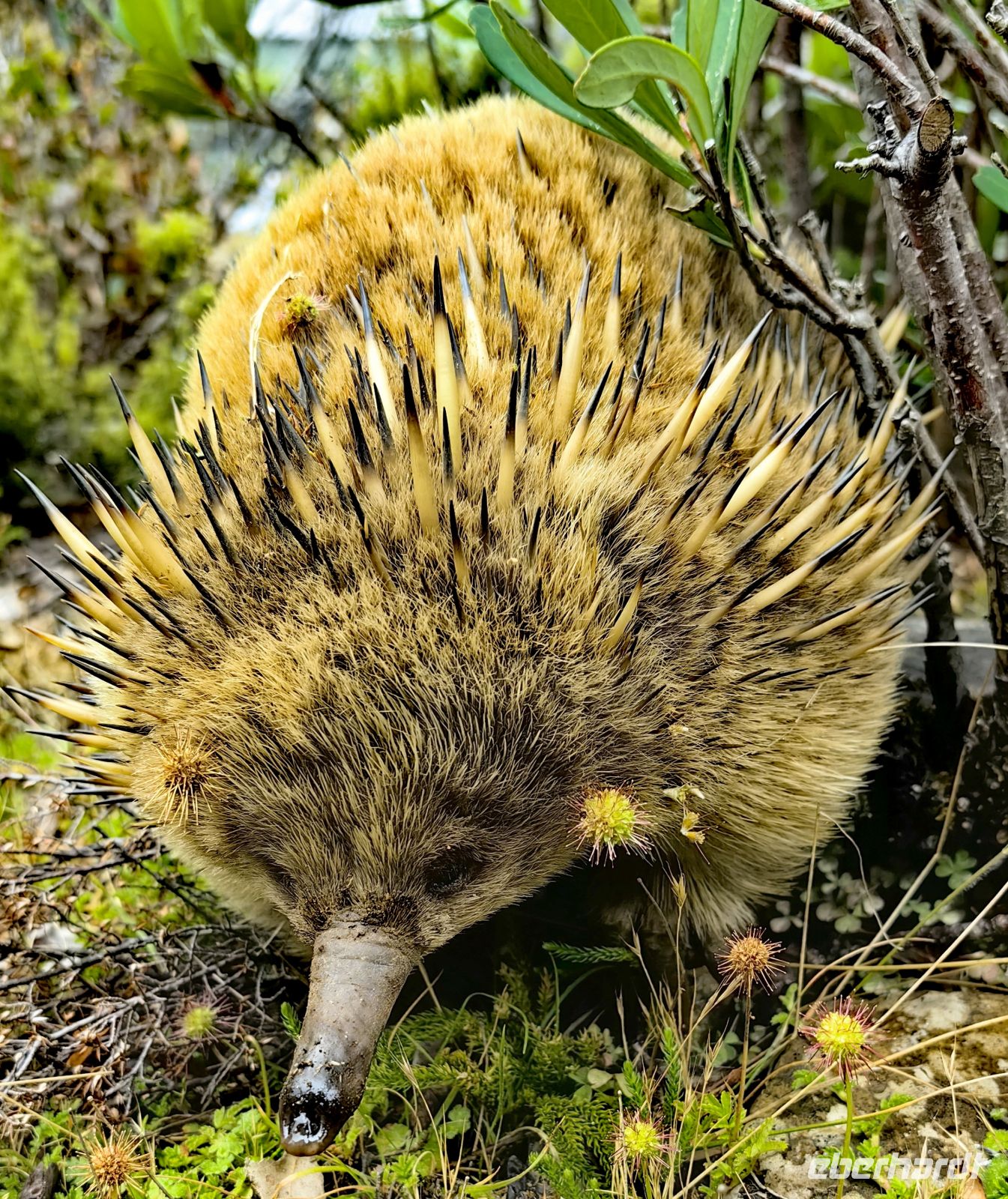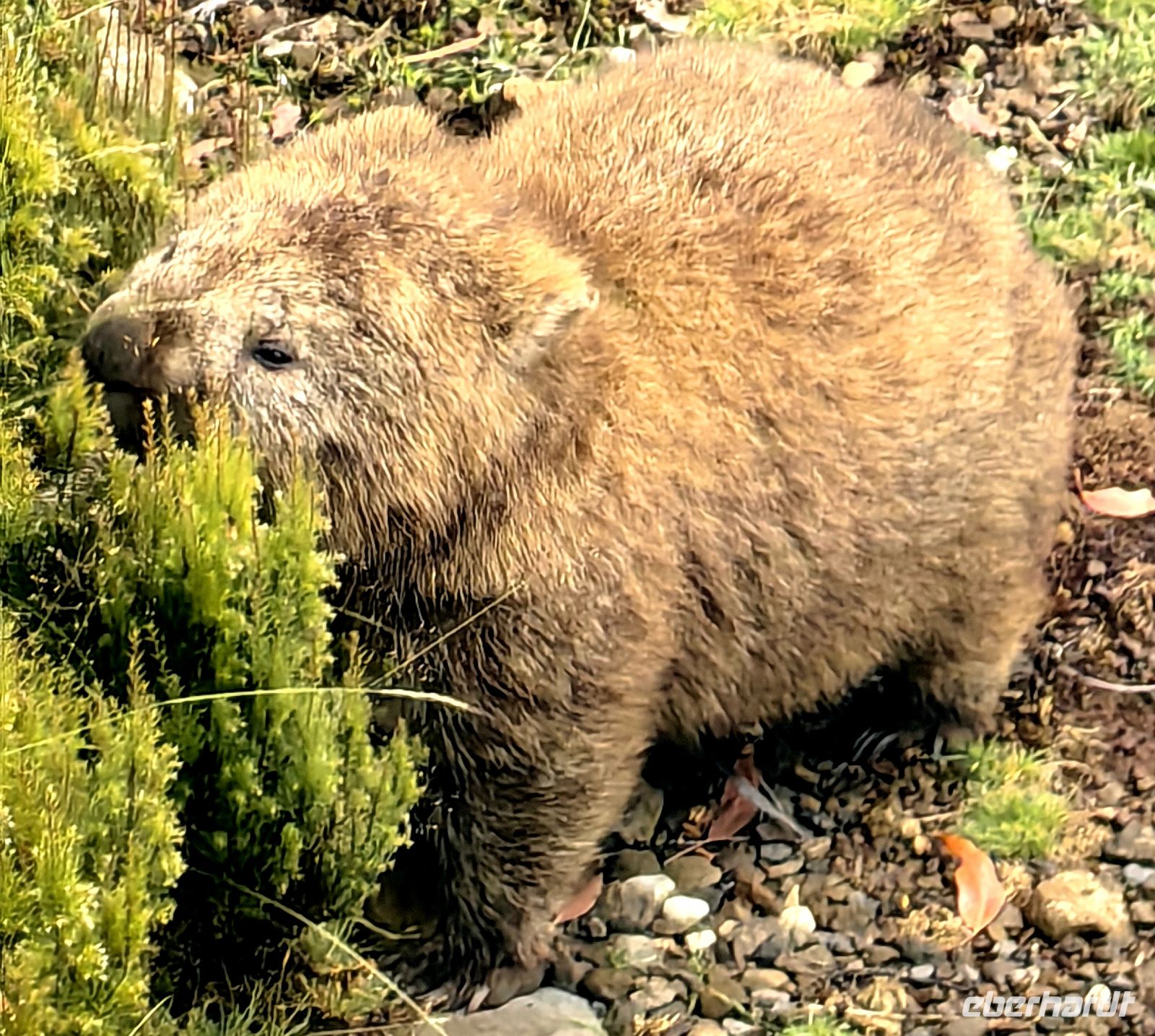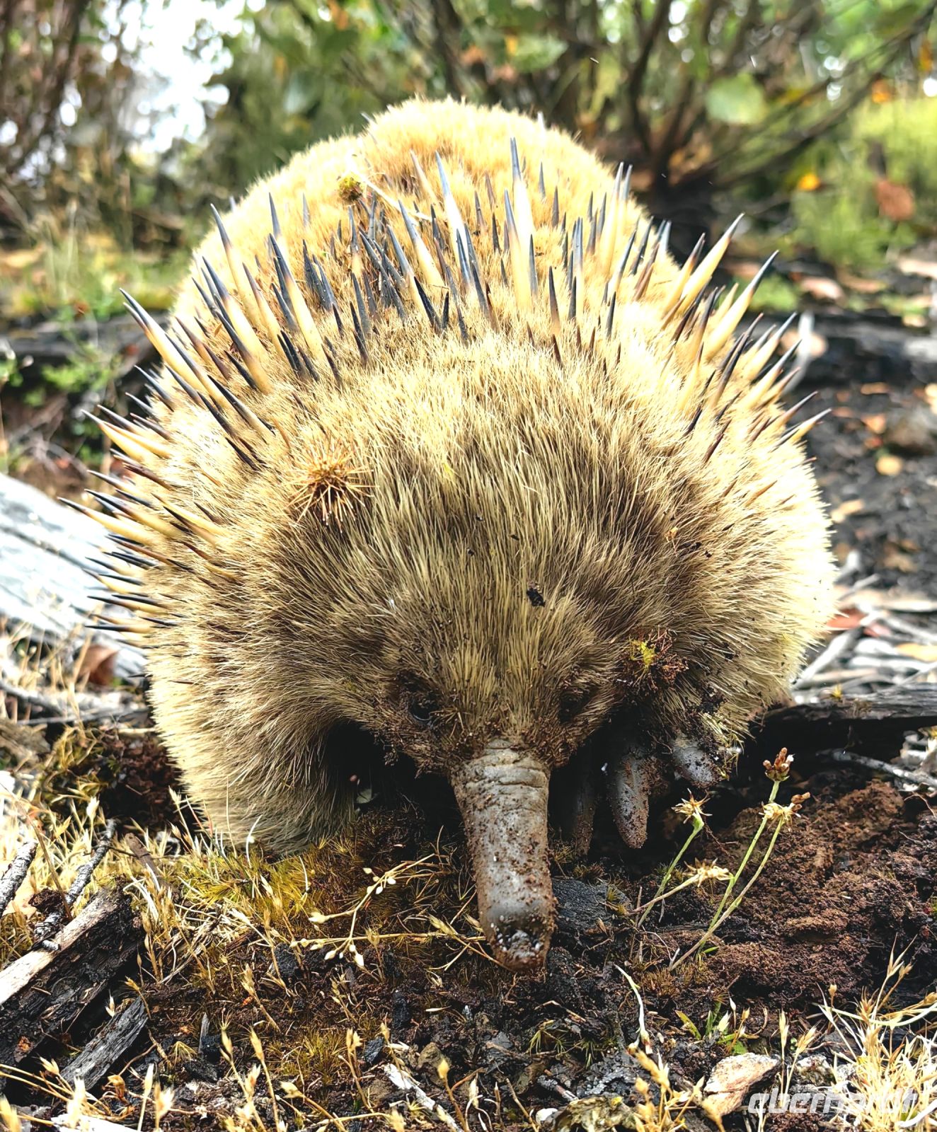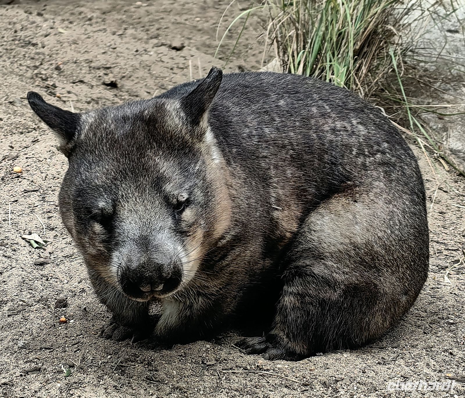 Als wir gerade beim Mittagessen sitzen, kommt ganz gemächlich ein pelziges Wombat angelaufen und läßt es sich ebenfalls an einem Busch schmecken. Wir springen alle ganz aufgeregt an die Restaurantfenster und machen Fotos. Nach dem Essen gehen wir in die Galerie hinüber und direkt vor dem Eingang sucht ein Kurzschnabeligel nach Ameisen und läßt sich durch uns überhaupt nicht stören. Dieser putzige Gesell ist nur in Australien und Tasmanien beheimatet.