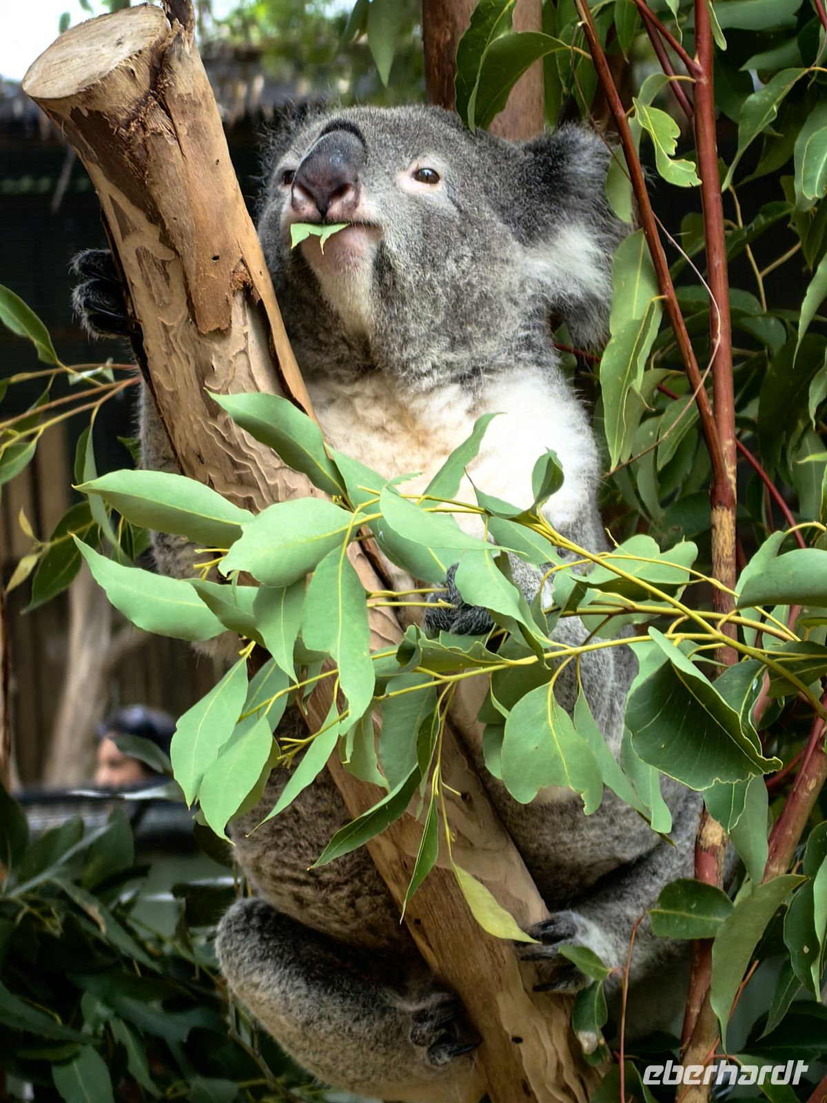 Nachdem wir mit Blick auf die fantastische Kulisse ein leckeres Rinderfilet verspeist haben, steht noch der Besuch des Featherdale Wildlife Parks an. Hier kann man nahezu alle in Australien heimischen Tiere aus nächster Nähe beobachten einige sogar füttern. Kurz nach dem Eingang kommen schon die kleinen Wallabys angehoppelt und freuen sich über die ausgestreckten Hände mit dem Futter. Der Wombat sitzt vor uns uns labt sich an frischem Gras. In den Ästen hängen die zuckersüßen Koalas und kauen auf ihrer Lieblingsnahrung, den Blättern des Eukalyptusbaumes, herum. Ein schwarzer Riesenkakadu gibt eine Gesangsprobe, die ohrenbetäubend laut ist und nur noch vom Lachenden Hans, einem großen Eisvogel, an Lautstärke übertroffen wird. Im Reptilienhaus sehen wir Warane, Echsen und Schlangen. Dahinter bekommen die Kängurus gerade ihr Futter, der Kurzschnabeligel läuft aufgeregt in seinem Gehege umher, er ist erst nach den Kängurus mit dem Futter an der Reihe. Da schauen die dahinter stehenden Emus noch etwas neidisch drein und der Tasmanische Teufel zeigt seine Zähne und gähnt erstmal. Dieser Besuch ist faszinierend und wir hätten dort noch viel länger verbringen können, so unglaublich finden wir es, daß wir all diese Tiere zu Gesicht bekommen. Unser Busfahrer allerdings wartet auf seinen verdienten Feierabend und gemeinsam mit Reiseleiterin Conny fahren wir zurück nach Sydney.