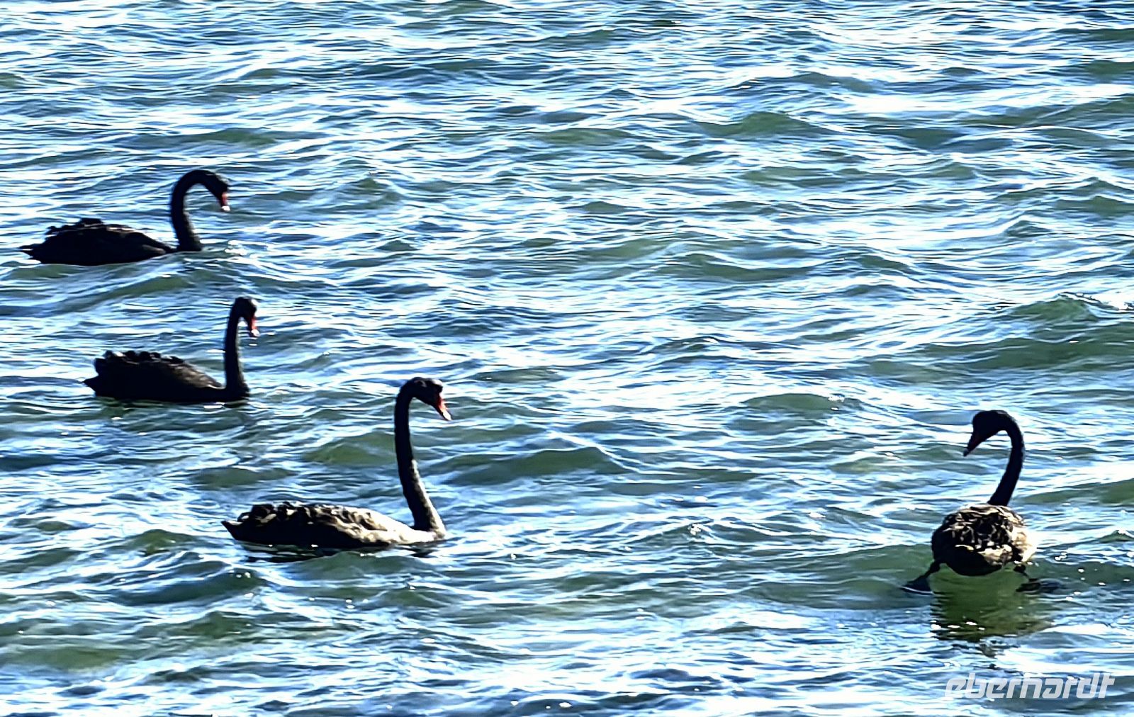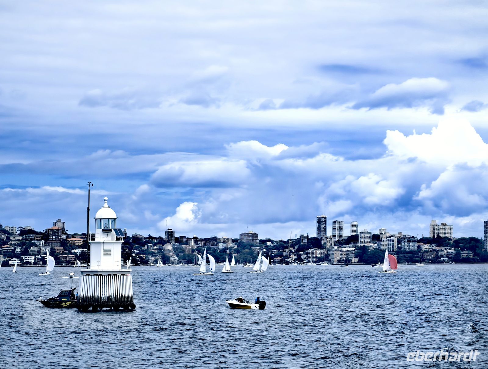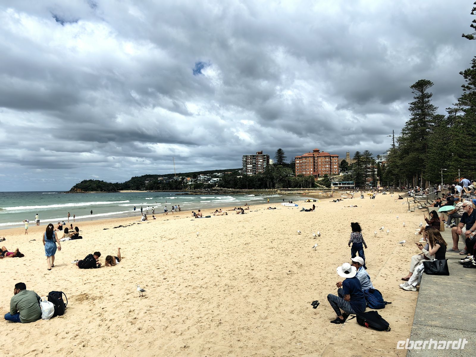 Danach fahren wir mit der Fähre hinüber nach Manly, wo die Einwohner der Stadt gern das Wochenende verbringen und am Strand das Leben genießen. Das Flair dort ist ähnlich dem eines Seebades an Ost- oder Nordseeküste. Die kleine Hauptstraße ist rechts und links gesäumt von Lädchen, die alle Arten von Meeresfrüchten und Fisch anbieten, Cafés locken mit Terrassen und Meeresblick. In der Mitte findet gerade der Samstagsmarkt statt und die Straßenmusiker finden begeistertes Publikum. Wir hocken uns an die Strandtreppen mit den erstandenen Meeresfrüchten, müssen diese aber nun gegen die gierigen Möwen verteidigen. Was für ein Anblick: langer puderzuckerfeiner Sandstrand, plätschernde Wellen und Wochenendpublikum. Das könnte ewig so weitergehen ...