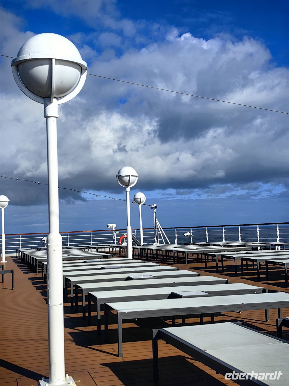 Durch eine weitere Stunde Zeitverschiebung müssen wir am Morgen eher aufstehen. Nun trennen uns zu Deutschland ganze elf Stunden. Mittlerweile sind wir mitten in der Tasmanischen See angekommen und das Schiff schwankt merklich. Zum Glück ist uns das Wetter weiterhin hold, so daß einem Frühstück in der Sonne nichts im Wege steht. Wir genießen einen weiteren Seetag.