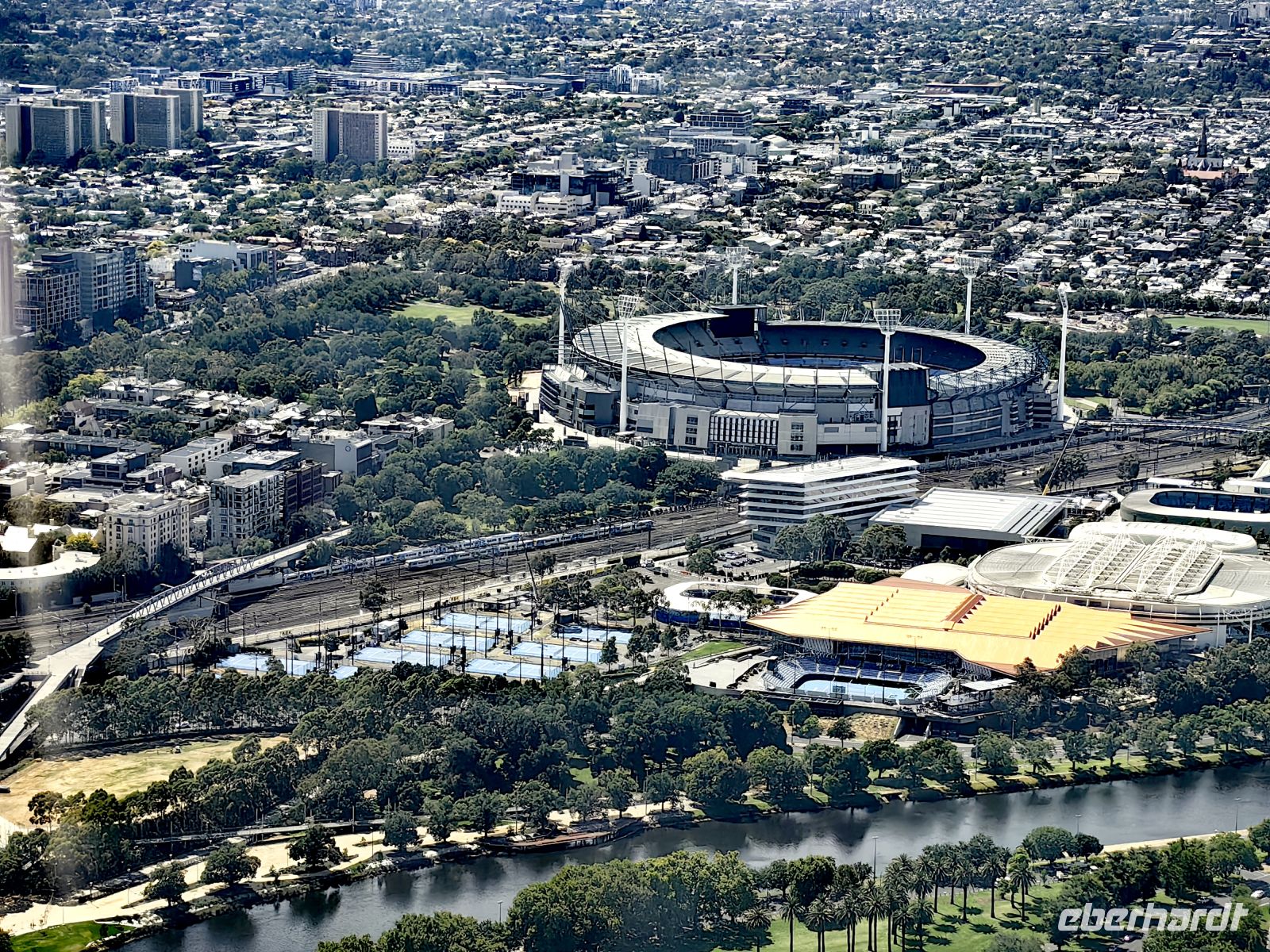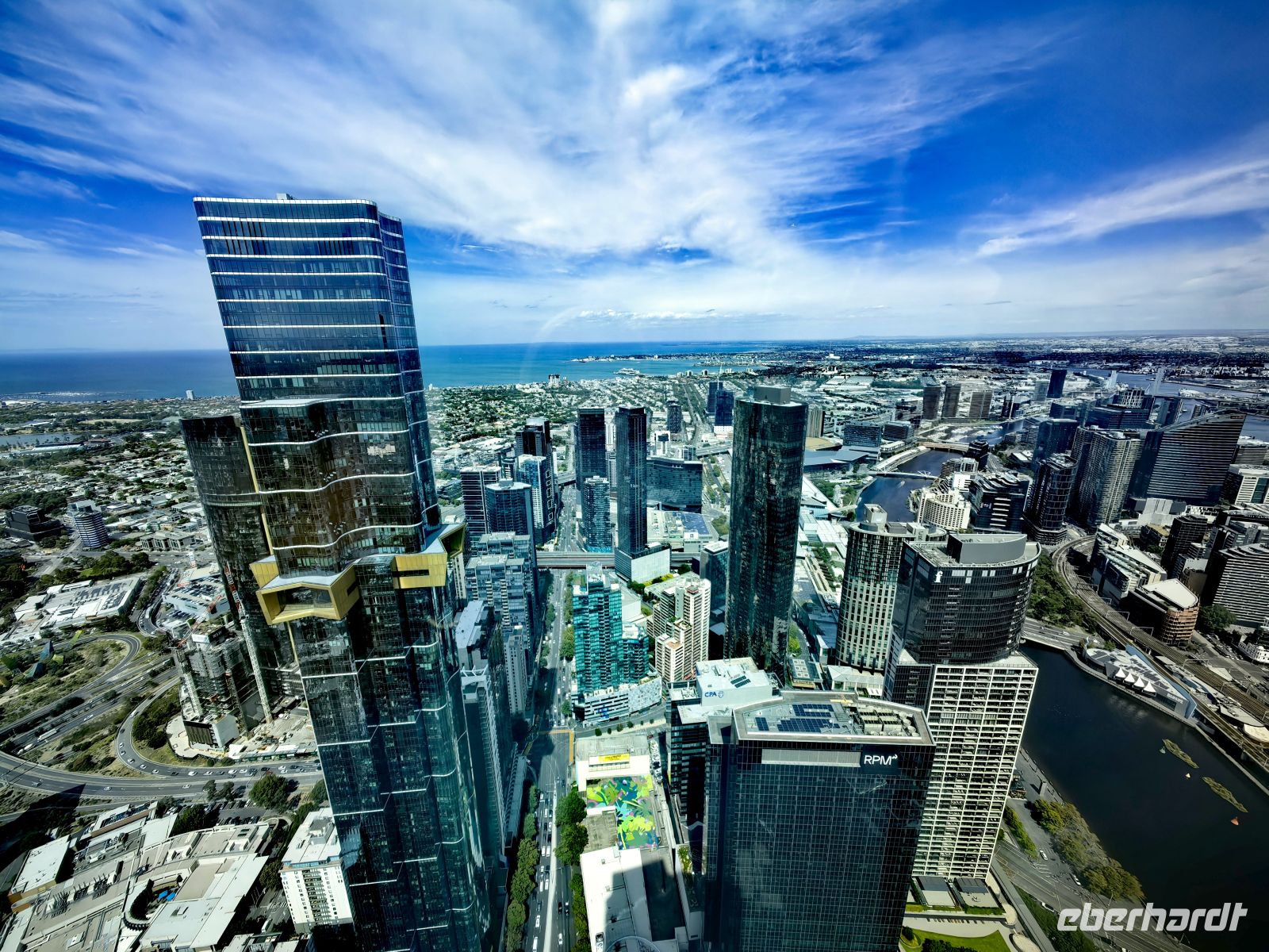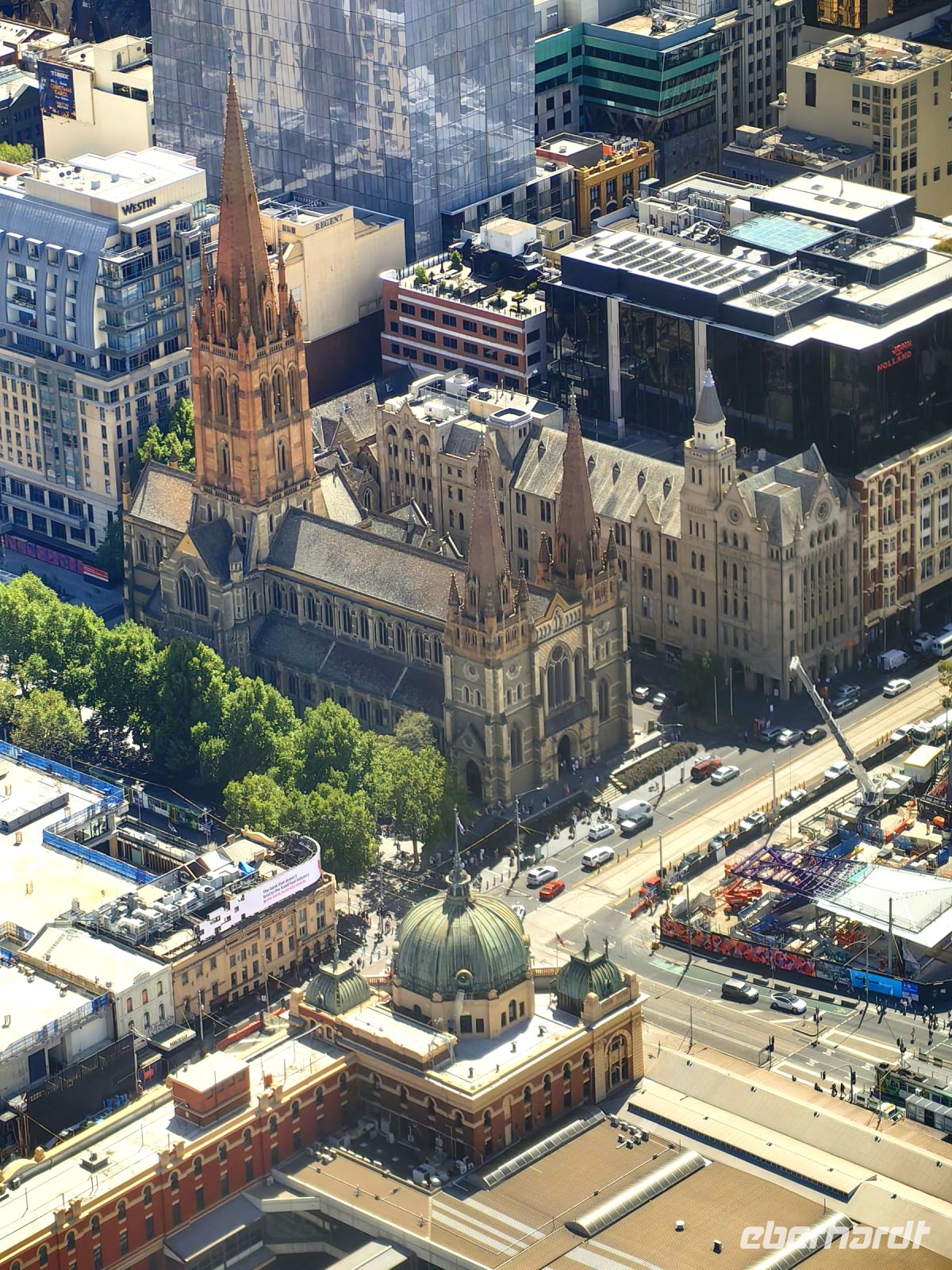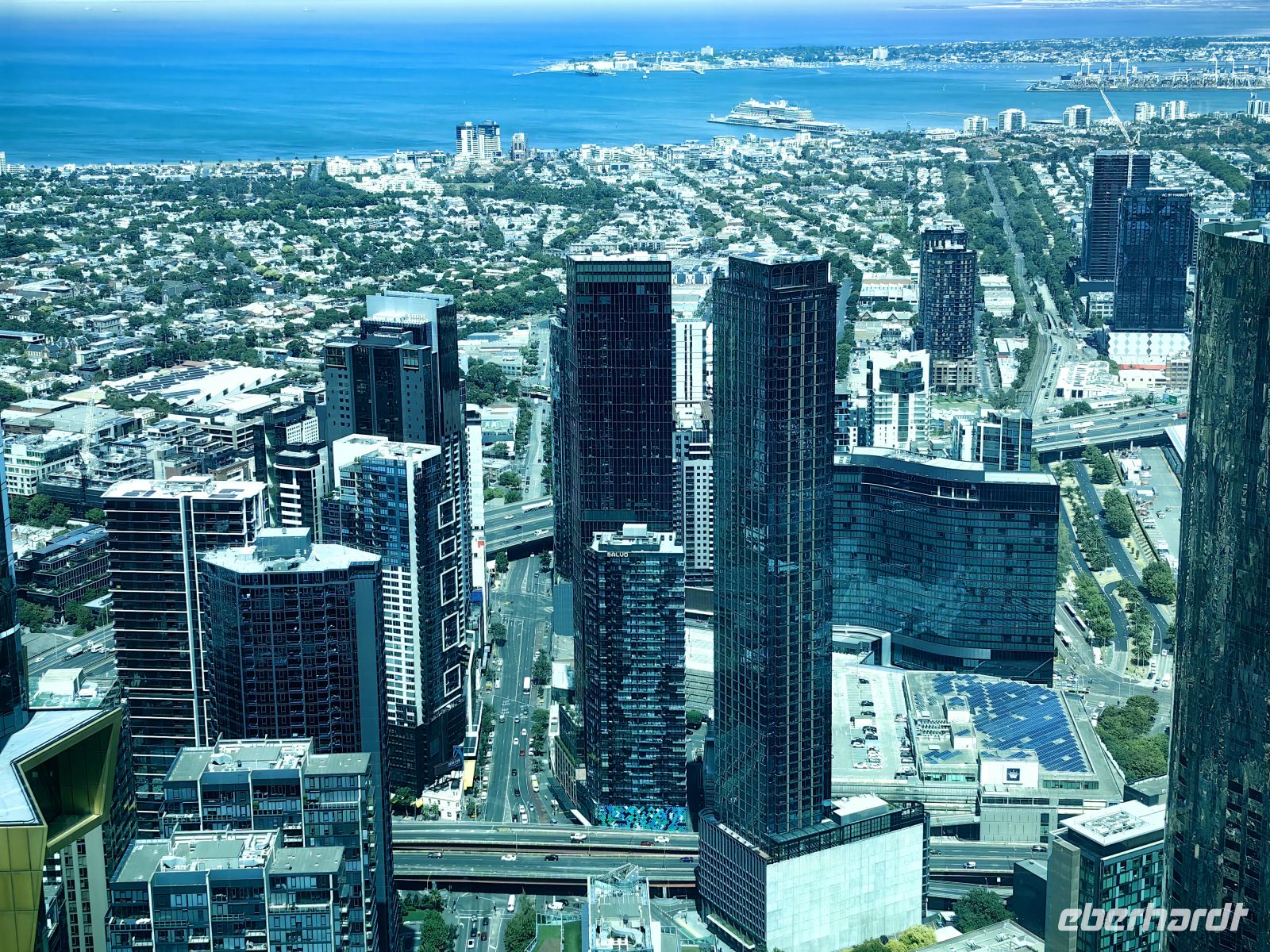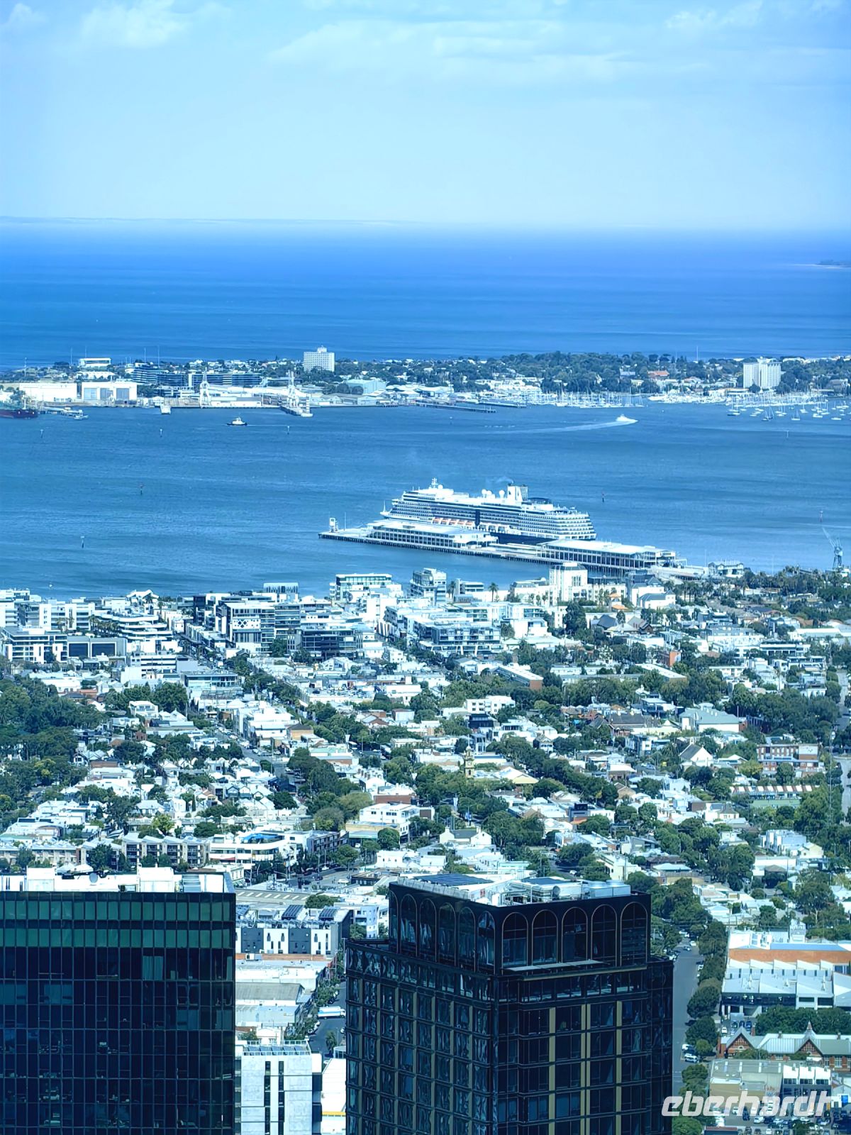 Wir haben Glück mit dem Wetter, der Himmel ist klar - so steht der Auffahrt auf das berühmte Skydeck im 88. Stock des 297 Meter hohen Eureka Towers nichts im Weg. Mit dem Fahrstuhl schweben wir im Nu hinauf und haben einen gigantischen Rundumblick über die ganze Stadt. Wir entdecken die Spielstädte der Australien Open, sehen im Hafen in der Ferne unser Kreuzfahrtschiff liegen, erblicken die katholische Kathedrale, den alten Bahnhof und das Fußballstadion.