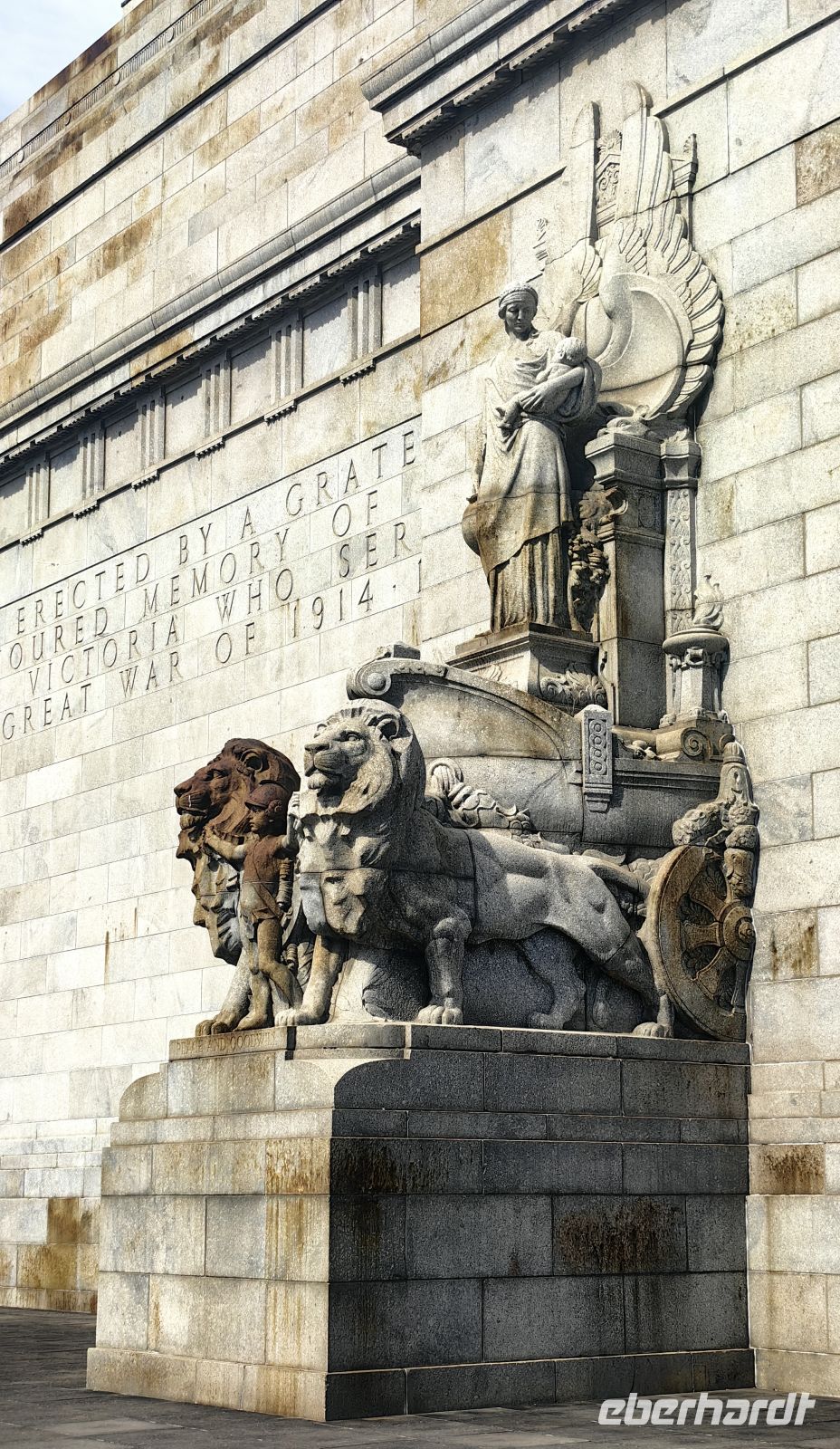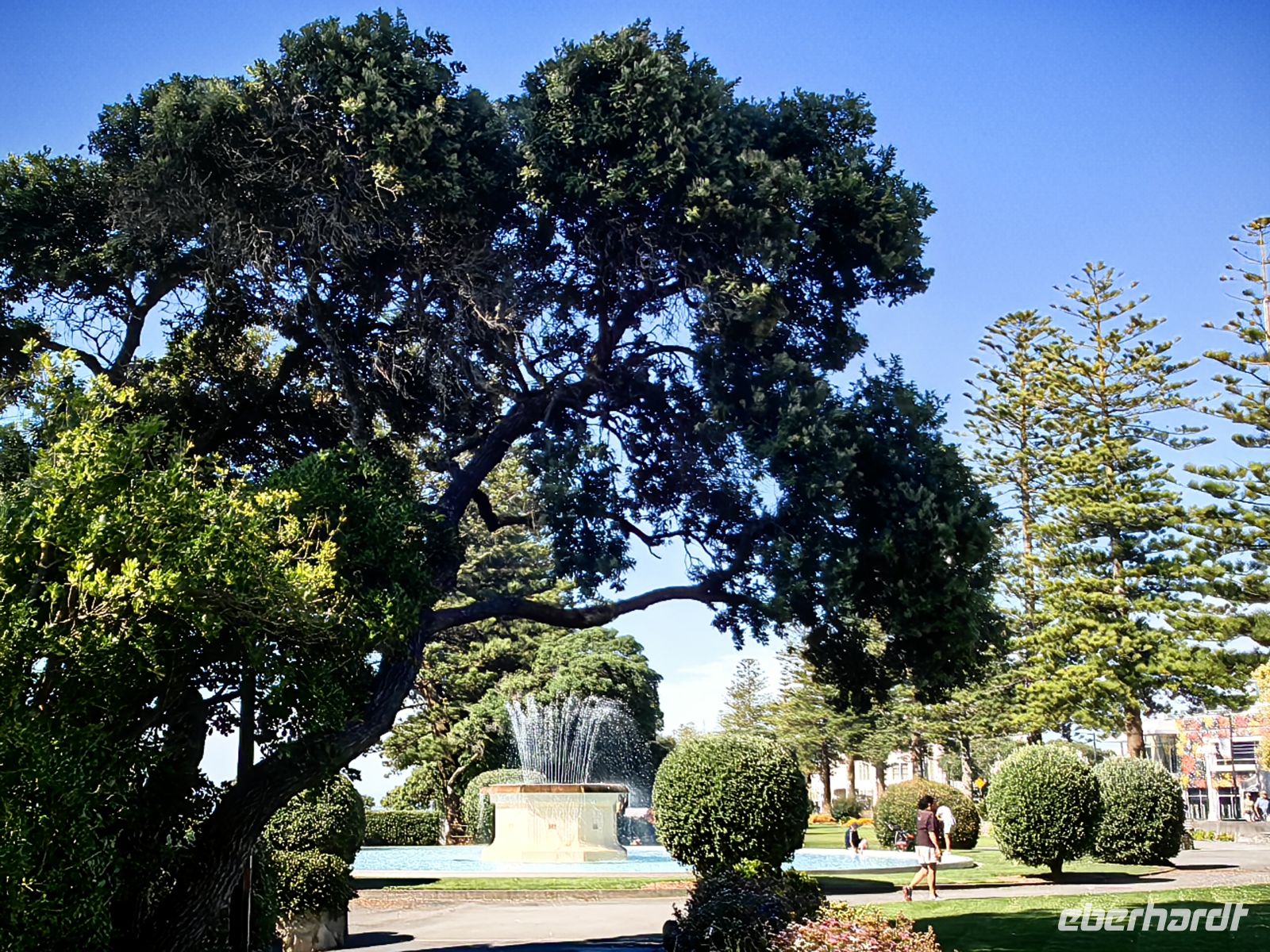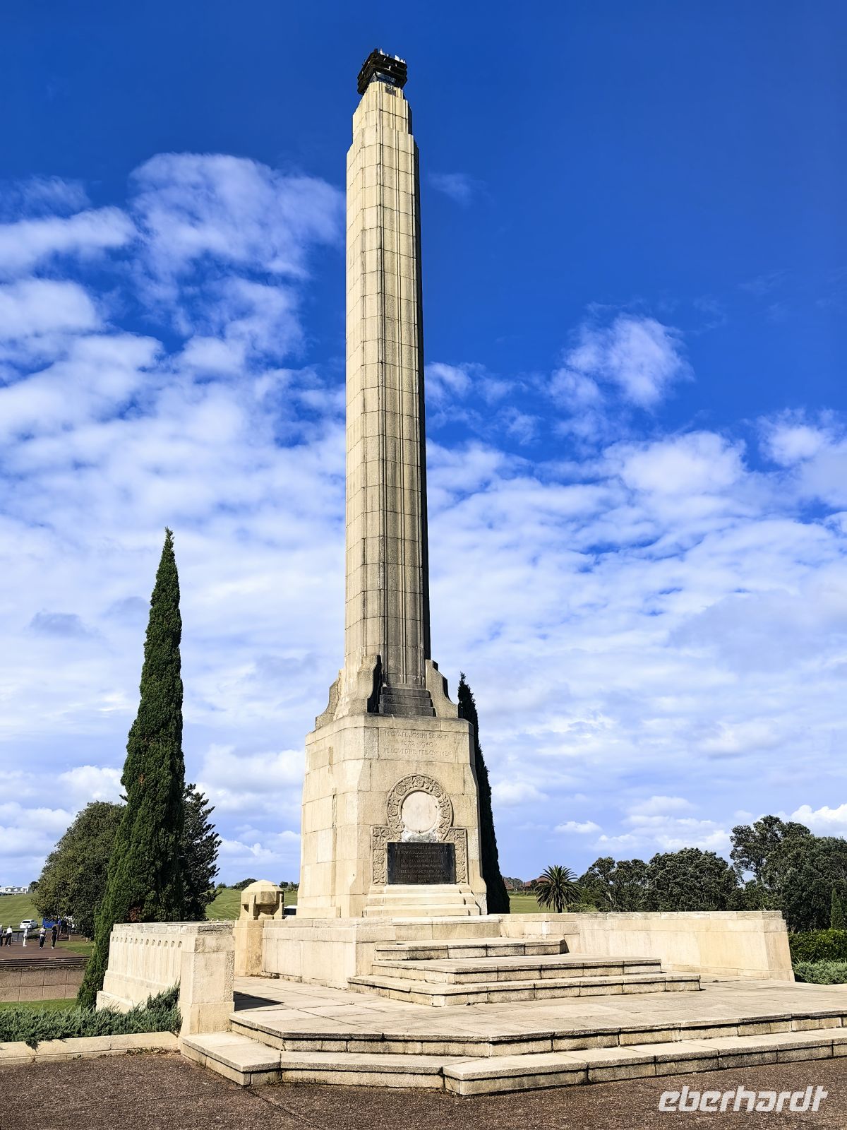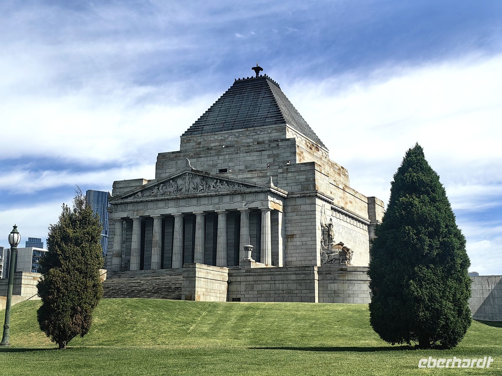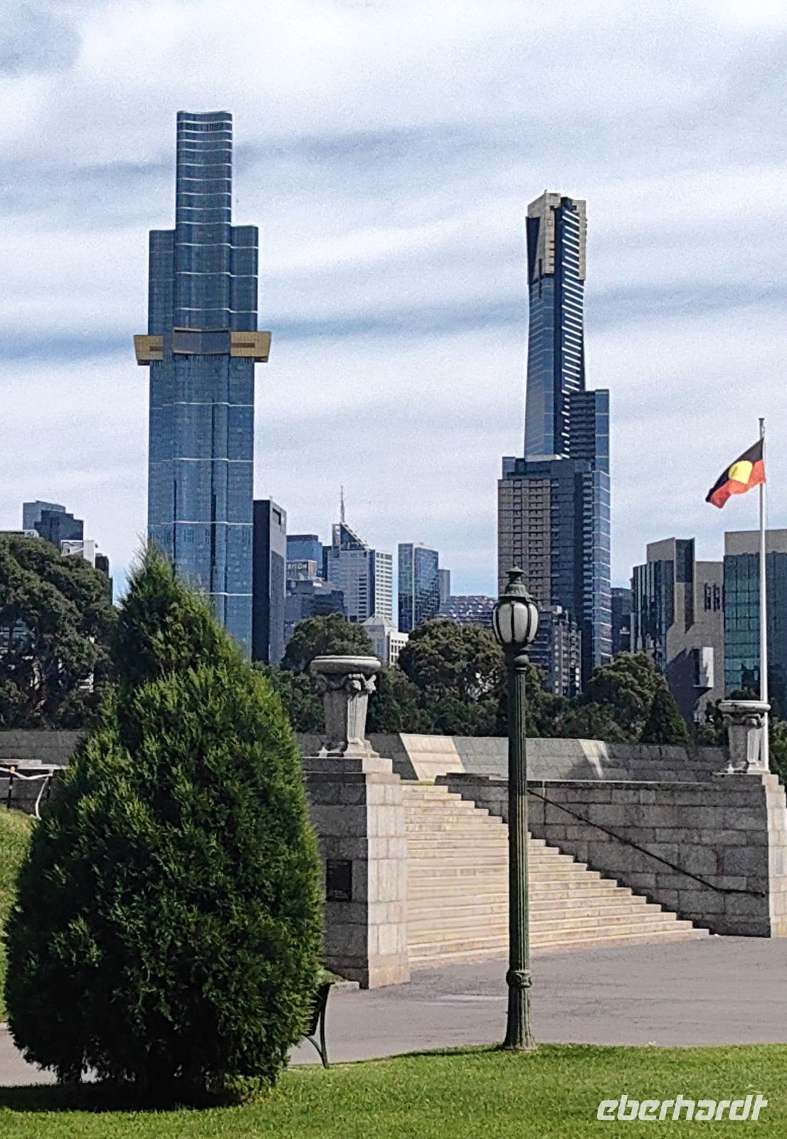 Wir gehen an Land, treffen Rosemary und fahren am Hafen und dem Stadtstrand entlang zum Shrine of Rememberance. Hierbei handelt es ich um ein Kriegsdenkmal, das 1918 zu Ehren der Männer und Frauen aus Victoria errichtet wurde, die im Ersten Weltkrieg gedient haben. Im Laufe der Zeit wurde die Gedenkstätte um andere Kriege erweitert, an denen die Bürger Victorias beteiligt waren. Um den gewaltigen Bau herum liegt ein wunderschön angelegter öffentlicher Garten in dem riesige Eukalyptusbäume, Australische Eichen und Opuntien Schatten spenden. Als kleine Hecken begrenzen Aloe Vera die Wege durch den Park. Von den Stufen des Schreins hat man eine fantastische Sicht auf die Skyline von Melbourne.