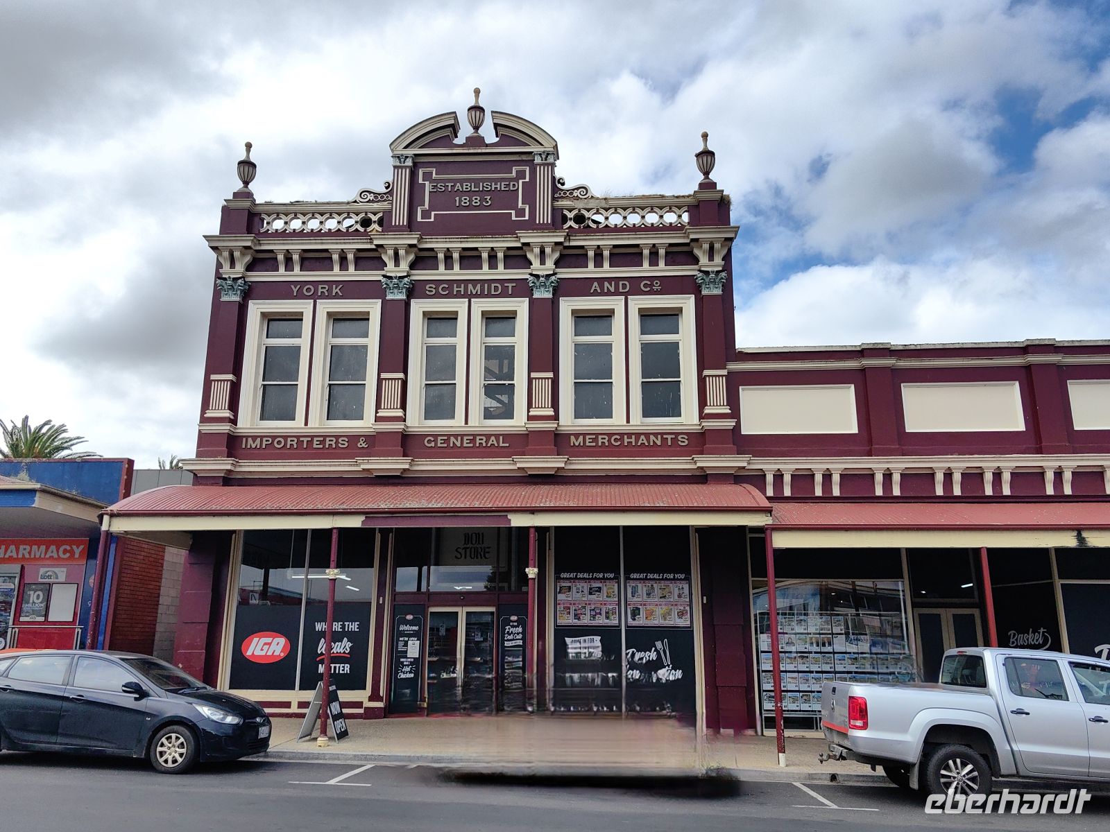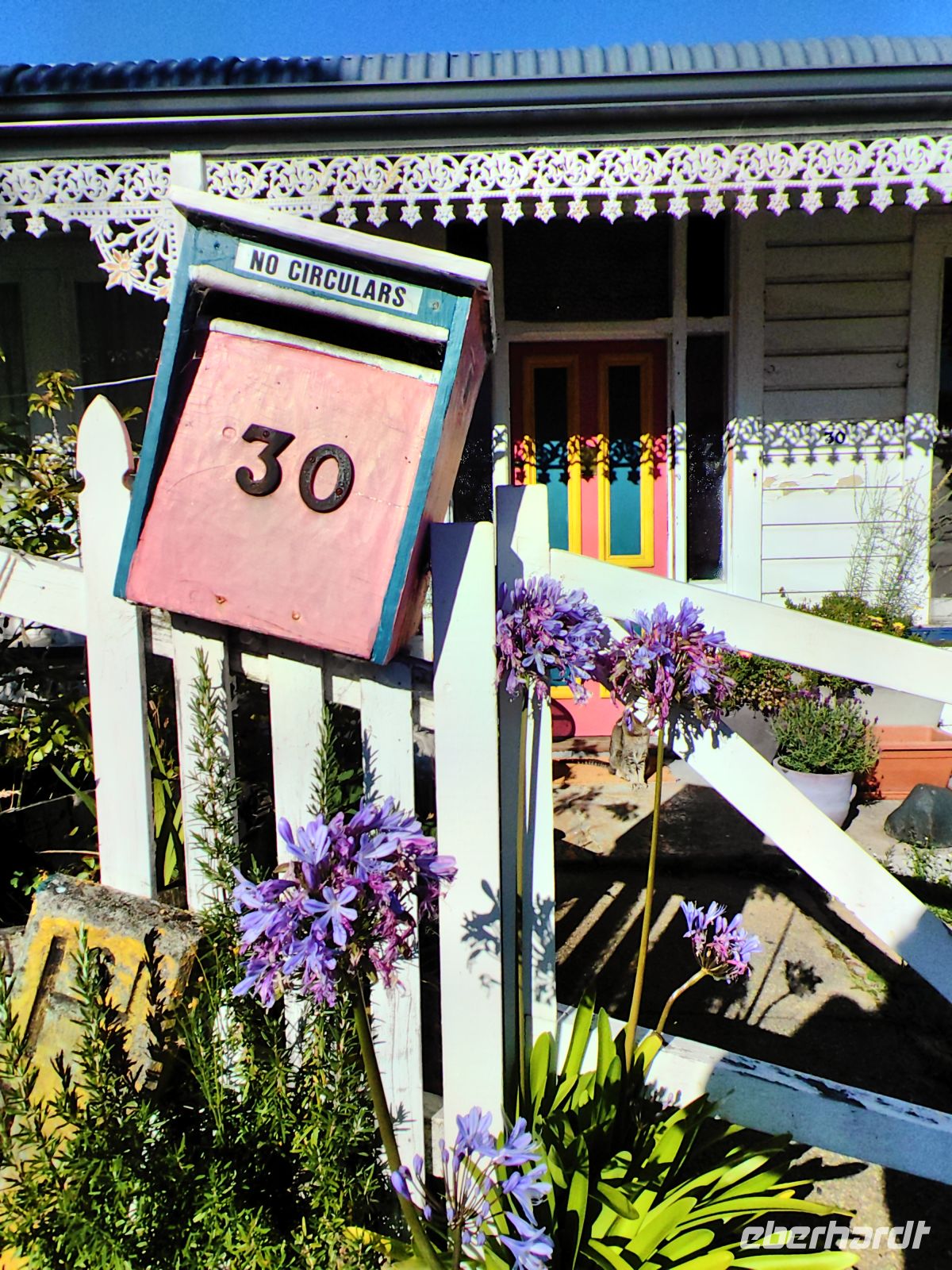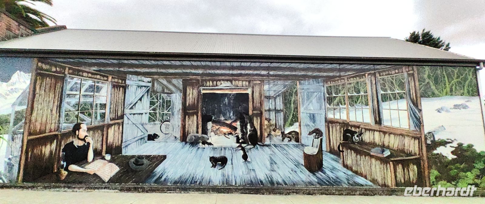 Nachdem wir noch das Verkehrsschild mit dem Wallaby fotografiert haben, verlassen wir am Nachmittag den Park und fahren in Richtung Küste zurück. In Sheffield machen wir noch eine Pause. Hier hat man versucht, diesem kleinen Ort eine Attraktion zu verschaffen und begann 1986, Hauswände mit großformatigen Gemälden zu verzieren. Mittlerweile gibt es fast fünfzig Wandbilder. Wir schauen uns einige von ihnen an, besonders schön anzusehen ist die bunt bemalte Kirche. Mit vielen schönen Eindrücken, aber immer noch fröstelnd, kehren wir abends zum Schiff zurück, genießen ein hervorragendes Abendessen und freuen uns nun auf ein paar erholsame Tage auf See ...