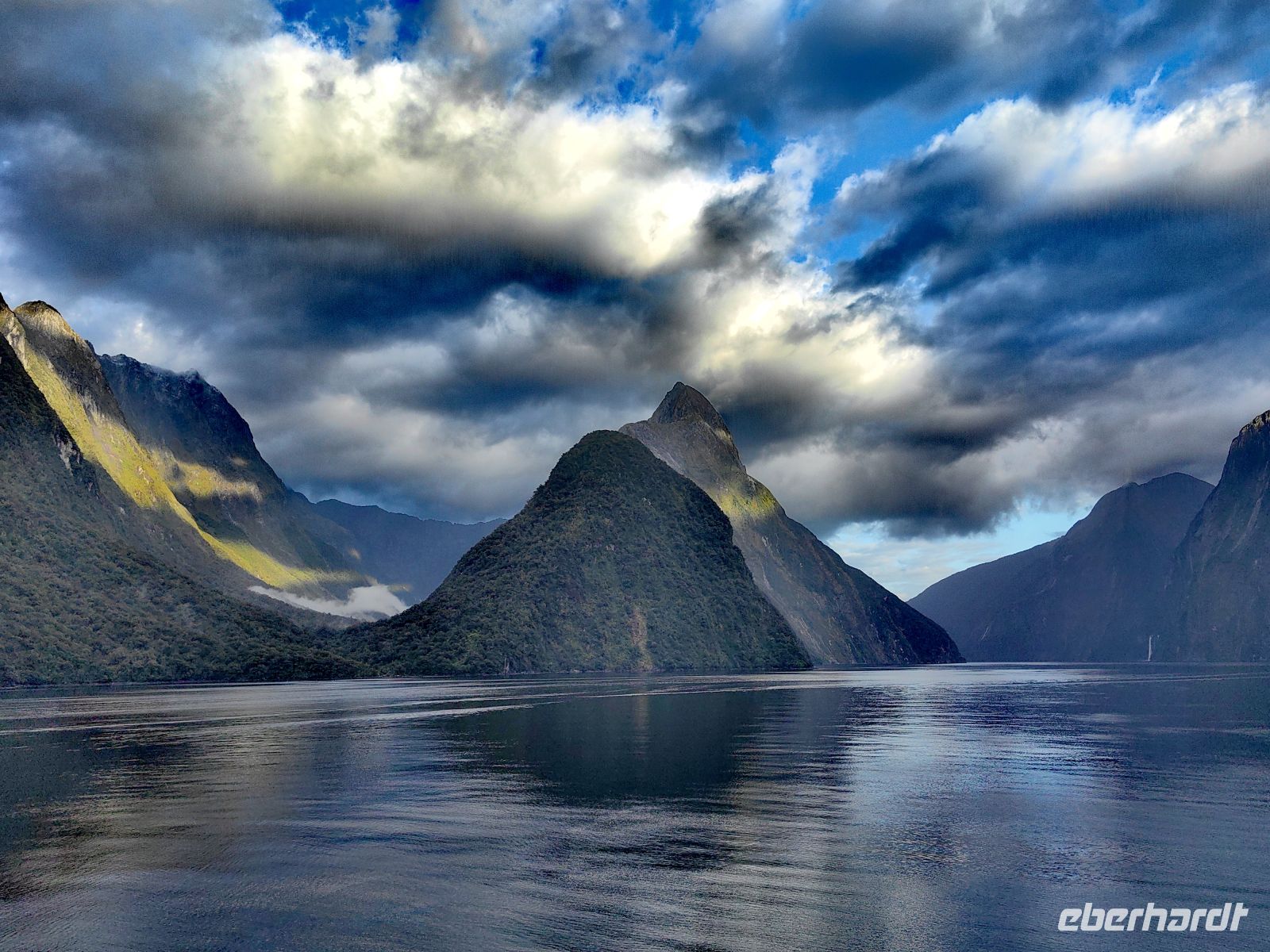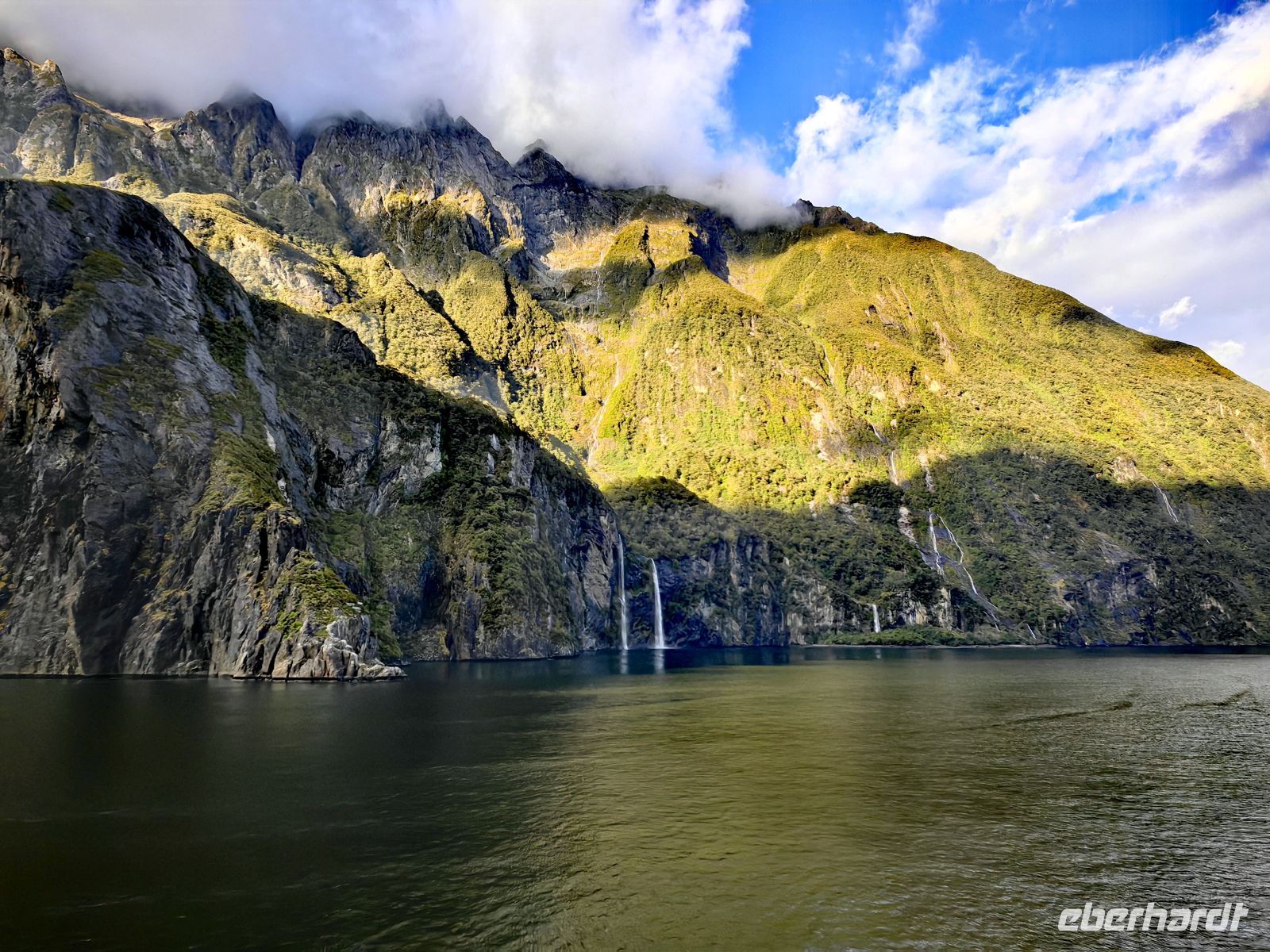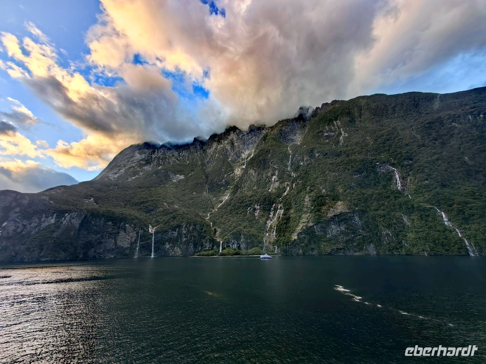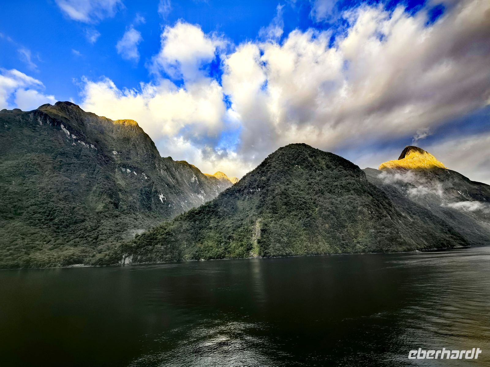 Am ganz frühen Morgen erreichen wir die Küste Neuseelands und fahren in den Fjordland Nationalpark. Eine spektakuläre Landschaft erwartet uns. Der bekannteste Abschnitt des Parks ist mit Sicherheit der Milford Sound. Diese einzigartige Fjordlandschaft liegt im Südwesten der Südinsel Neuseelands etwa 15 Kilometer von der Tasmanischen See entfernt. Der Fjordland Nationalpark wurde 1952 gegründet und gehört zum UNESCO Weltnaturerbe. Hier findet man eine einzigartige, teilweise vom Aussterben bedrohte Flora und Fauna. Früh eilen wir auf die Außendecks, um gute Plätze zu ergattern und fahren beim Morgengrauen an den ariden Bergurwäldern vorbei und sehen über ihnen immer wieder die Bergriesen aus den dichten Wolken herausragen. Ein mystischer Anblick.