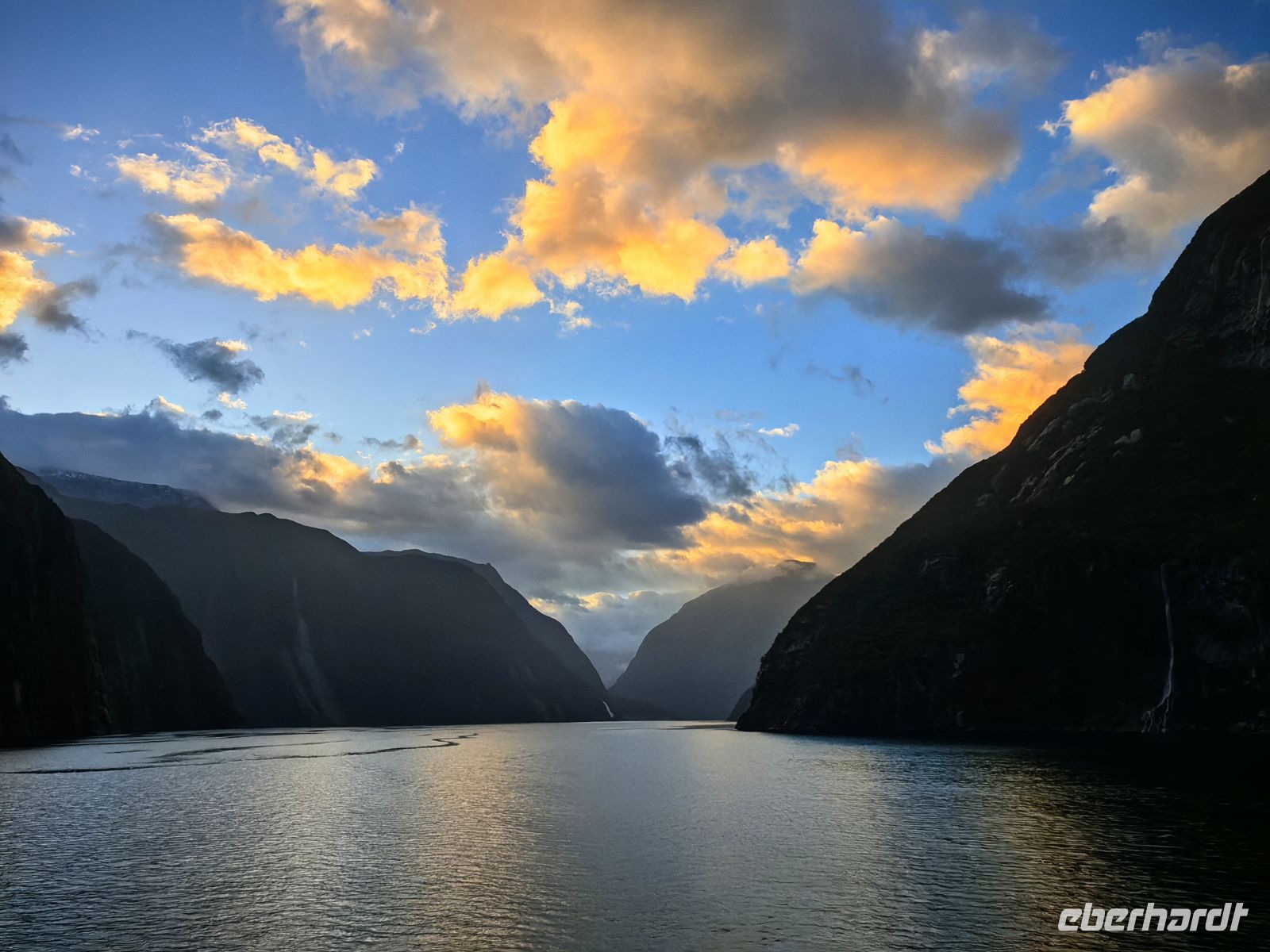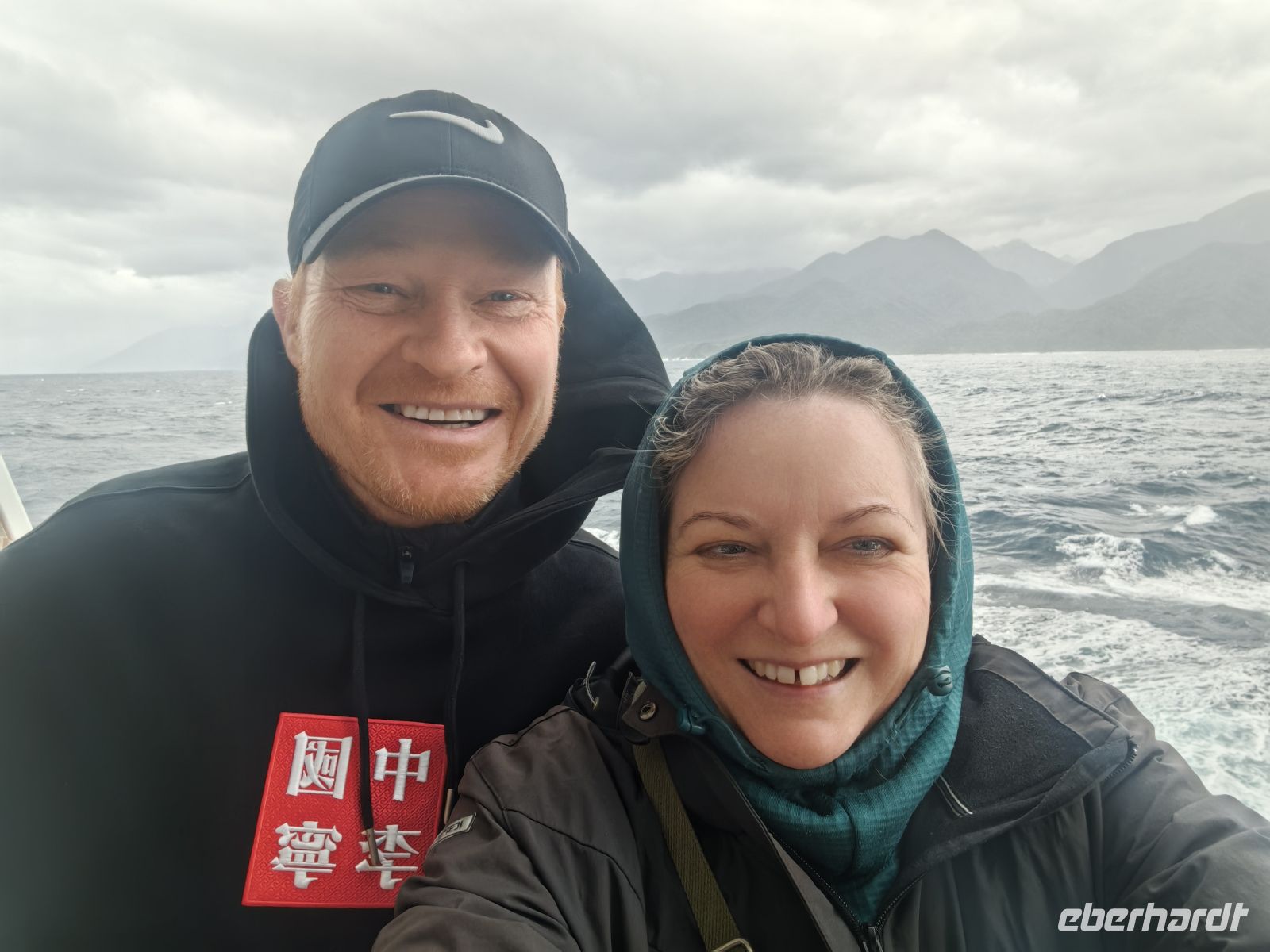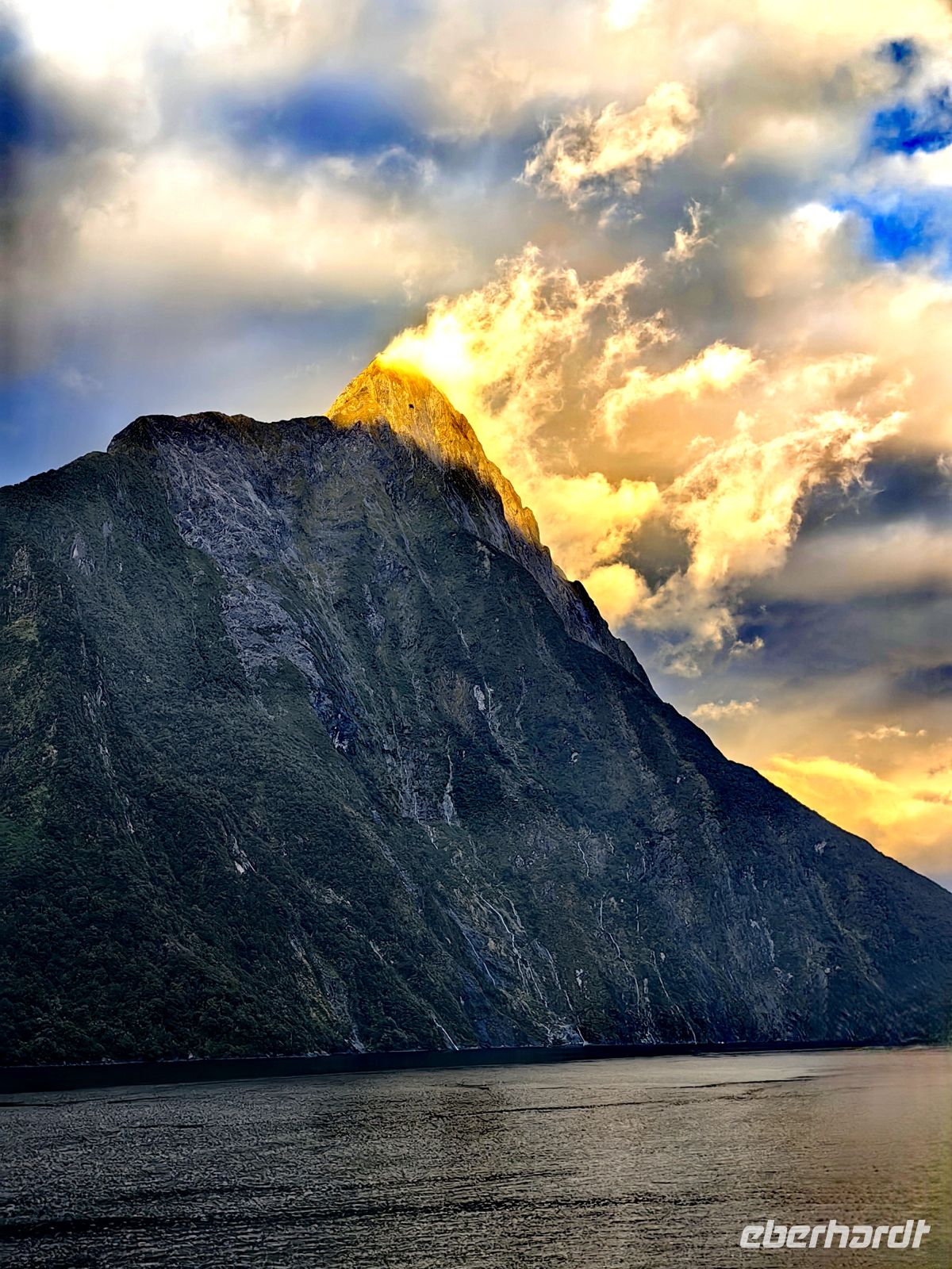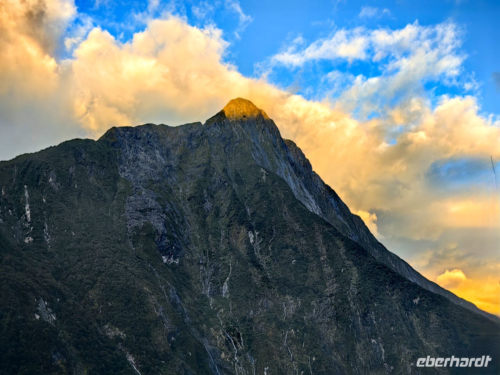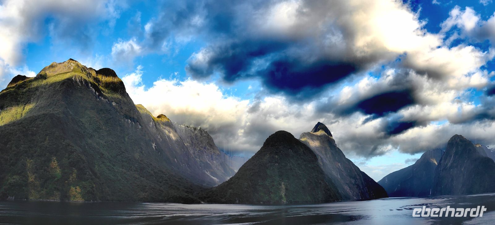 Am ganz frühen Morgen erreichen wir die Küste Neuseelands und fahren in den Fjordland Nationalpark. Eine spektakuläre Landschaft erwartet uns. Der bekannteste Abschnitt des Parks ist mit Sicherheit der Milford Sound. Diese einzigartige Fjordlandschaft liegt im Südwesten der Südinsel Neuseelands etwa 15 Kilometer von der Tasmanischen See entfernt. Der Fjordland Nationalpark wurde 1952 gegründet und gehört zum UNESCO Weltnaturerbe. Hier findet man eine einzigartige, teilweise vom Aussterben bedrohte Flora und Fauna. Früh eilen wir auf die Außendecks, um gute Plätze zu ergattern und fahren beim Morgengrauen an den ariden Bergurwäldern vorbei und sehen über ihnen immer wieder die Bergriesen aus den dichten Wolken herausragen. Ein mystischer Anblick.