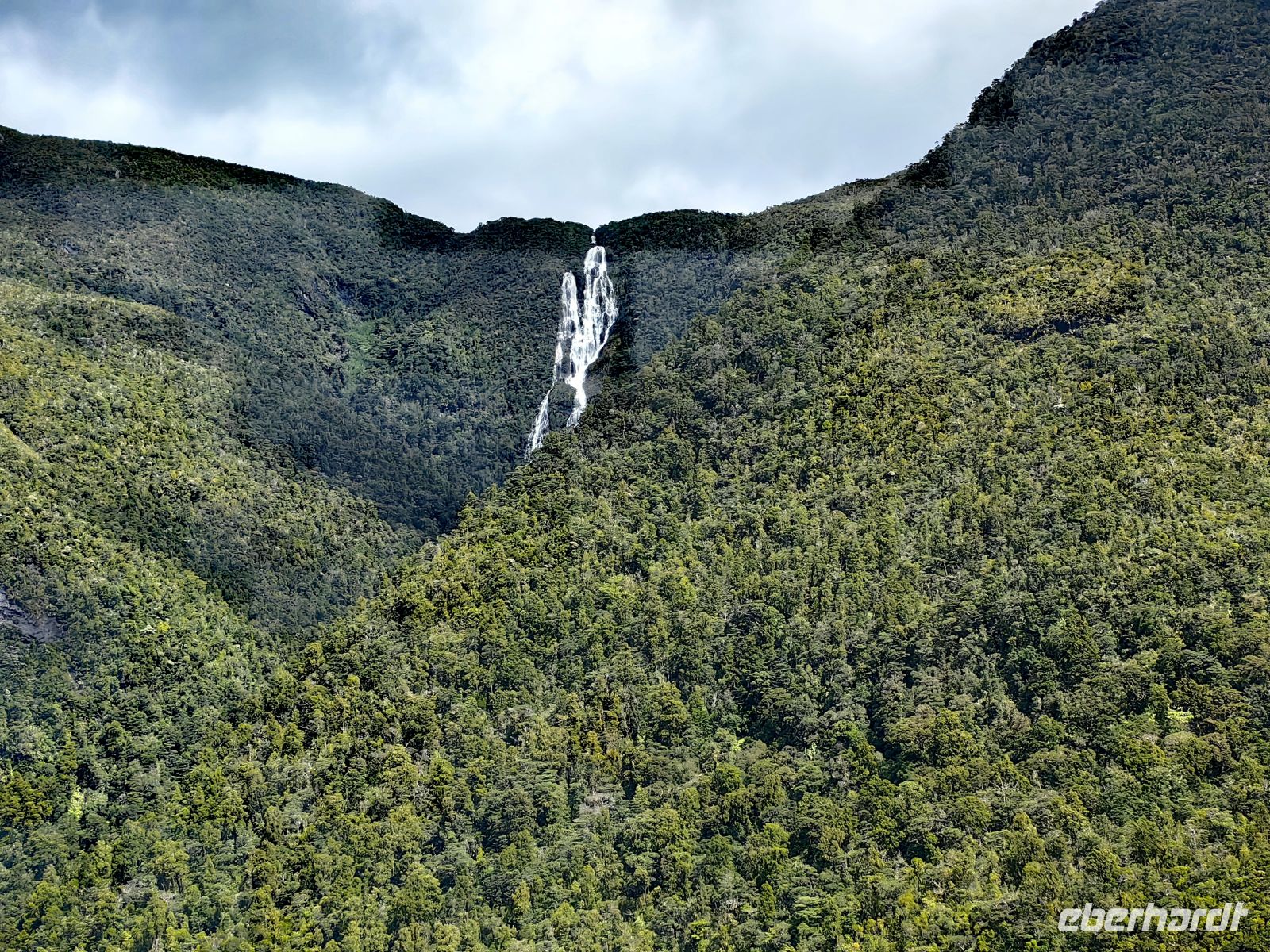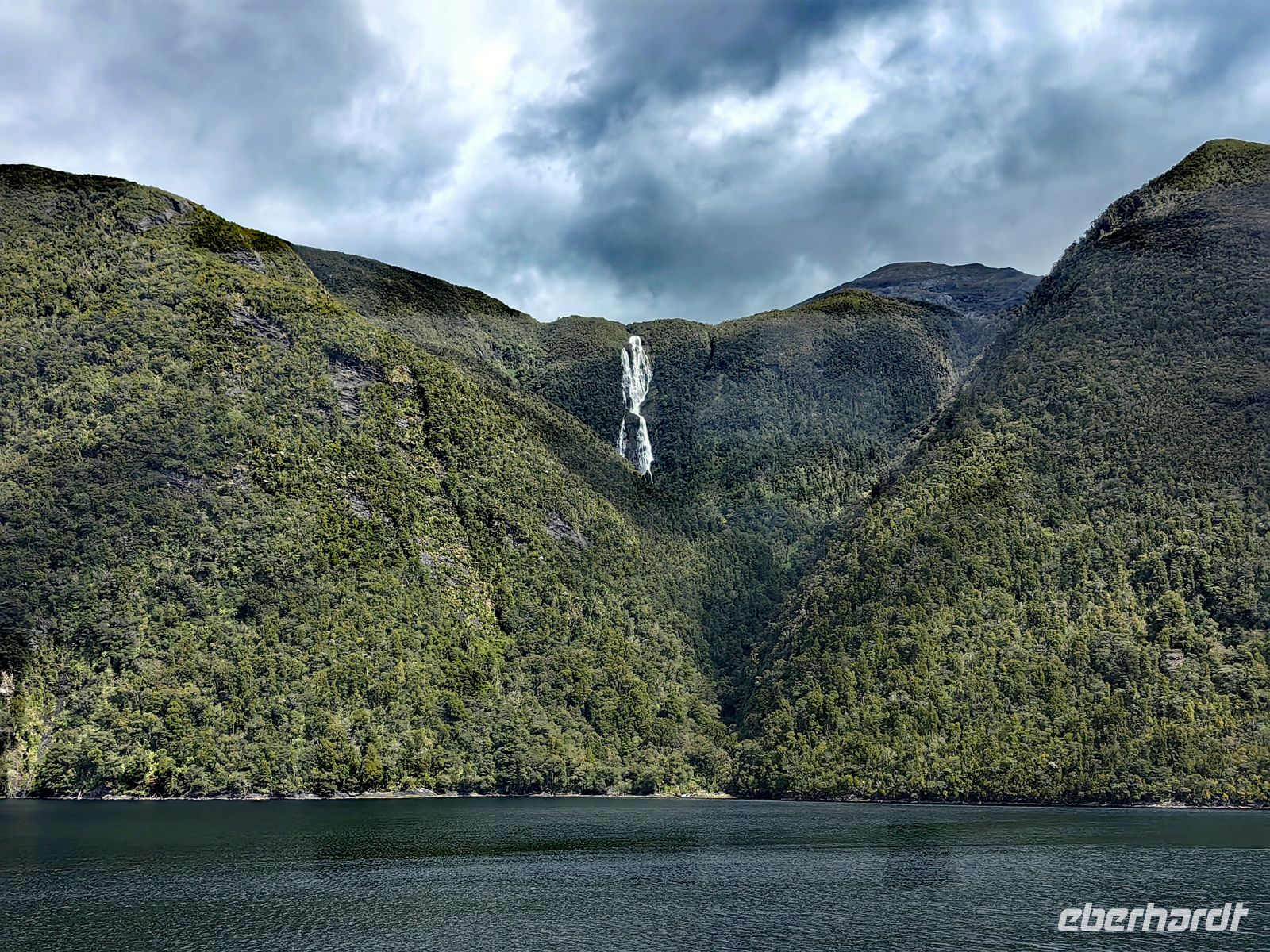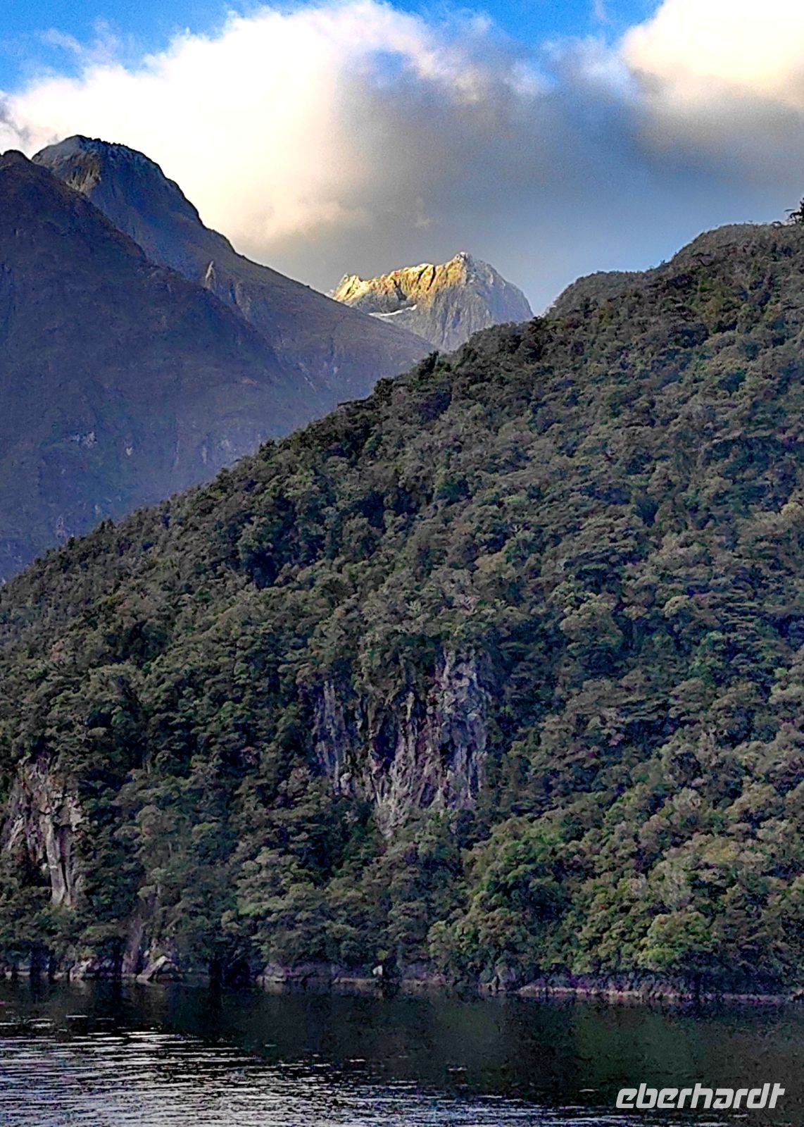Wir trotzen dem Wind auf den Außendecks und den geringen Temperaturen und fahren an den Wasserfällen Lady Bowen und Stirling vorbei. Langsam ziehen die morgendlichen Nebelschwaden hinauf, die Bergspitzen kommen zum Vorschein und glänzen fast golden in der Sonne. Es ist wirklich ein ganz einmaliges Erlebnis, und wir geraten ins Schwärmen. Als wir uns am Hafen drehen, sehen wir neben uns eine Robbe, die sich gähnend zur Seite legt und neugierig zu uns heraufschaut.