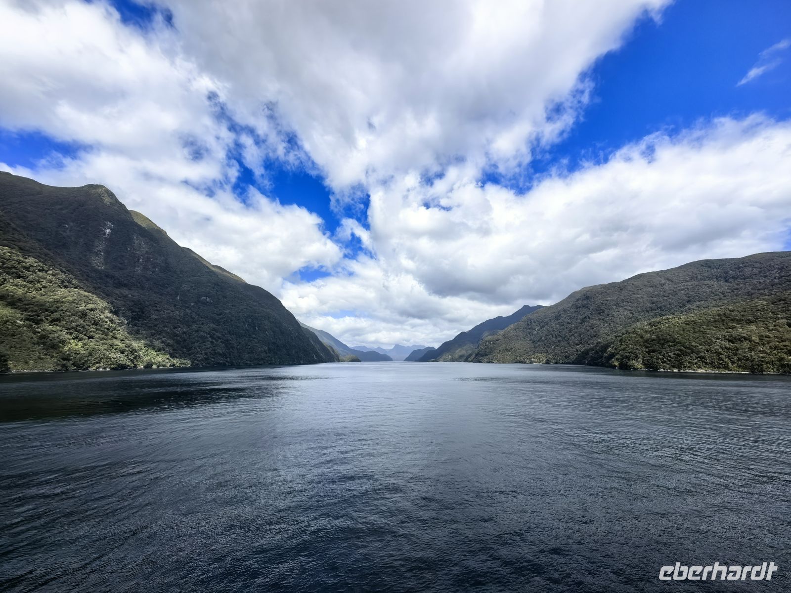 Nach diesem spektakulären Morgenerlebnis gehen wir zum späten Frühstücksbrunch, bevor wir mittags in den Thompson Sound abbiegen und wenig später im Doubtful Sound wieder auf der Tasmanischen See rauskommen. Diese Sounds sind wesentlich breiter als der Milford Sound, die Felsen sind nicht ganz so hoch und ragen nicht so steil aus dem Wasser. Nichtsdestotrotz ist die Landschaft auch hier spektakulär und wir genießen jede Minute.