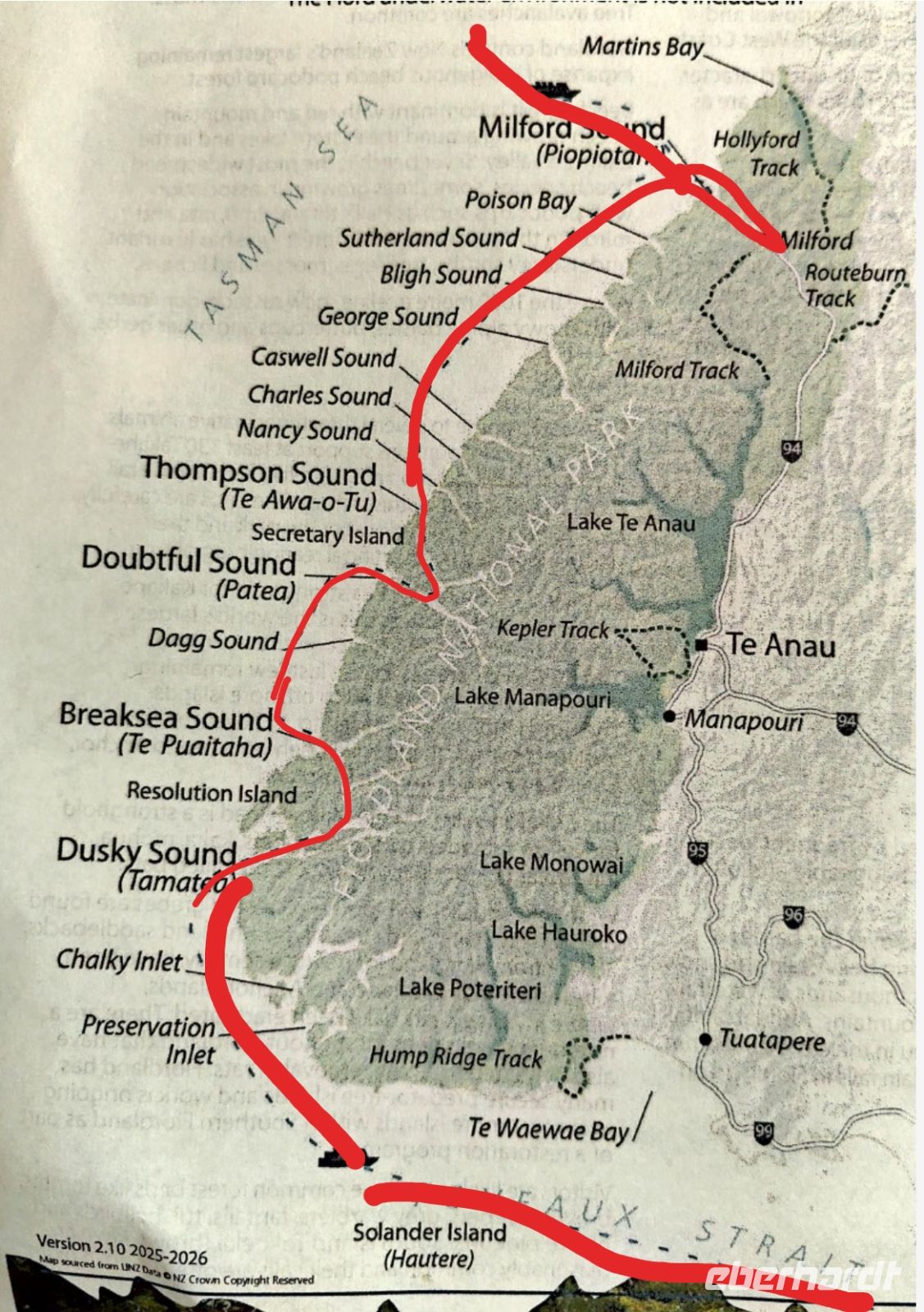 Nach dem Mittagessen biegt unser Kapitän oberhalb der Resolution Insel in den Dusky Sound ab und am späten Nachmittag geht unsere aufregende Fahrt durch den Fjordland Nationalpark zu Ende. Bei der Ausfahrt aus dem Dusky Sound schaukelt unser Schiff so stark, daß nun auch den Hartgesotteneren mulmig im Magen wird. Wir werden das südliche Ende der Südinsel umrunden und morgen die hoffentlich ruhigere Südpazifische See erreichen.