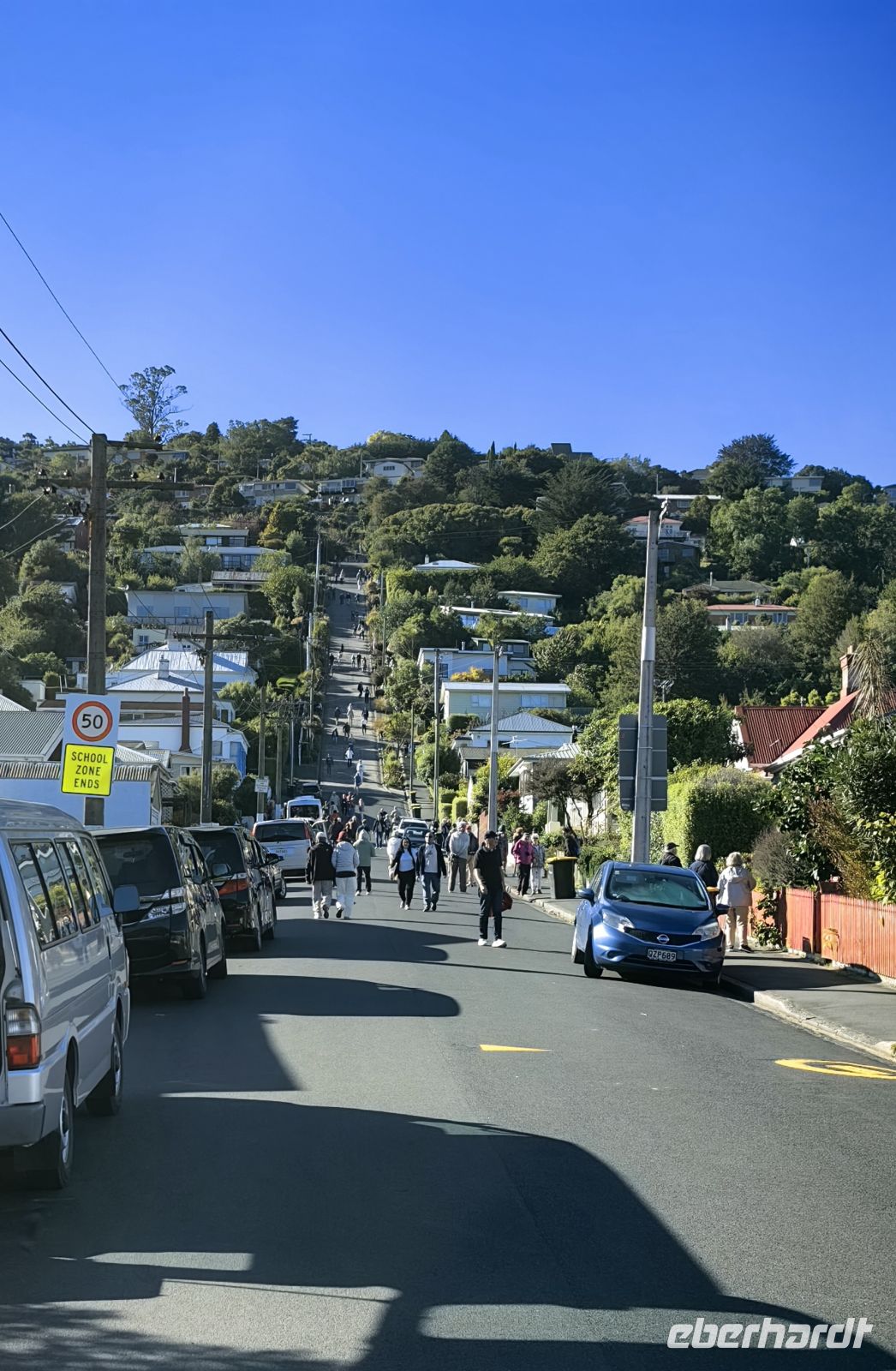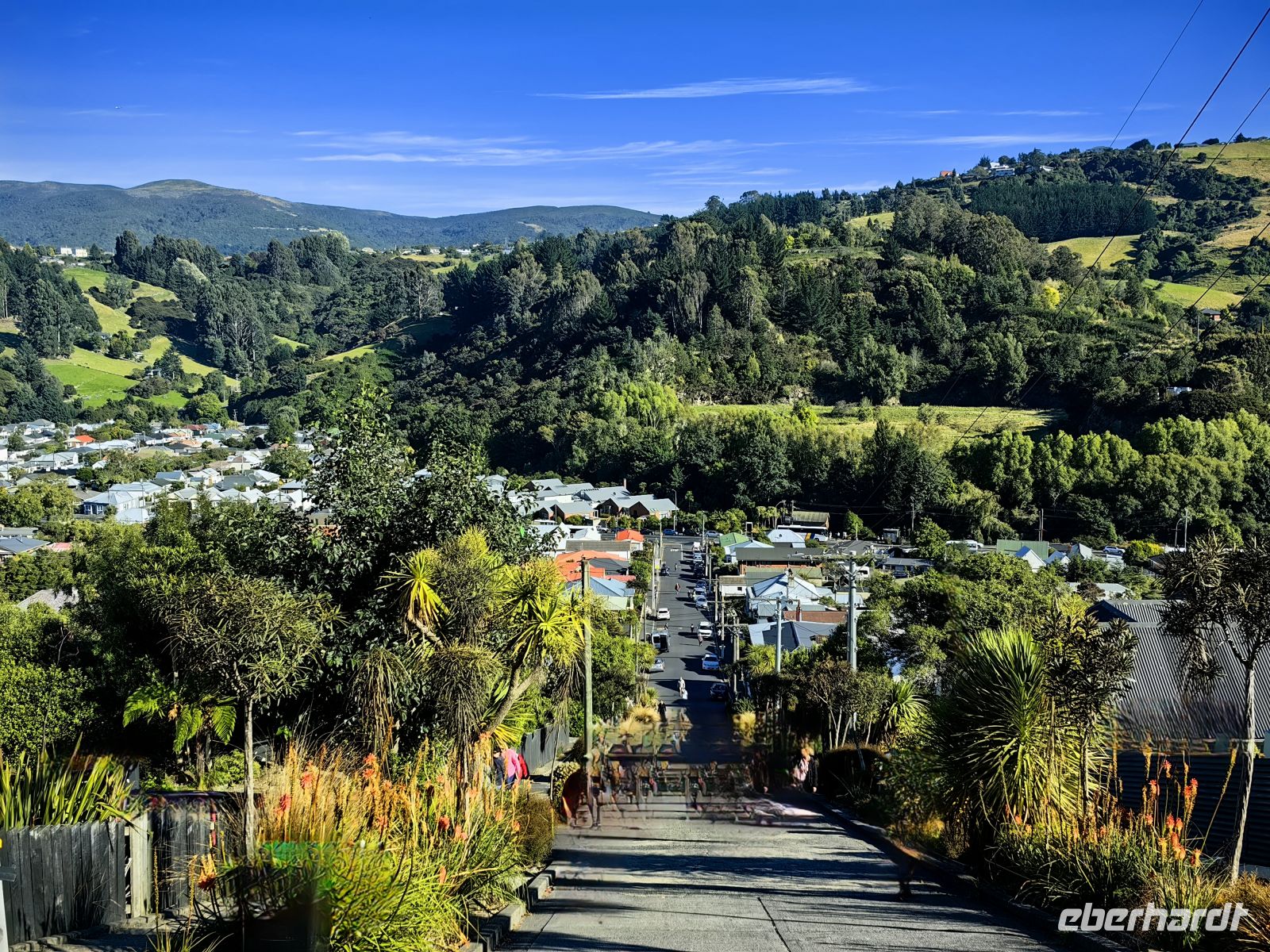 Am frühen Morgen legen wir in Port Chalmers nahe der Otago Halbinsel und der Stadt Dunedin an. Hier wartet bereits Anja auf uns, eine Deutsche, die vor Jahren nach Neuseeland ausgewandert ist. Sie zeigt uns zuerst die steilste Straße der Welt - die Baldwin Street - und mutig erklimmen wir diese, die meisten Gäste schaffen es bis ganz nach oben, wo sich uns ein wundervoller Ausblick auf Dunedin bietet.