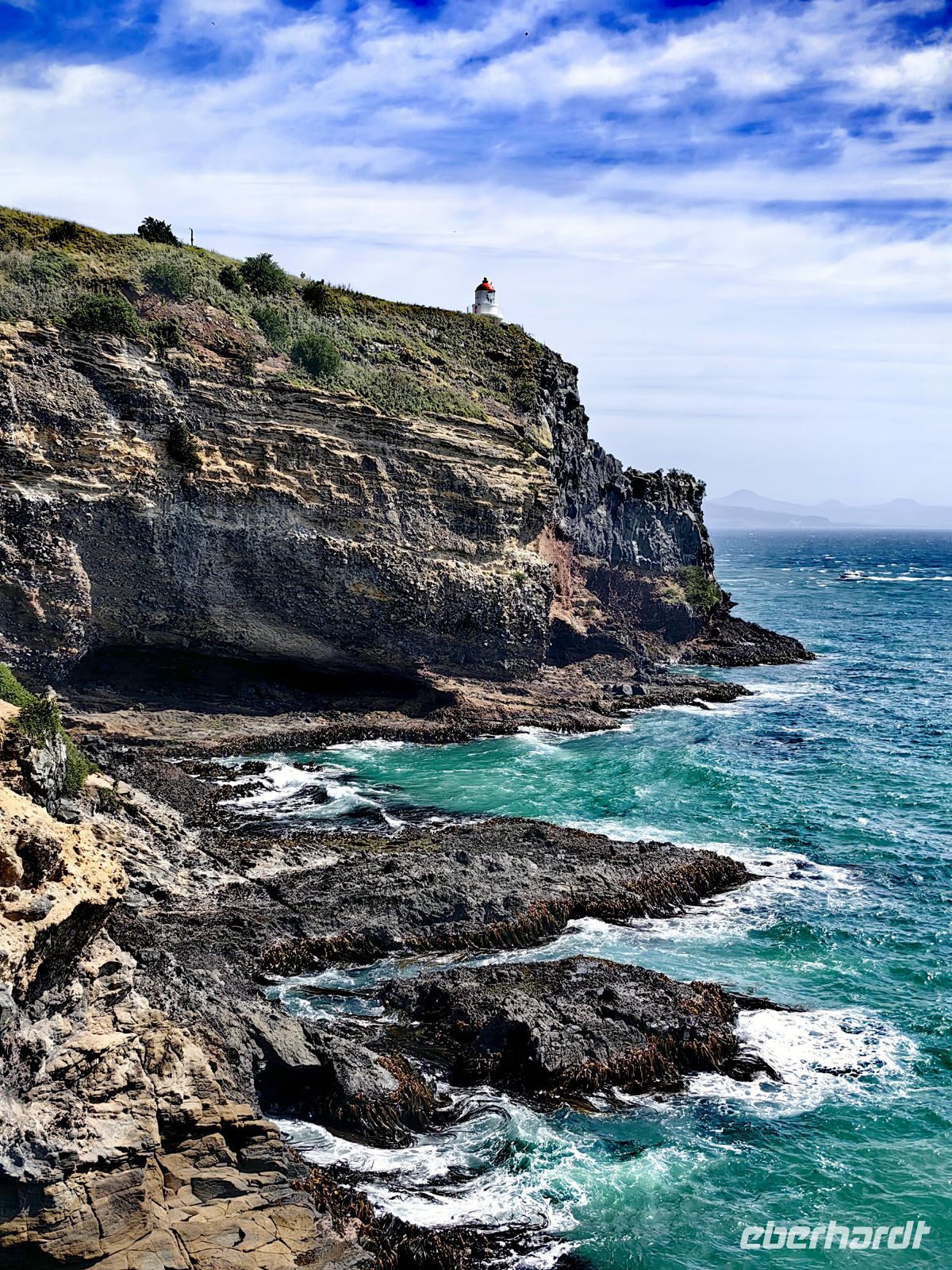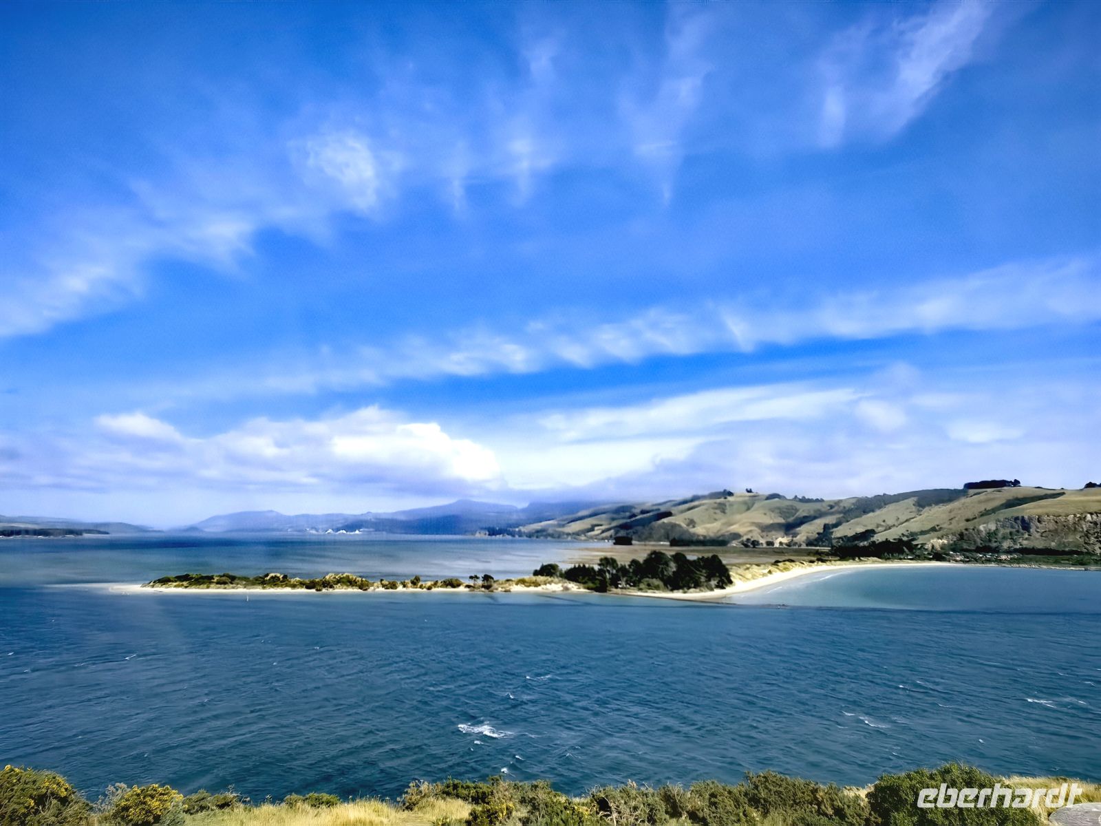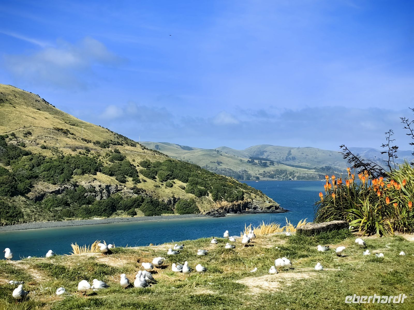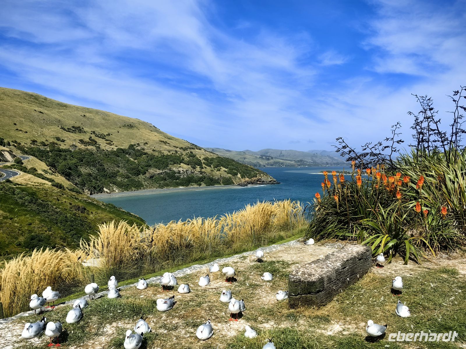 Nun fahren wir an der Otago Halbinsel entlang, das Wetter könnte nicht besser sein, die Buchten in denen schwarze Schwäne und kanadische Gänse schwimmen, liegen mit ihrem kristallklaren Wasser vor uns und die ganze Landschaft ist malerisch. Auf dem Hügel gelegen, erreichen wir Pukekura, das Albatroszentrum. Hinter dem alten Leuchtturm haben die schönen Tiere ihr Domizil.