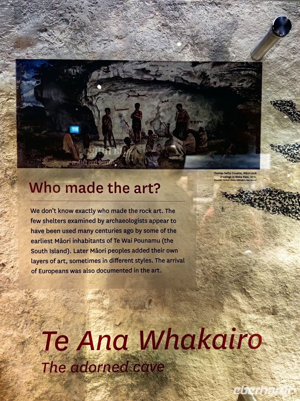 Ngāi Tahu, die Māori-Stammesgruppe deren Ländereien sich auf der Südinsel befinden, haben 761 Māori-Felskunststätten innerhalb ihrer Grenzen identifiziert und einige davon erkennen wir wieder, da wir sie im Museum bereits erklärt bekommen haben. An einer Felswand über uns entdecken wir die Kosmologie der Maori im Stein, Wesen, die Erde, Wasser und Himmel darstellen, vereinen sich, bekommen Kinder, die den Wald mitbringen und so schließt sich der Schöpfungskreislauf.